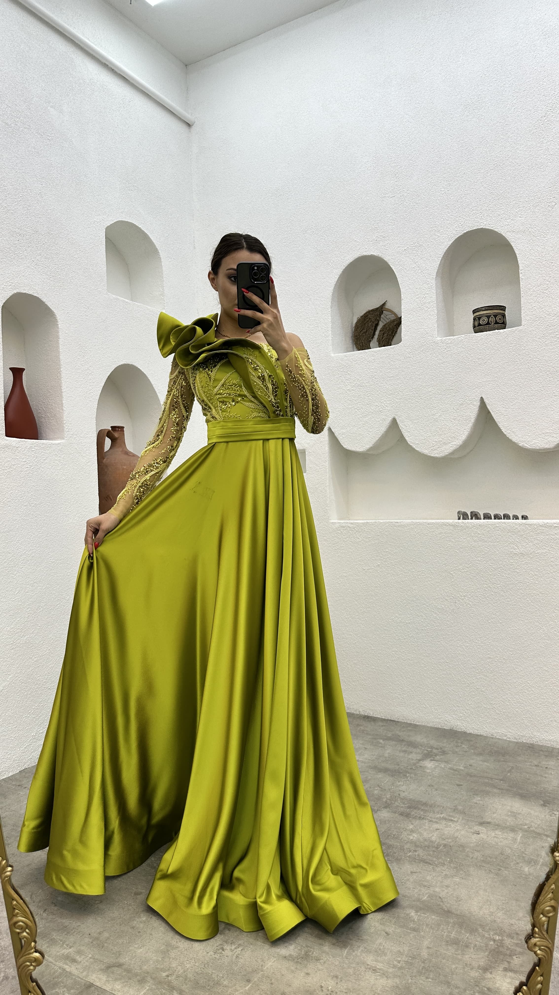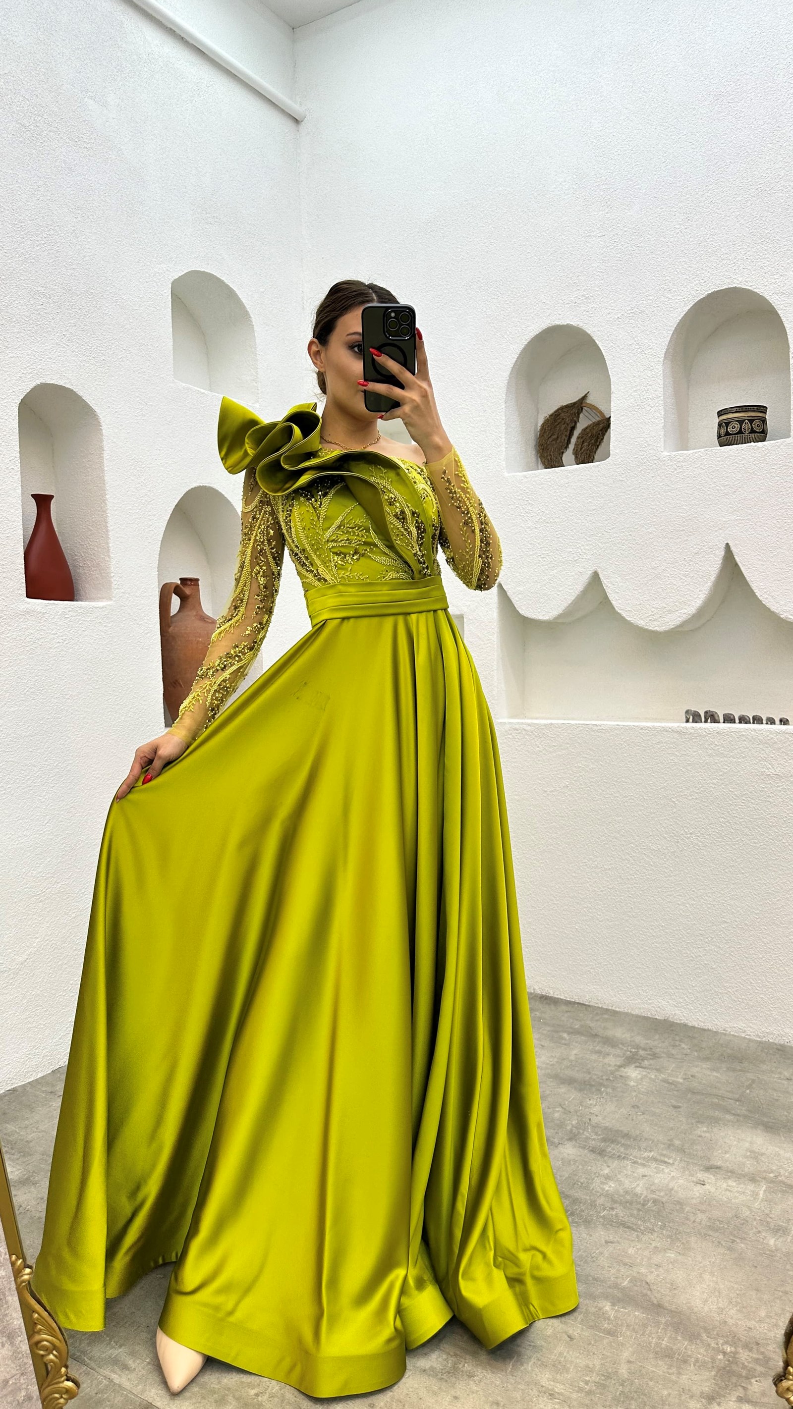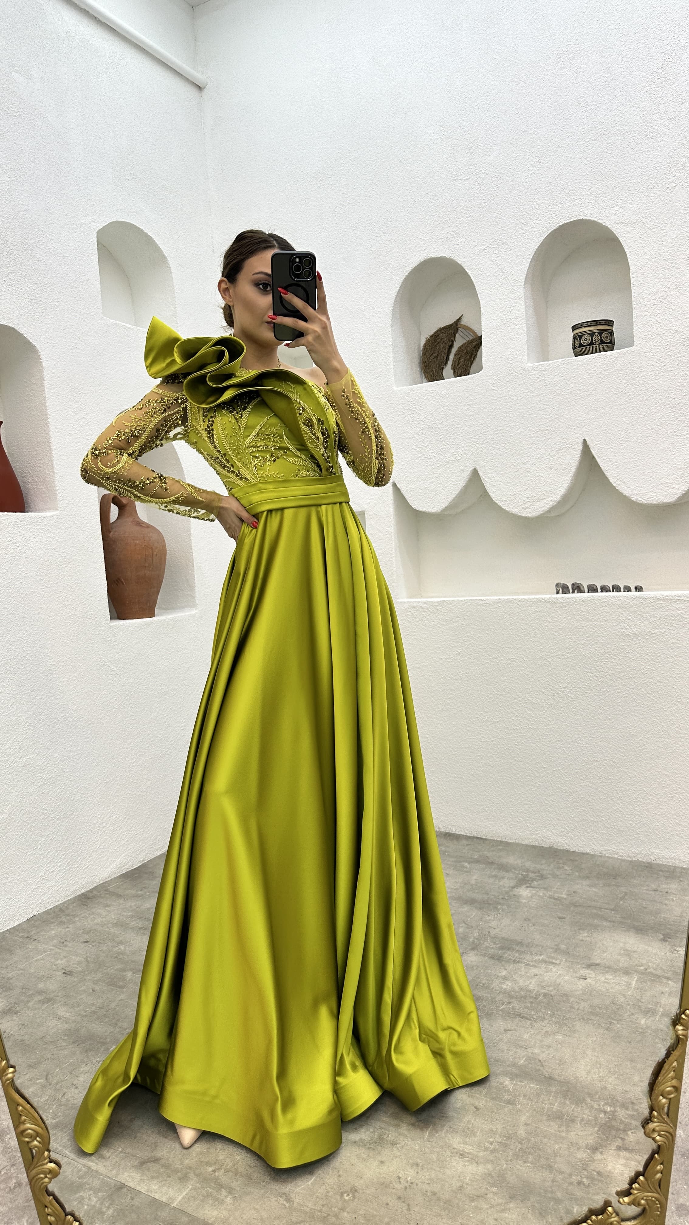 • Sarı Tek Kol Volanlı İşlemeli Abiye Elbise