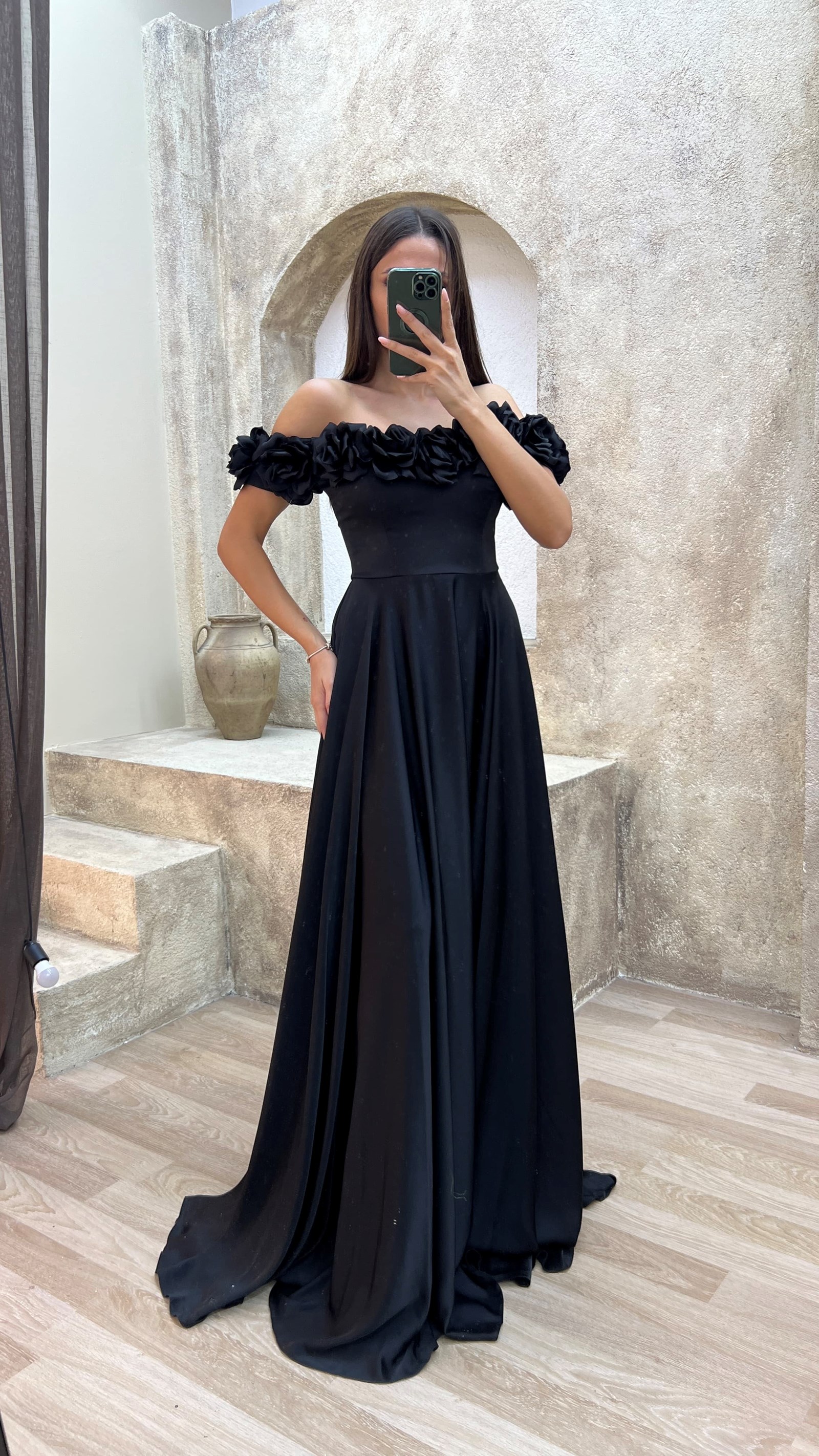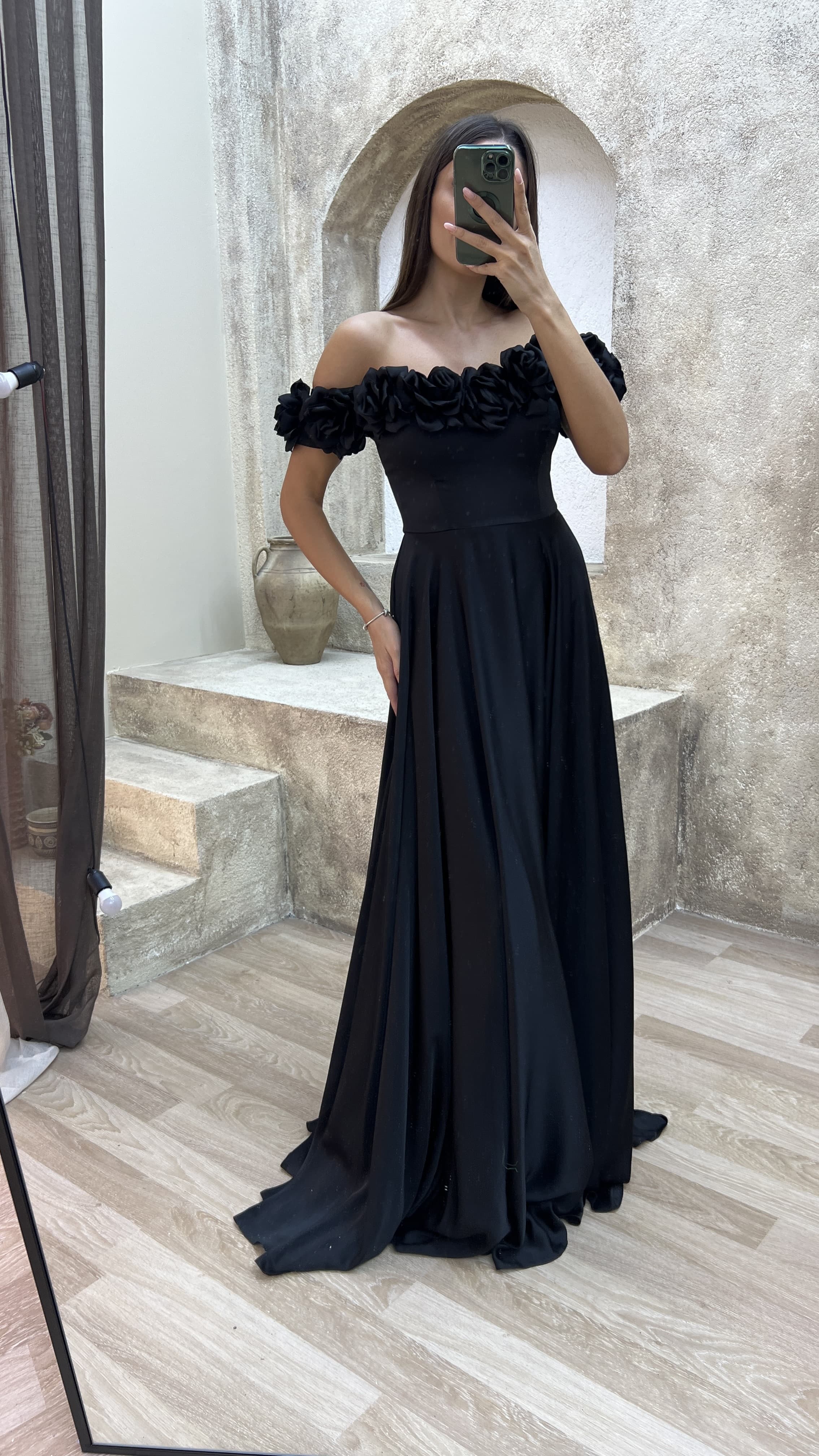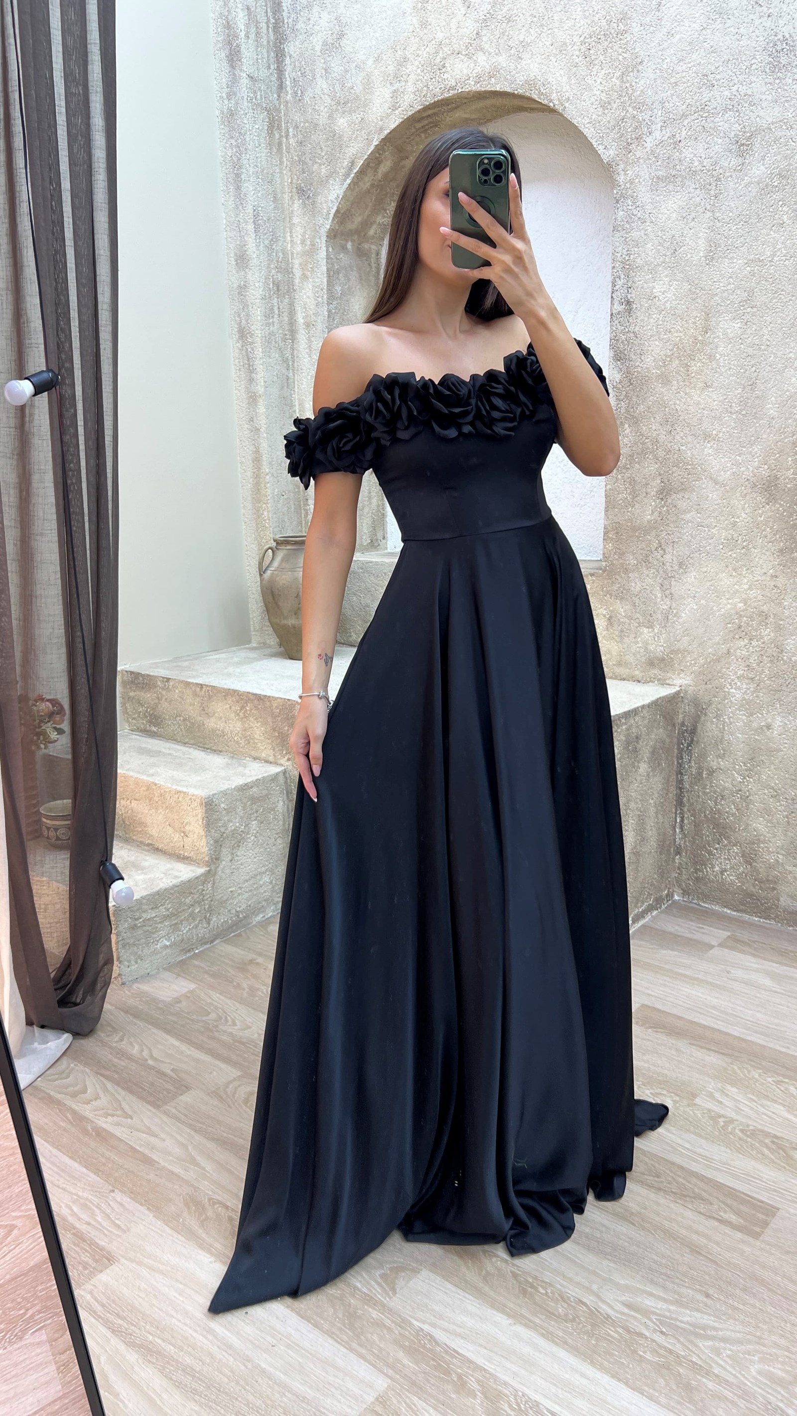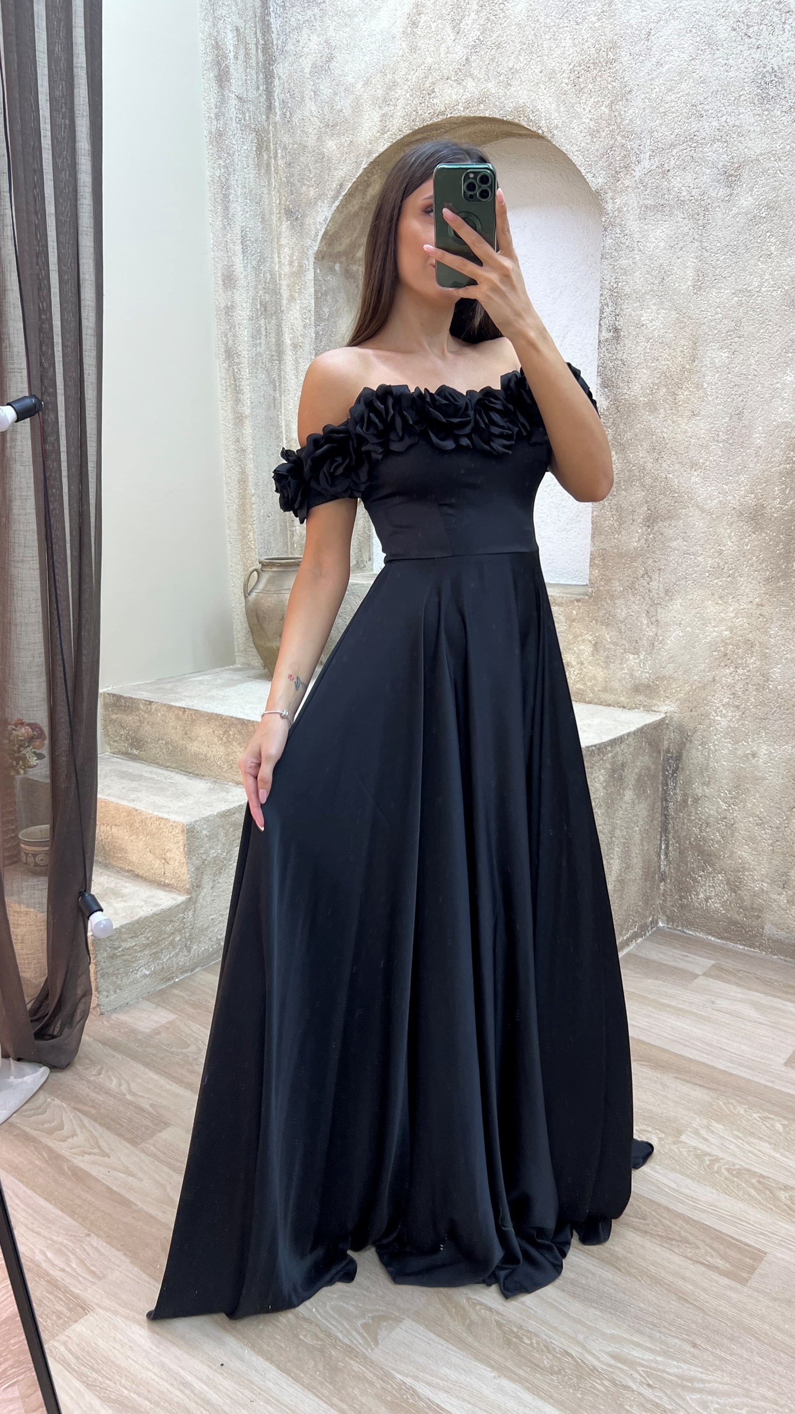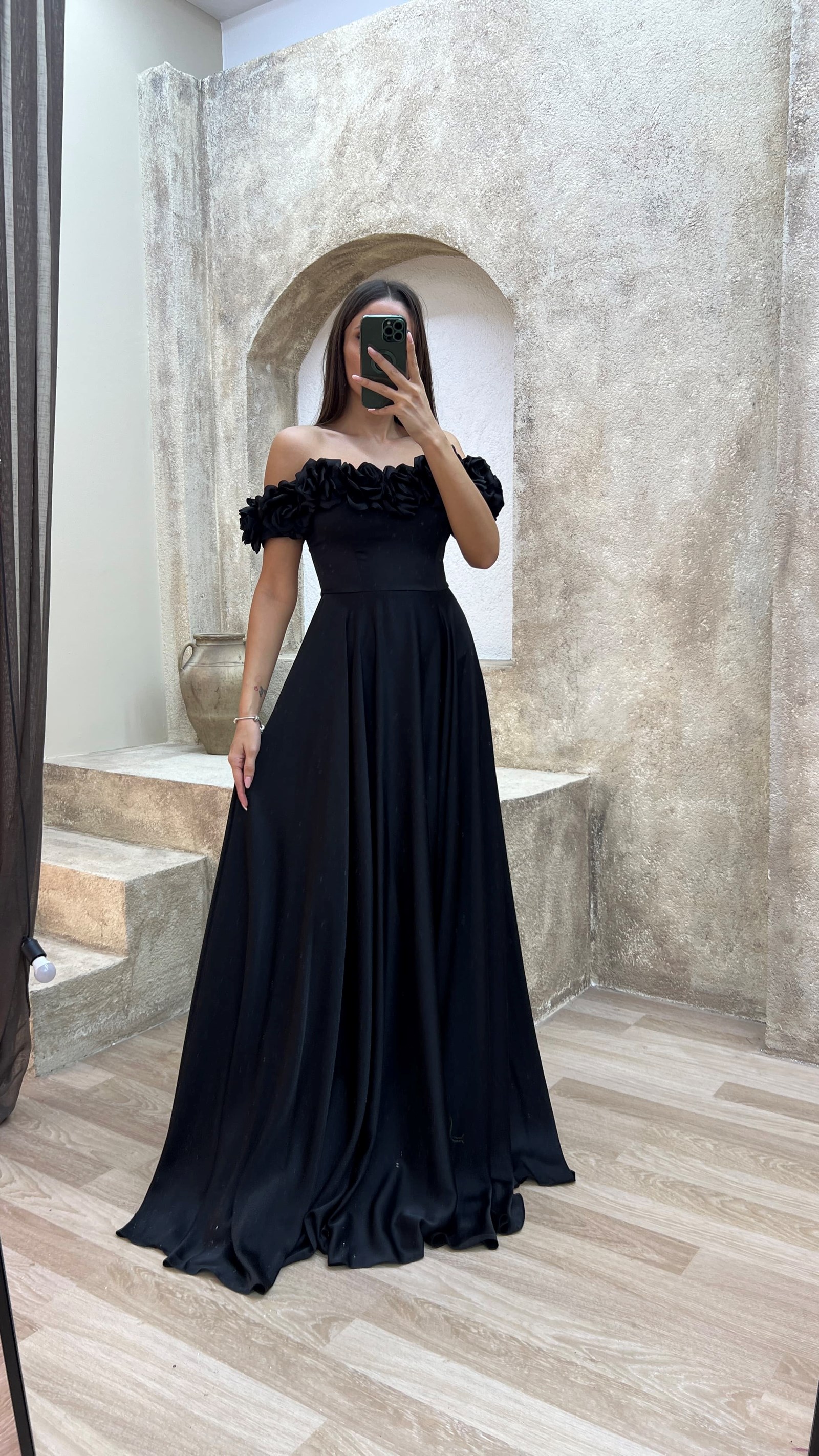 • Siyah Göğsü Gül Detay Tasarım Saten Abiye Elbise