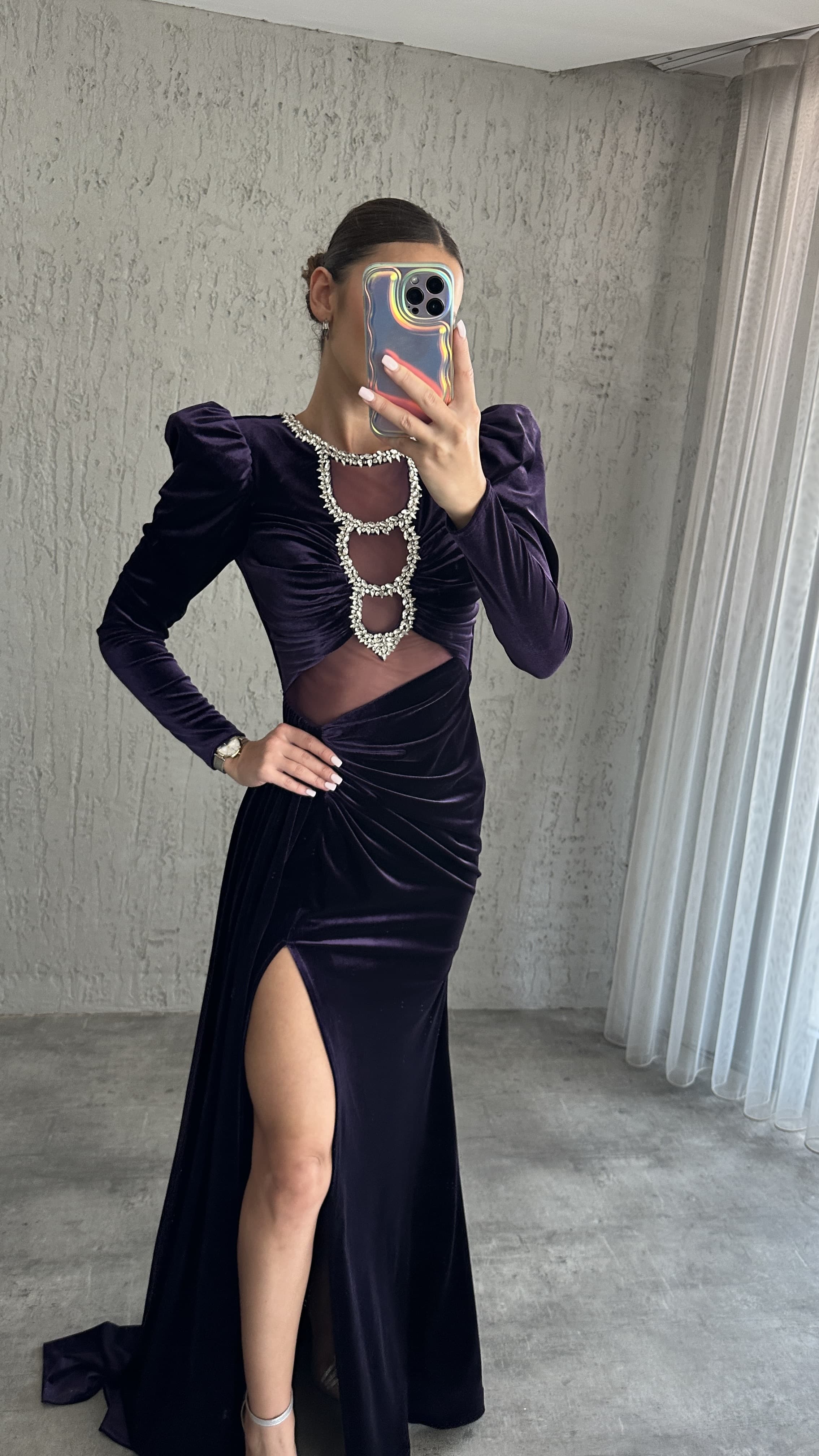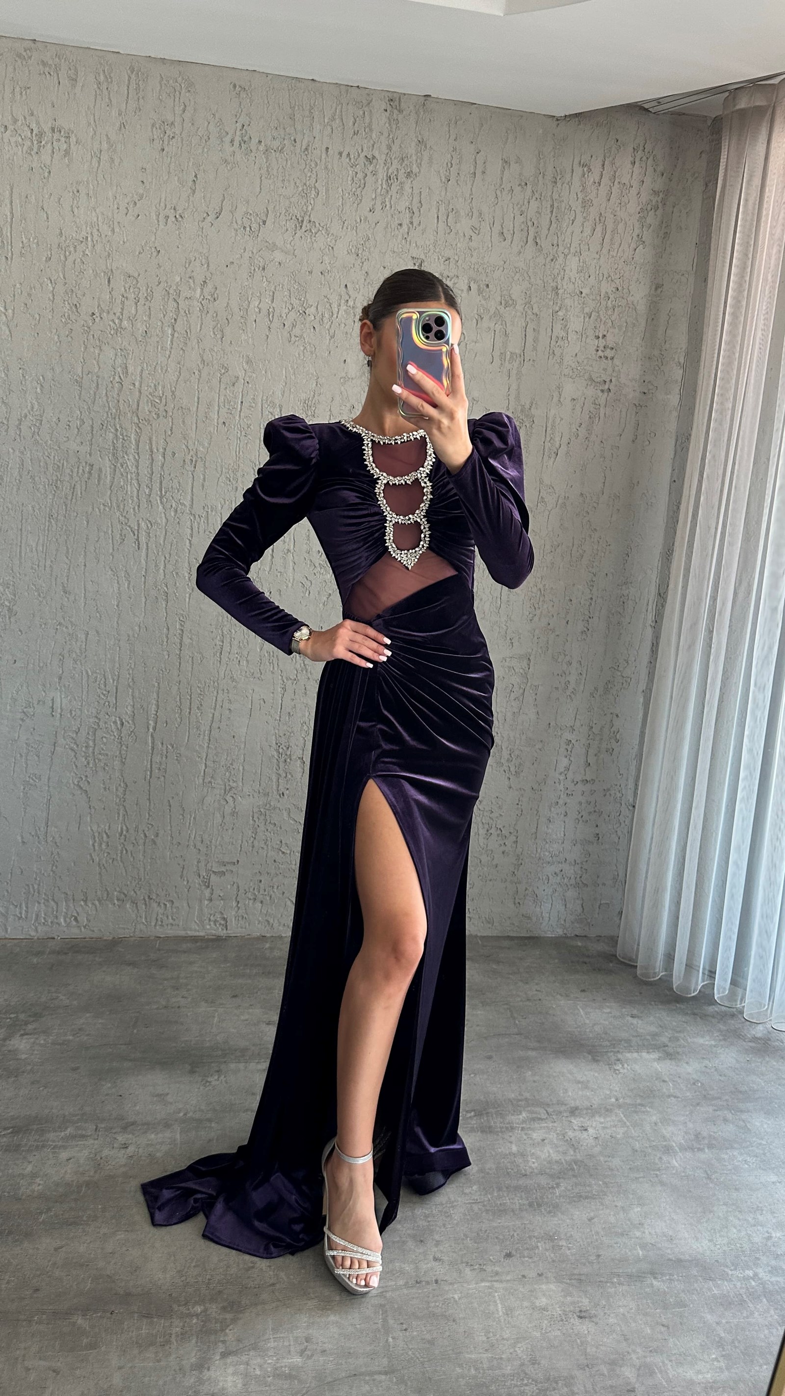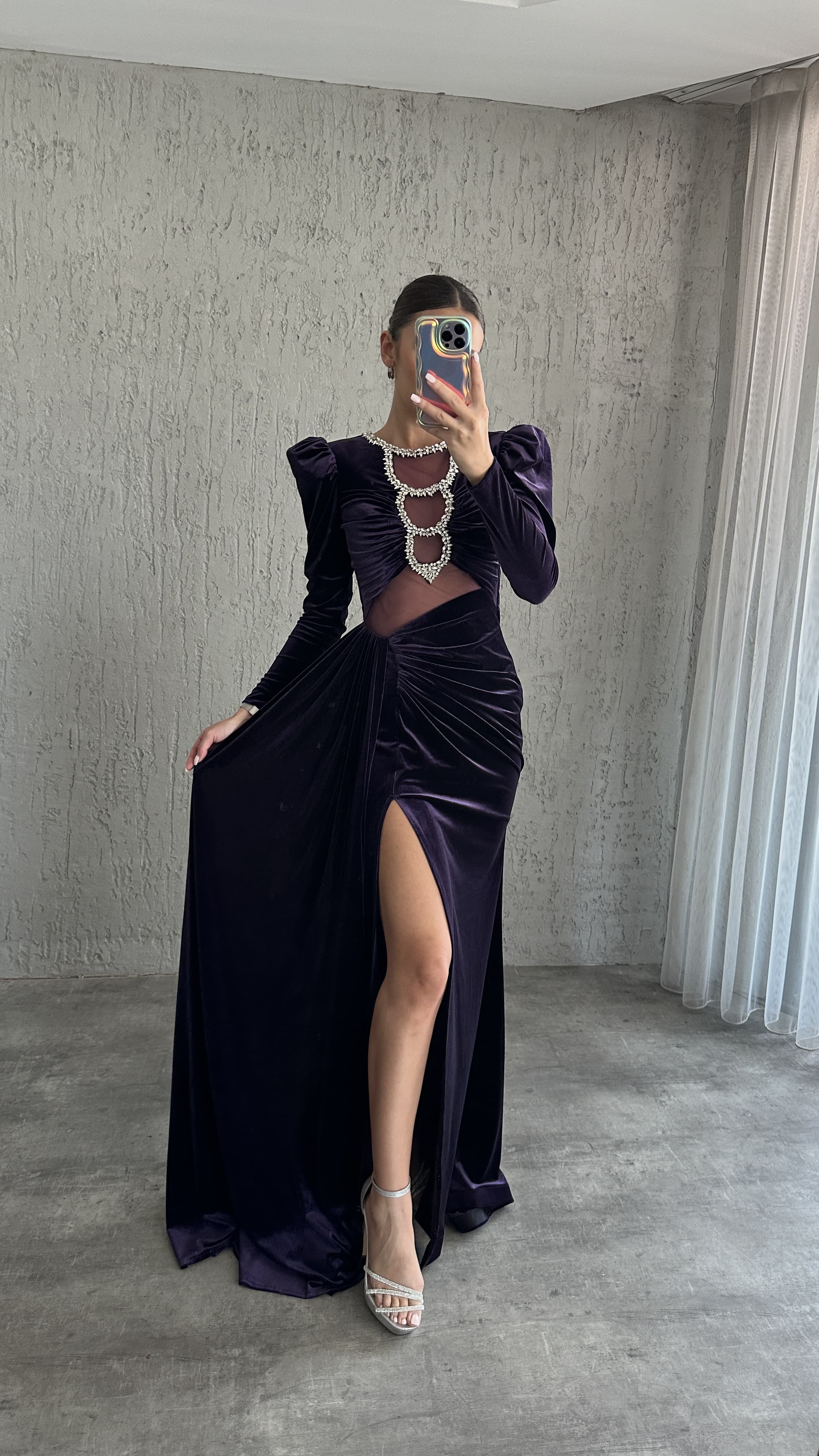 • Mor Göğsü Taş İşlemeli Bel Detay Tasarım Kadife Abiye Elbise