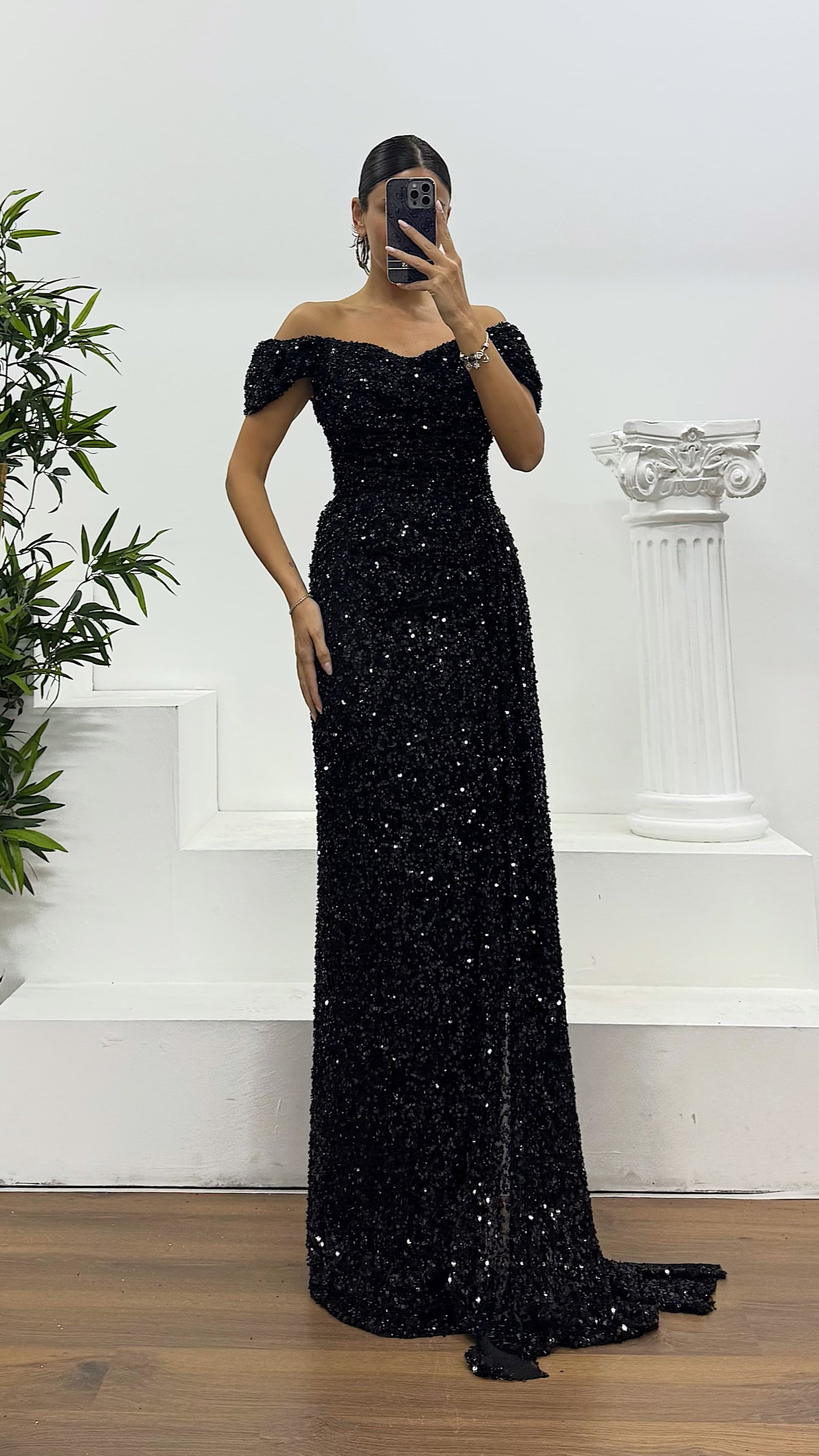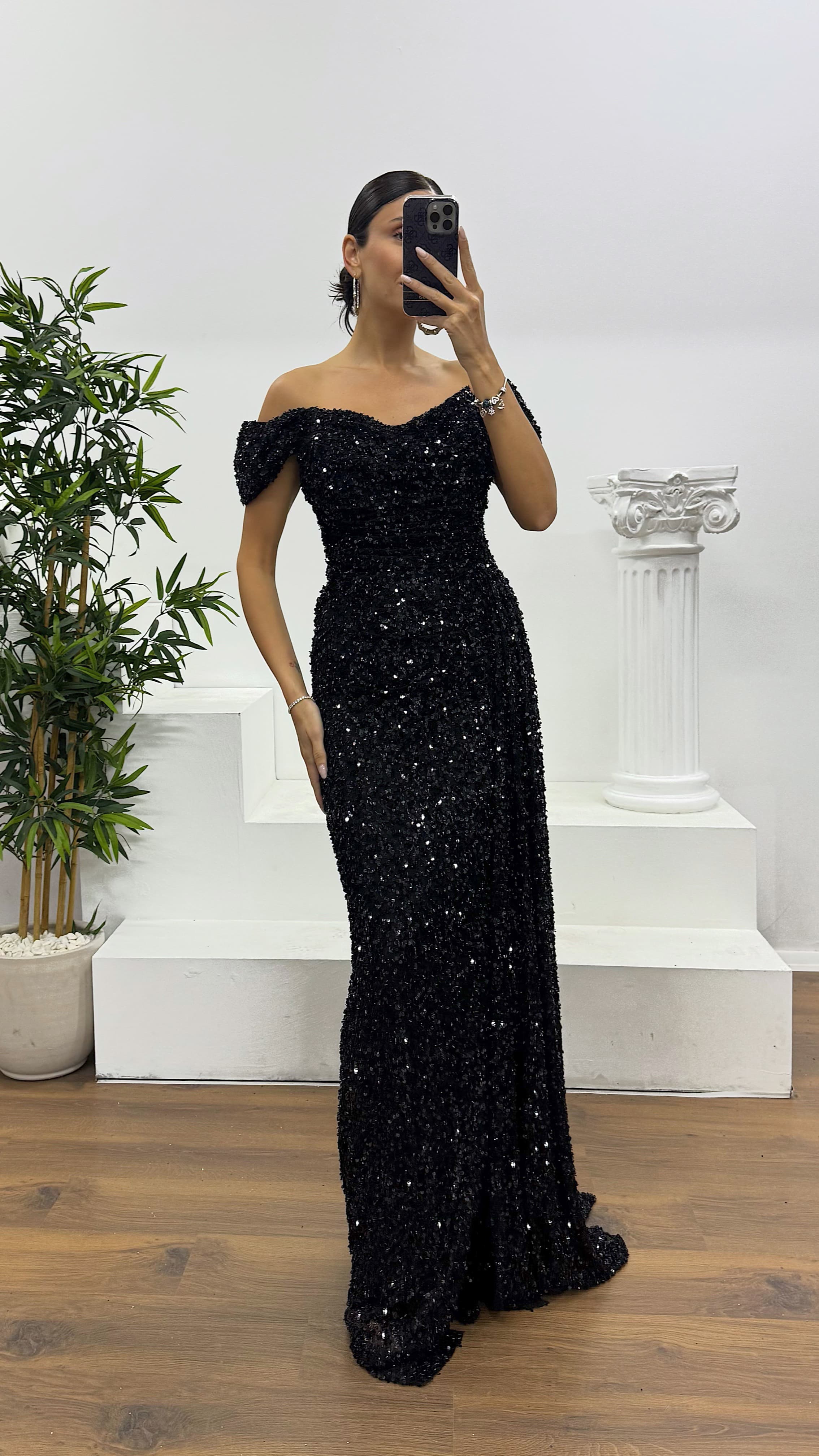 • Siyah Kayık Yaka Pul Payet Abiye Elbise