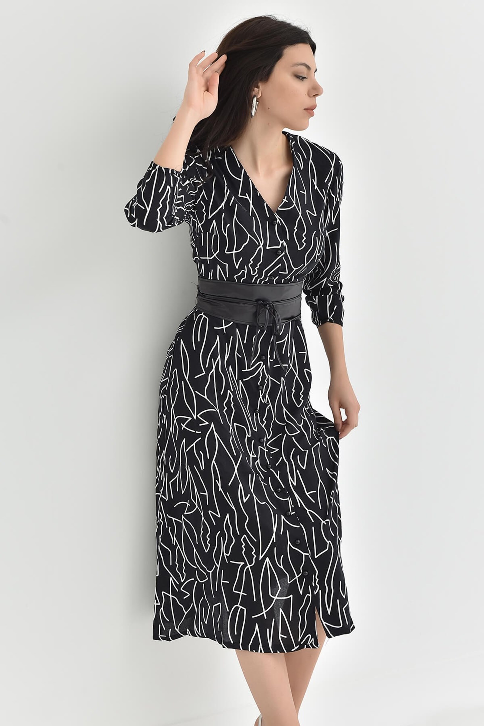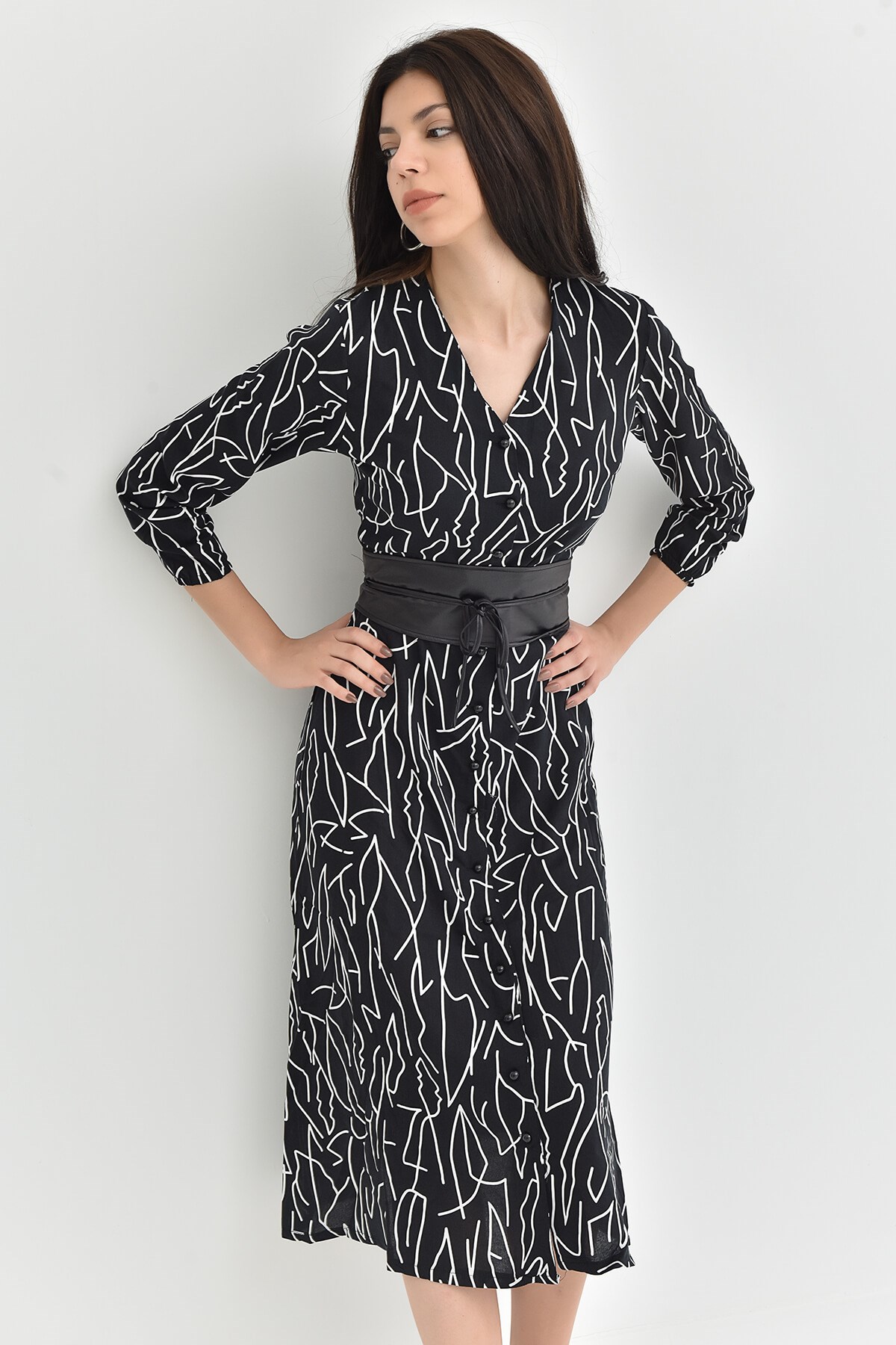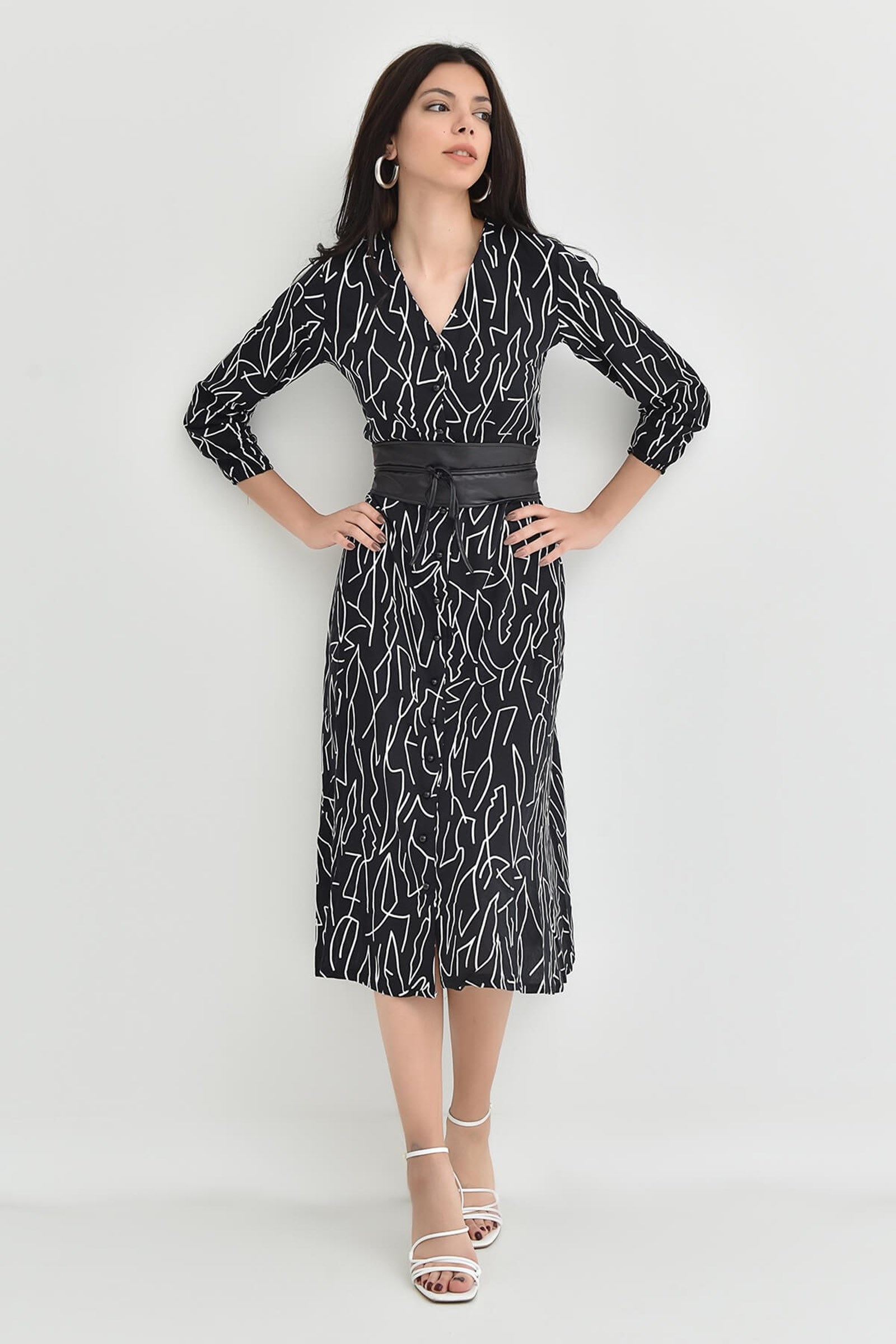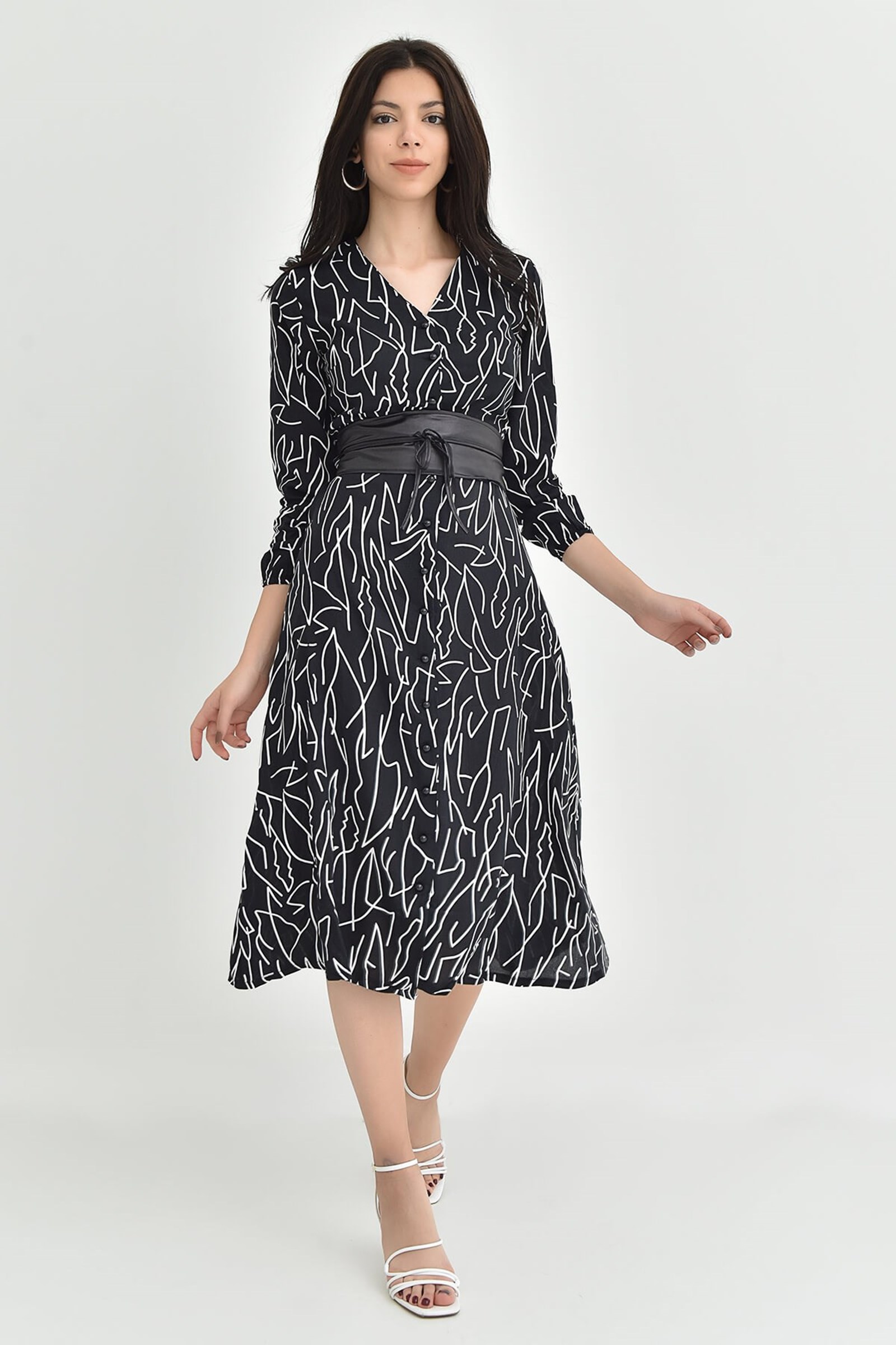 Siyah Kemerli Midi Boy Gömlek Elbise