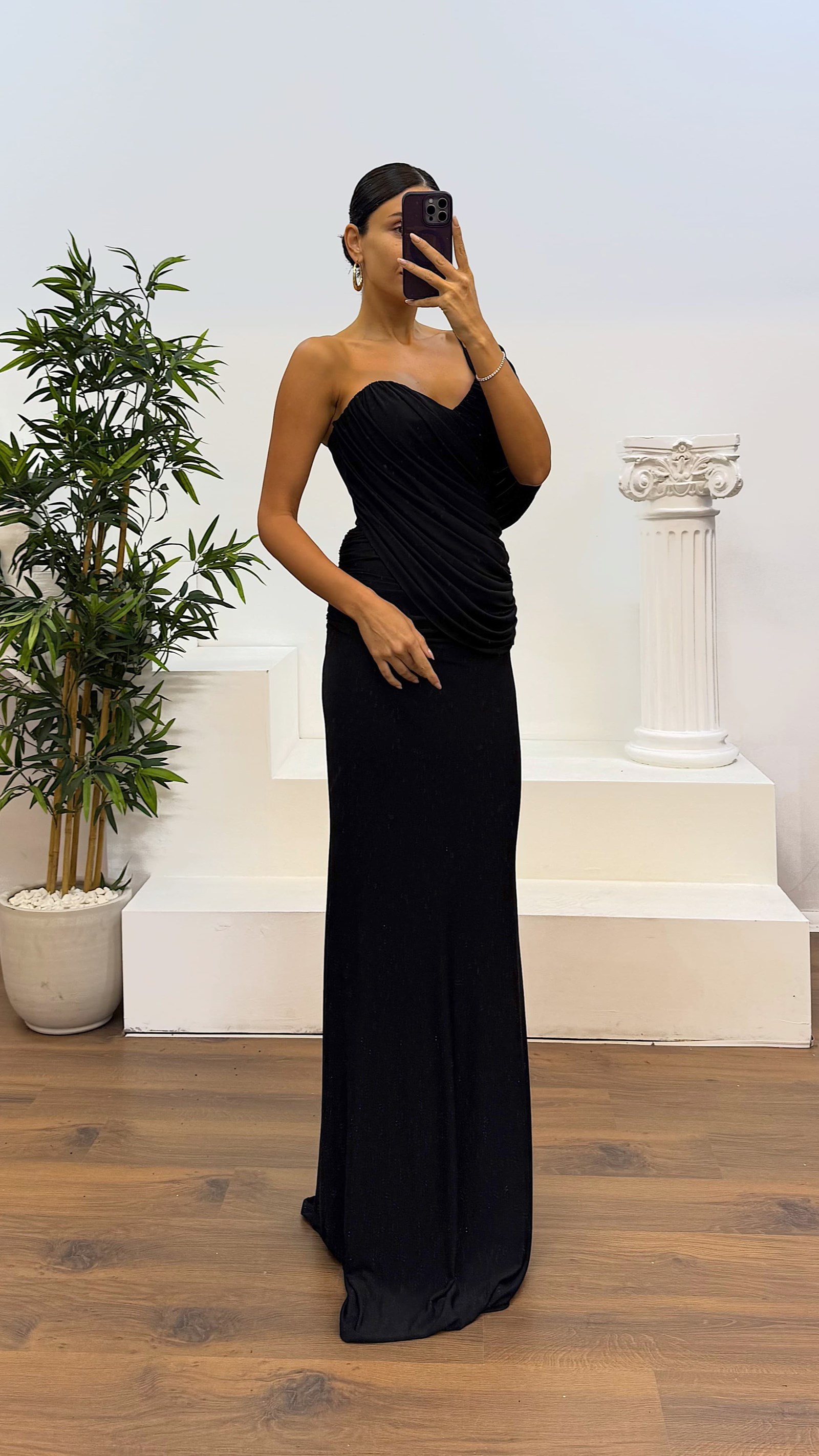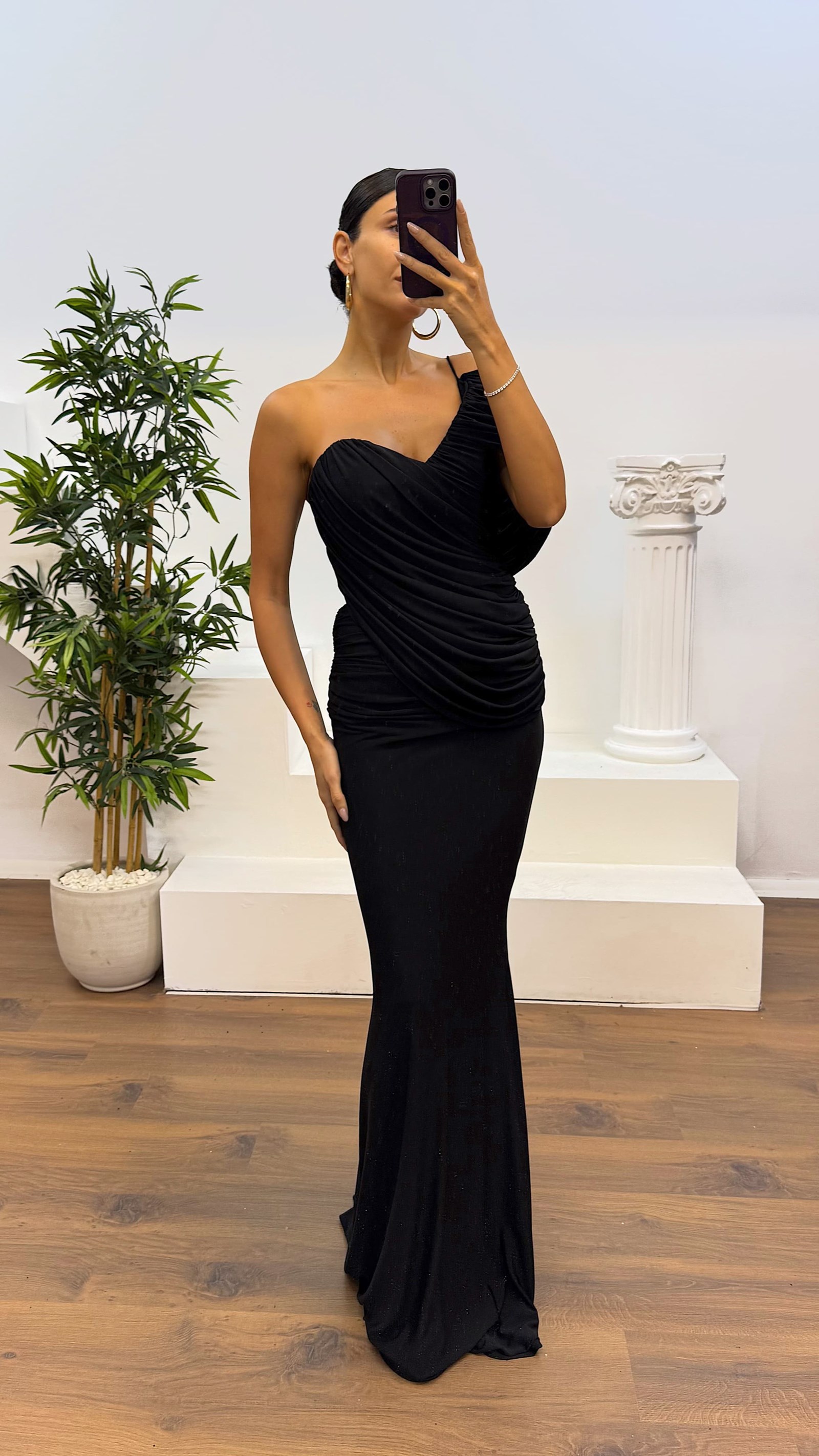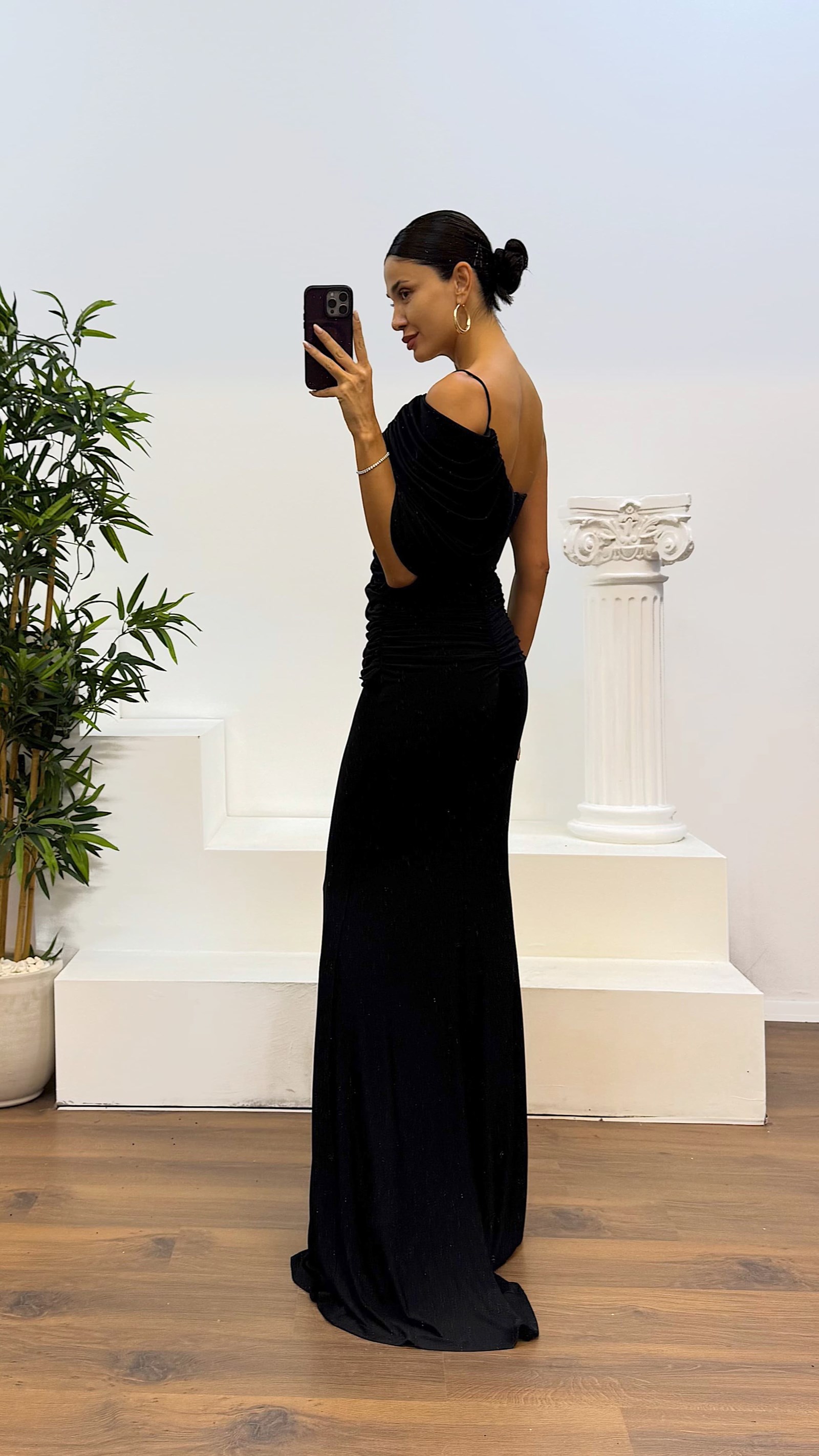 Abito da sera con dettagli drappeggiati sulle maniche Questo abito è progettato per adattarsi alle taglie dalla 36 alla 44. È dotato di imbottiture per il busto, fodera, chiusura con zip sul retro, spalline sottili e un elegante design drappeggiato. Lunghezza dell'abito: Può variare tra i 165 e i 170 cm a seconda della taglia. Tipo di tessuto: Jersey lycra, poliestere
