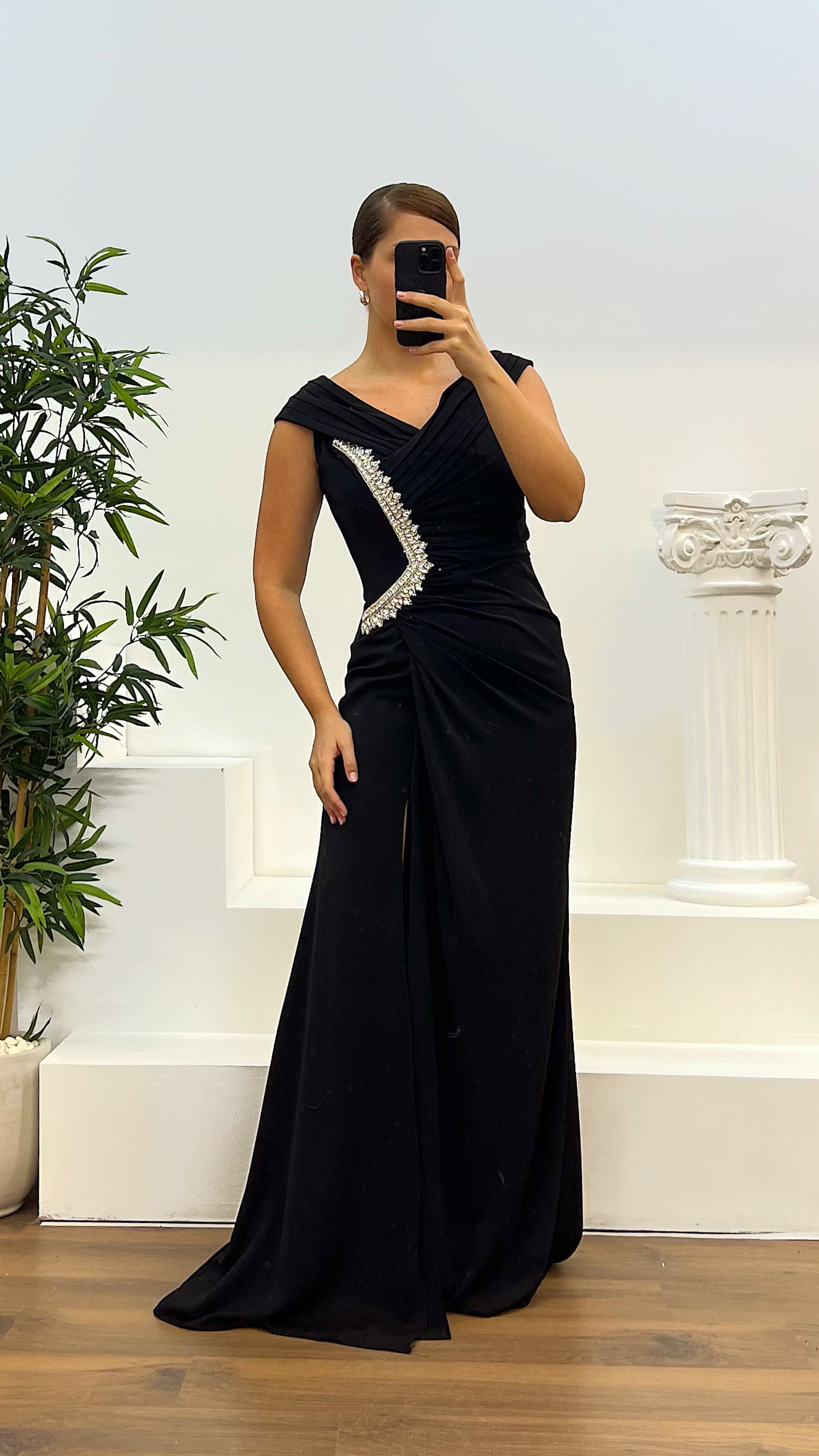 Abito da sera con scollo Madonna Il prodotto è compatibile con le taglie dalla 44 alla 48, con imbottitura sul petto, foderato, chiusura con cerniera sul retro, spacco e dettagli ricamati. La lunghezza del prodotto può variare tra 165 e 170 cm. Tipo di tessuto: raso 100% poliestere.