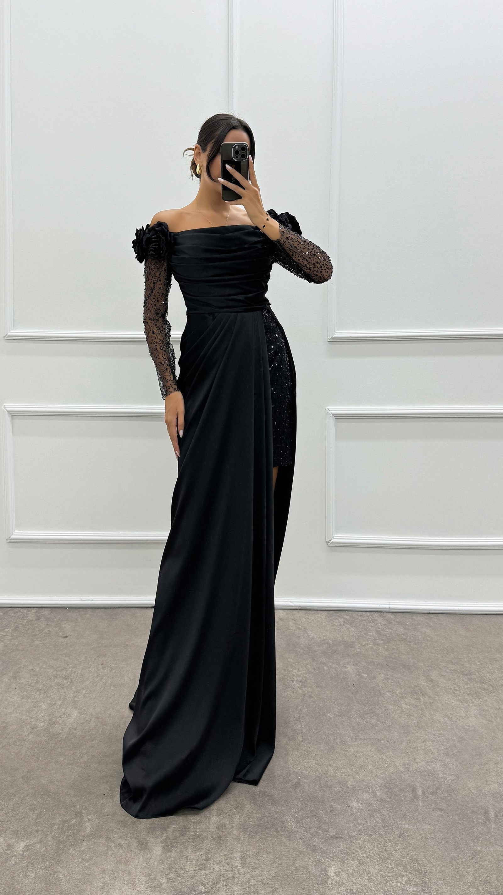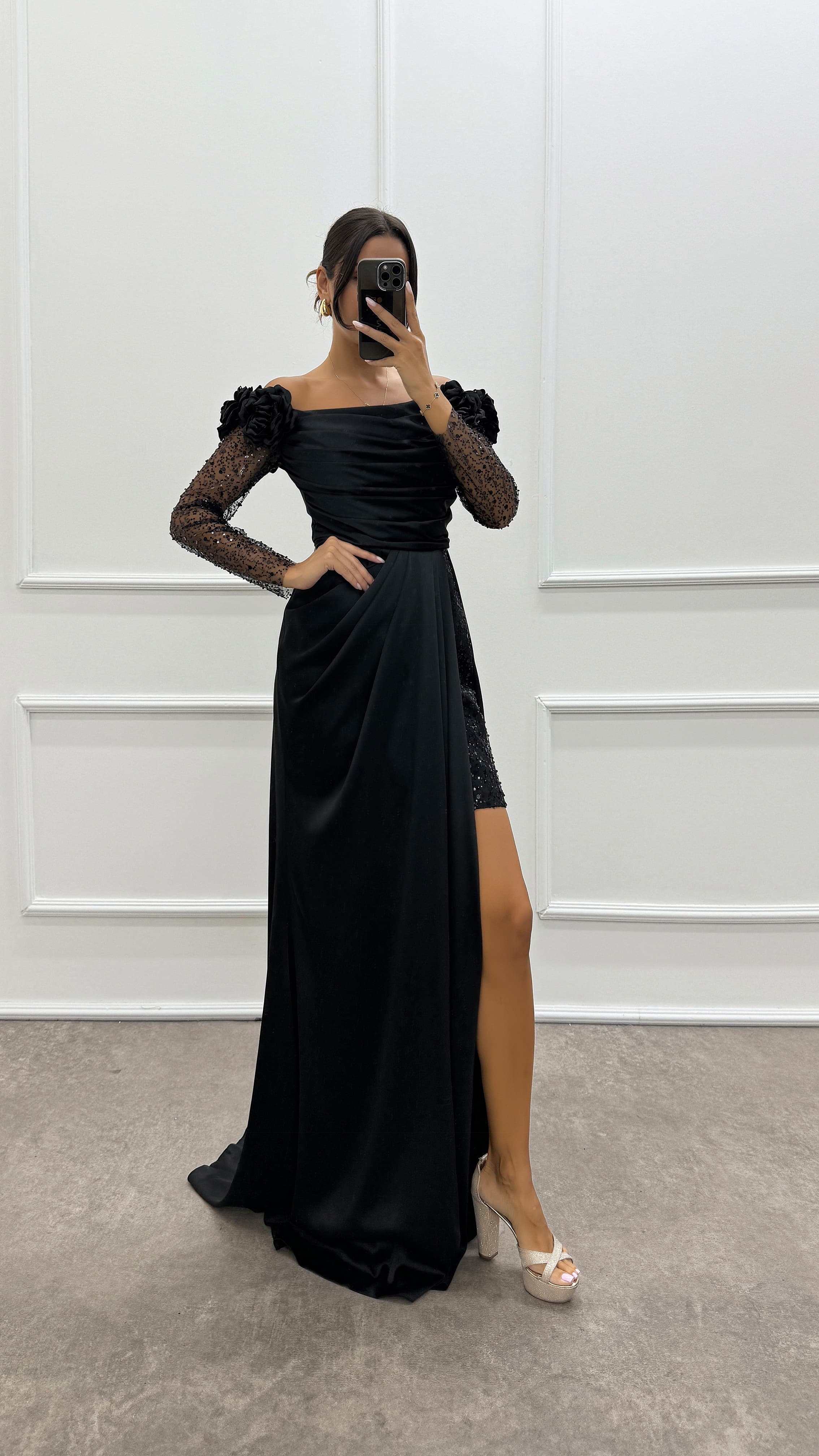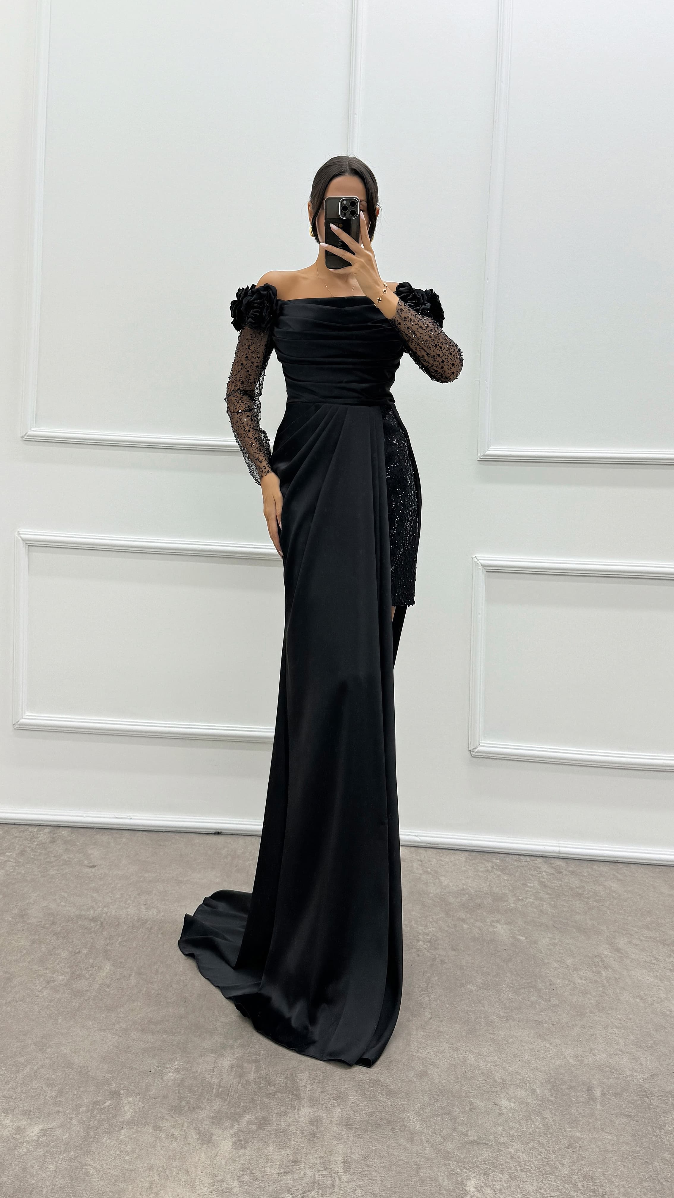 Siyah Omuzları Çiçekli Kolları Tül Tasarım Saten Abiye Elbise