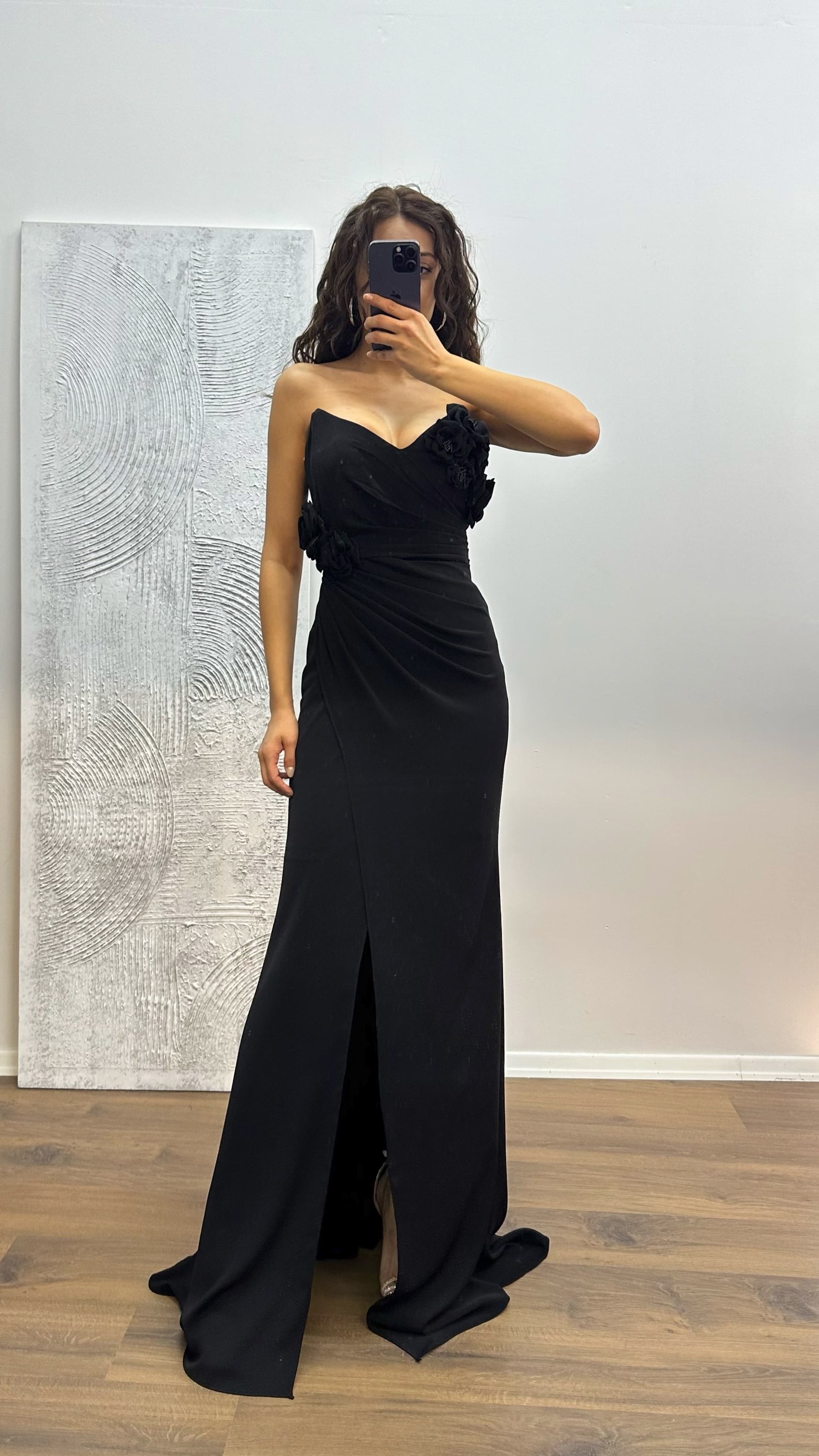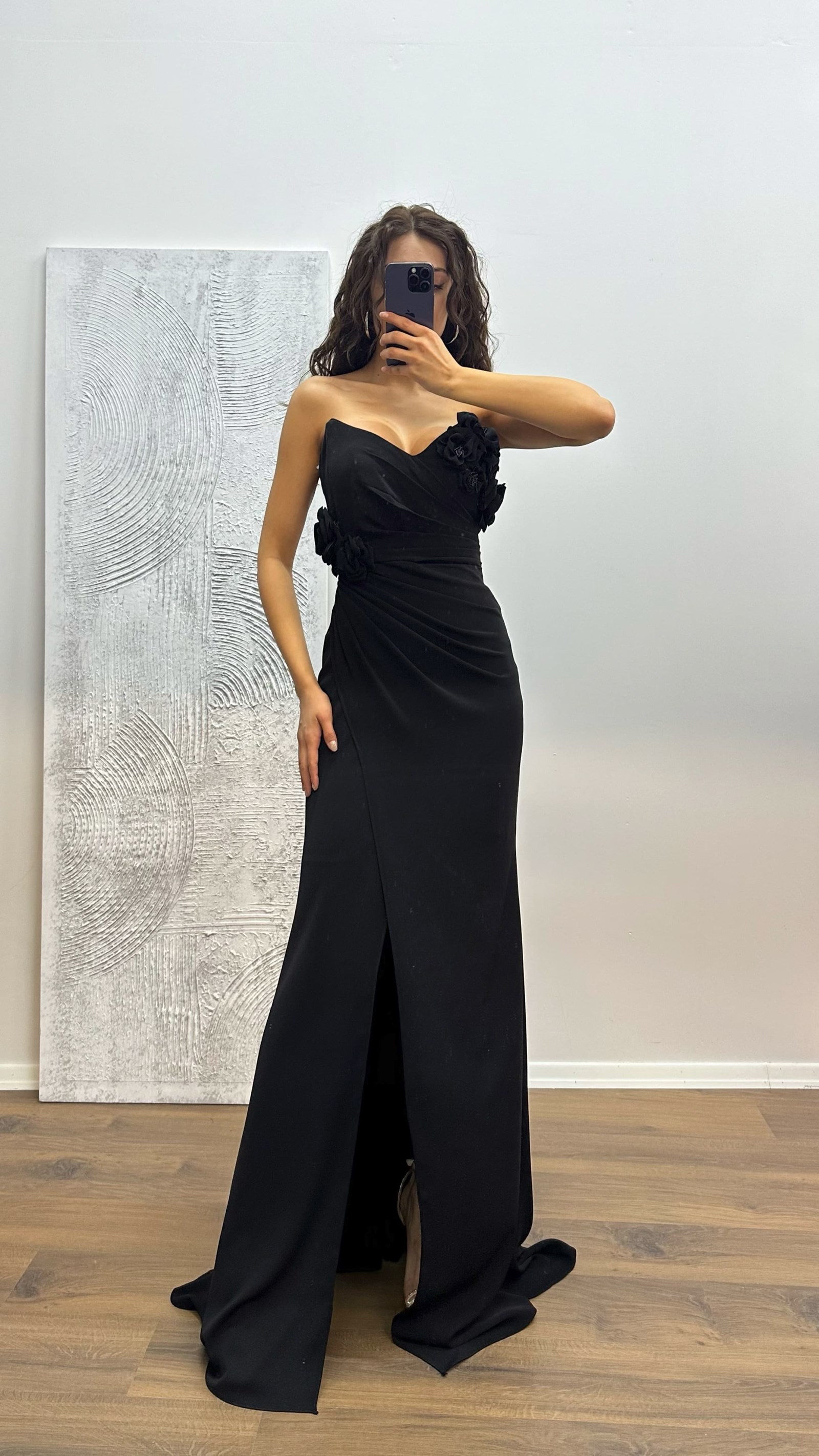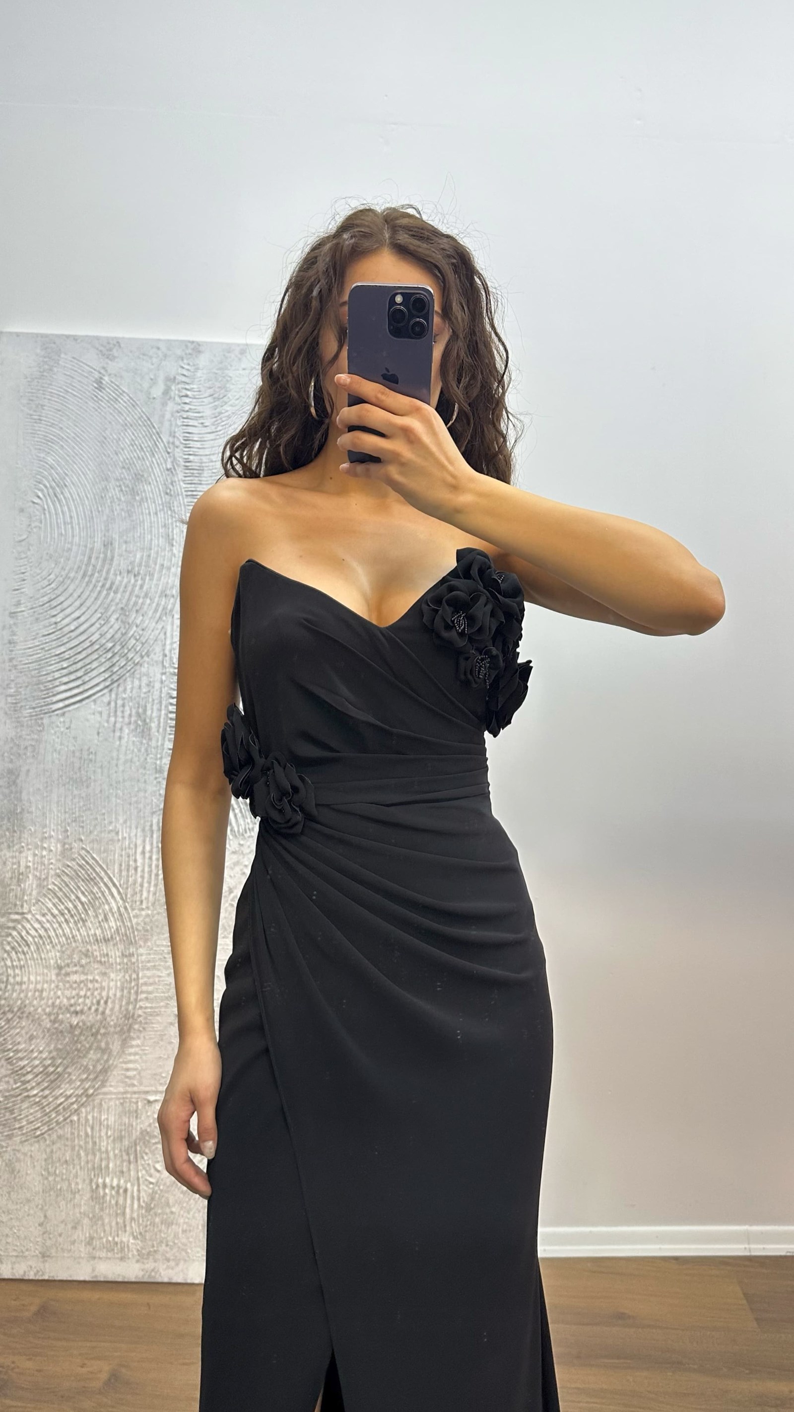 • Siyah Straplez Çiçek Detay Abiye Elbise