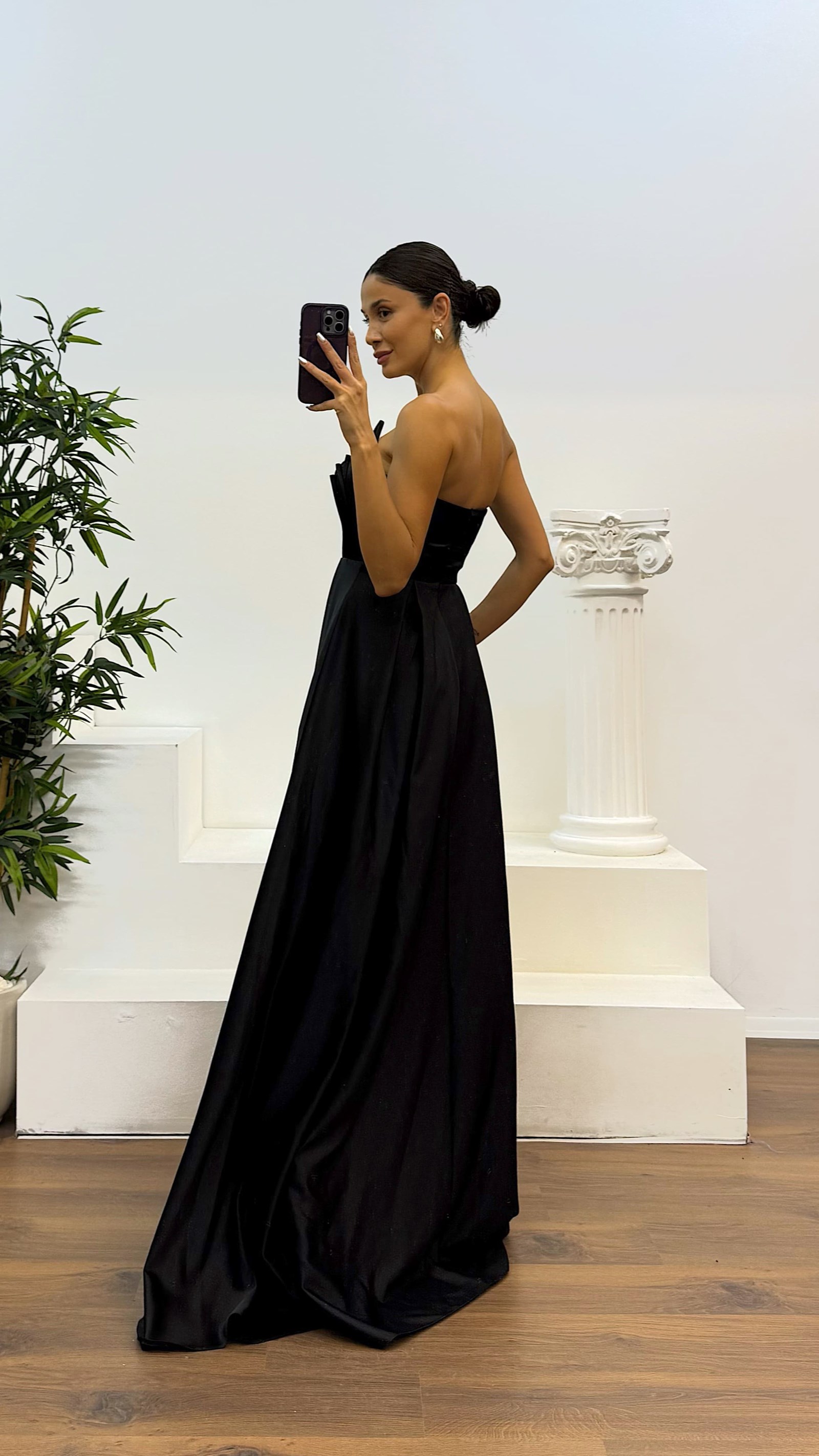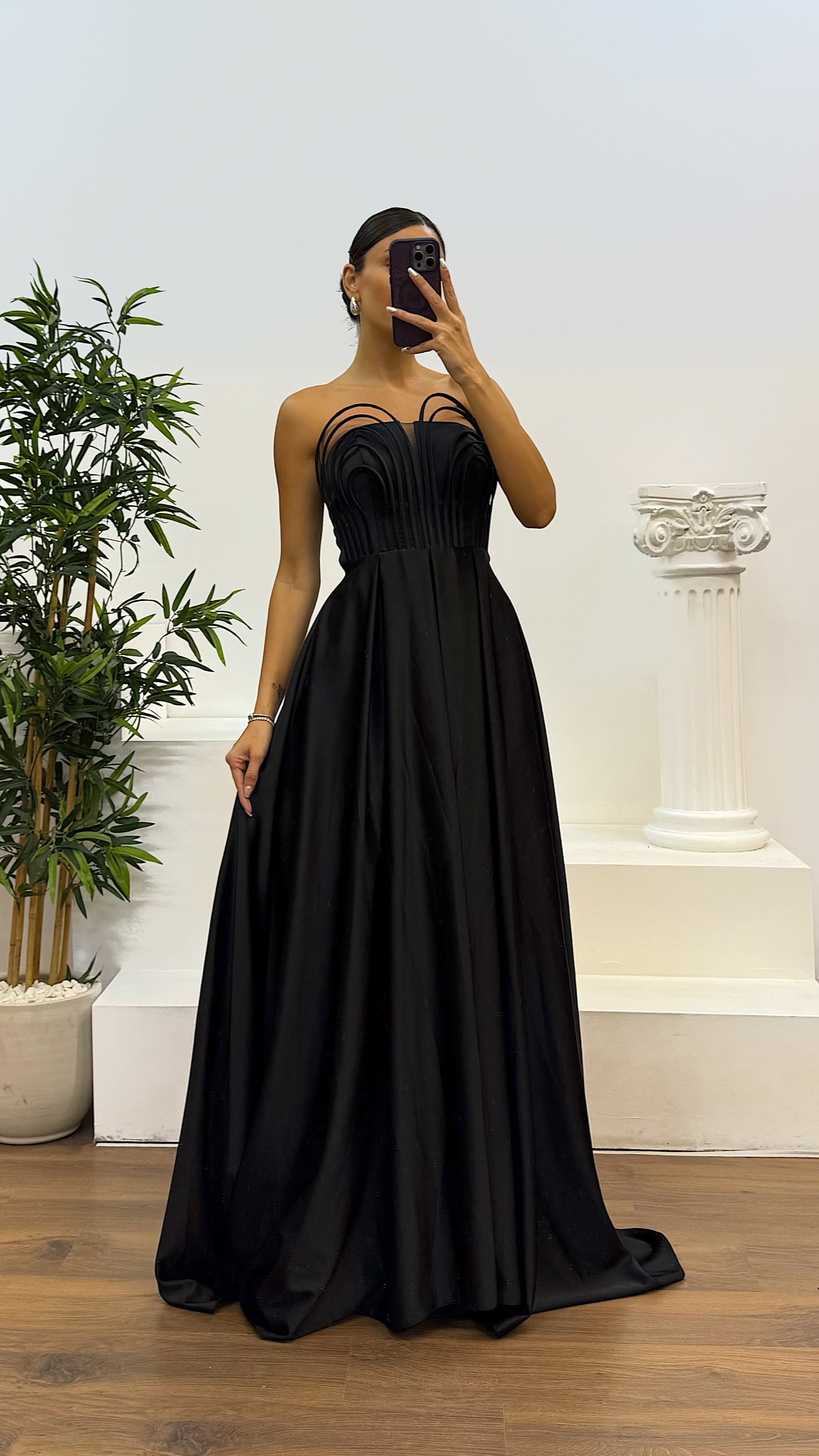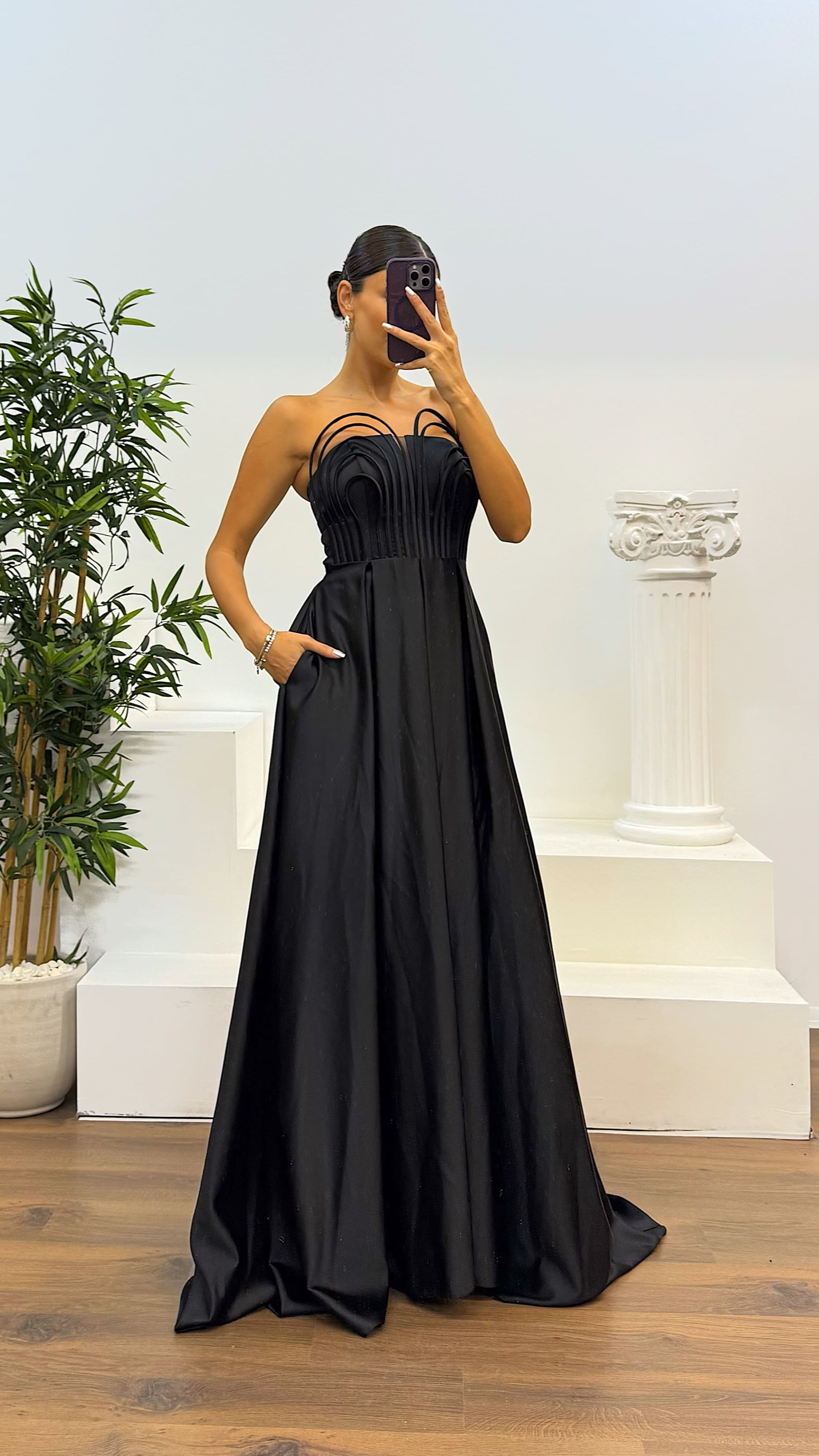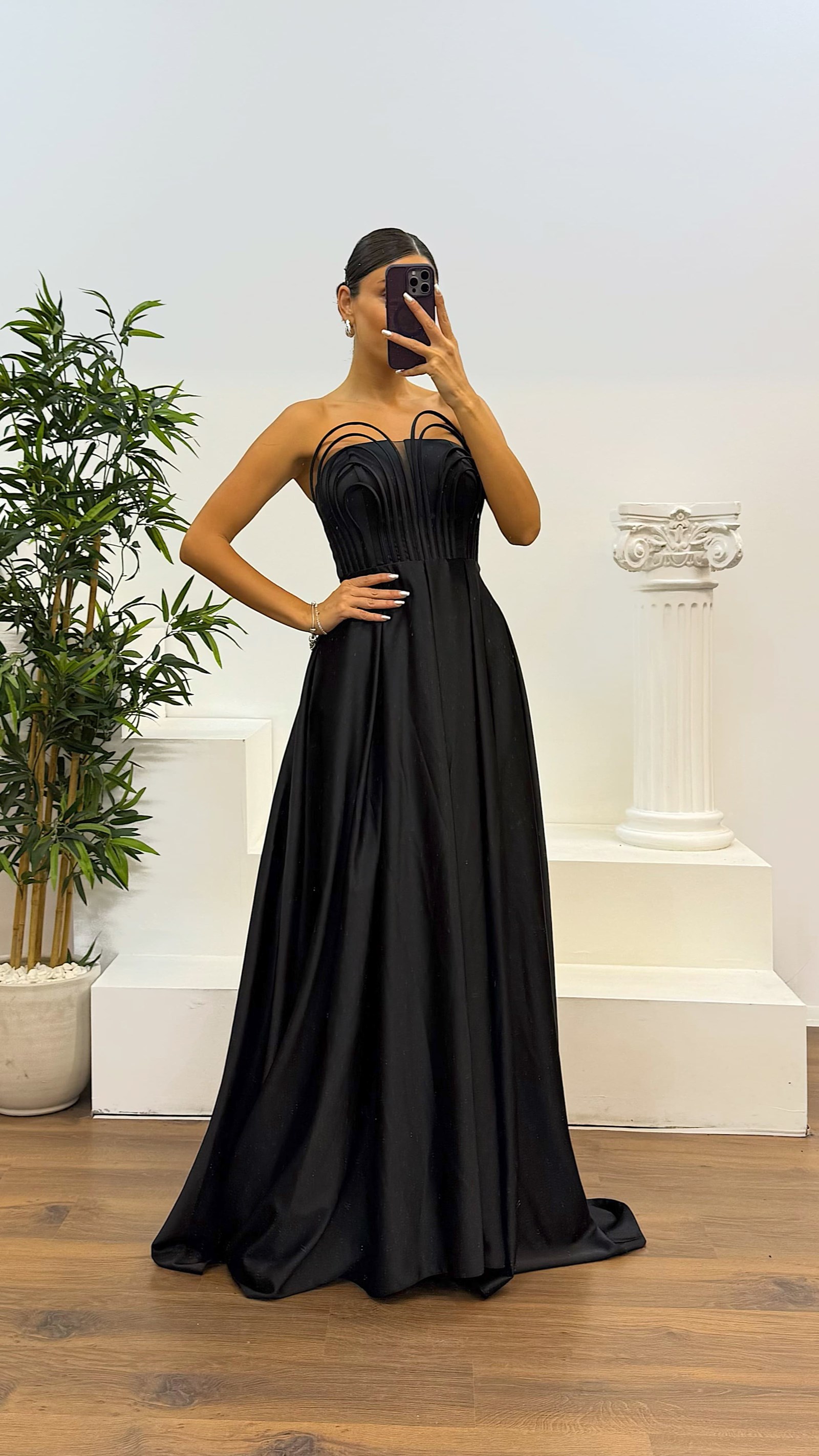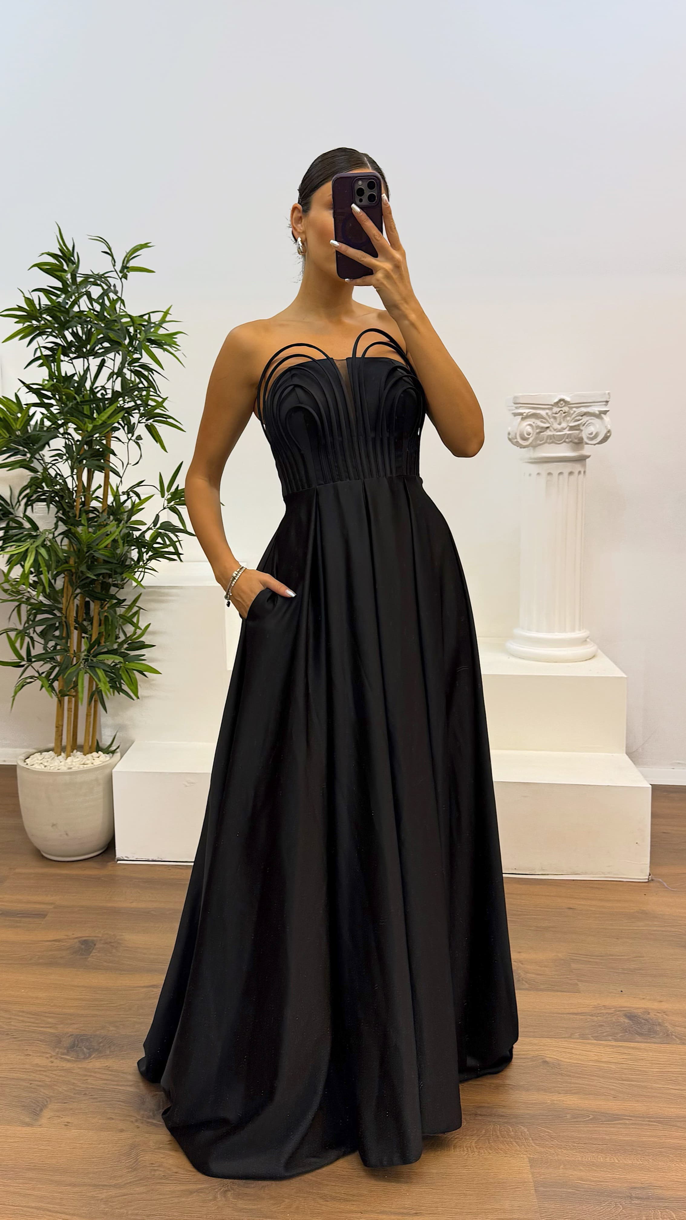 • Siyah Straplez Göğüs Detay Abiye Elbise