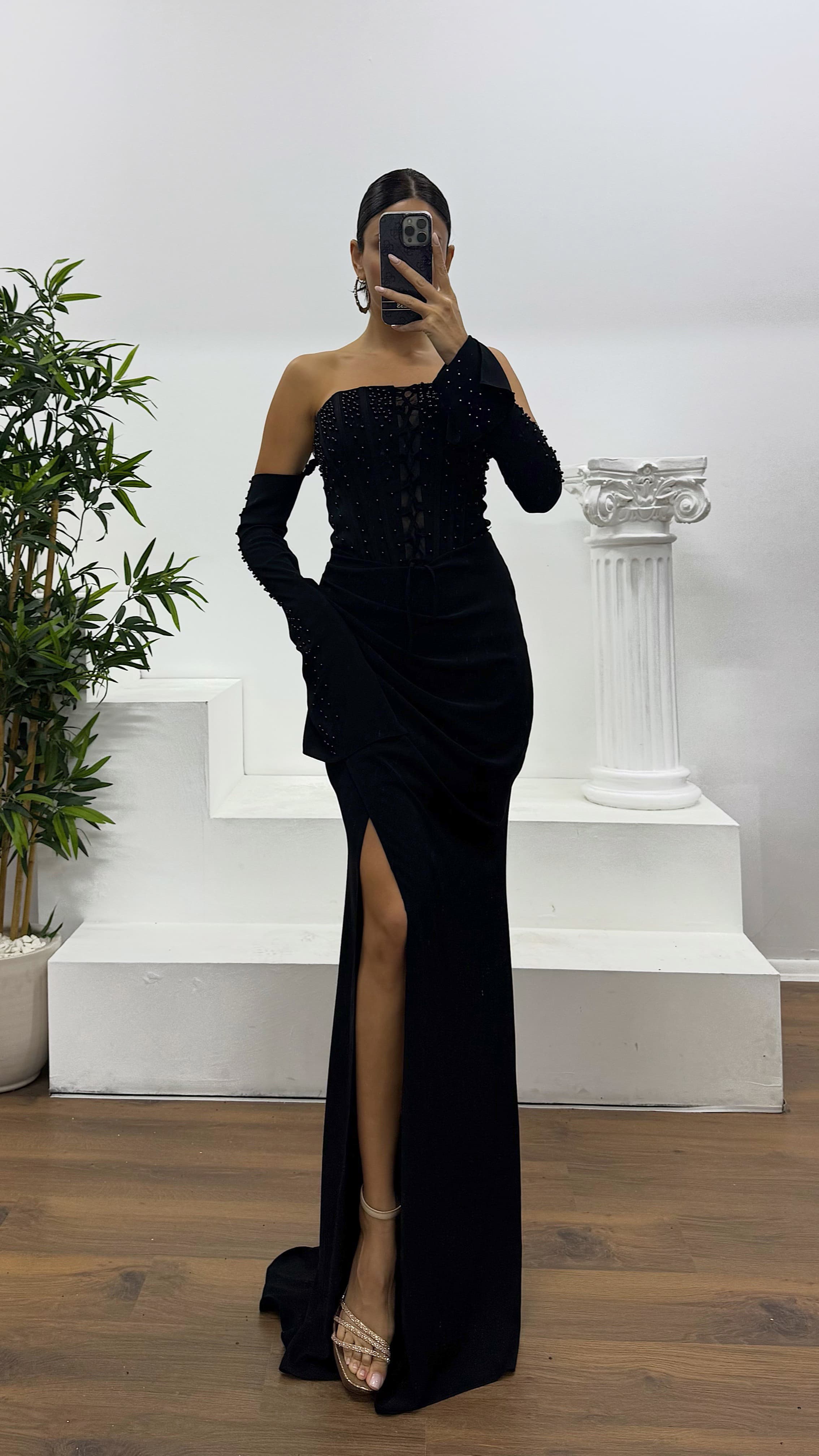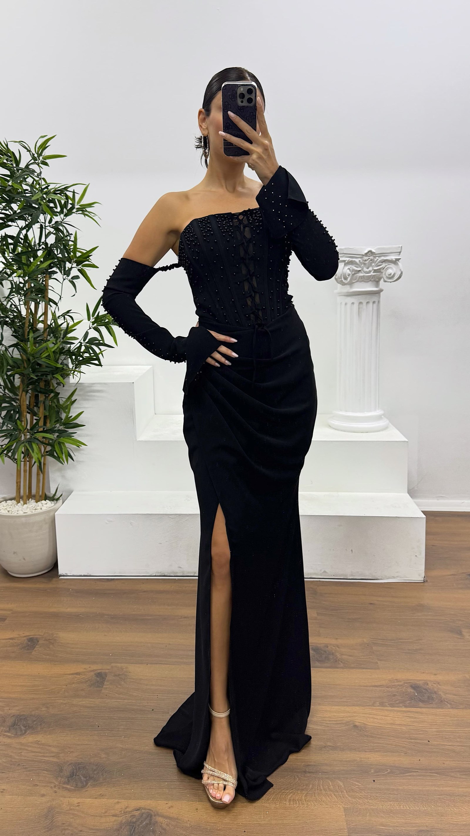 Abito da sera senza spalline con perle L'abito è adatto alle taglie dalla 36 alla 42. Ha coppe interne, fodera, dettagli sulle maniche, lacci incrociati e chiusura con zip sul retro, spacco e decorazioni con perle. Lunghezza dell'abito: Può variare tra 170 e 175 cm. Tipo di tessuto: 100% poliestere
