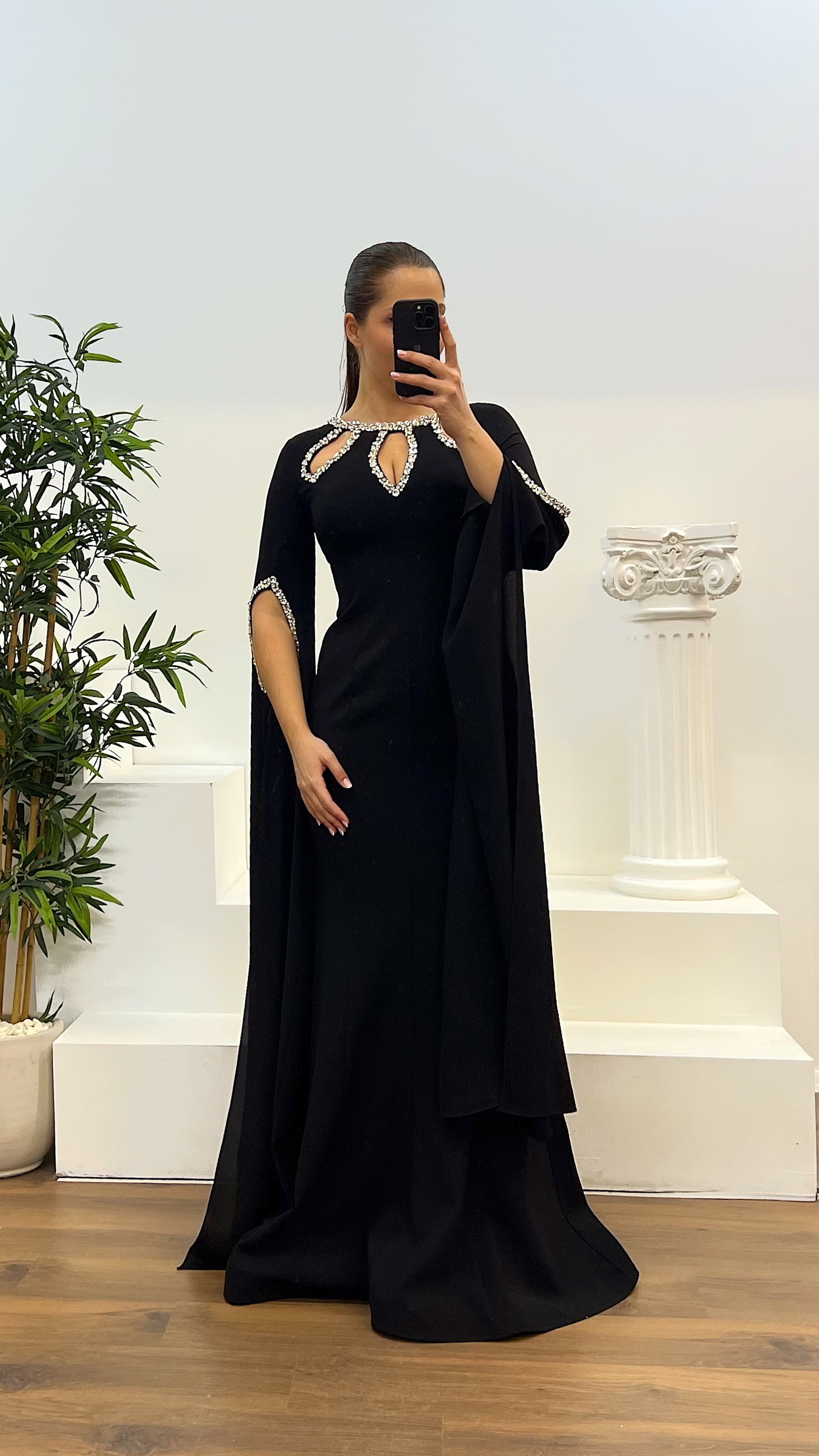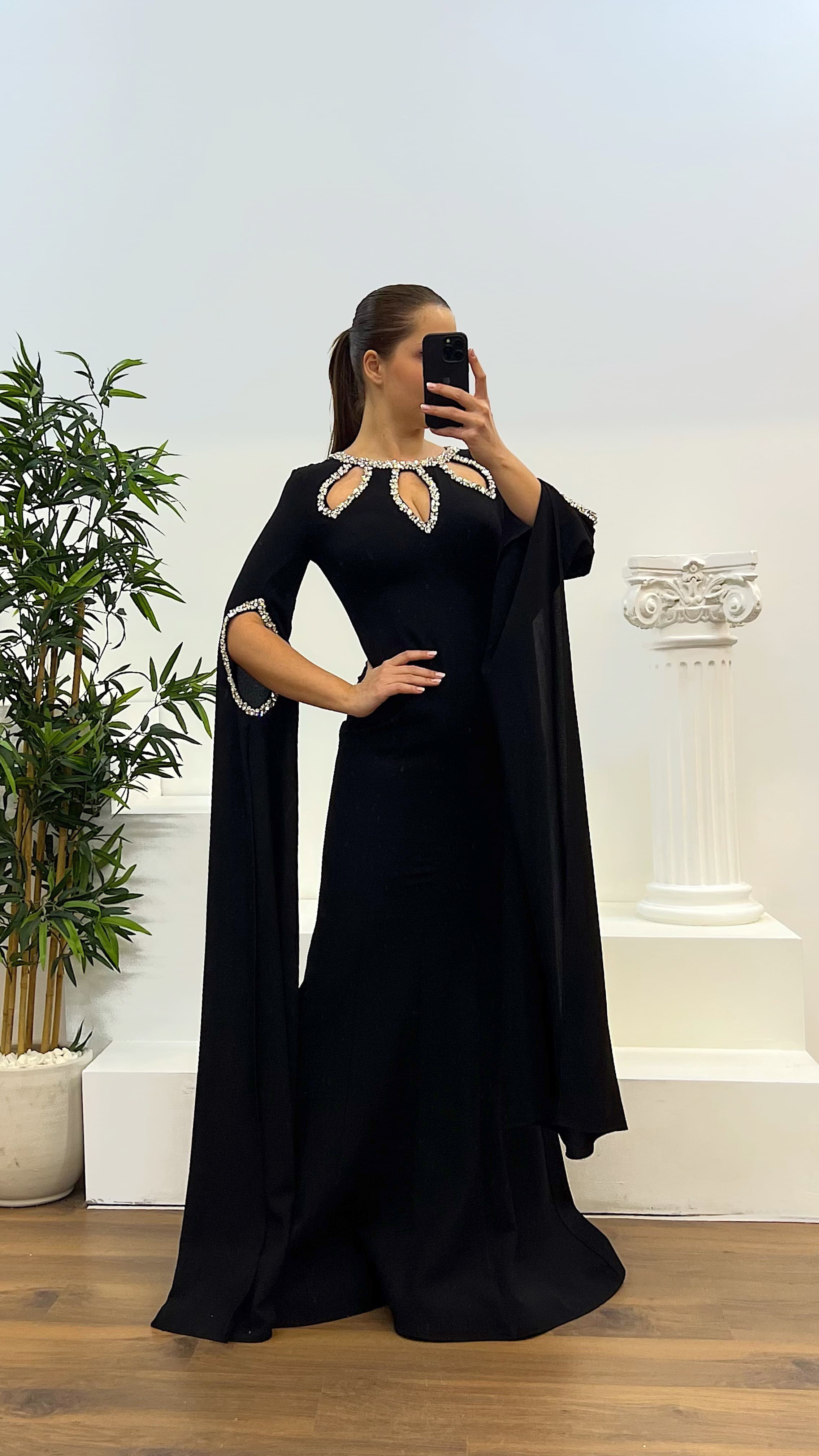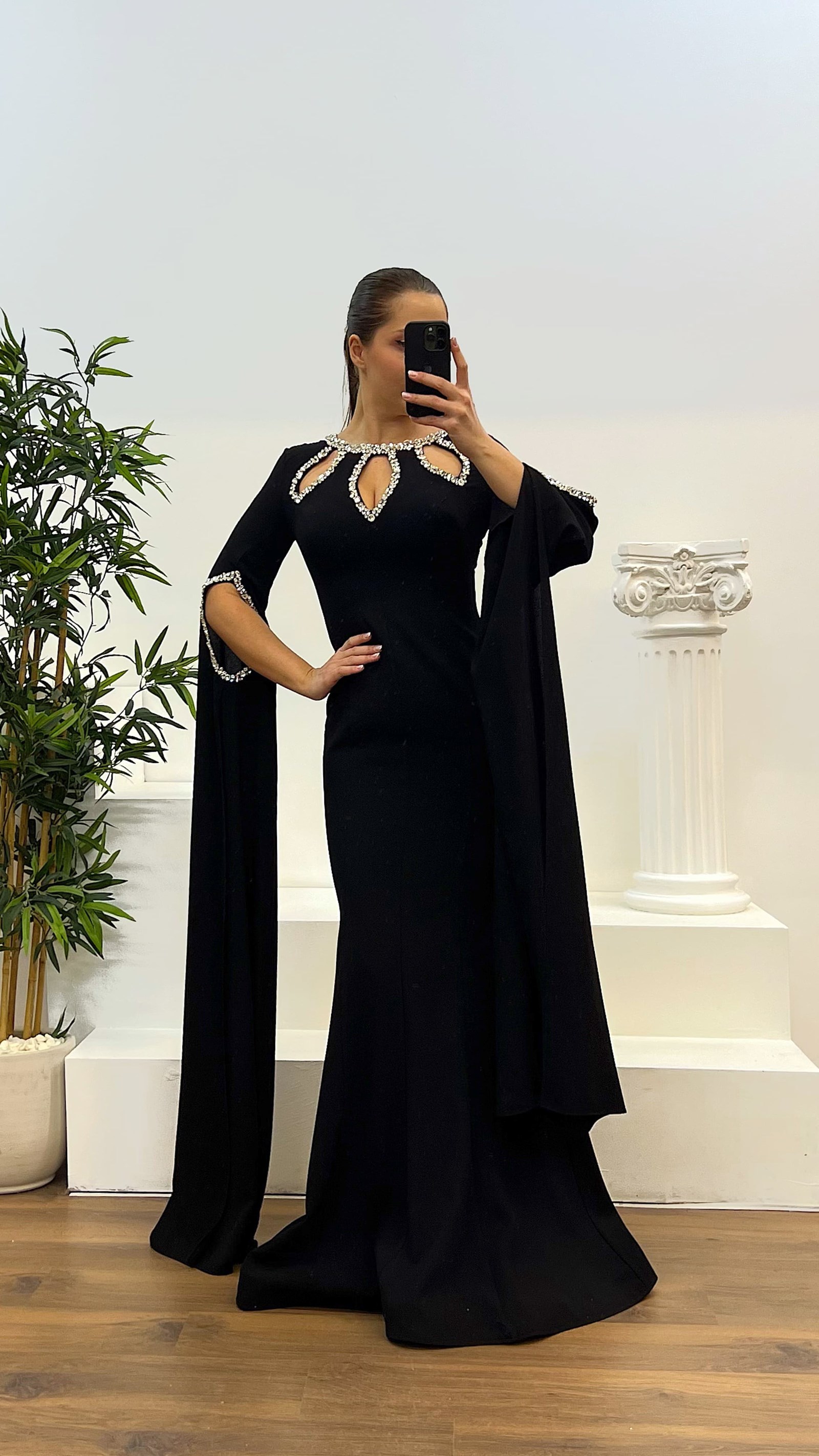 • Siyah Taş Detay Büyük Beden Abiye Elbise