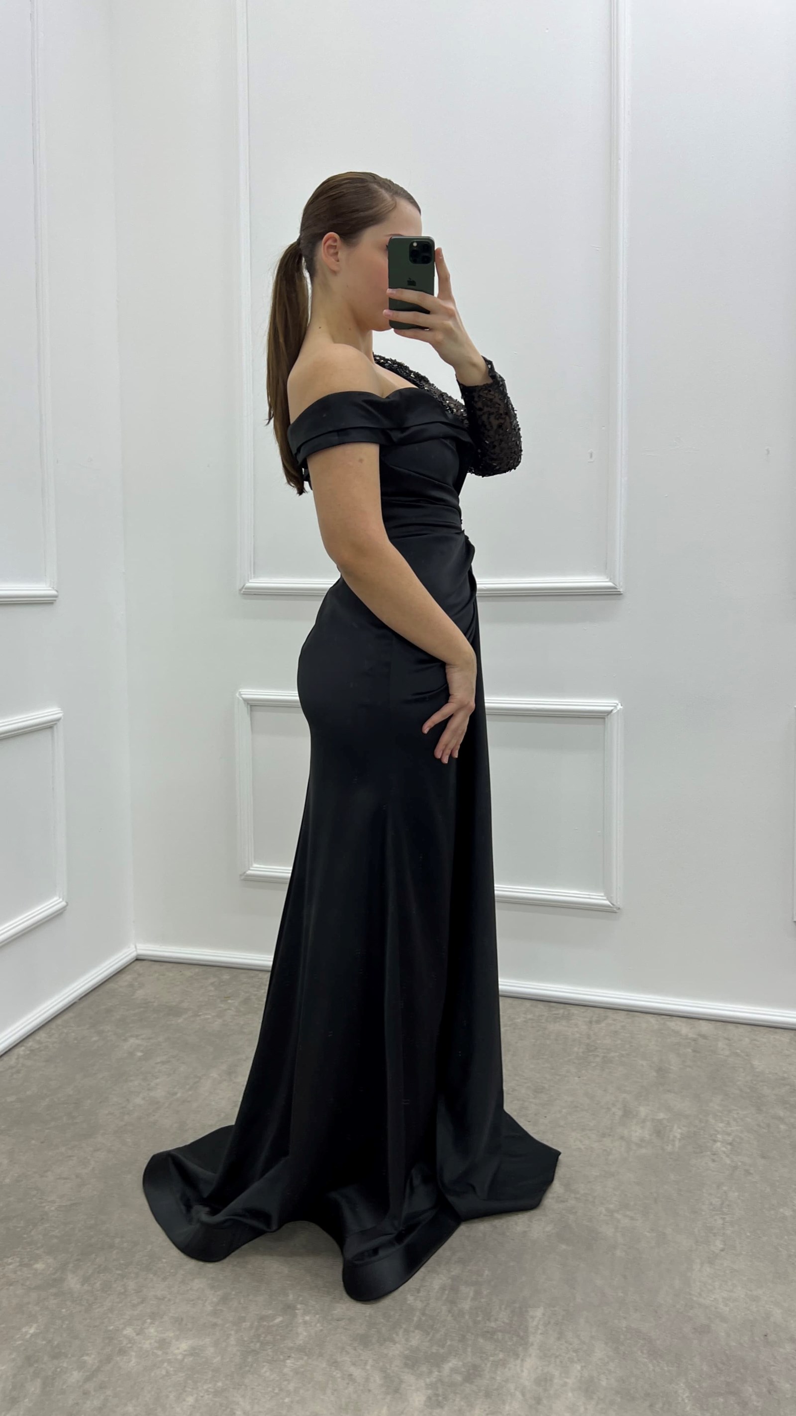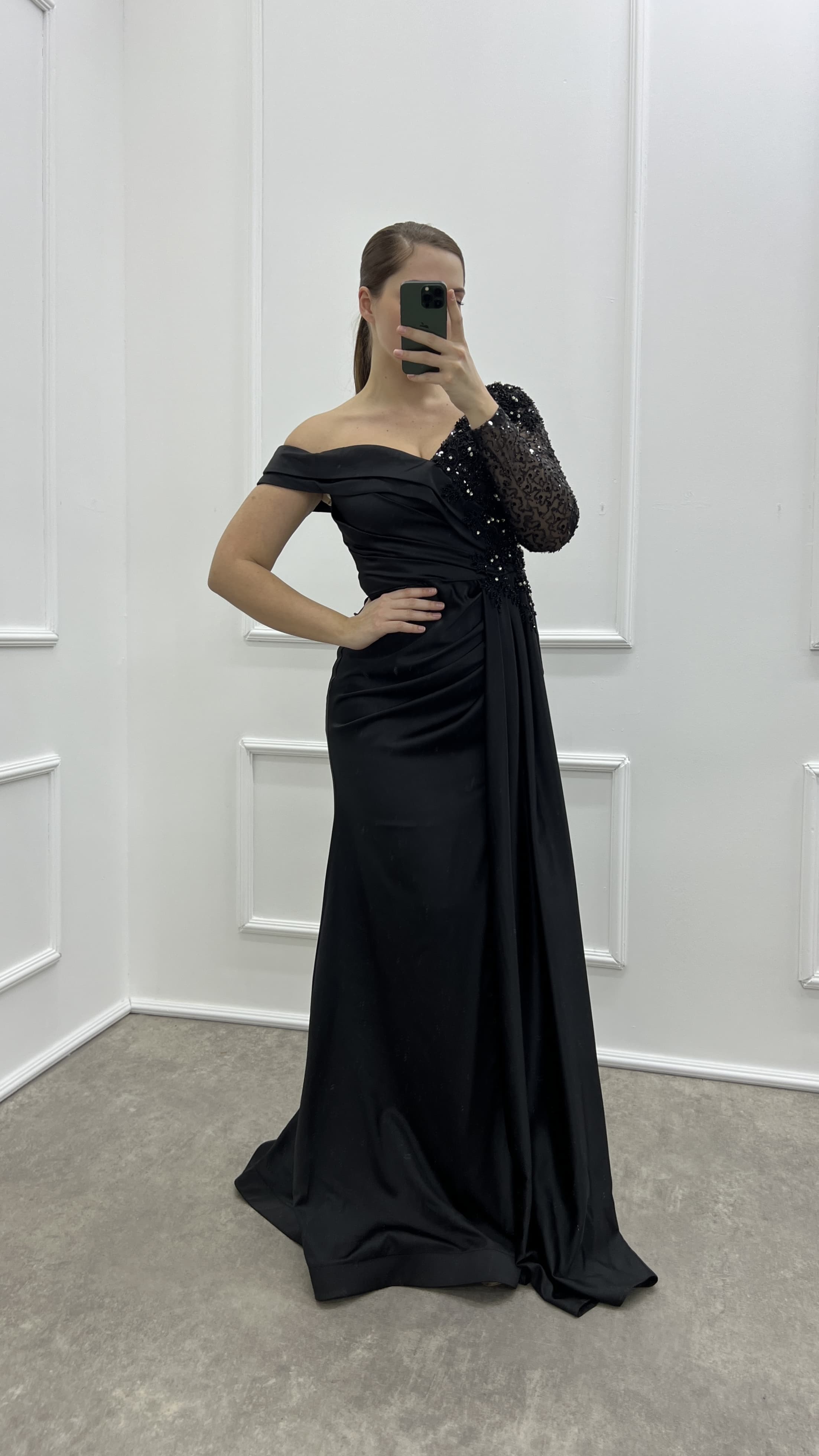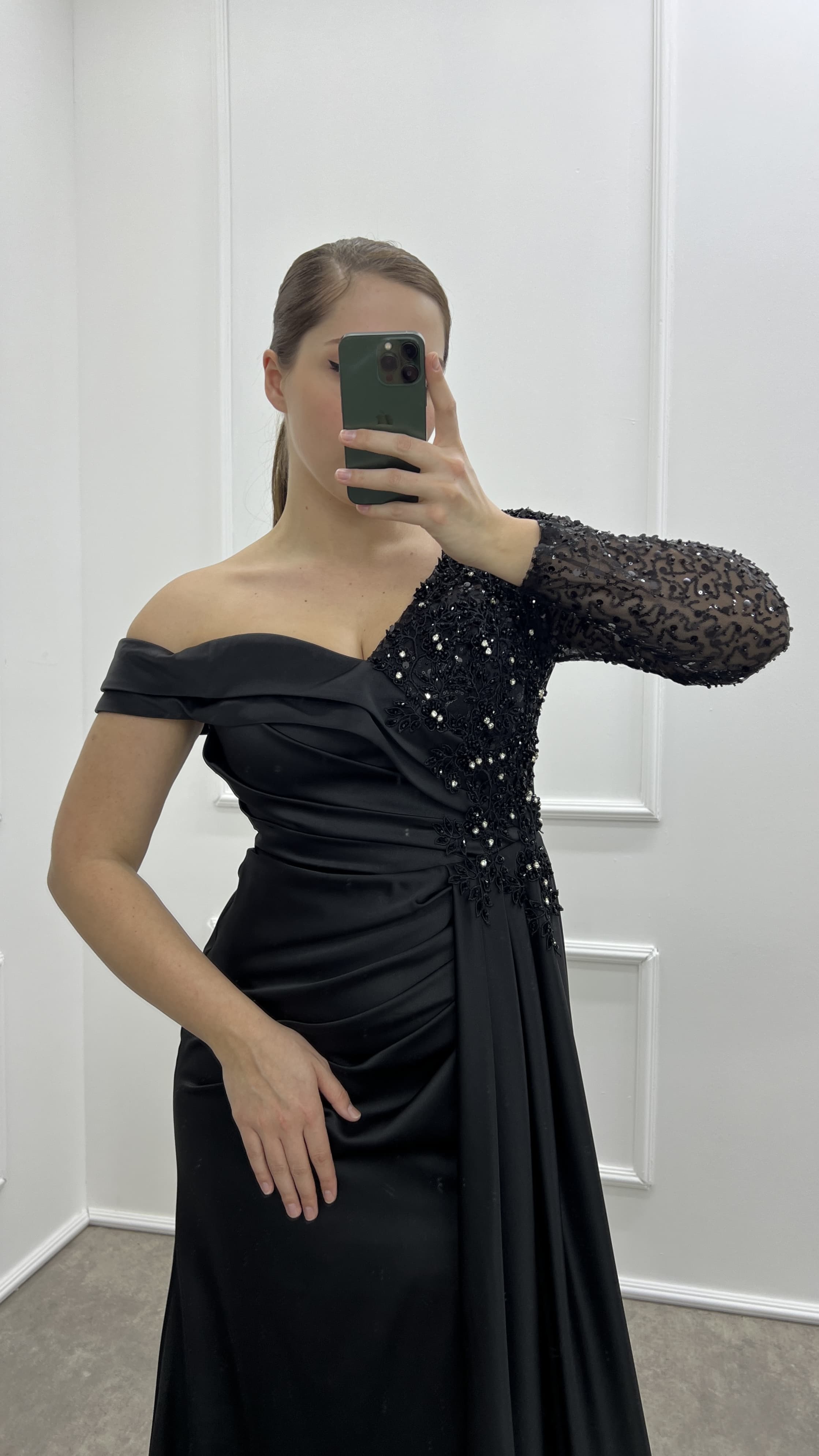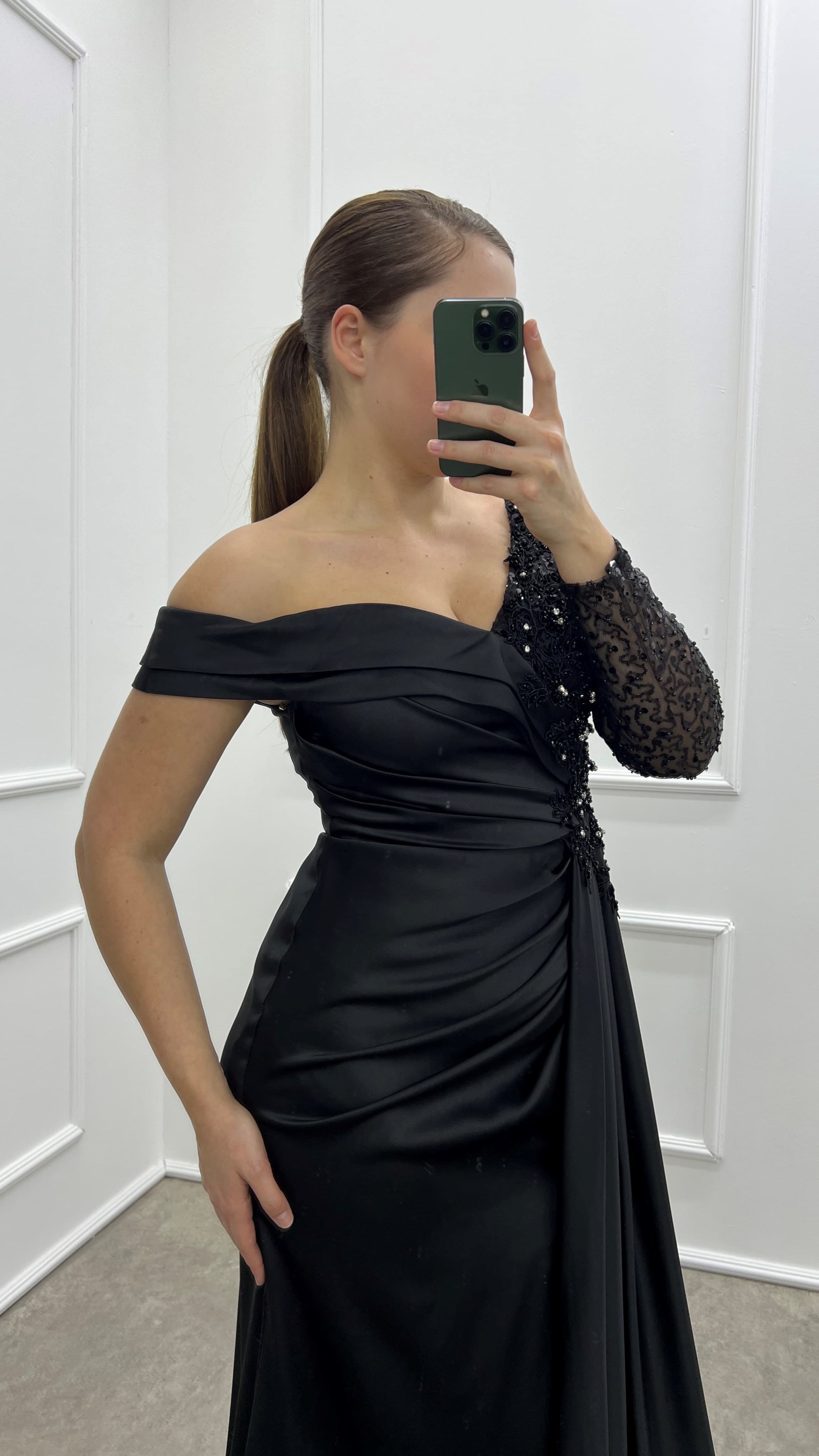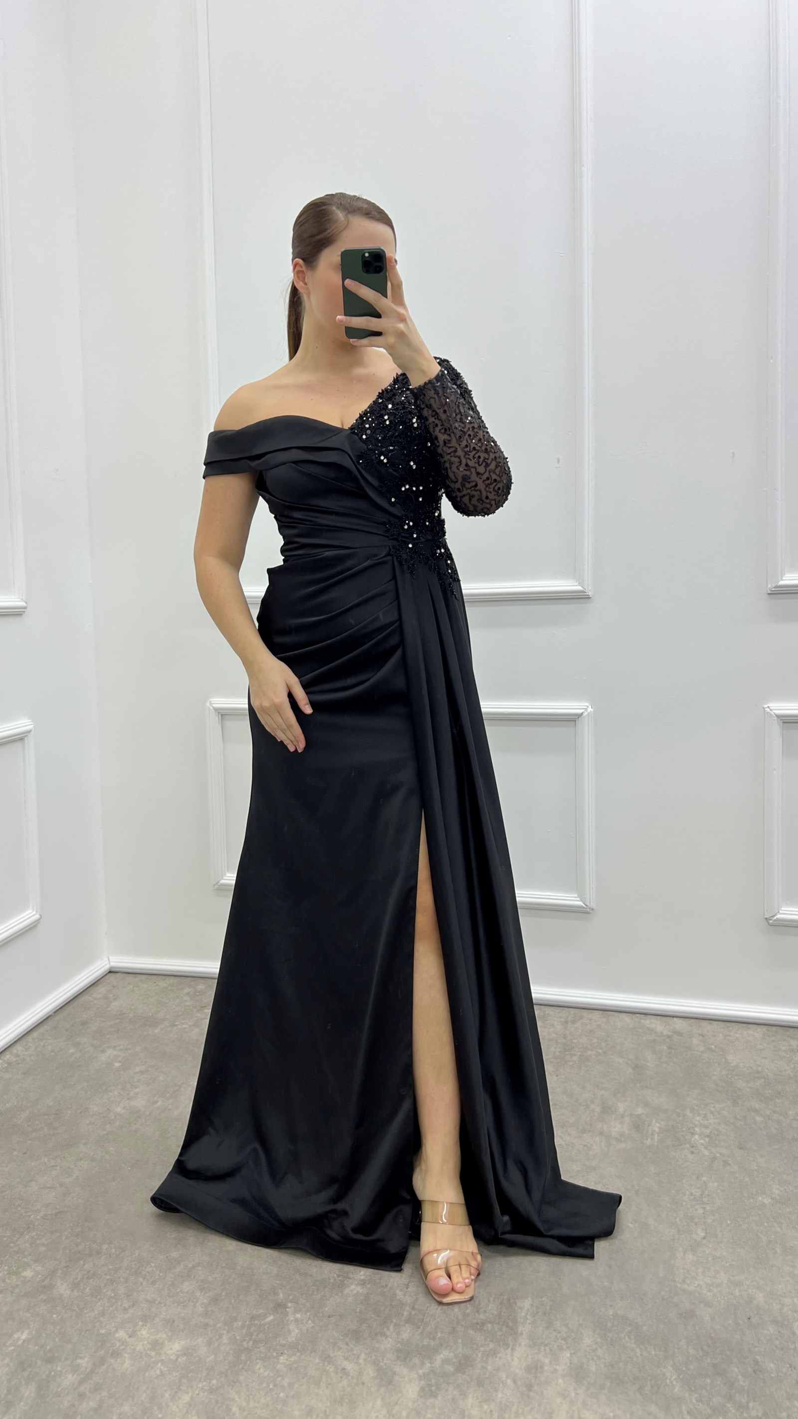 • Siyah Tek Kol Asimetrik Detay İşlemeli Tasarım Saten Büyük Beden Abiye Elbise