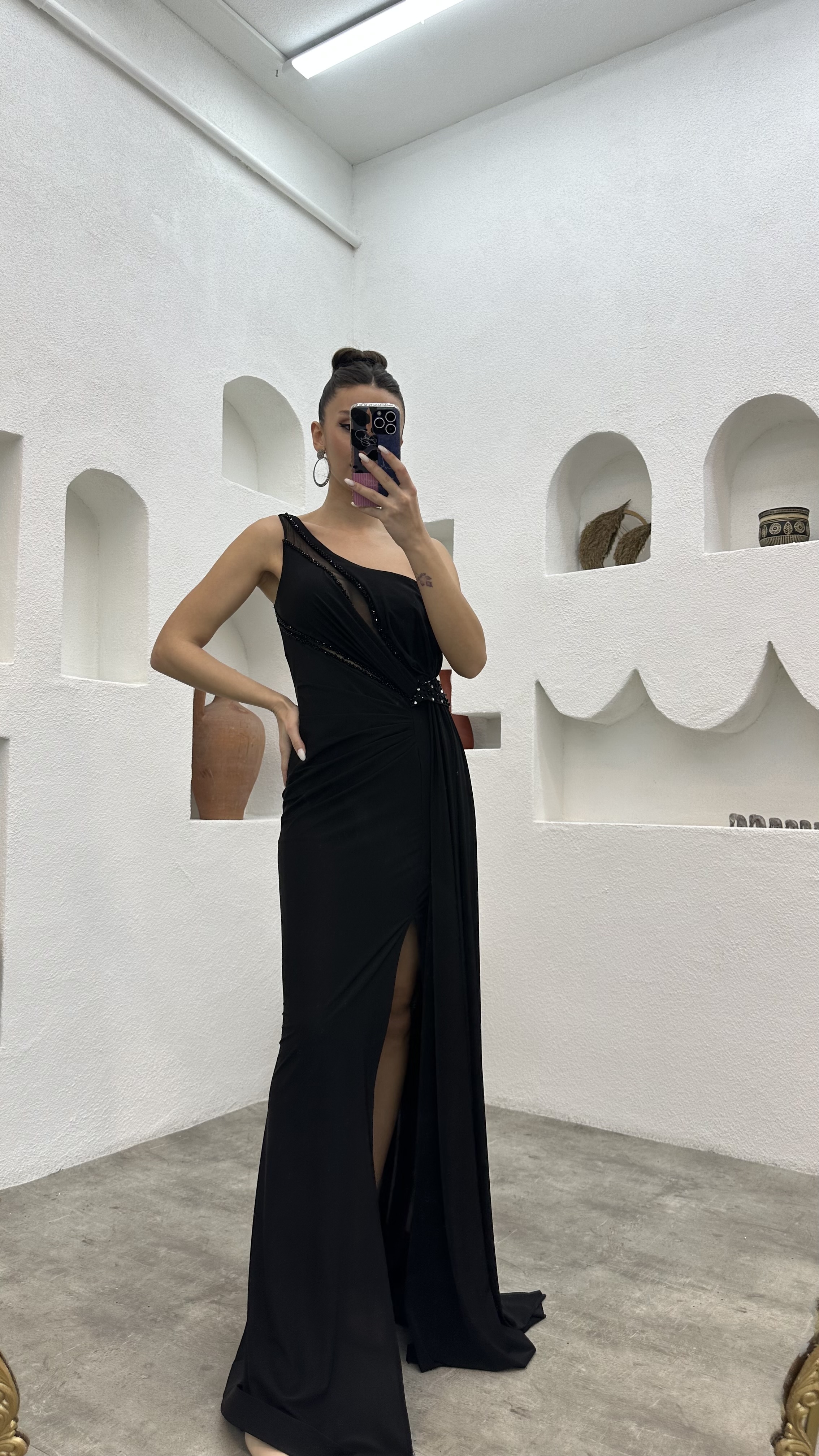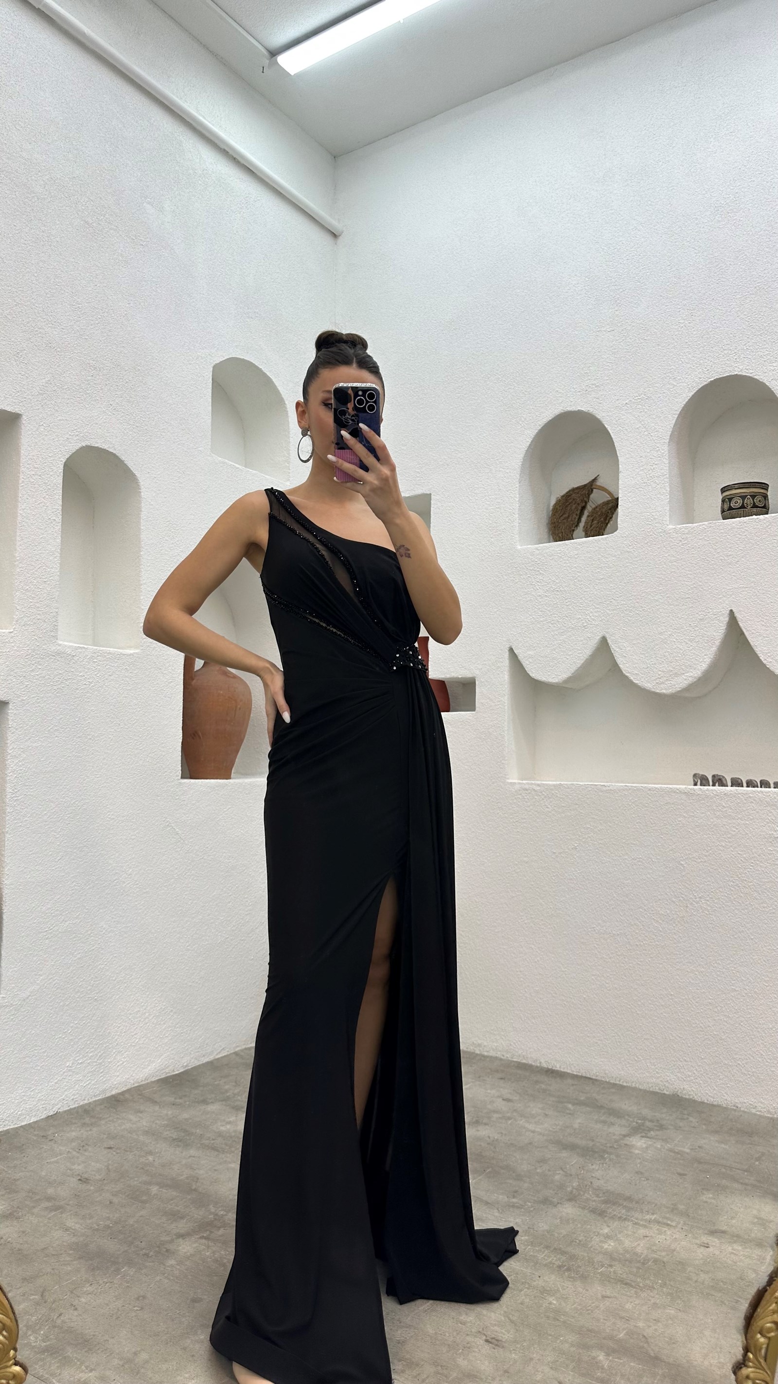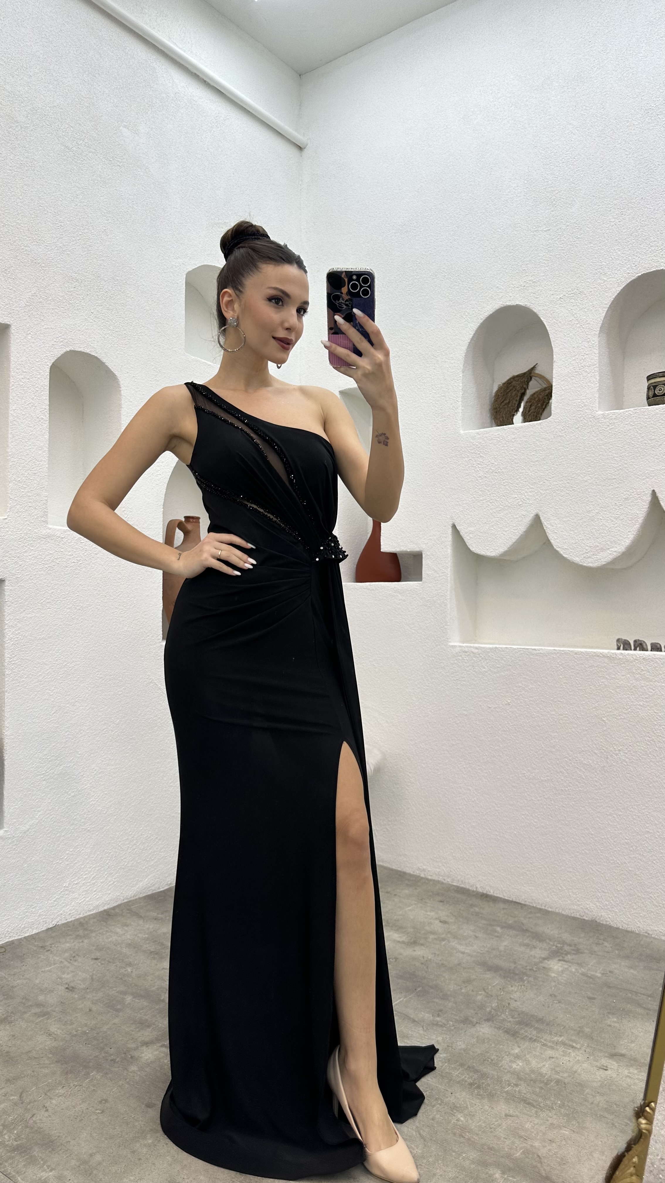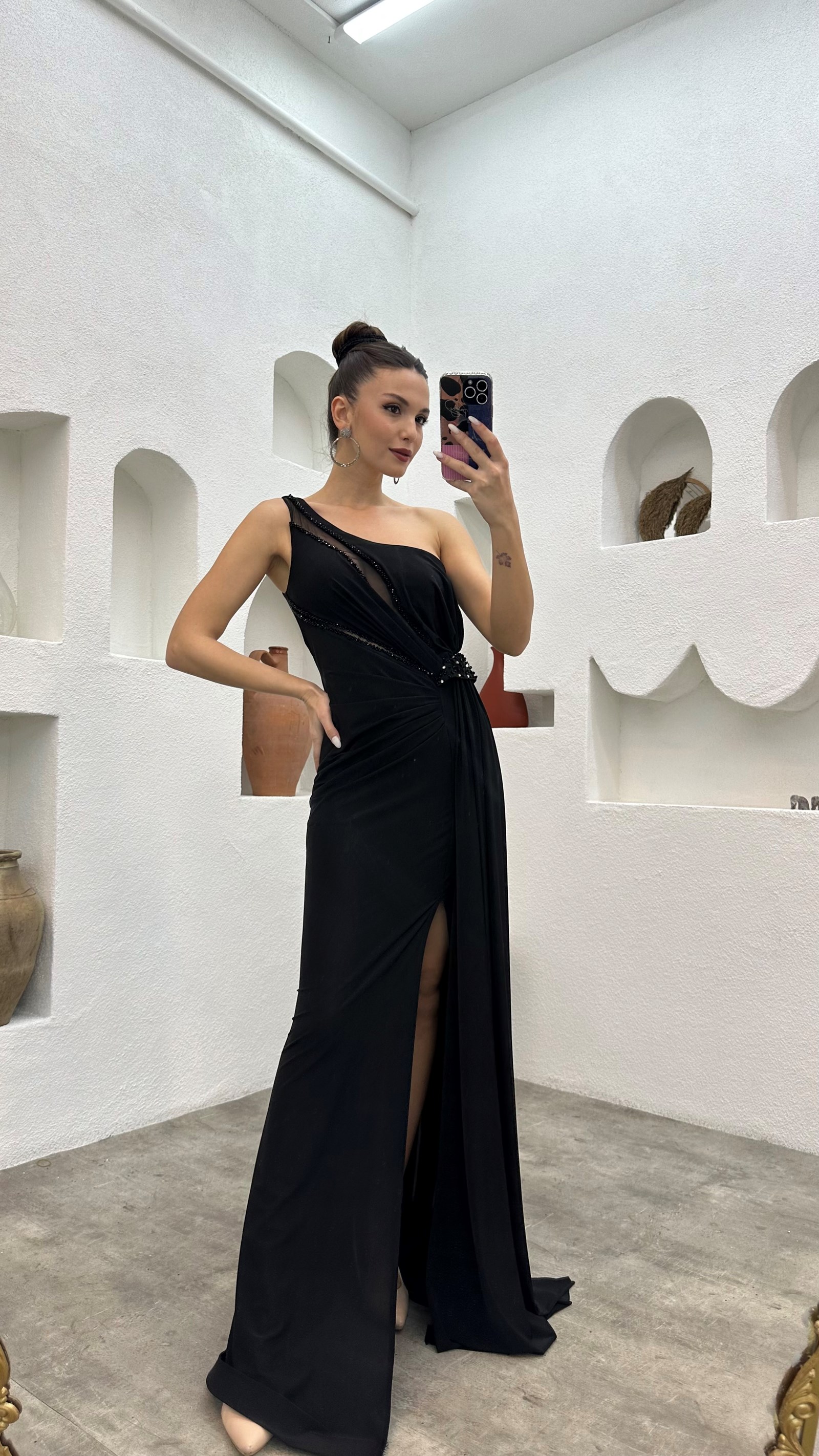 • Siyah Tek Omuz İşlemeli Beli Motifli Abiye Elbise