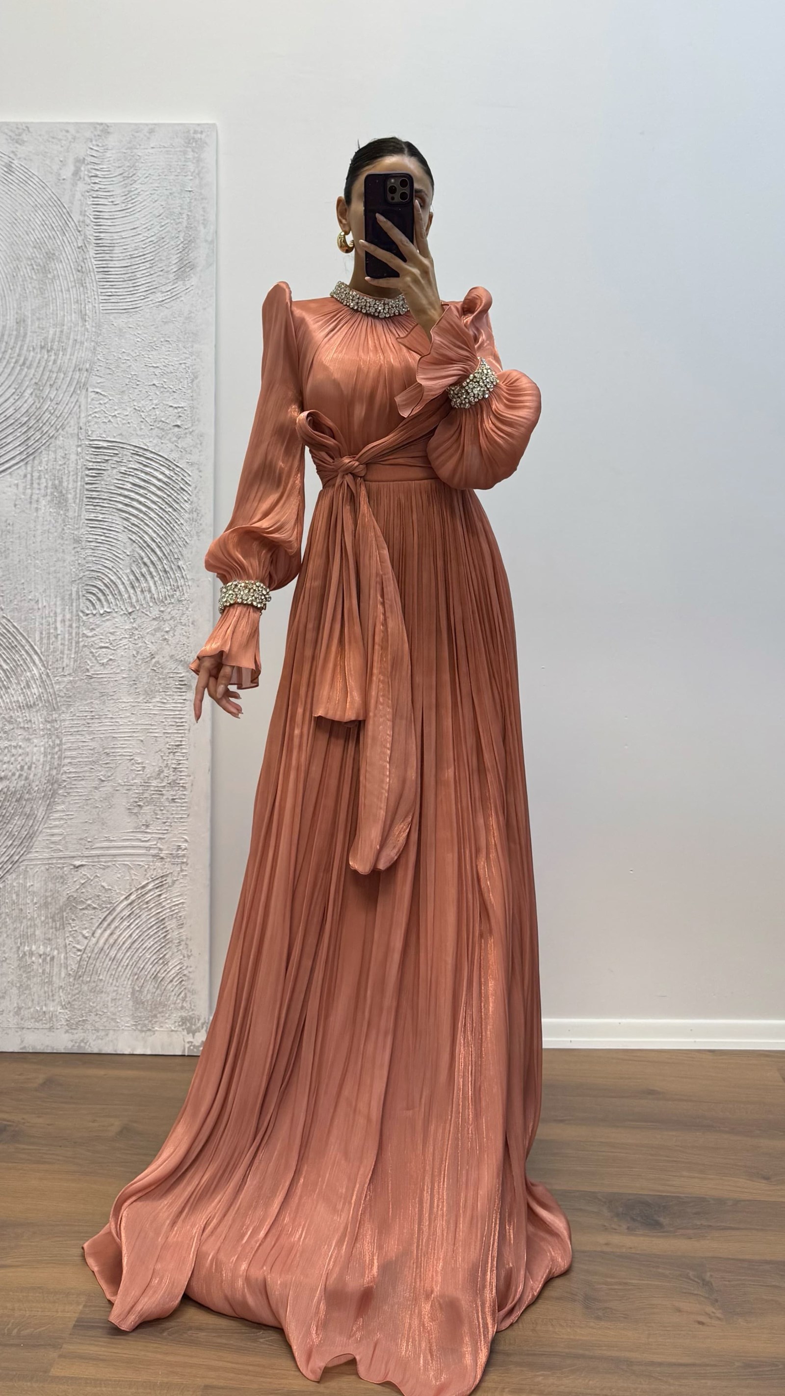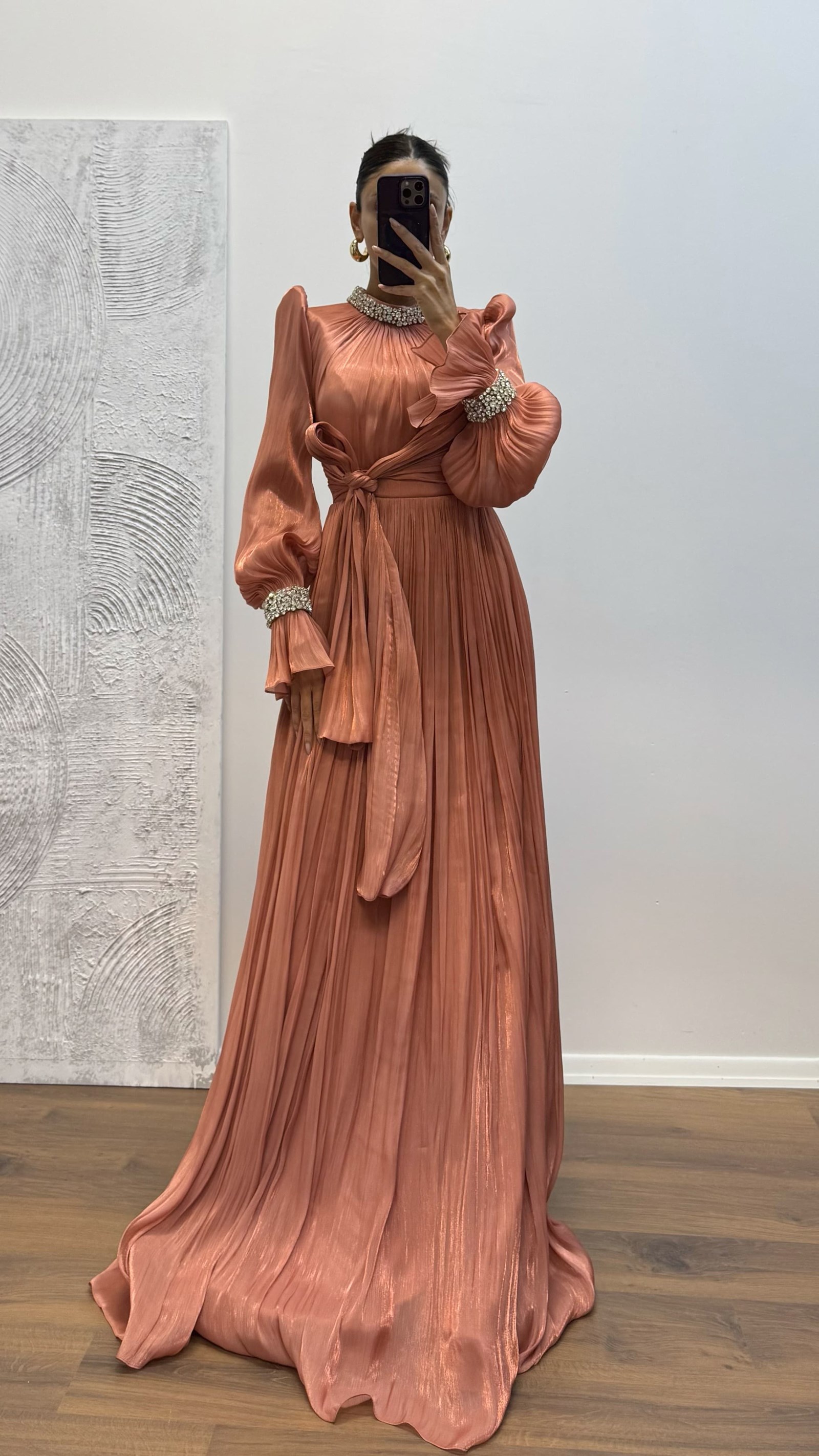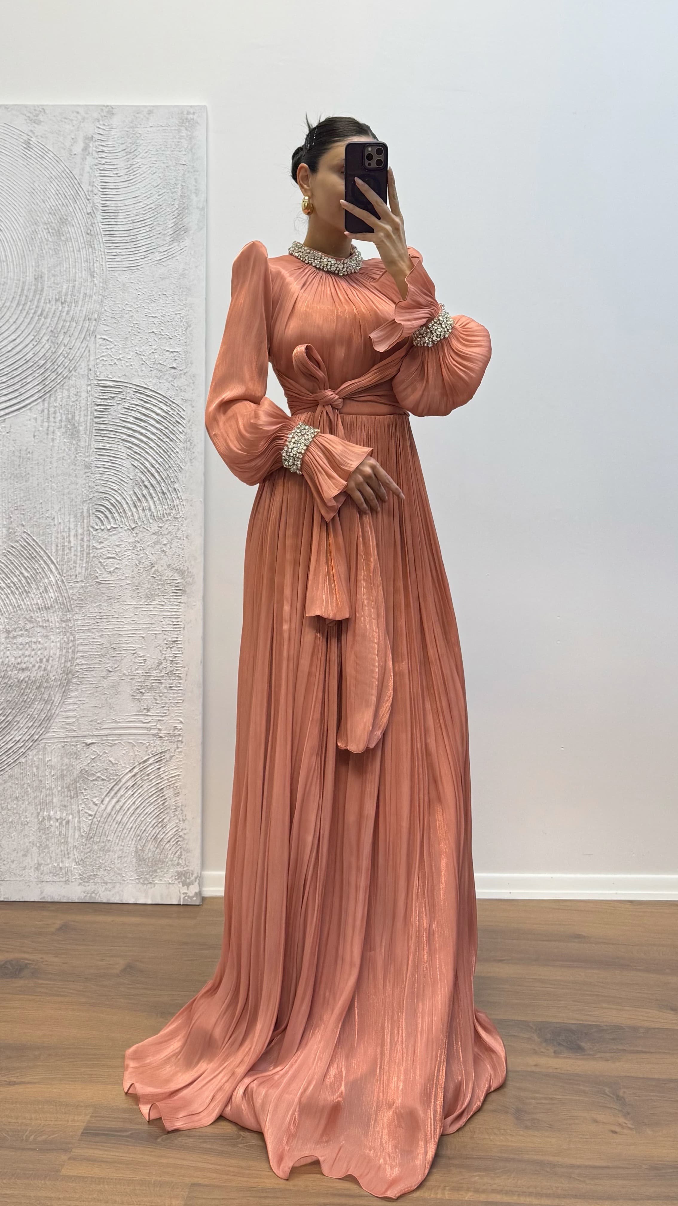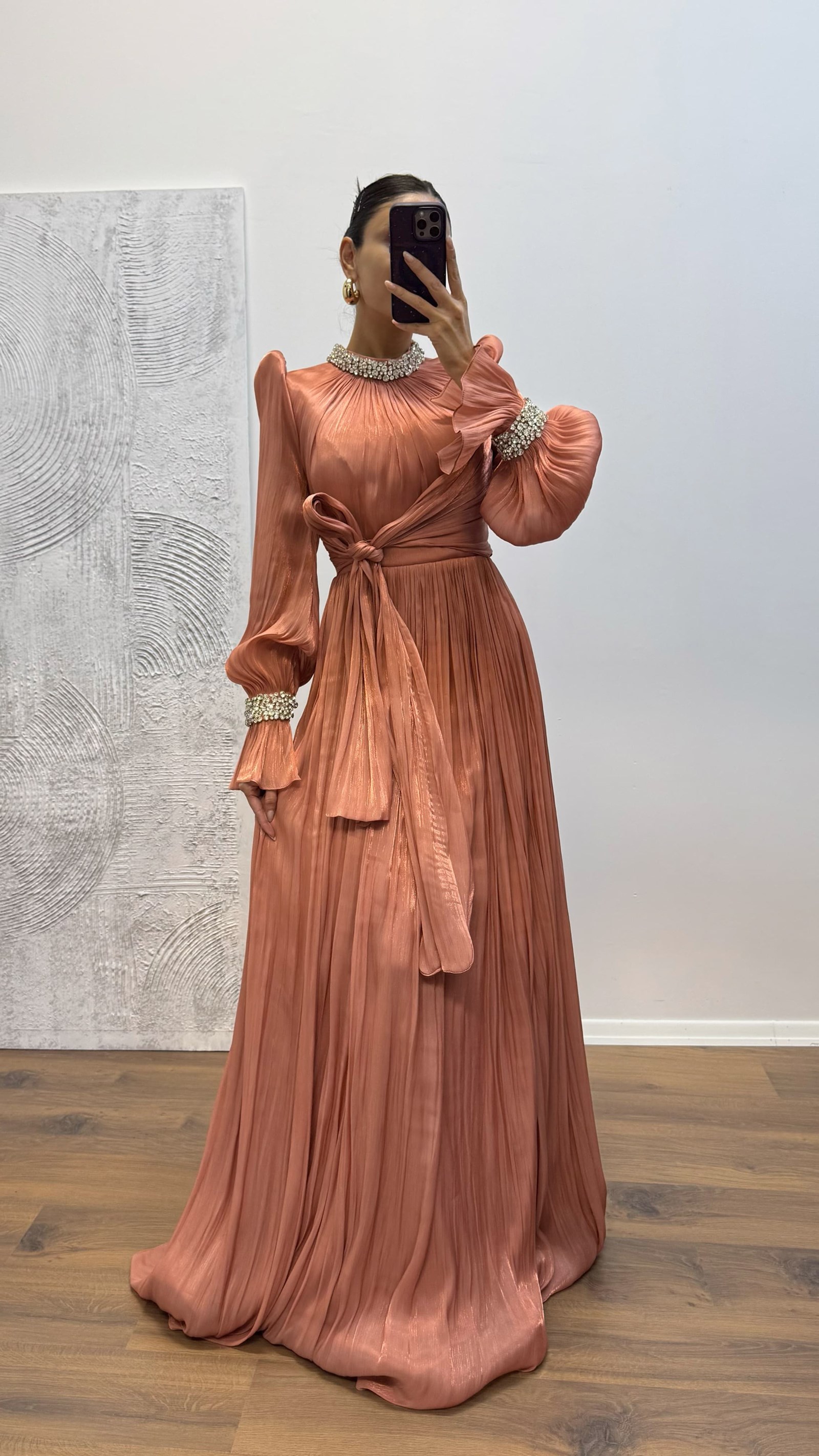 • Soğan Kabuğu Kol ve Boyun İşleme Detay Abiye Elbise