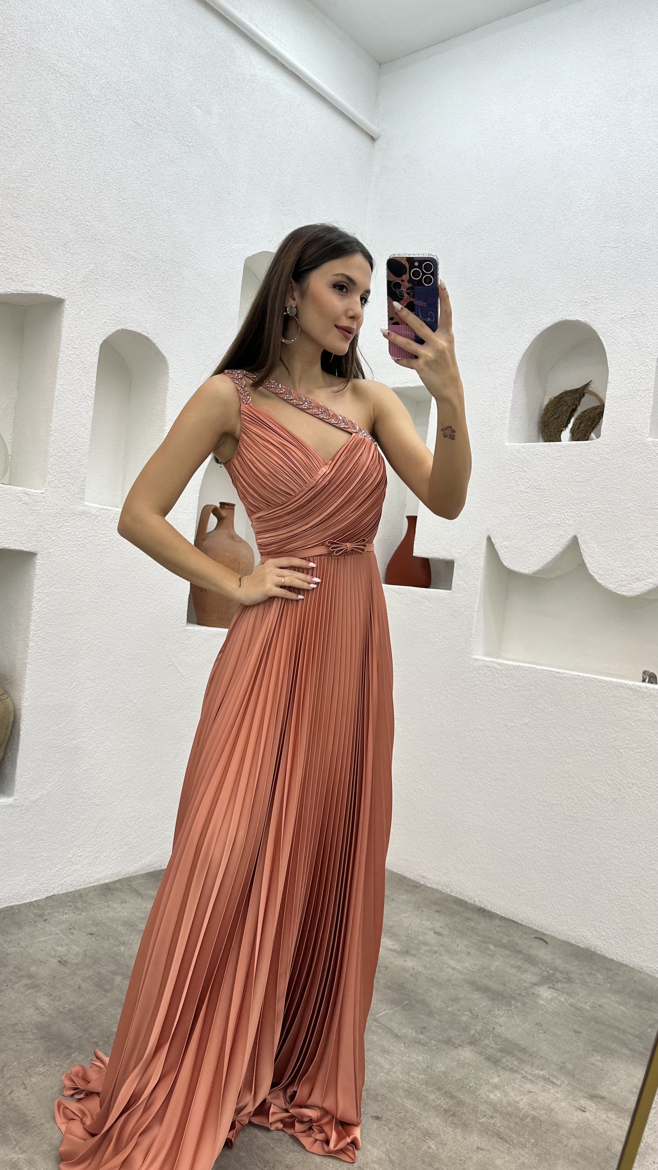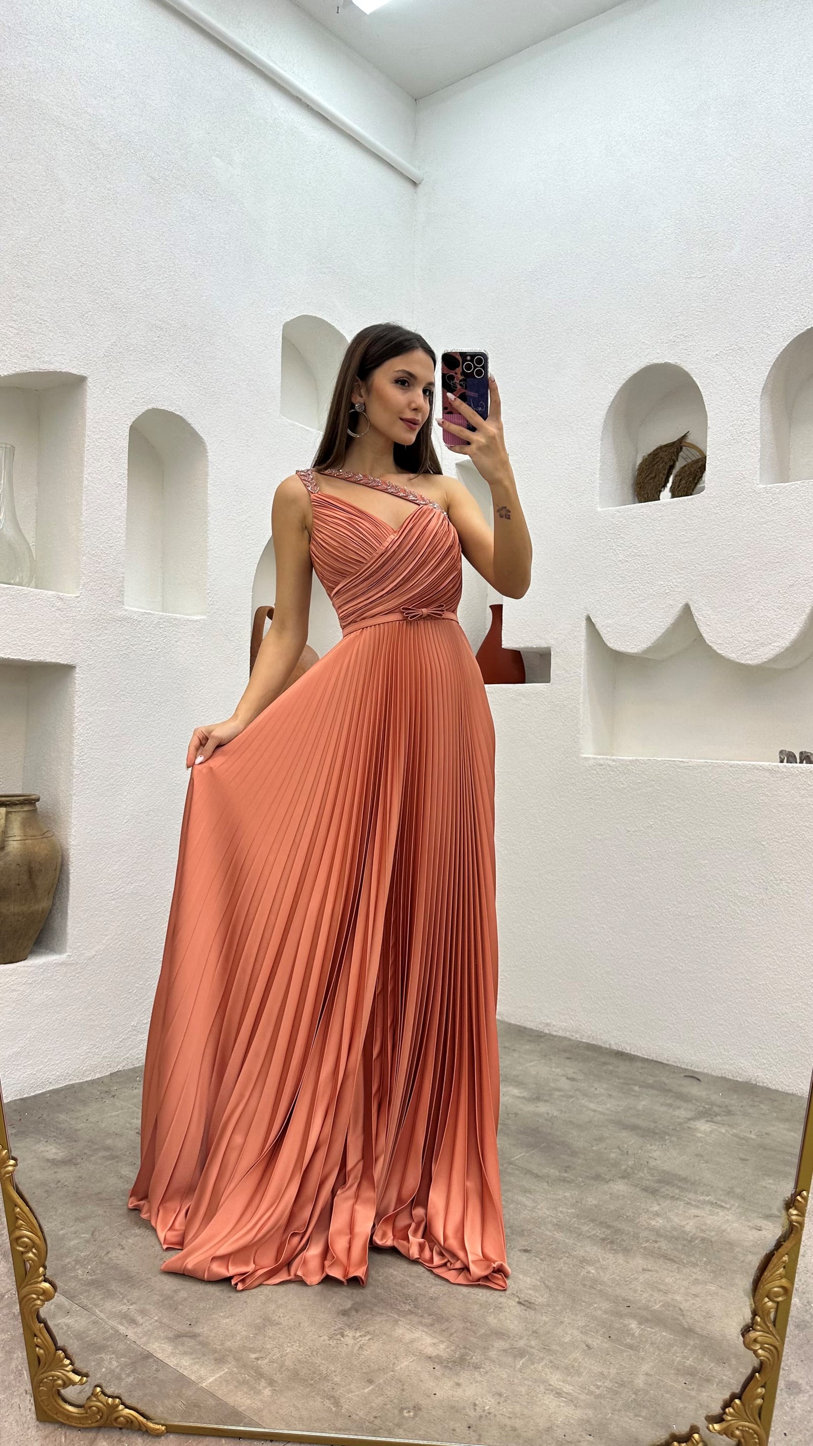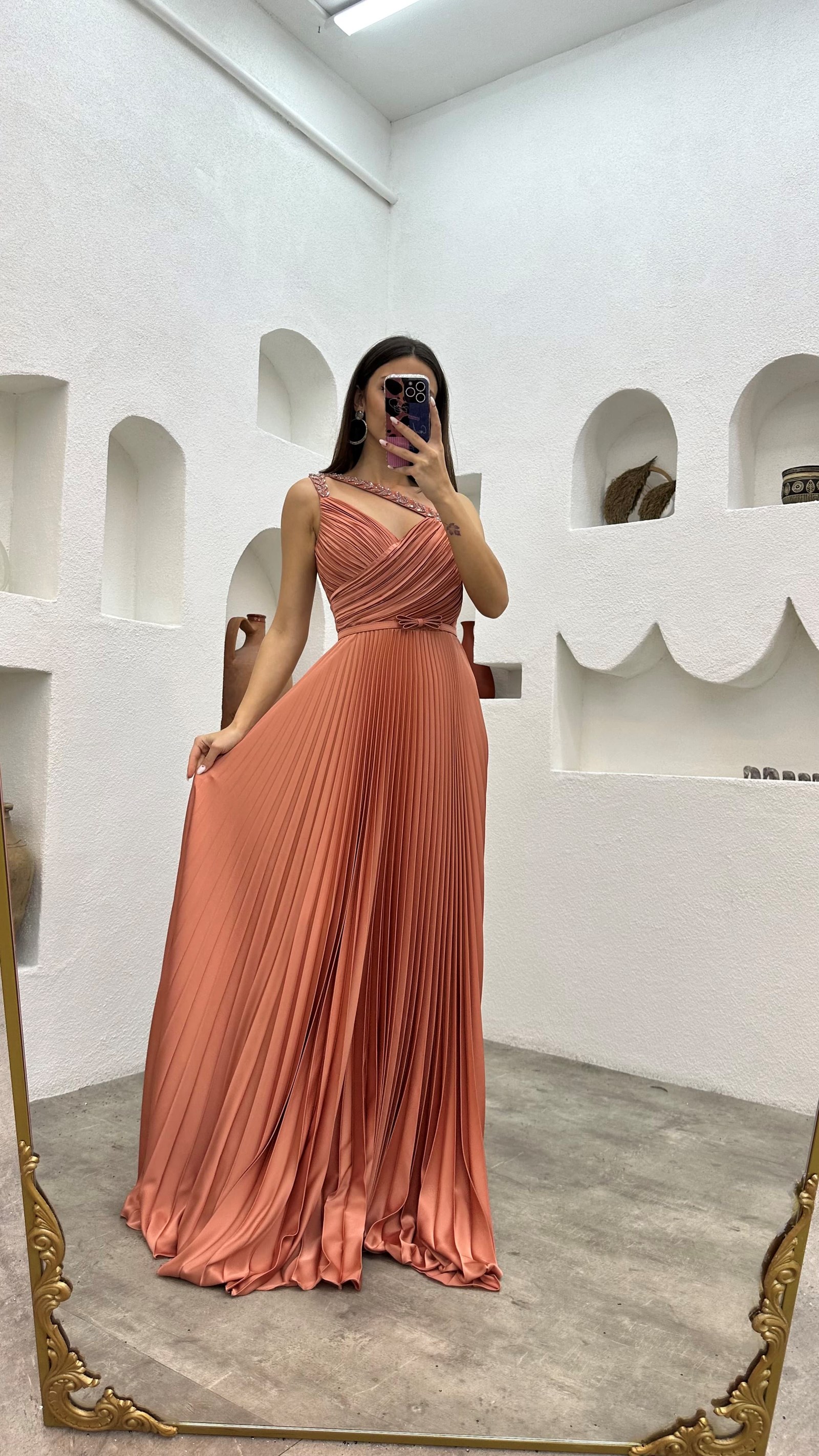 • Turuncu Askıları İşlemeli Piliseli Saten Abiye Elbise