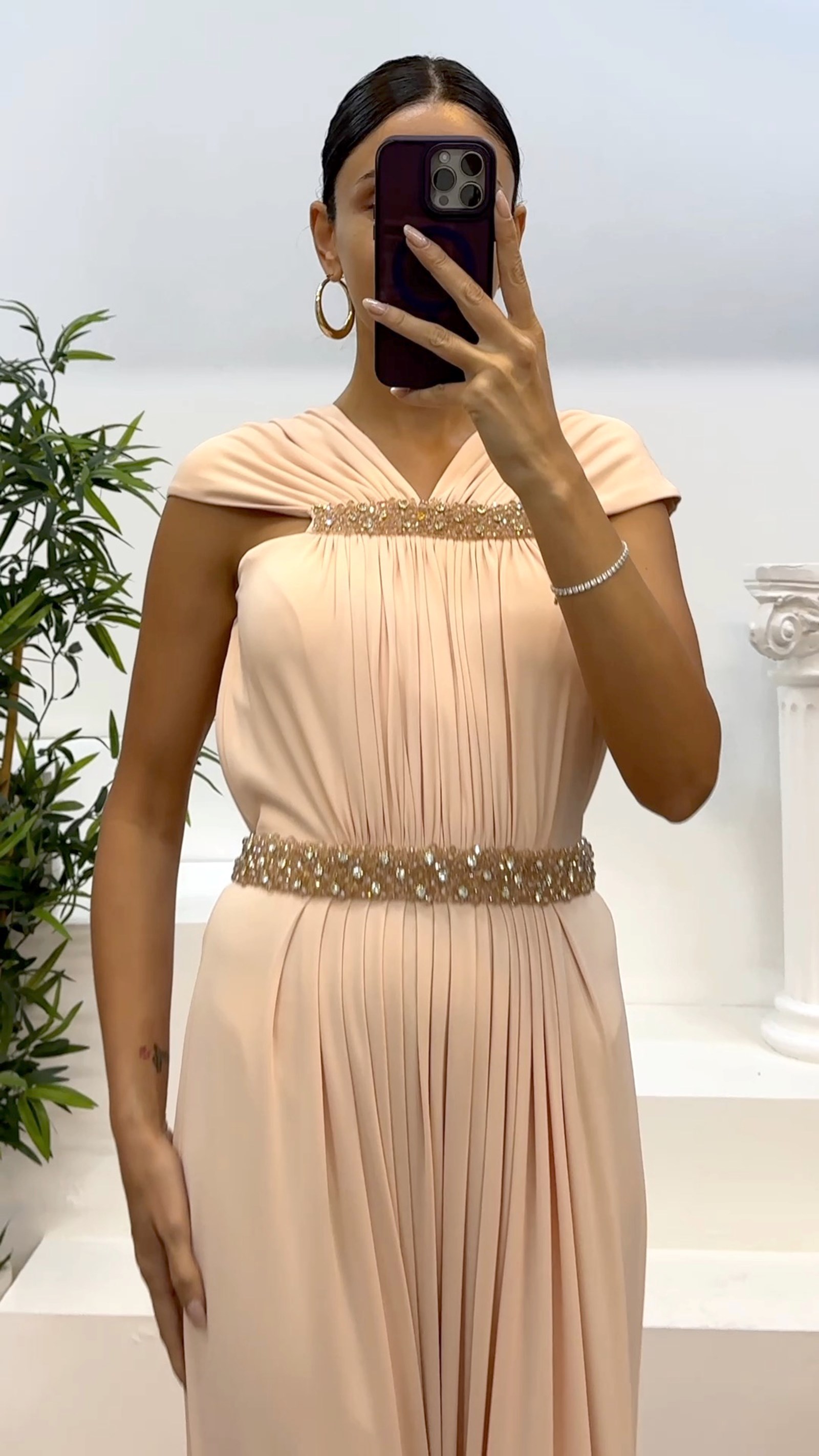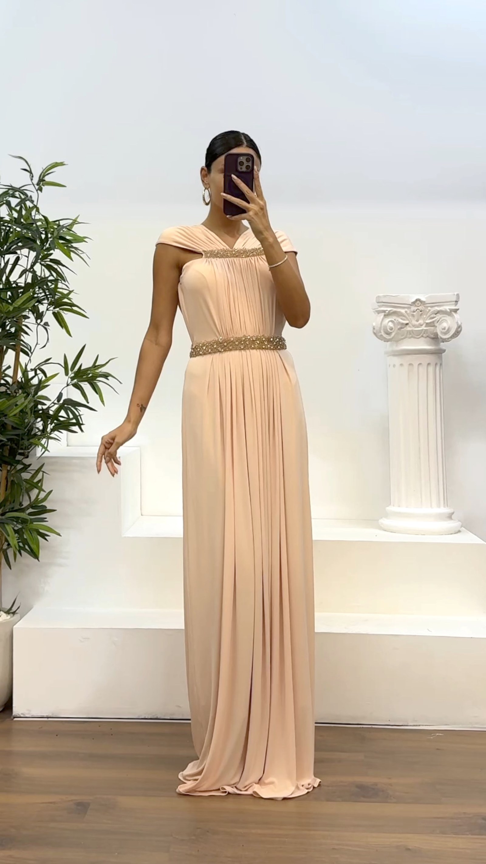 • Pudra Bel Ve Boyun İşleme Detay Abiye Elbise