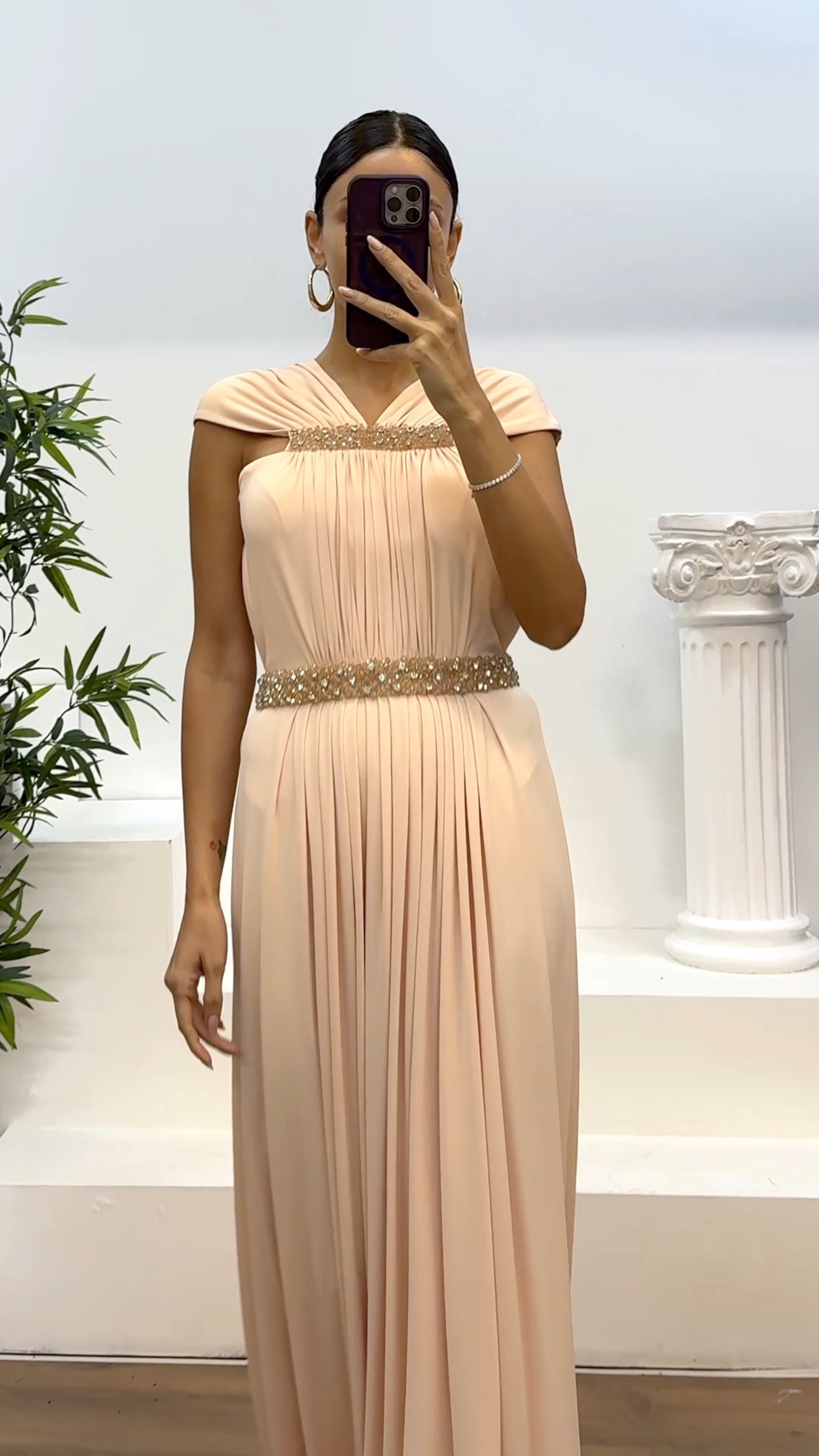 • Abito da sera con dettagli ricamati in vita e collo color salmone