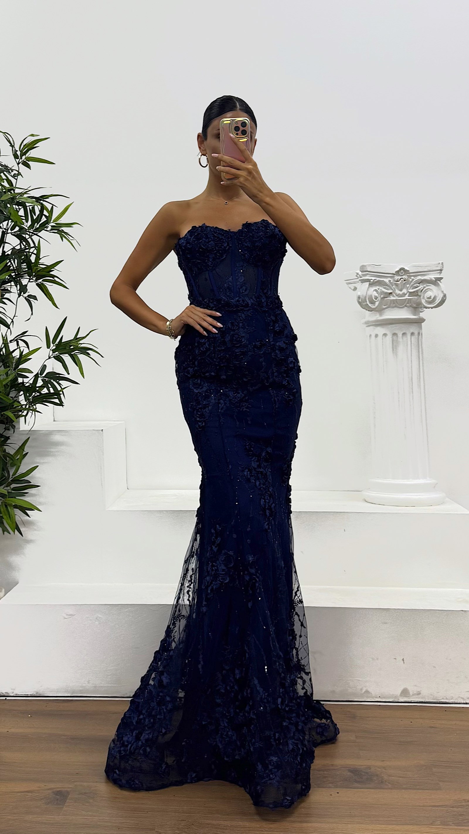 Abito da sera blu navy senza spalline con dettagli in rosa trasparente