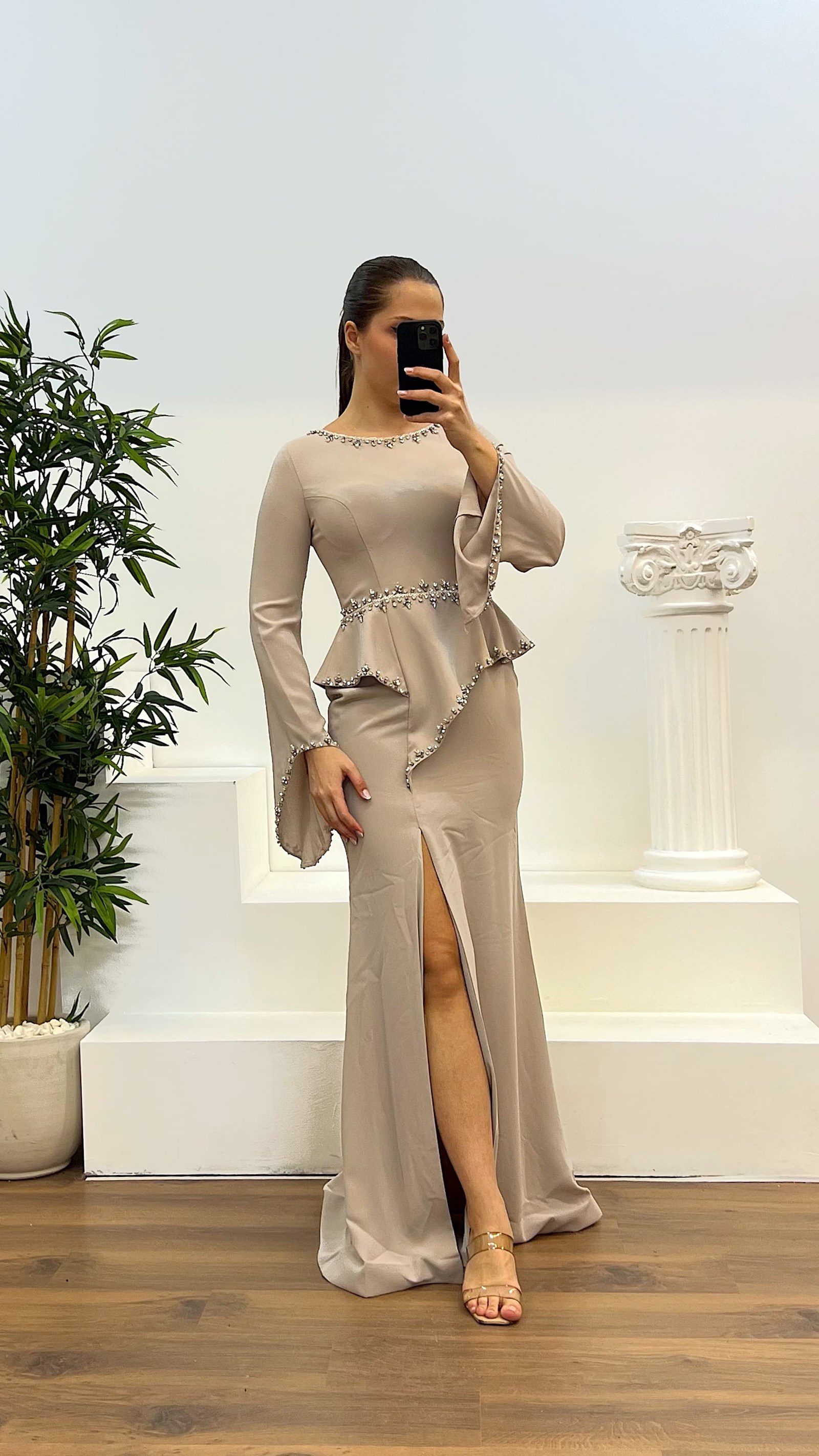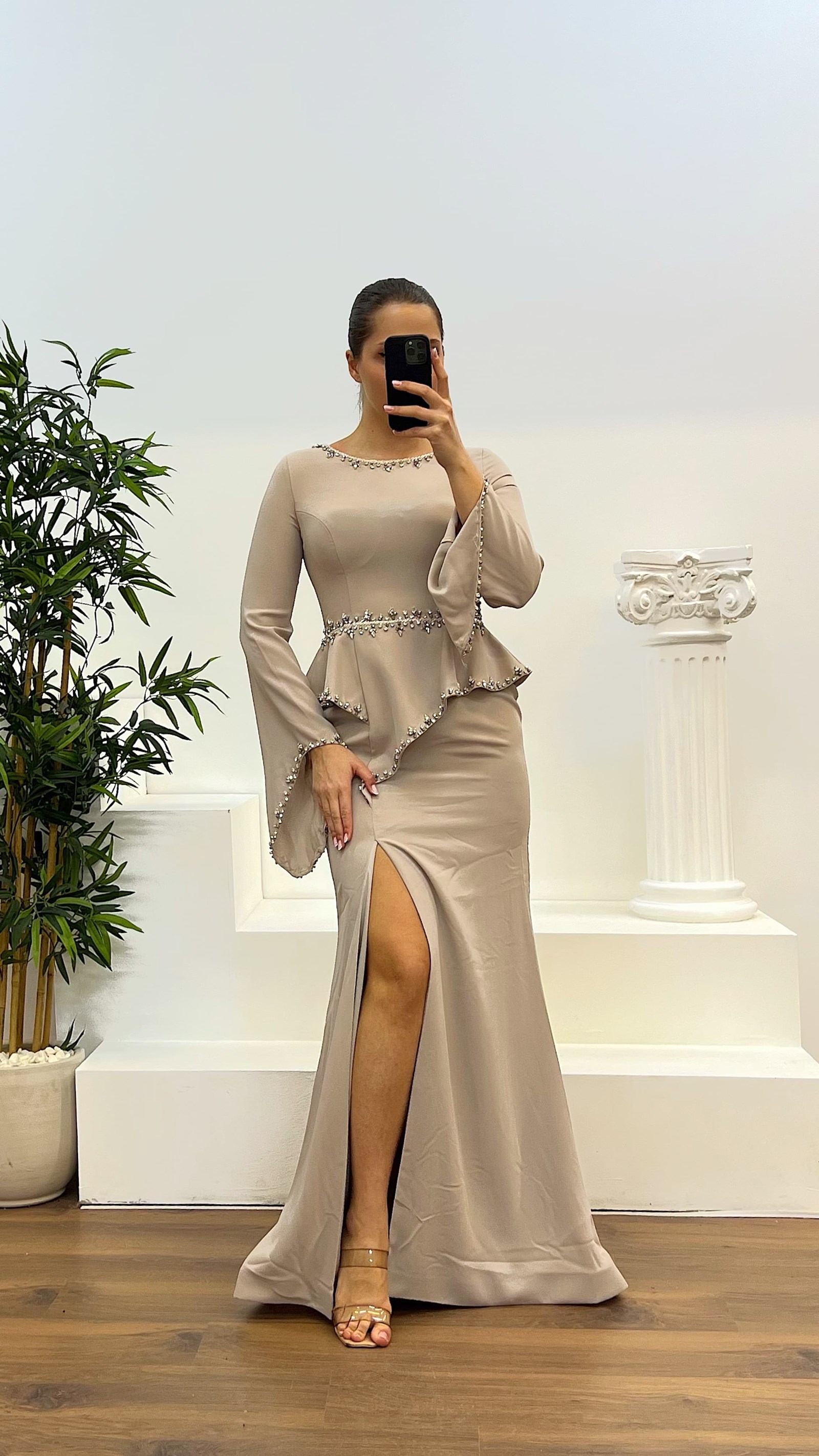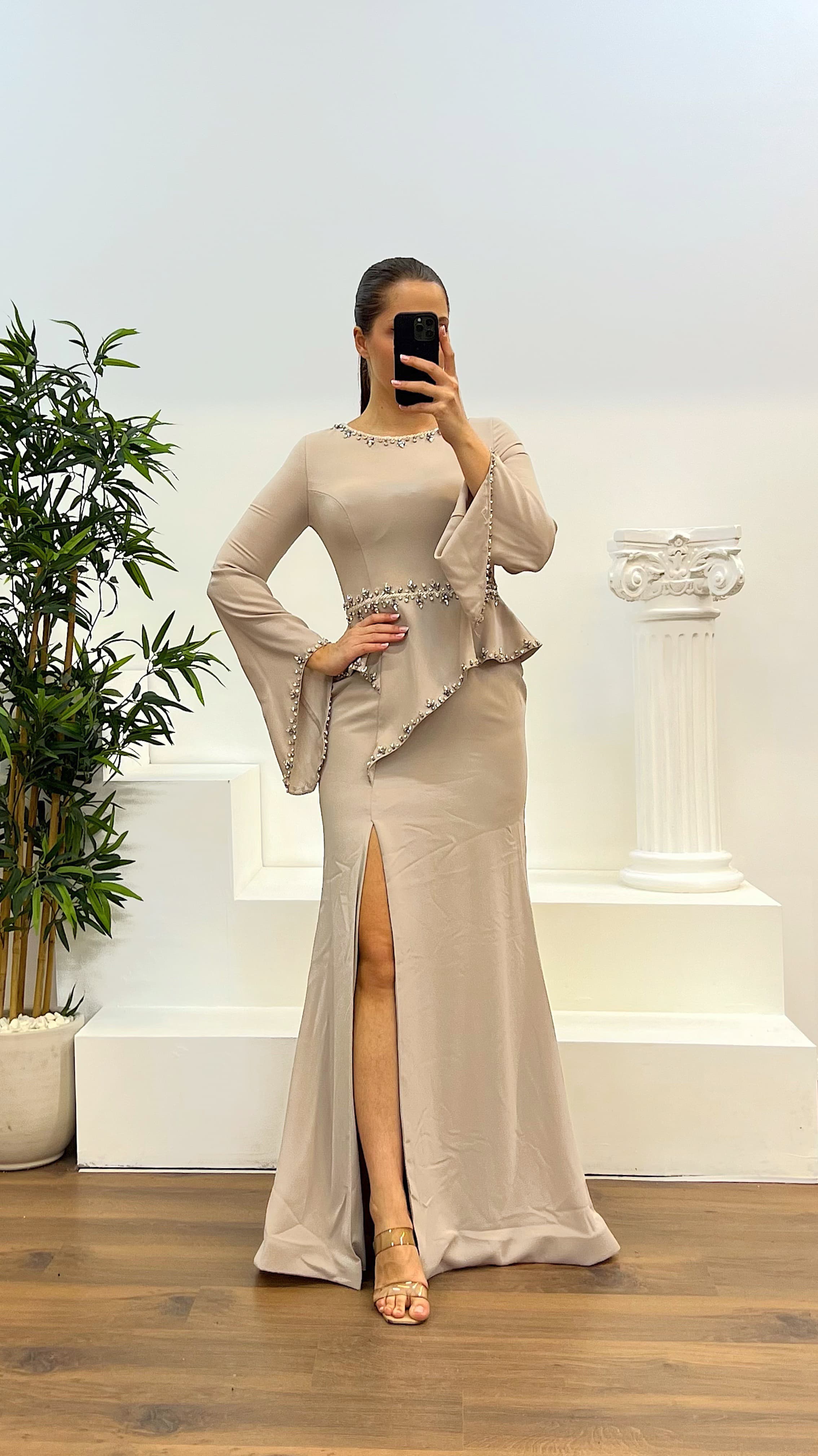• Pudra Taş işlemeli Volanli Kol Detay Büyük Beden Tasarım Elbise