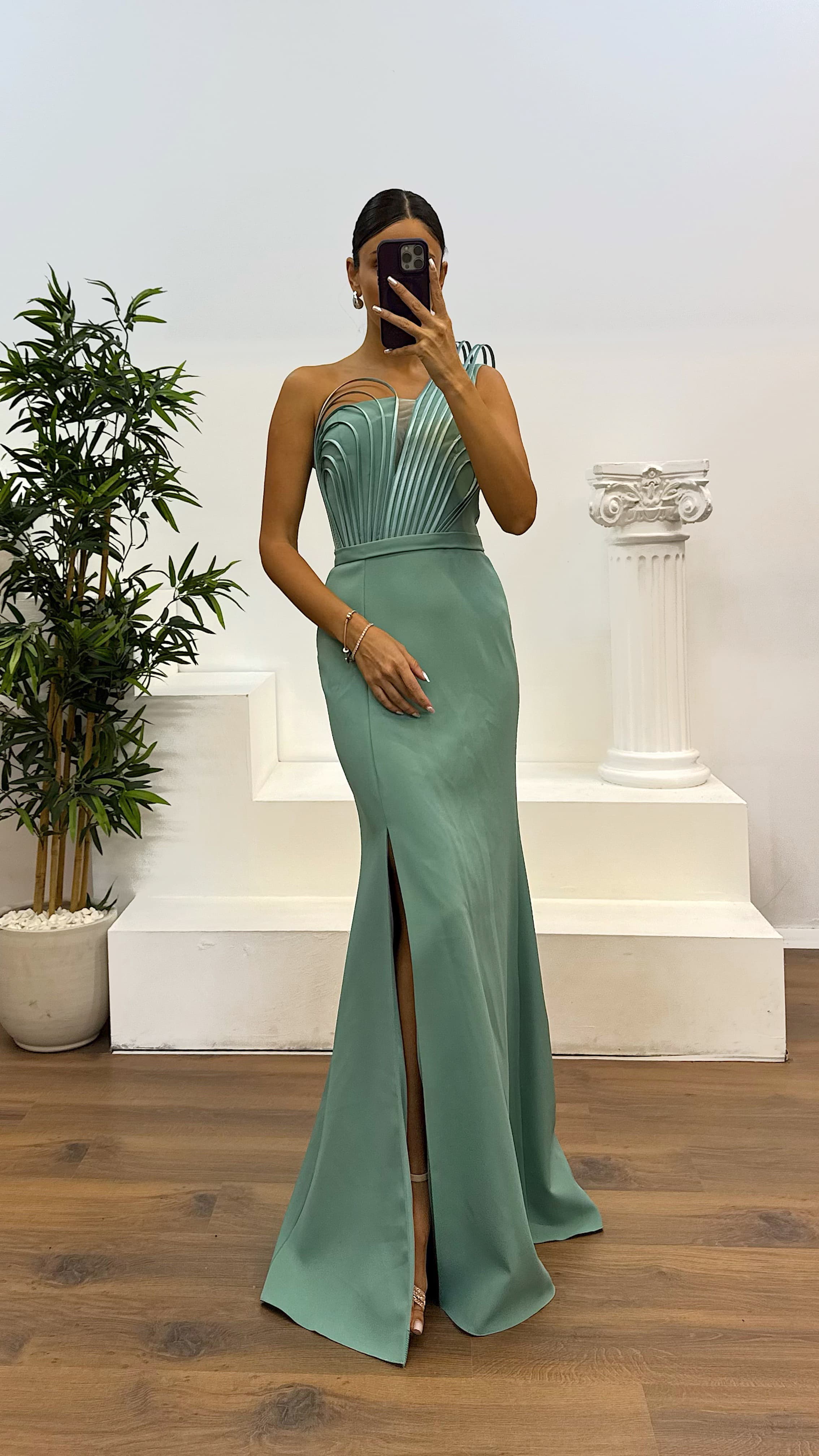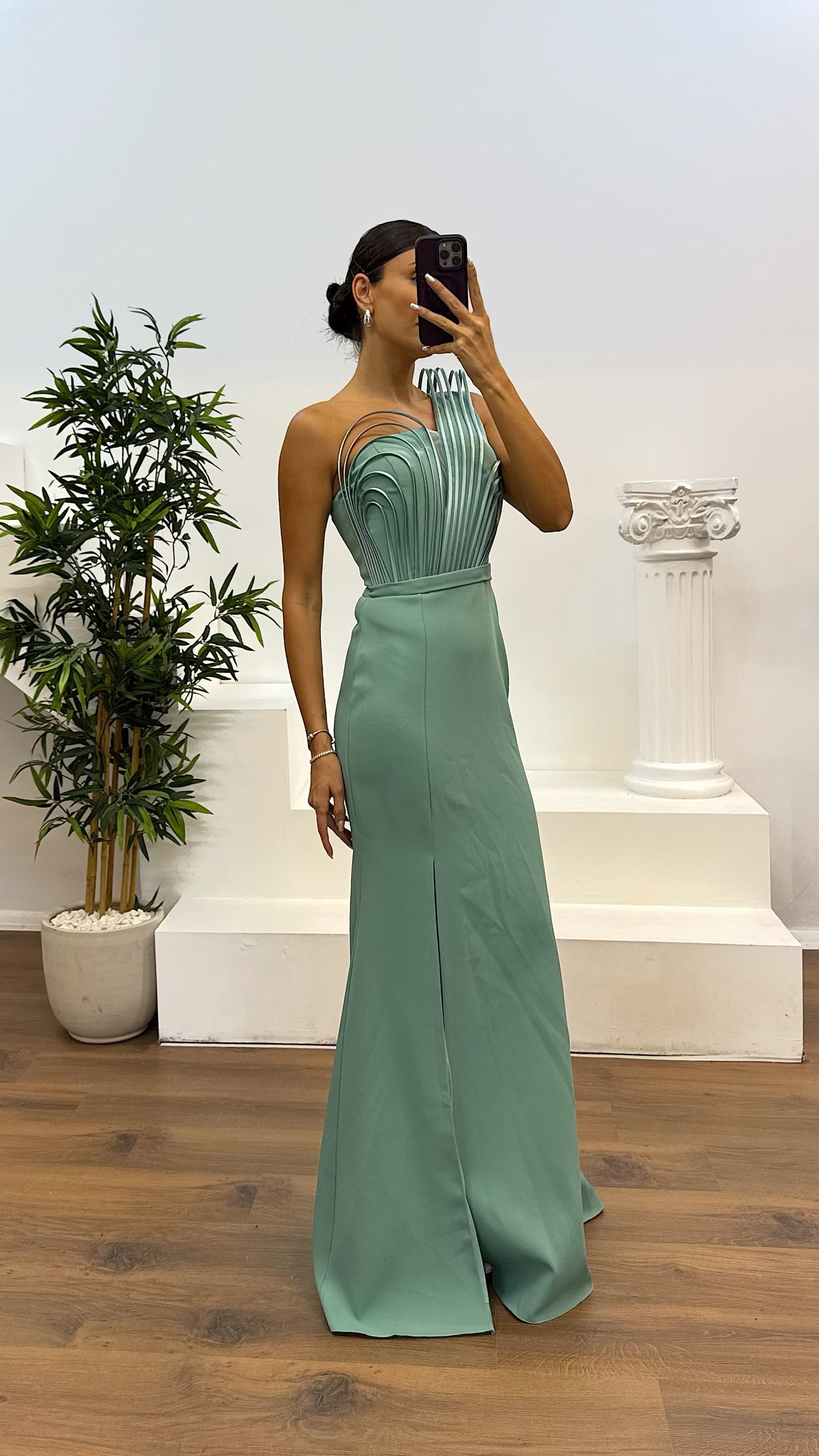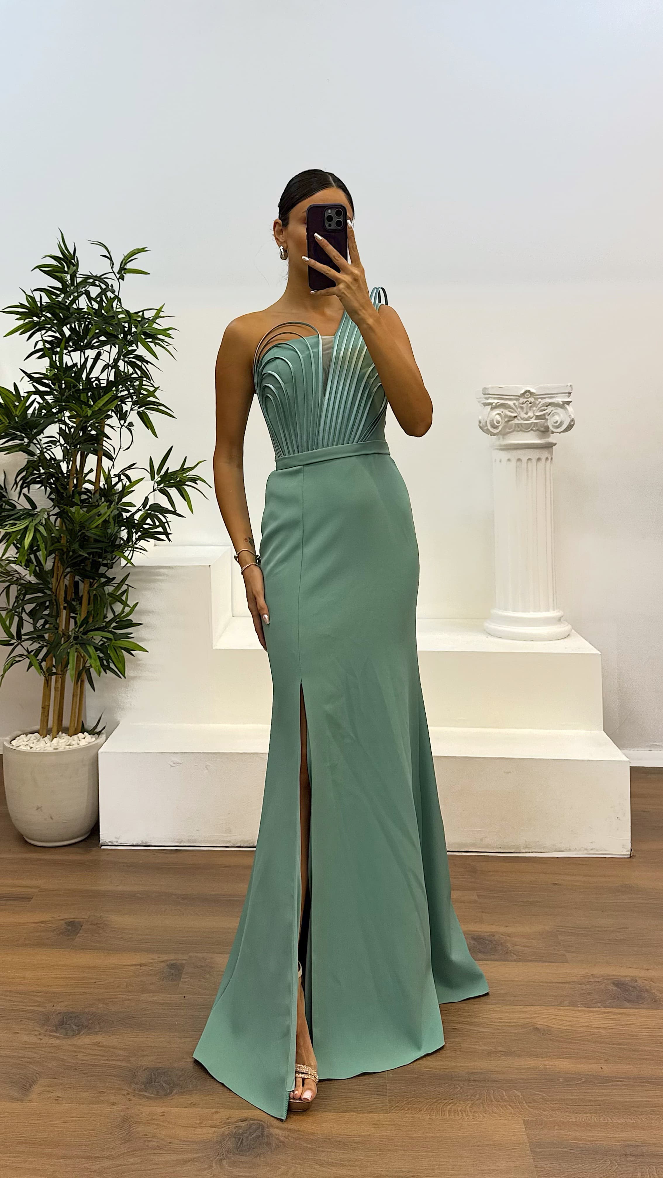 • Tek Omuz Göğüs Detay Abiye Elbise