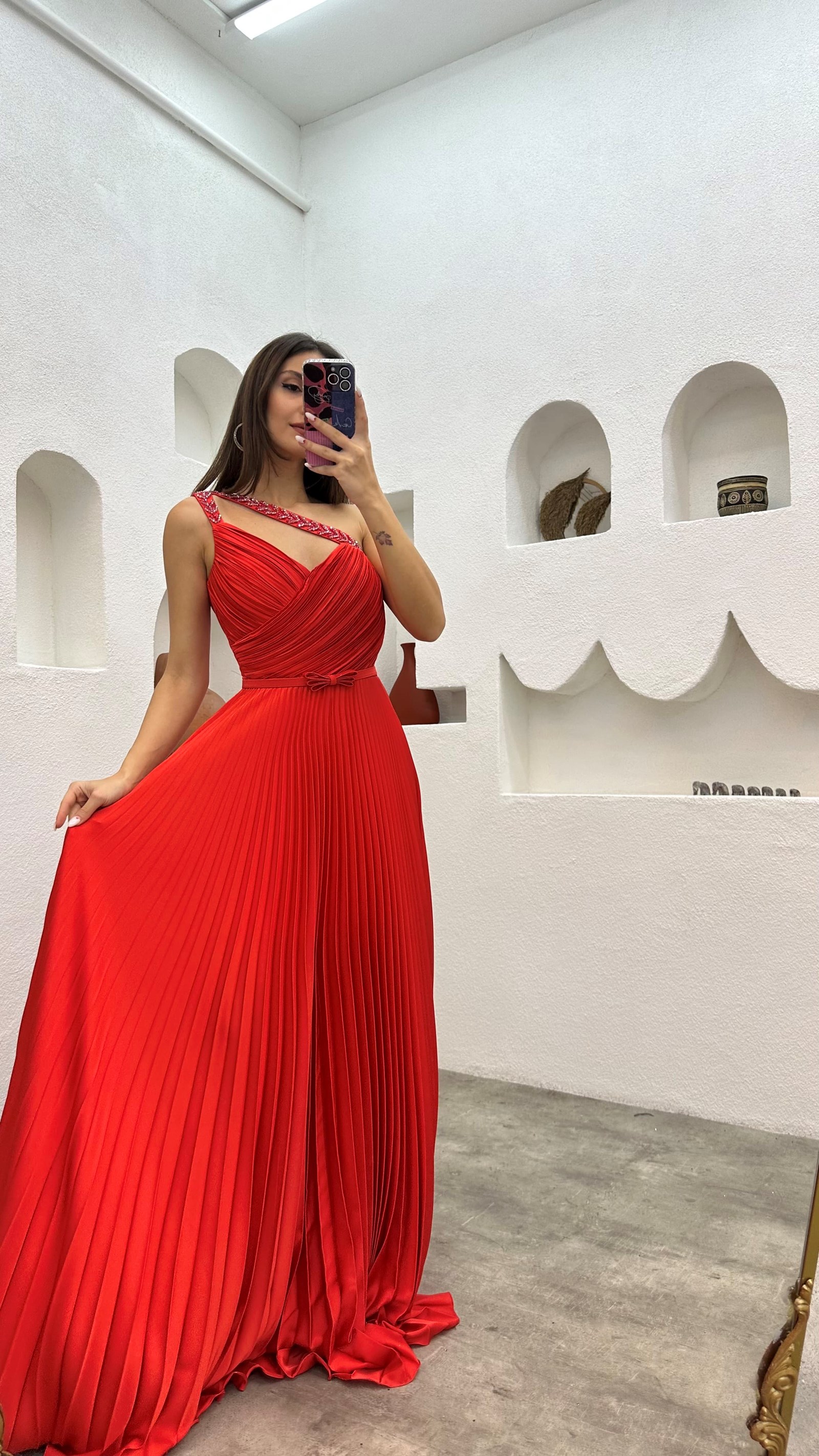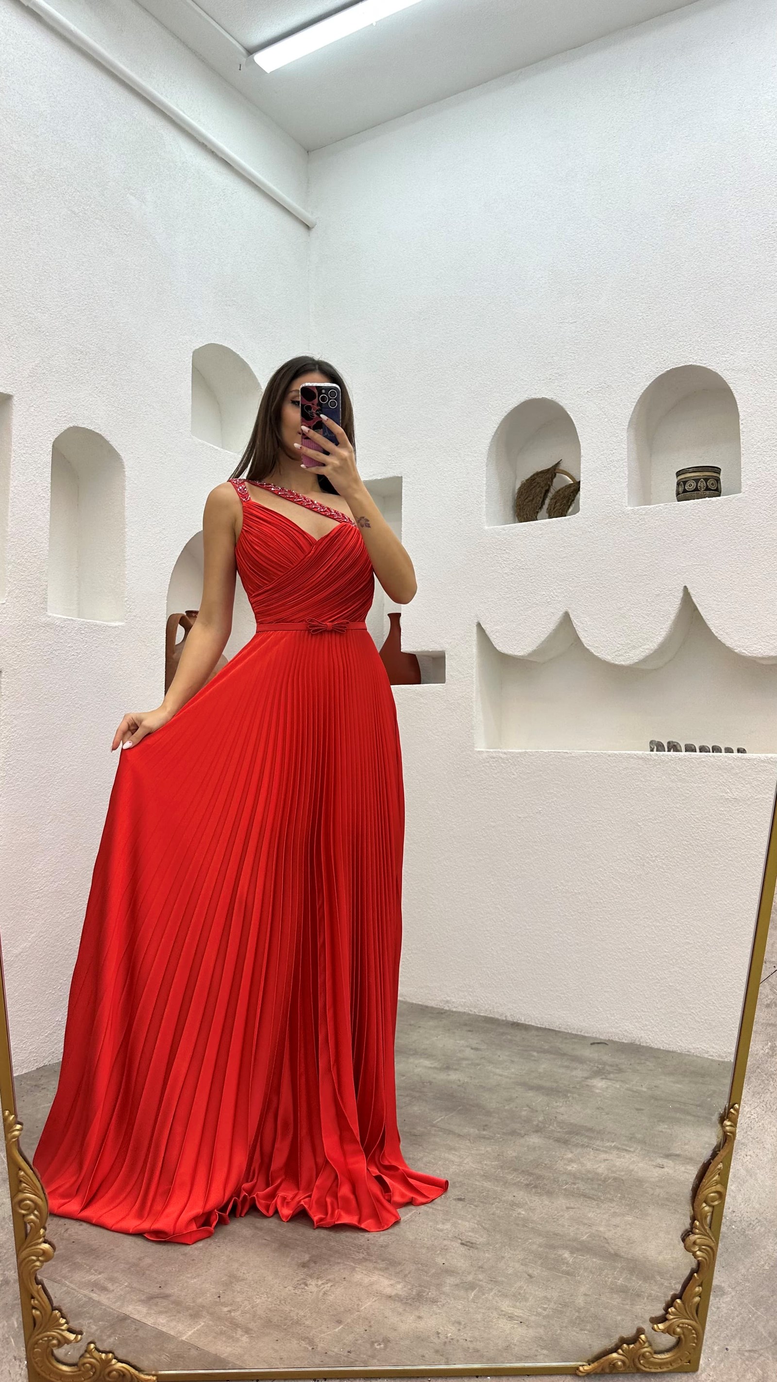 • Kırmızı Askıları İşlemeli Piliseli Saten Abiye Elbise