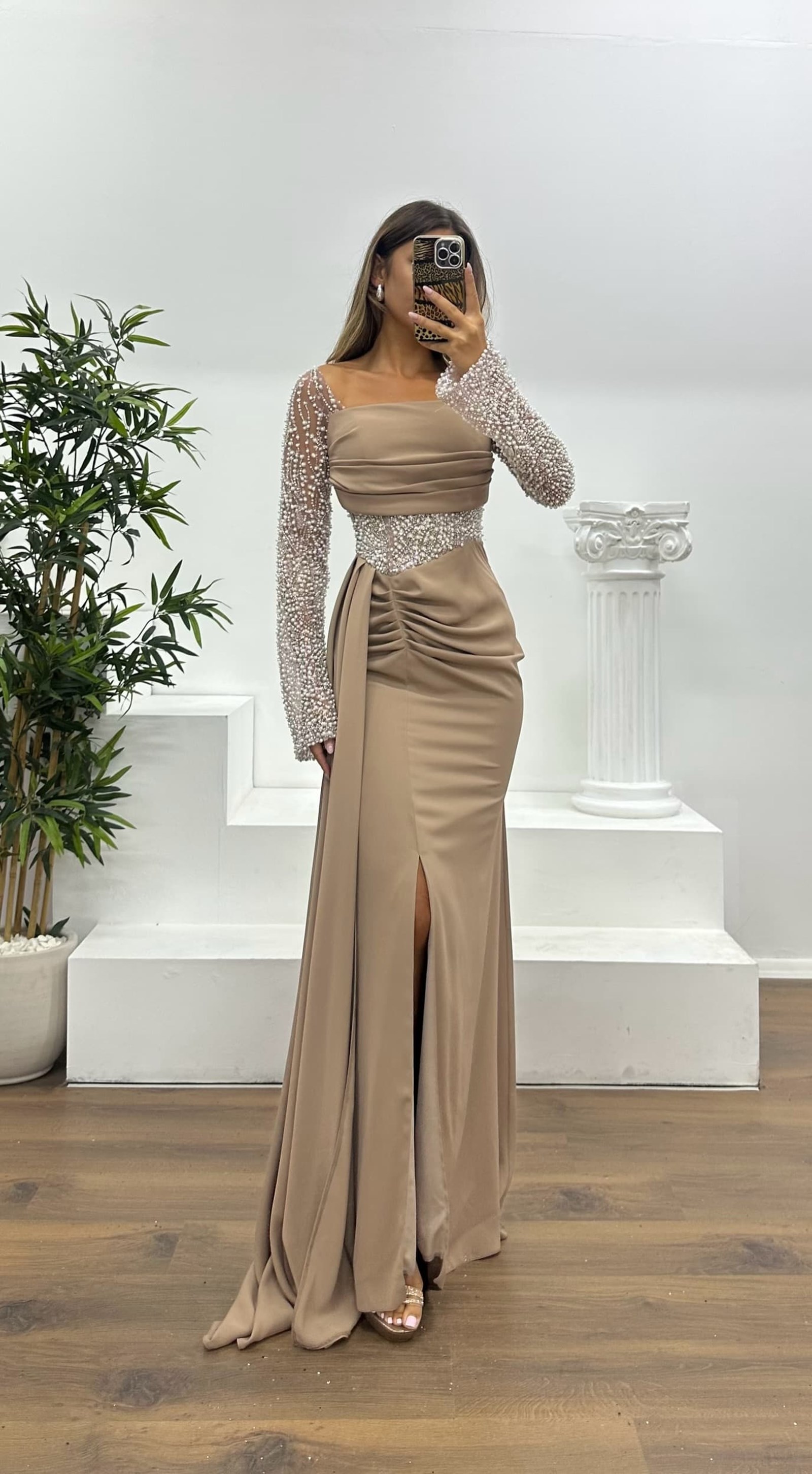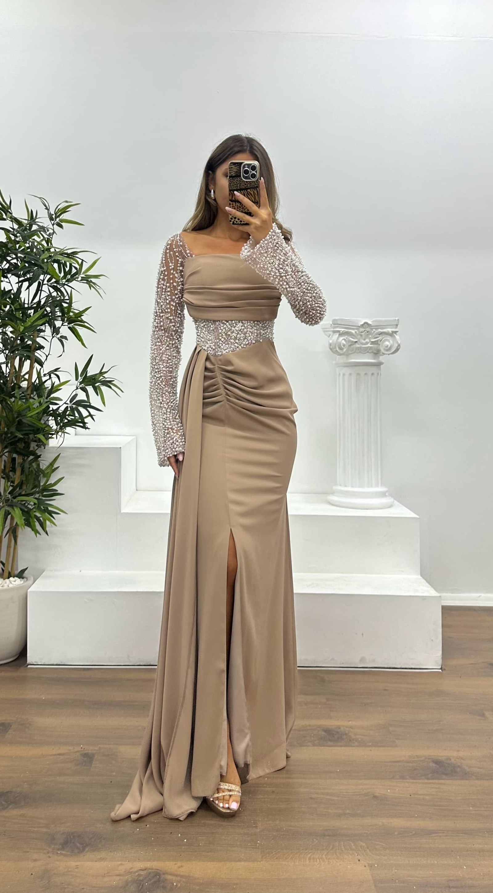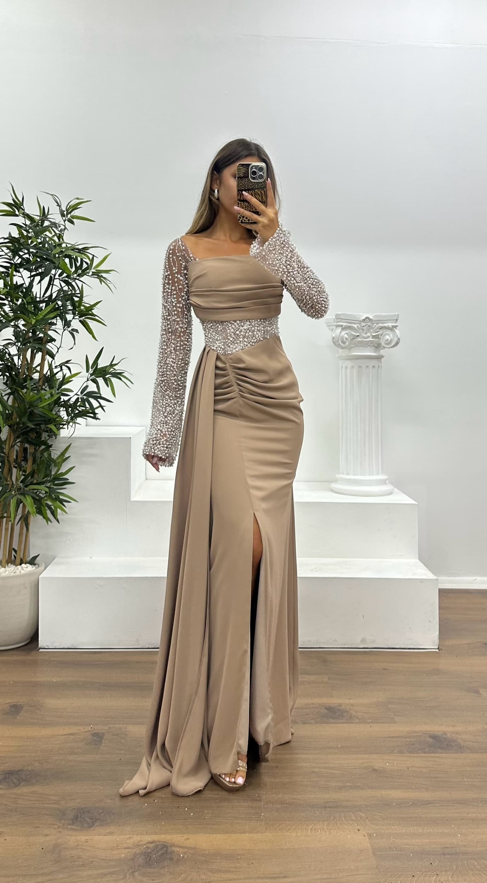 Abito da sera con dettaglio in vita Questo abito da sera ricamato con dettaglio in vita è adatto alle taglie dalla 36 alla 44. Presenta coppe al seno, fodera interna, chiusura con zip posteriore e spacco. Lunghezza abito: varia tra 170 e 175 cm Lunghezza manica: 60 cm Tipo di tessuto: raso, 100% poliestere