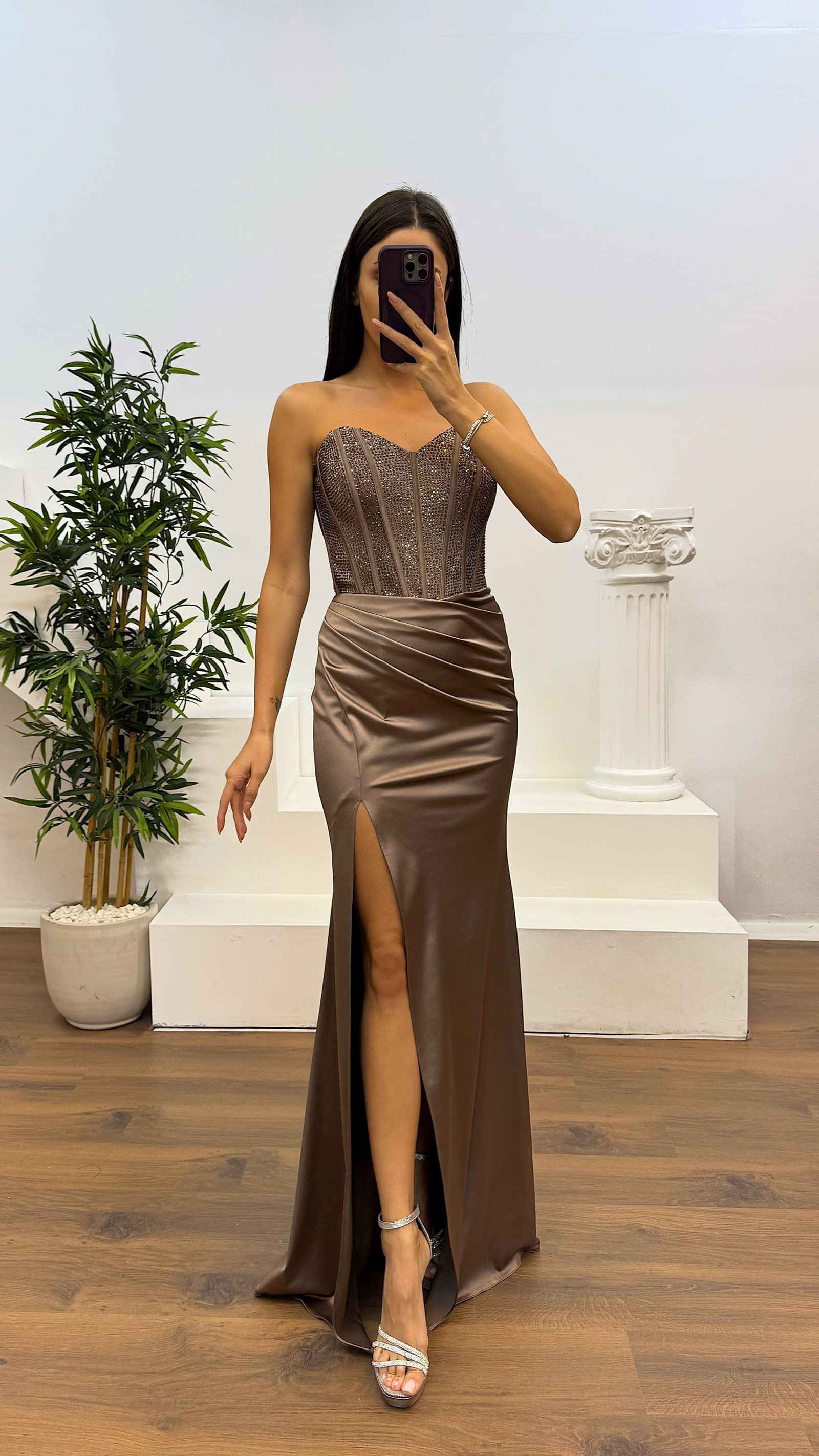 Abito da sera senza spalline con dettagli ricamati Il prodotto è compatibile con le taglie dalla 36 alla 42, con coppe per il seno, foderato, con spacco, laccetti incrociati sul retro e chiusura con zip, progettato come abito da sera con dettagli ricamati. La lunghezza del prodotto è di 160 cm. Tipo di tessuto: satin poliestere-viscosa.