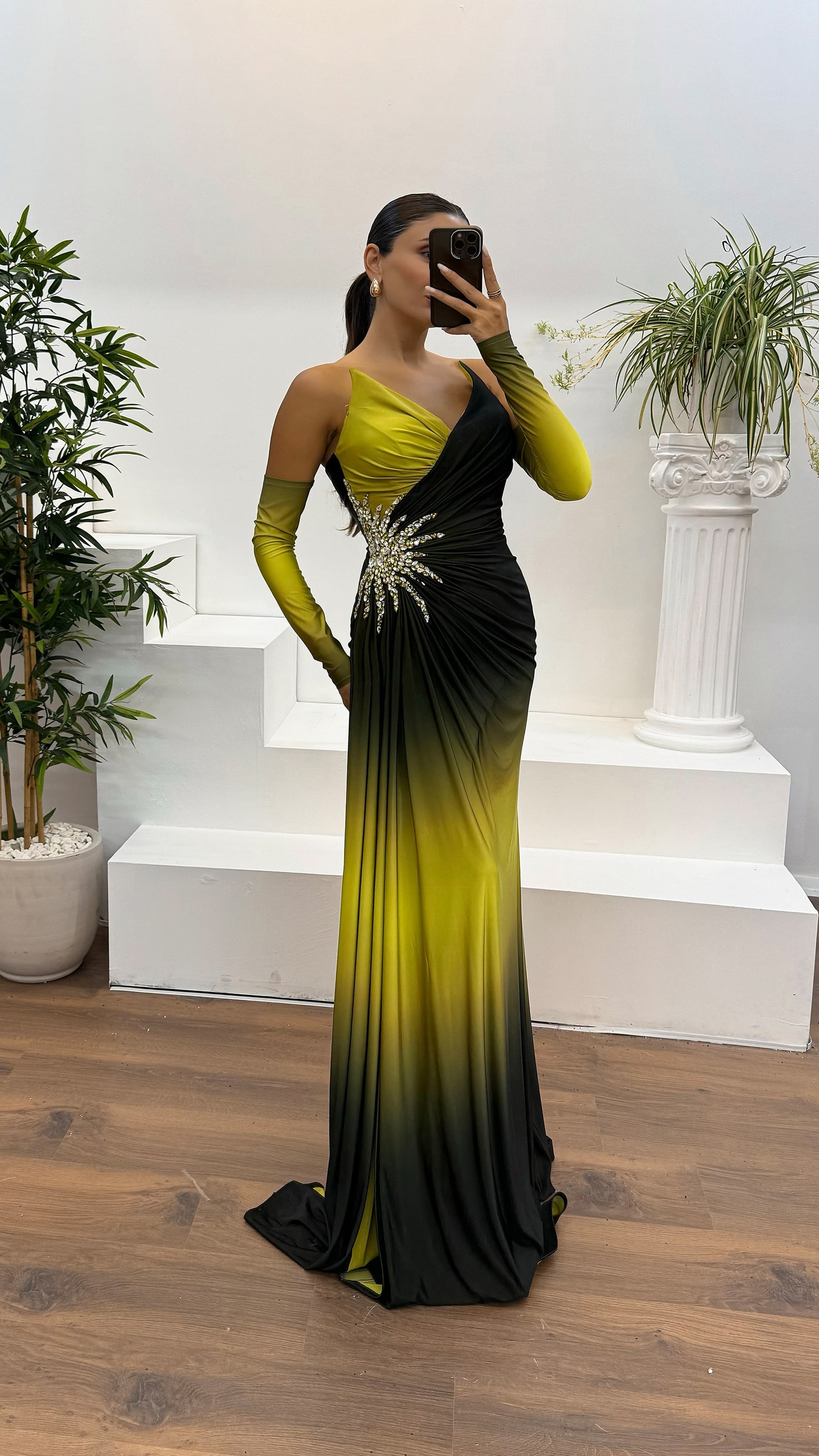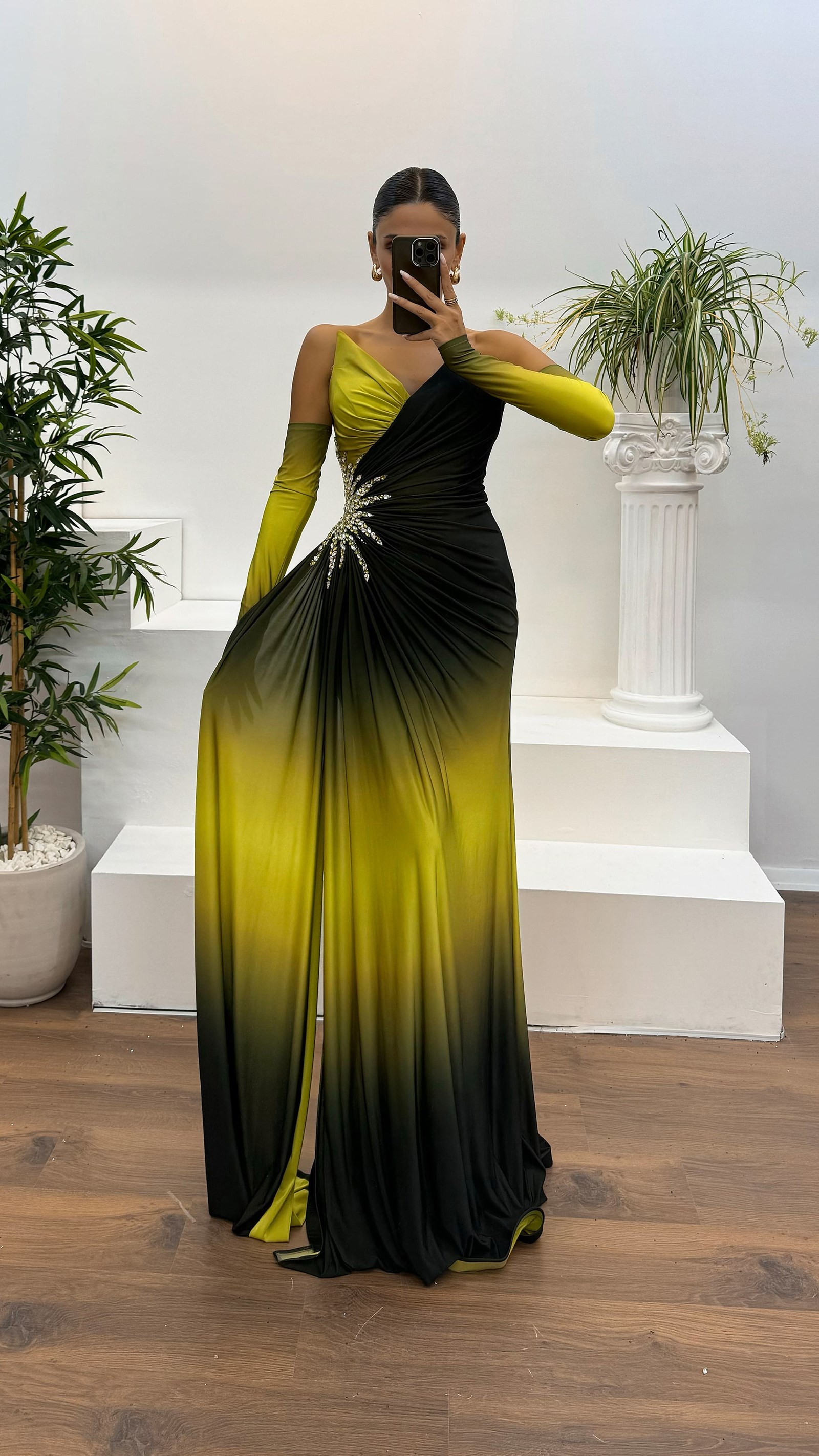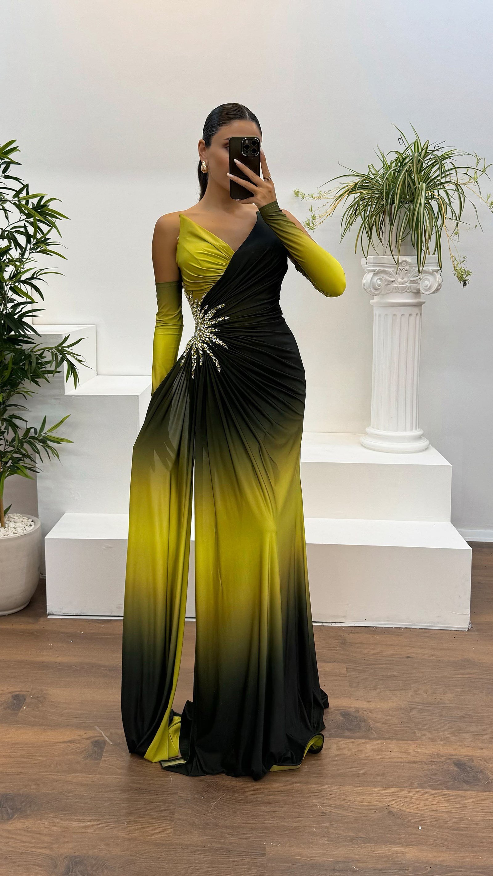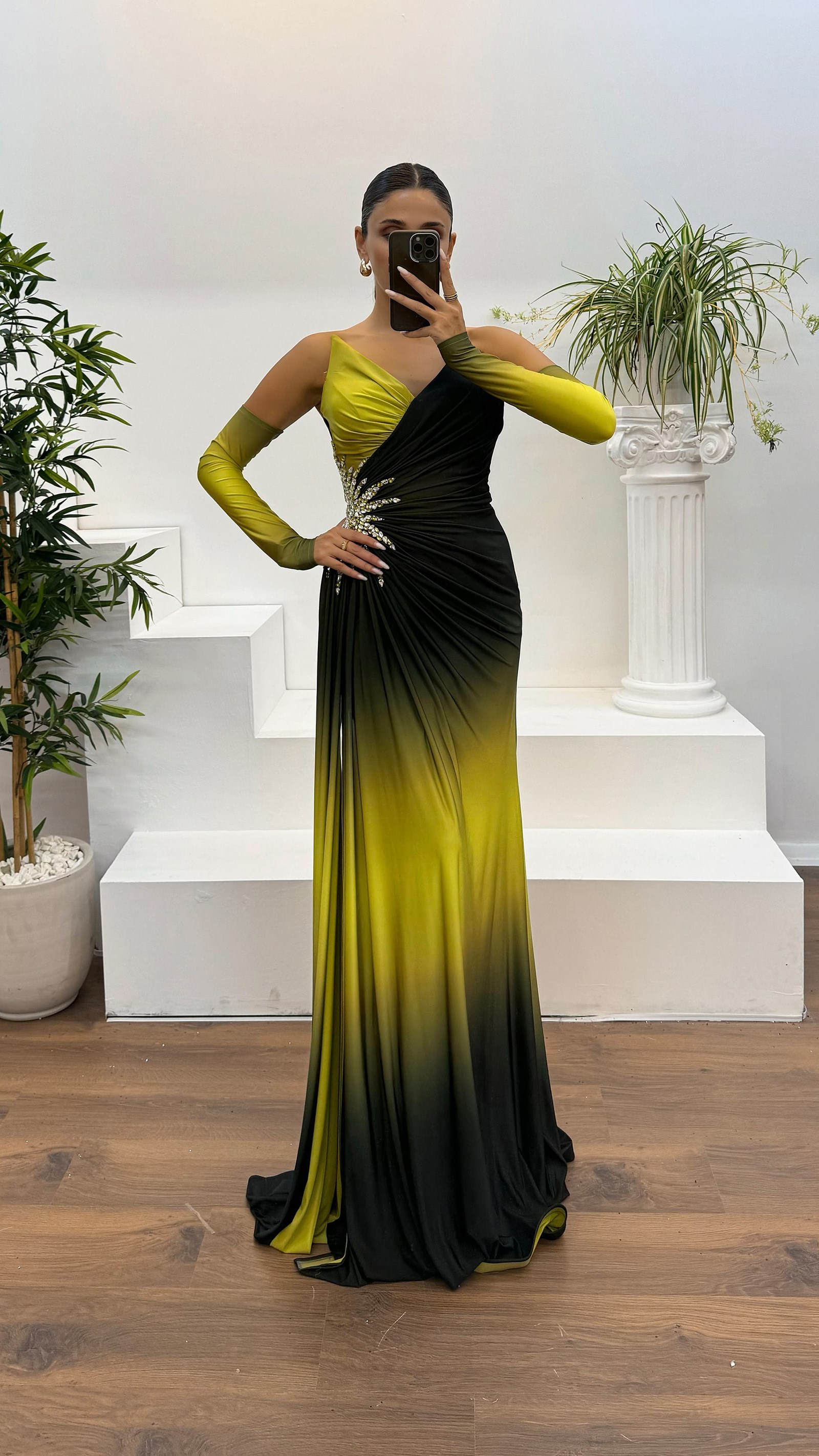 • Yeşil Straplez Bel İşleme Detay Abiye Elbise