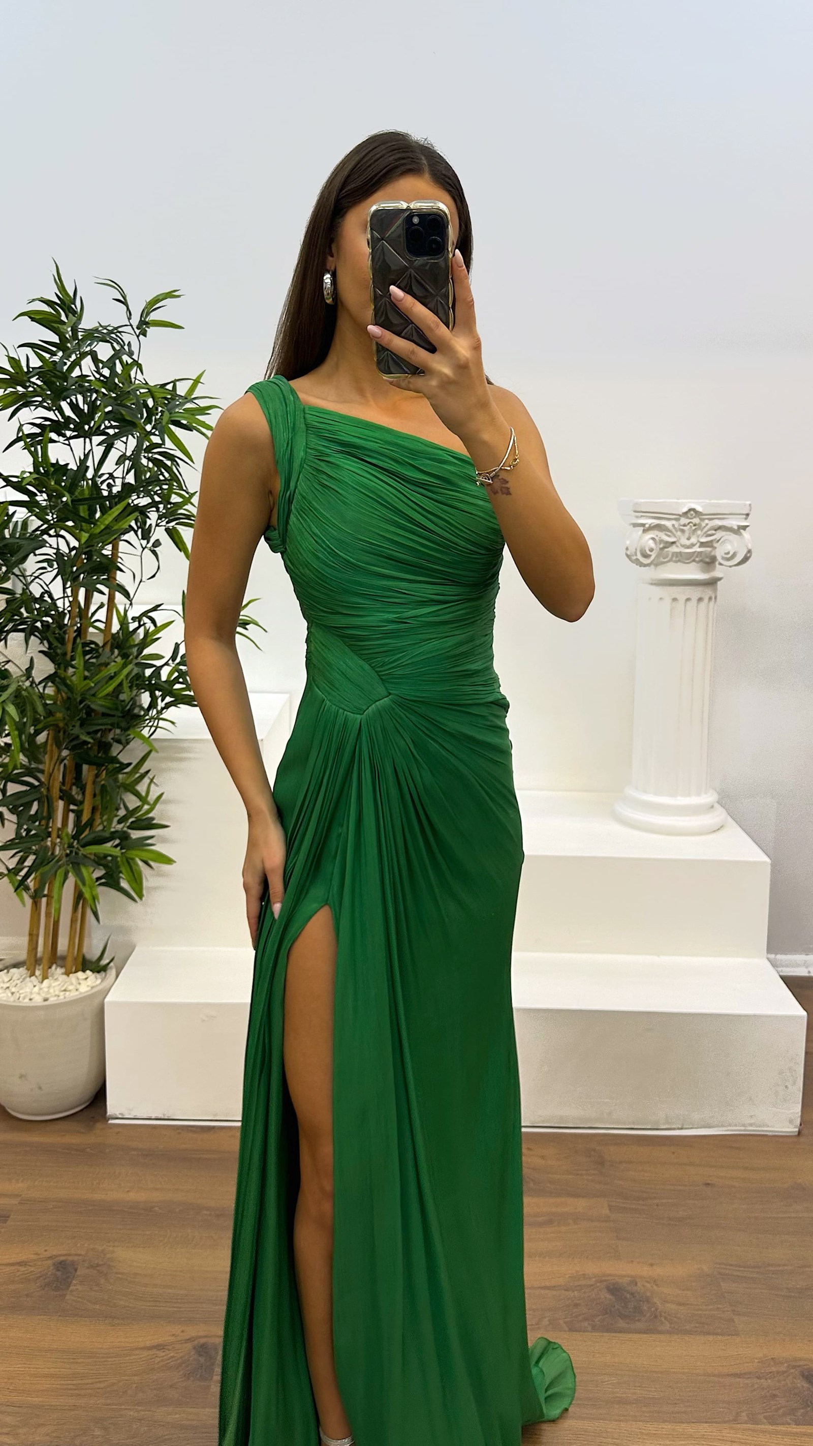 Una spalla drappo dettagliato abito da sera Il prodotto è progettato come abiti da sera con fodera, spacchi, monospalla, tende, adatti per le taglie 36-44. Lunghezza del prodotto: Può variare tra 165-170 Decm. Tipo di tessuto: chiffon 66% viscosa 34% poliestere