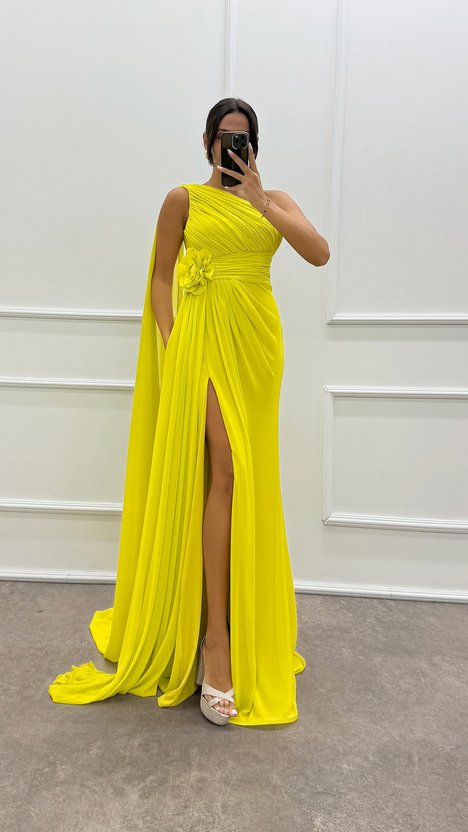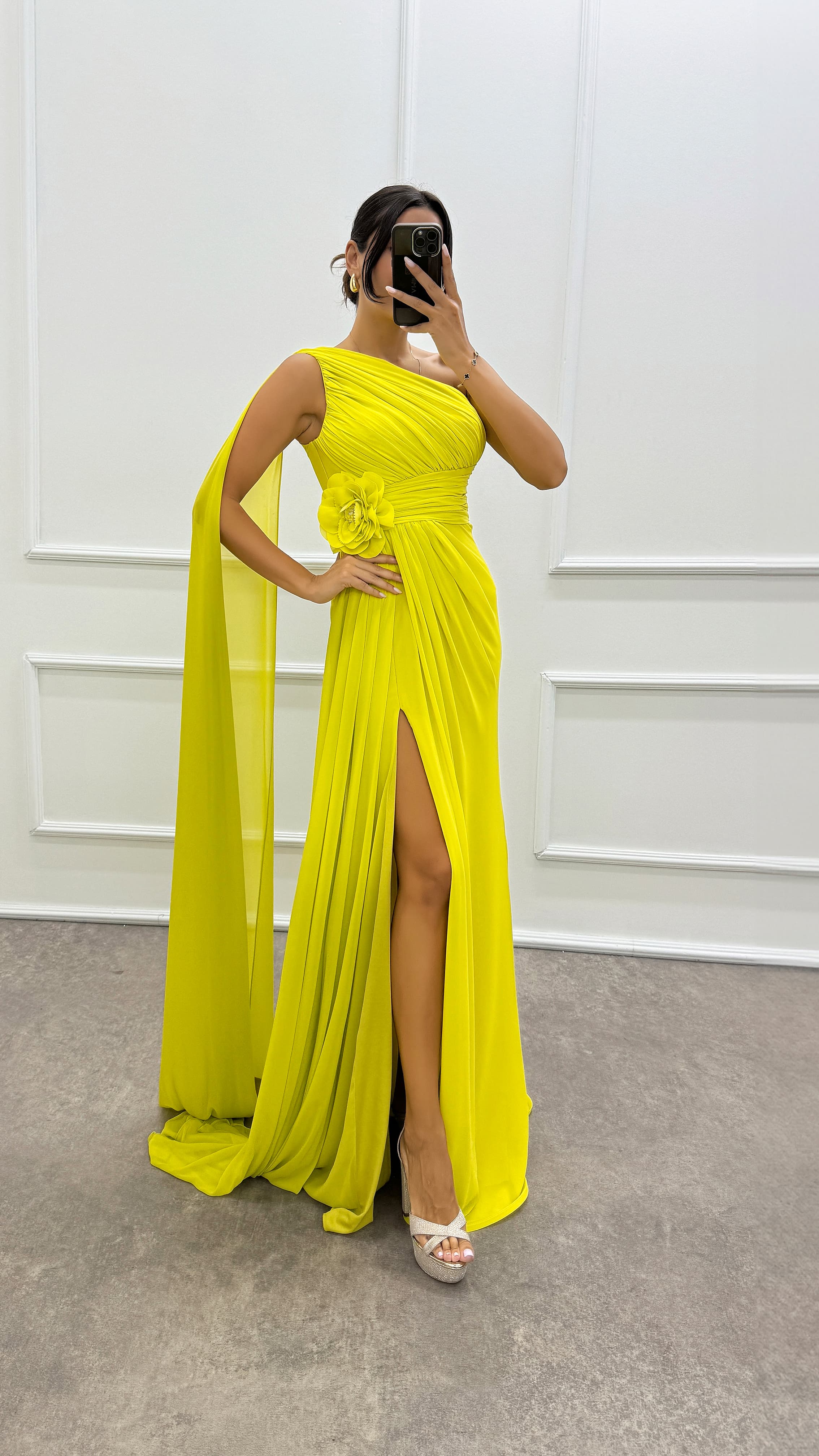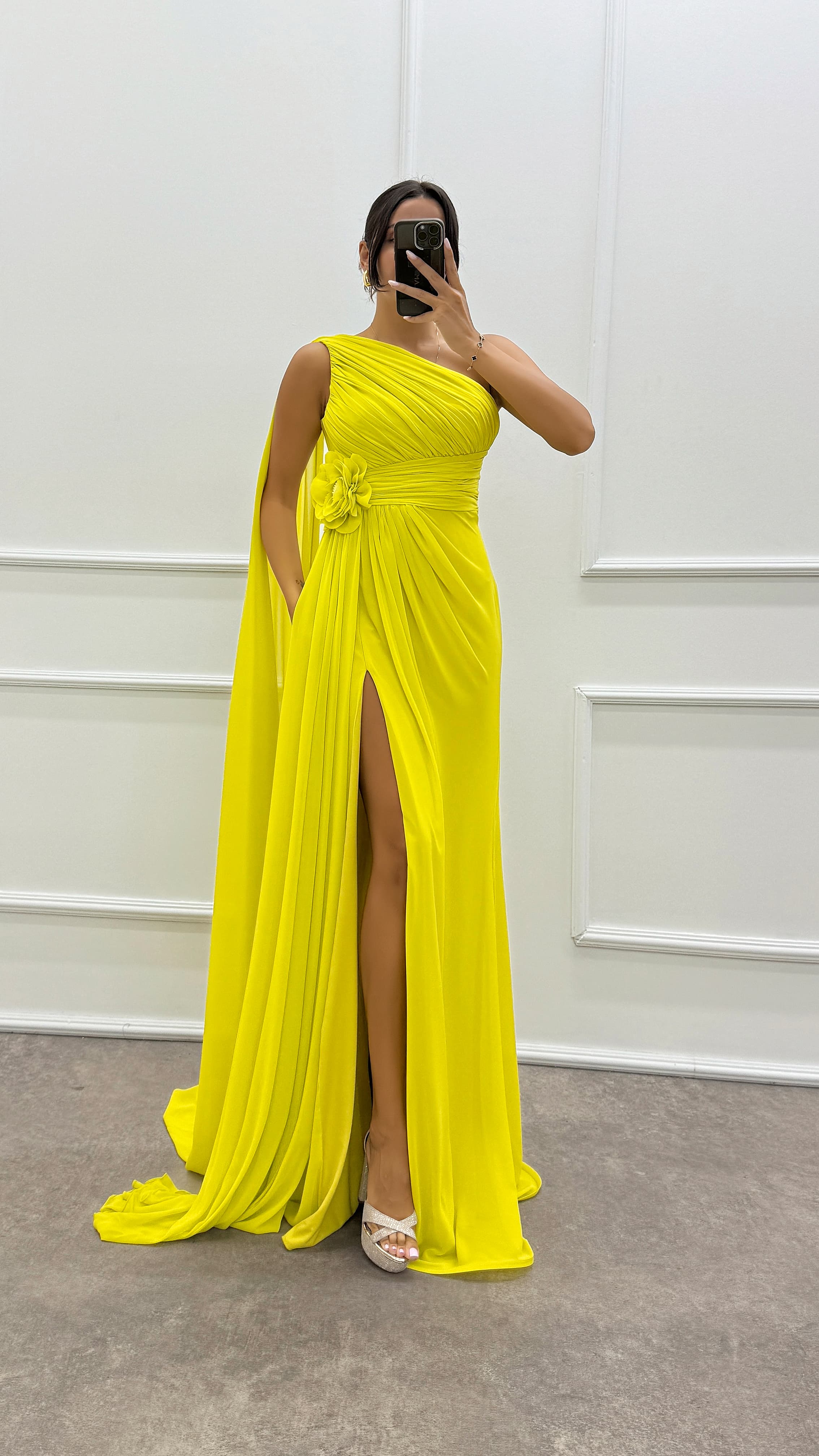 • Zümrüt Yeşili Tek Omuz Kol Detay Abiye Elbise