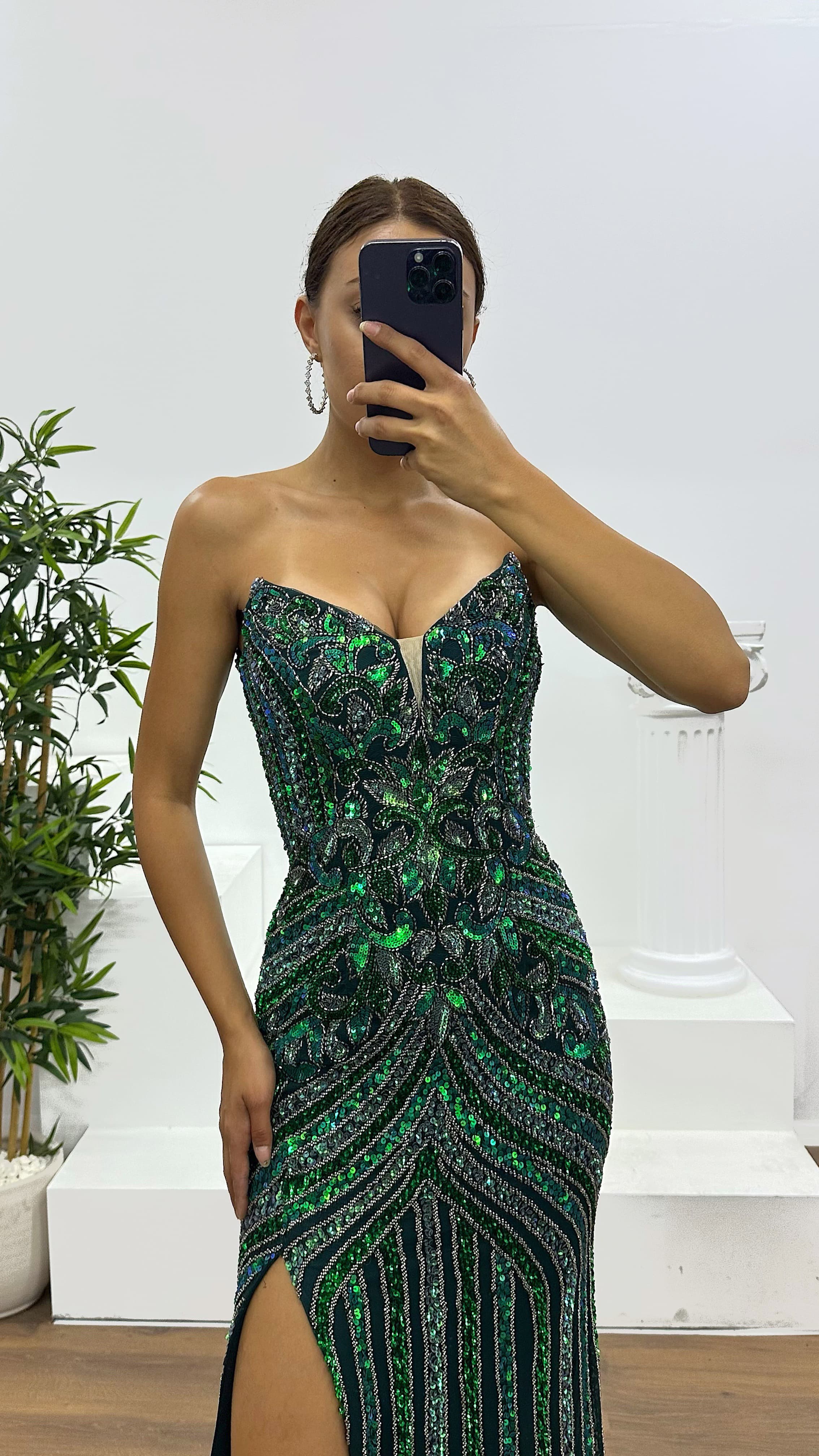 Abito da sera senza spalline con ricamo a mano Il prodotto veste taglie dalla 38 alla 44, con coppe imbottite, foderato, chiusura con zip sul retro, spacco e design ricamato a mano. Lunghezza dell’abito: Può variare tra 170 e 175 cm. Tipo di tessuto: Tessuto ricamato.