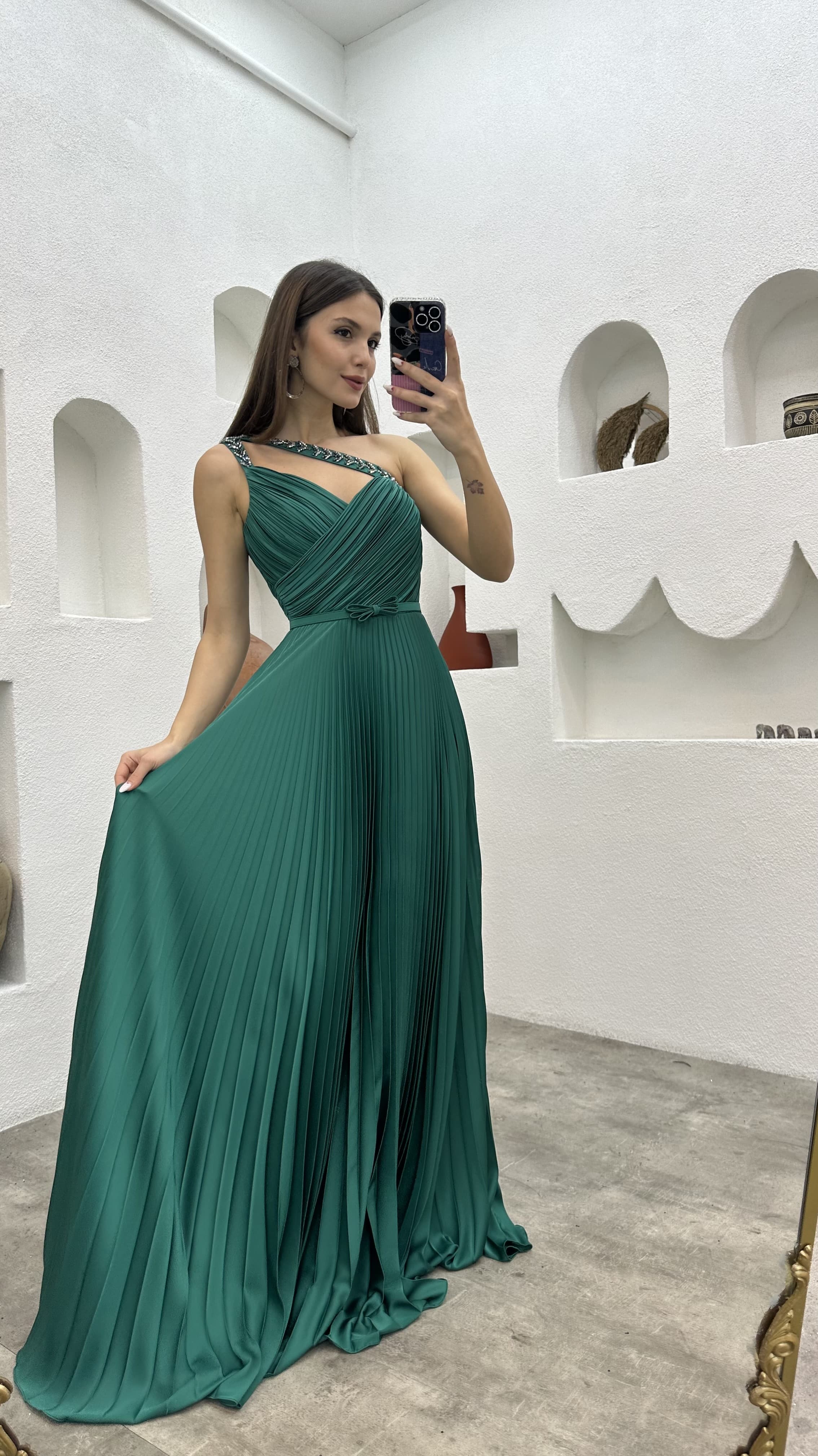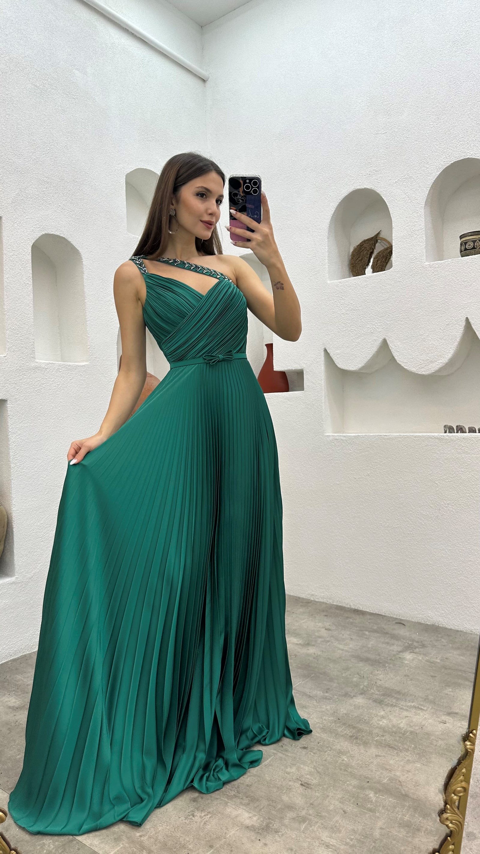 Zümrüt Askıları İşlemeli Piliseli Saten Abiye Elbise