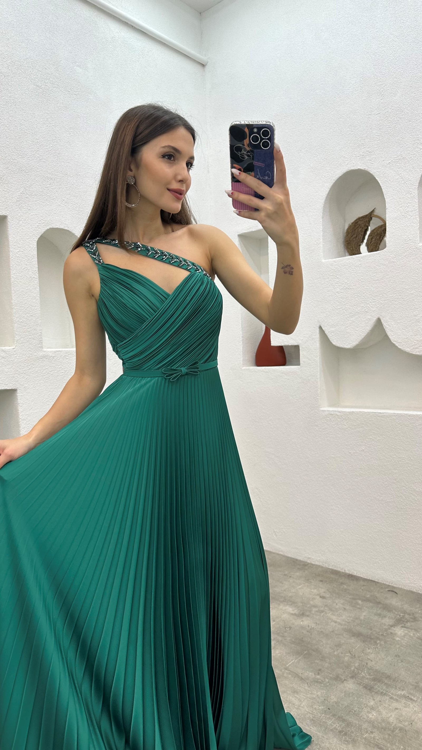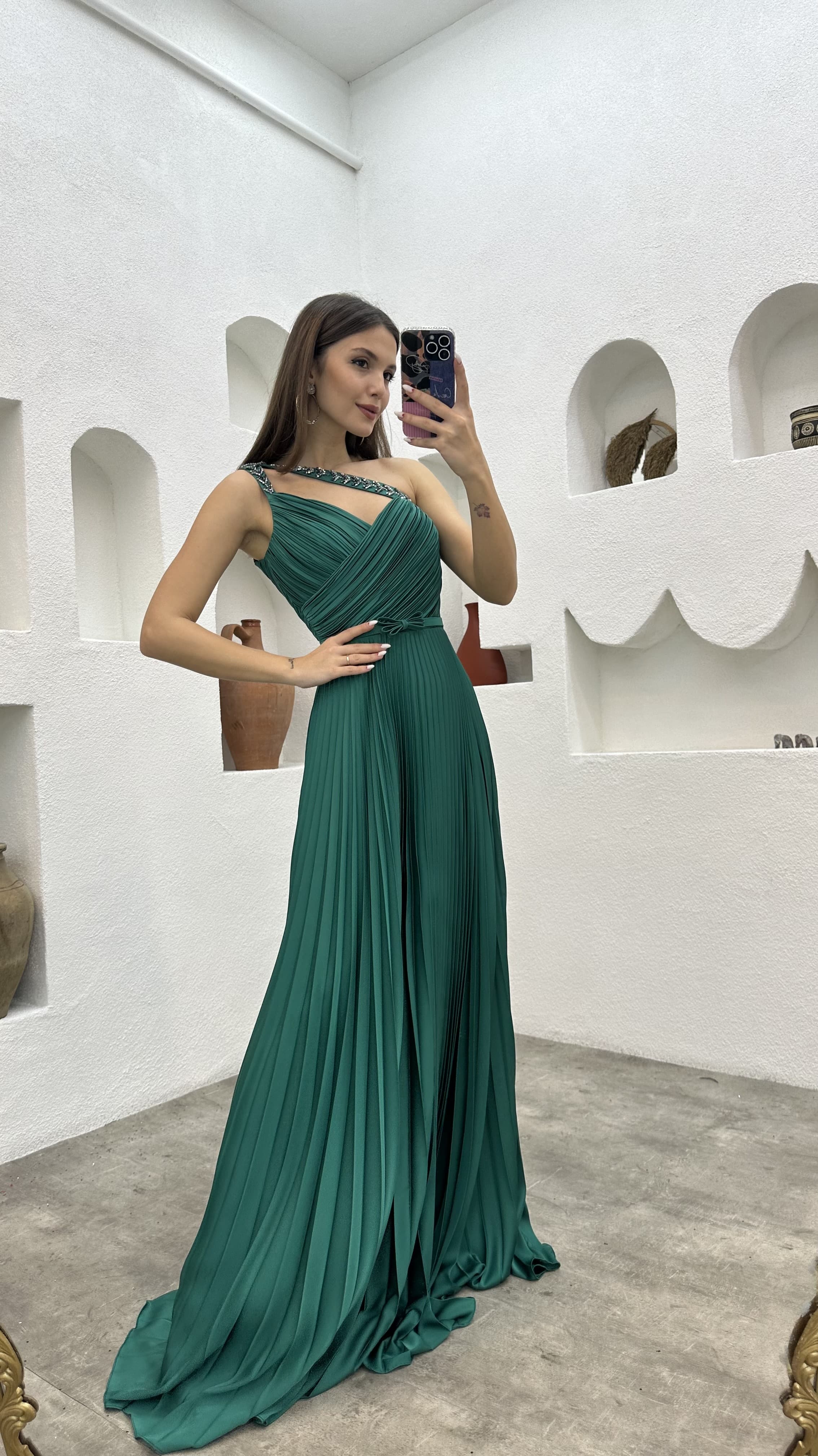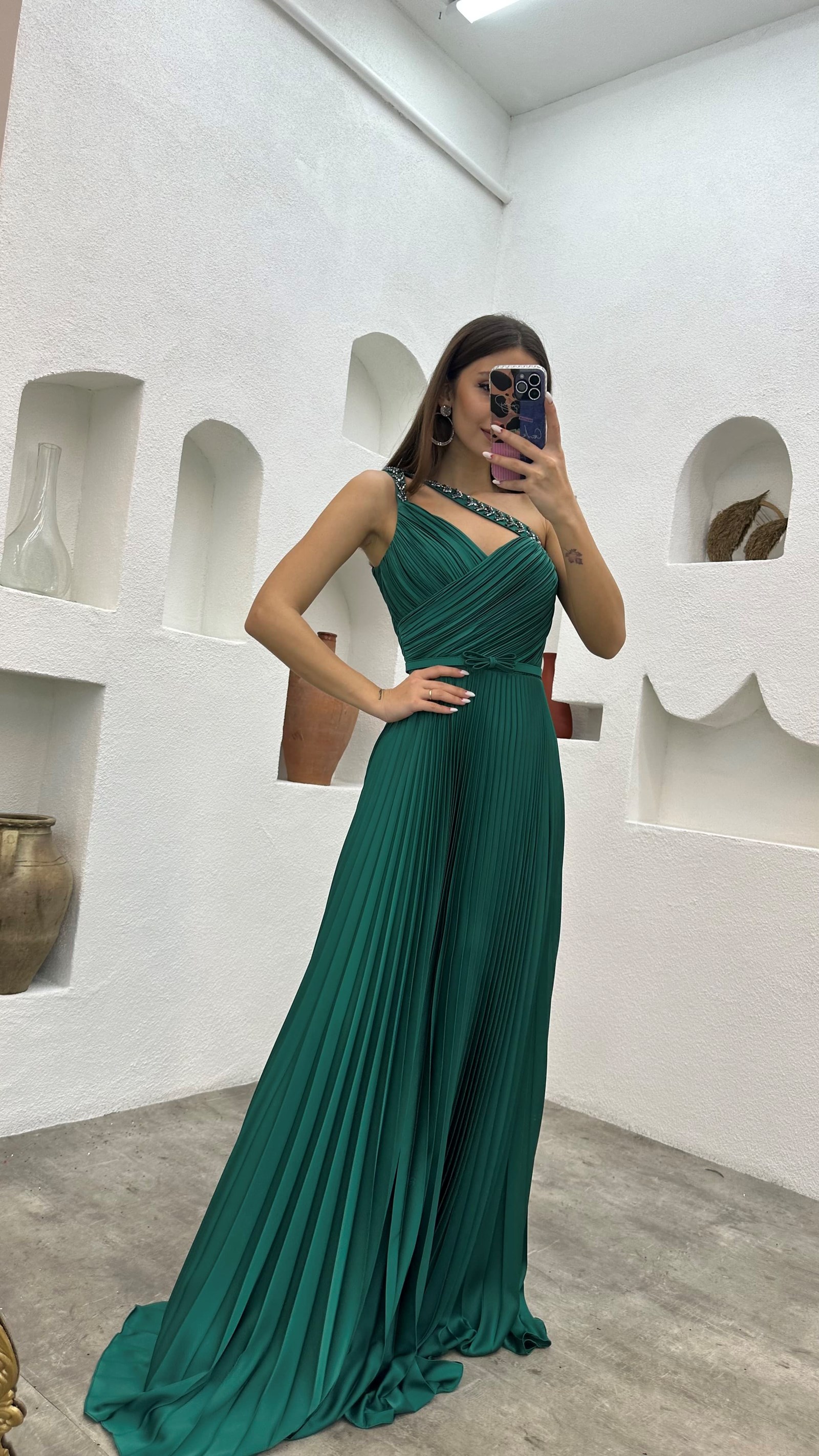 • Zümrüt Askıları İşlemeli Piliseli Saten Abiye Elbise