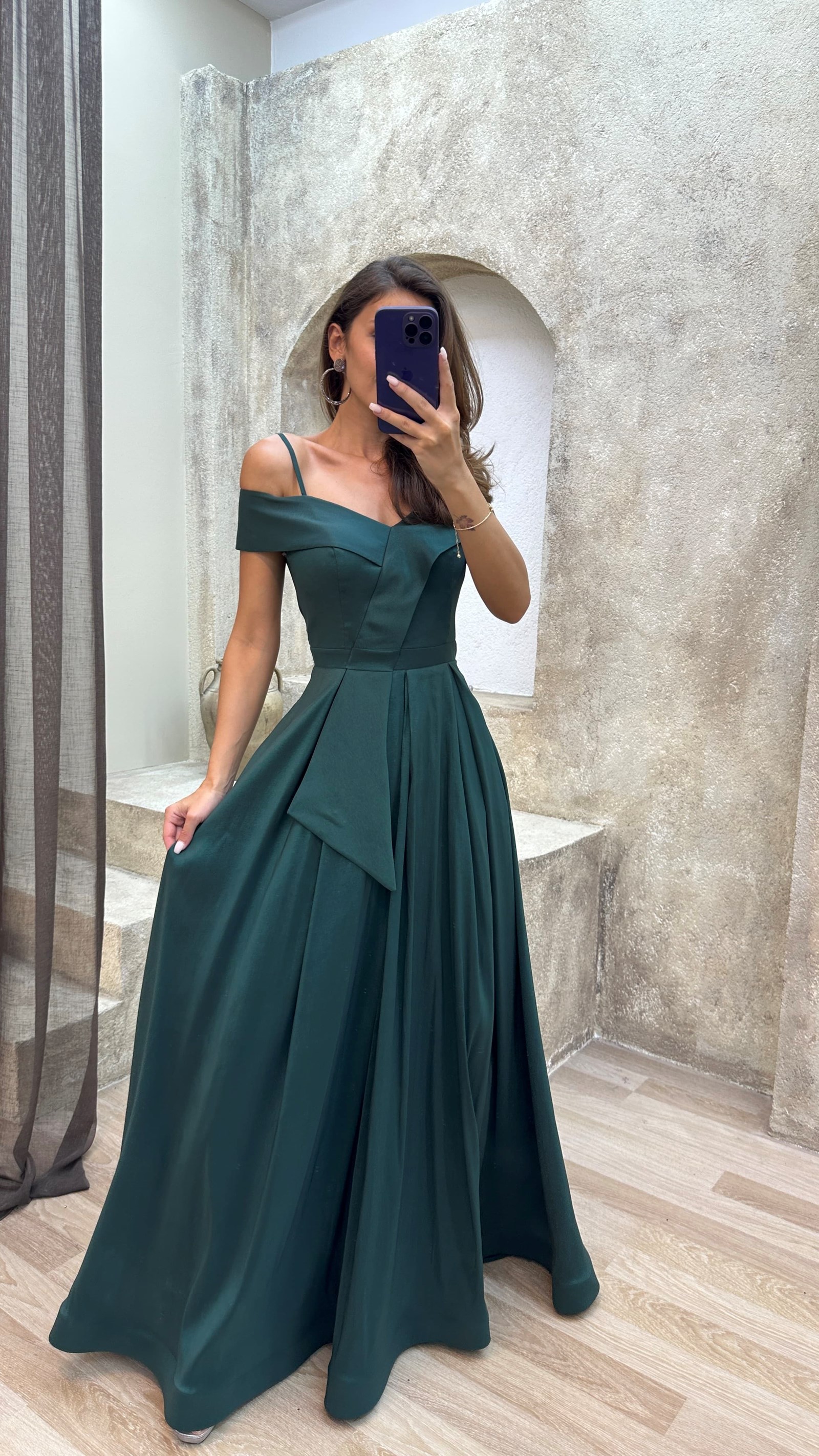 • Zümrüt İp Askılı Kayık Yaka Bel Detay Abiye Elbise