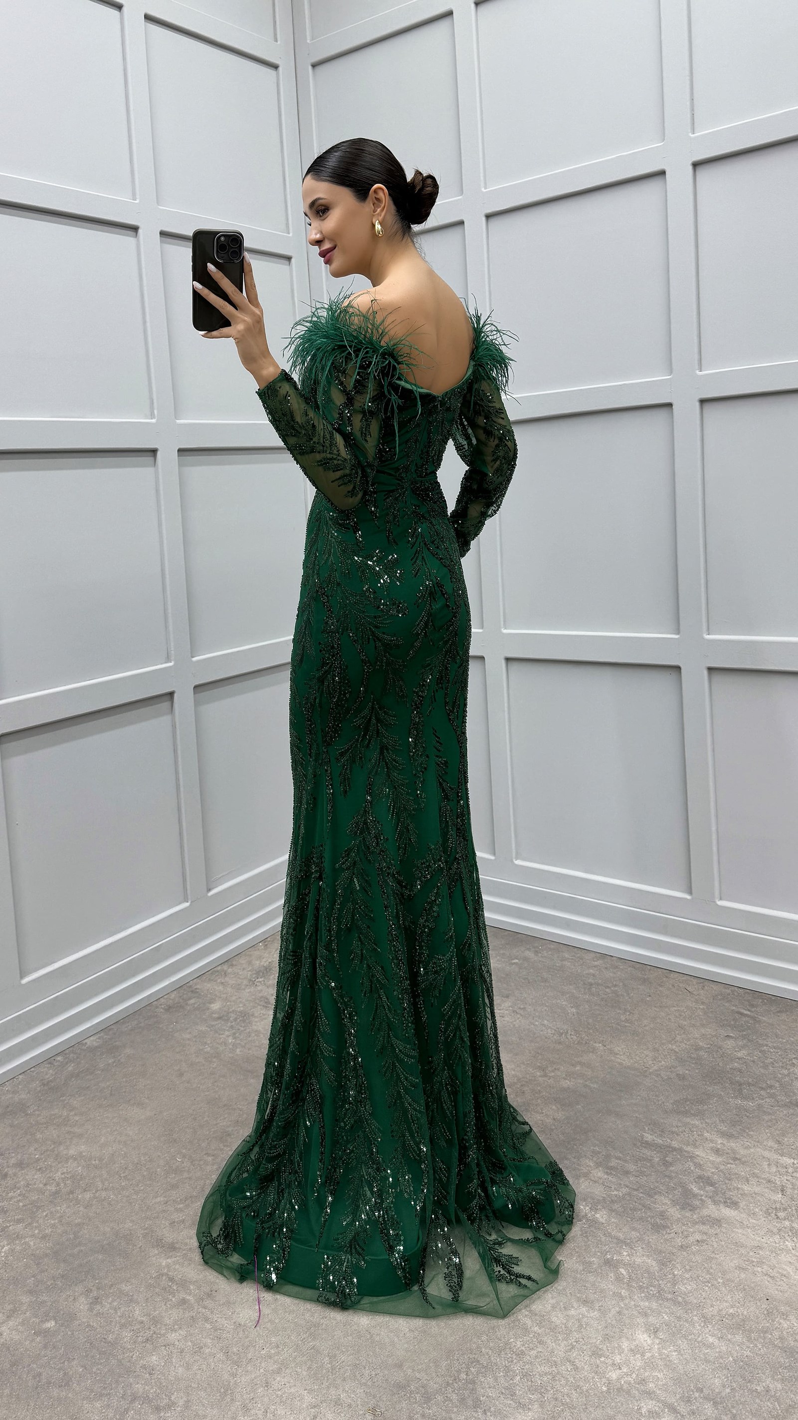 Zümrüt Omuzları Tüy Detay İşlemeli Tasarım Abiye Elbise
