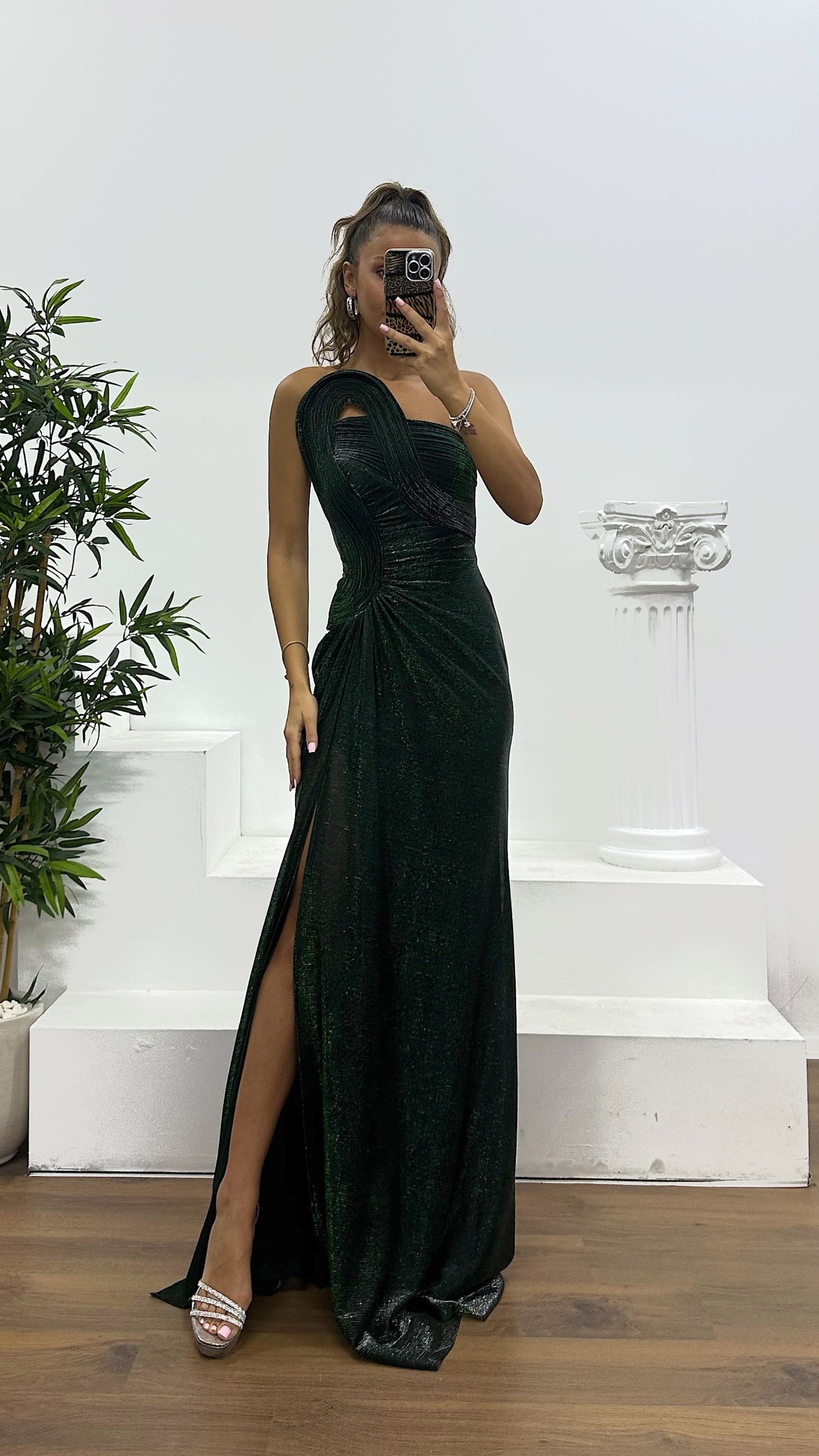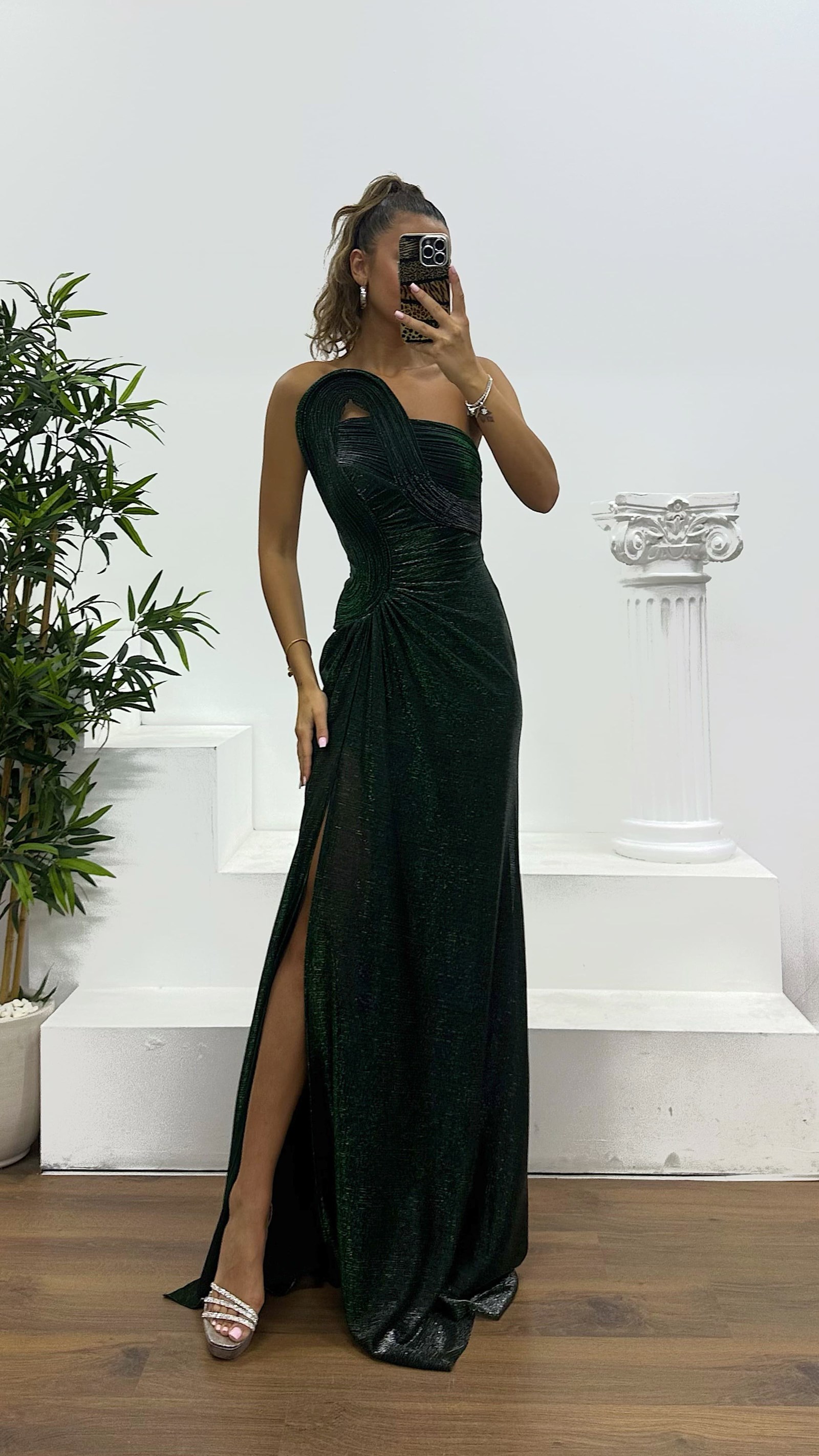 Abito da sera lucido con dettaglio colletto senza spalline Il prodotto è concepito come un abito da sera con imbottiture sul petto, fodera, chiusura posteriore con zip, spacco, dettaglio colletto, adatto per le taglie 36-44. Lunghezza del prodotto: 170-175 cm. Tipo di tessuto: raso poliestere-viscosa