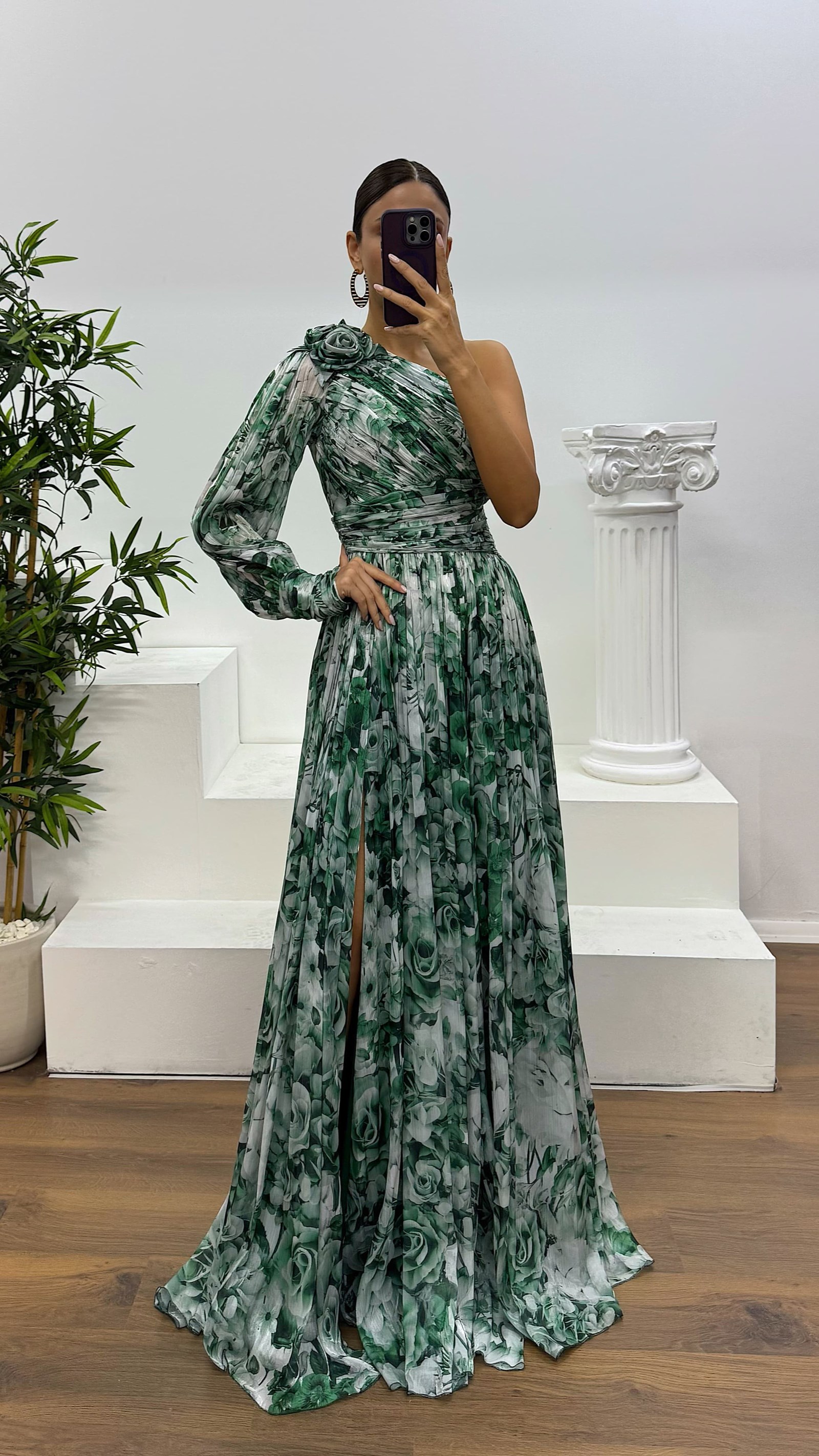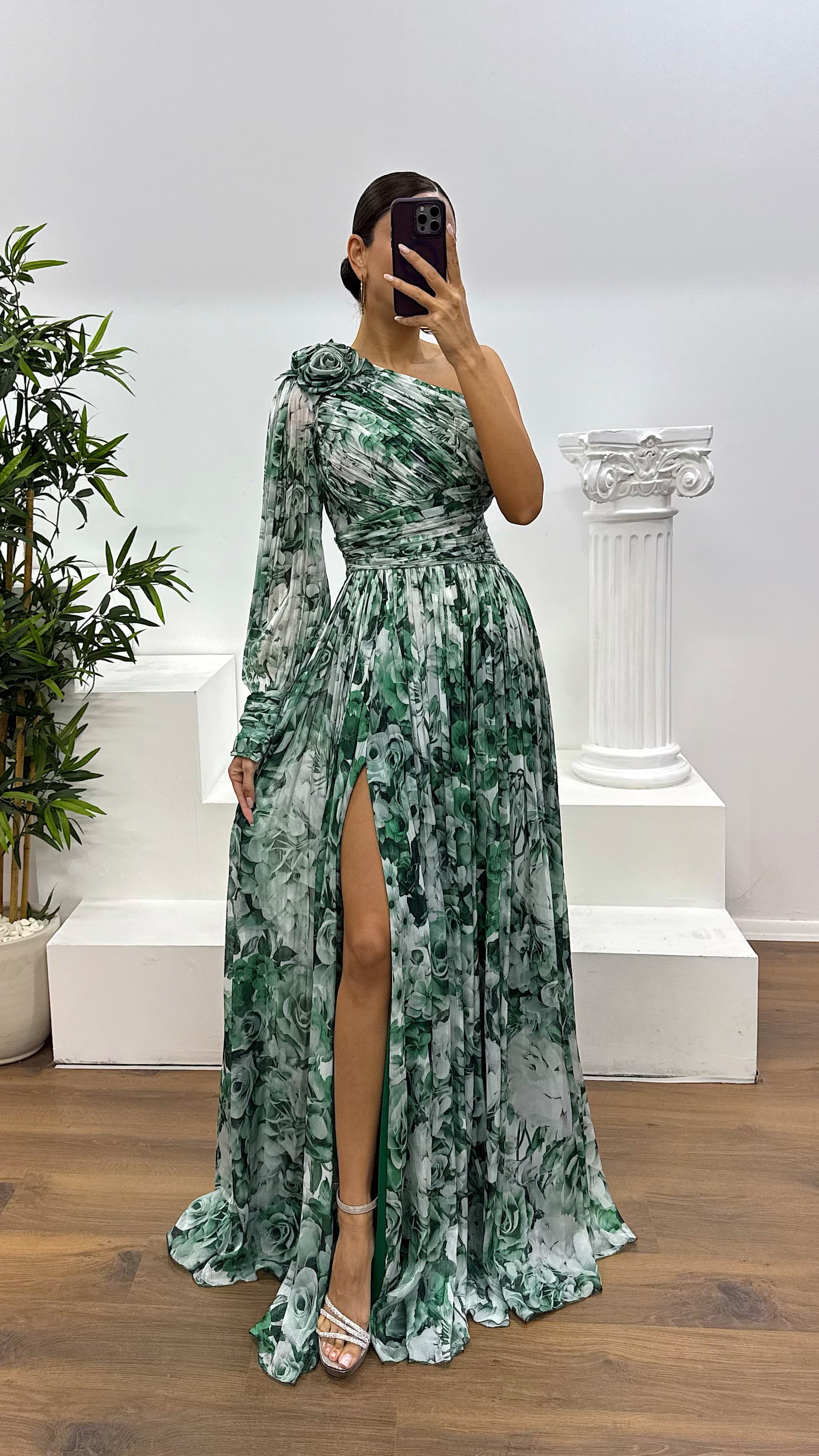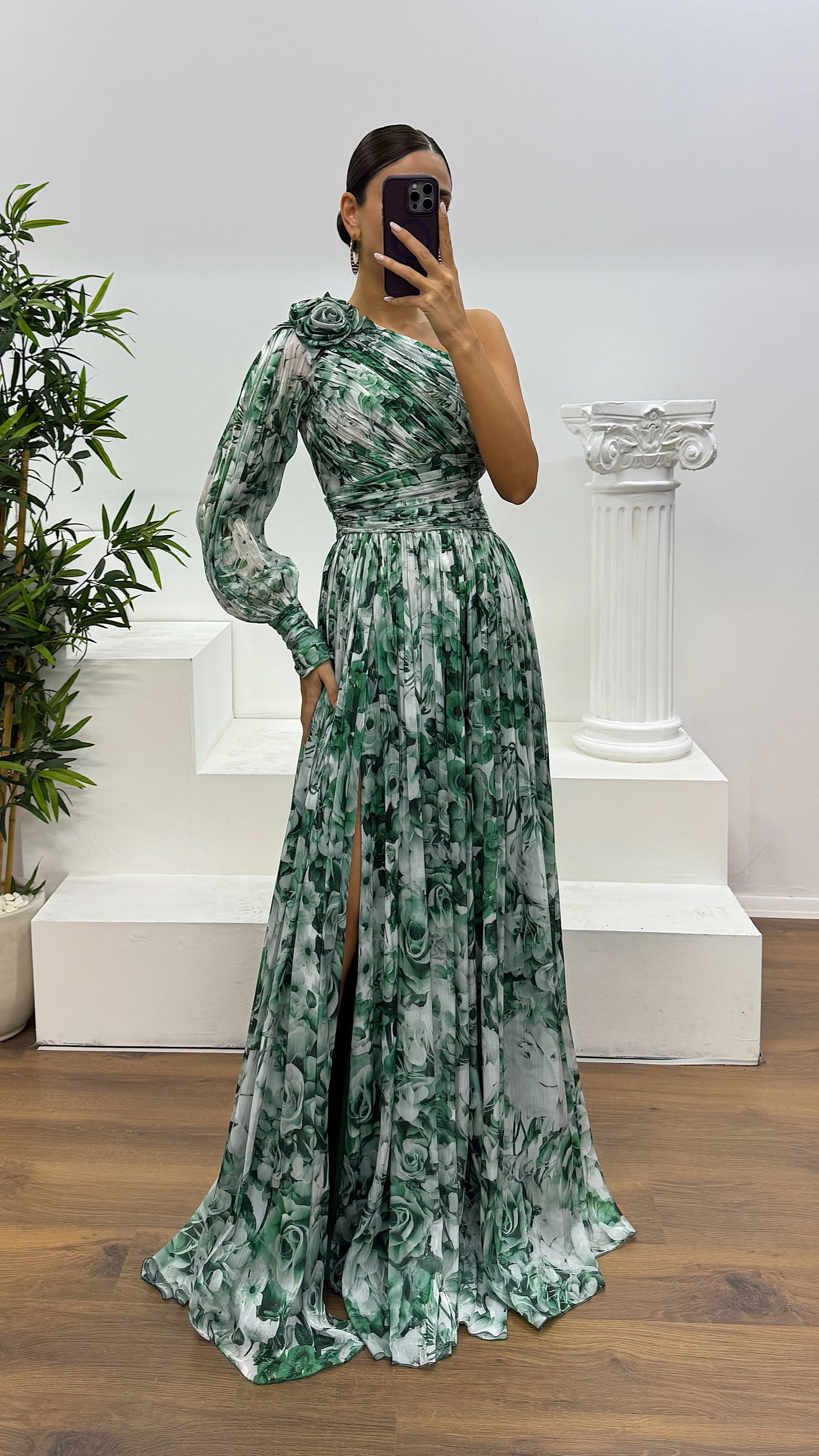 Zümrüt Tek Kol Desenli Abiye Elbise