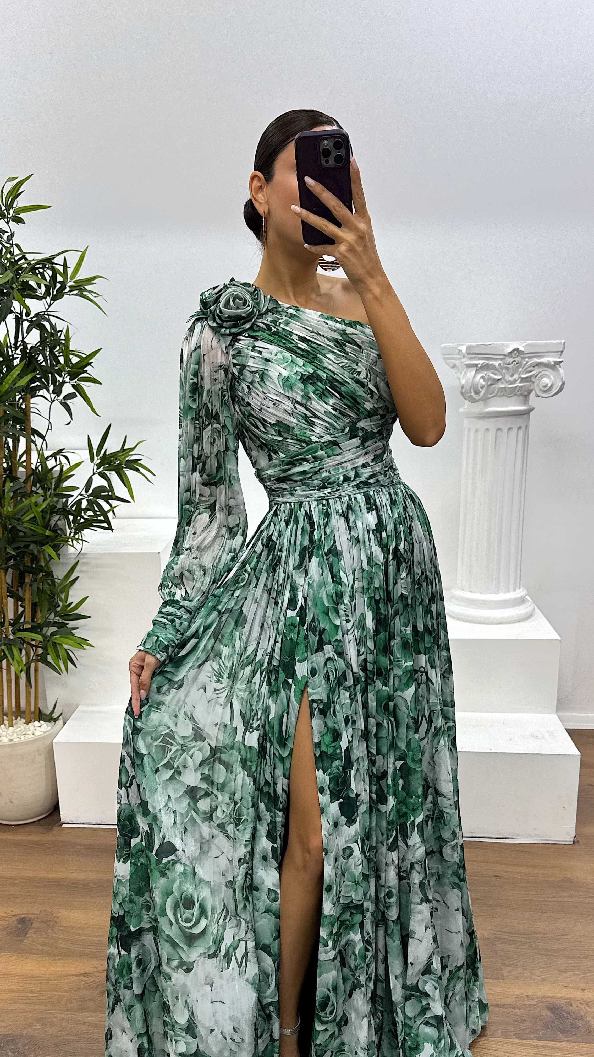 • Kemik Yeşil Tek Kol Desenli Abiye Elbise