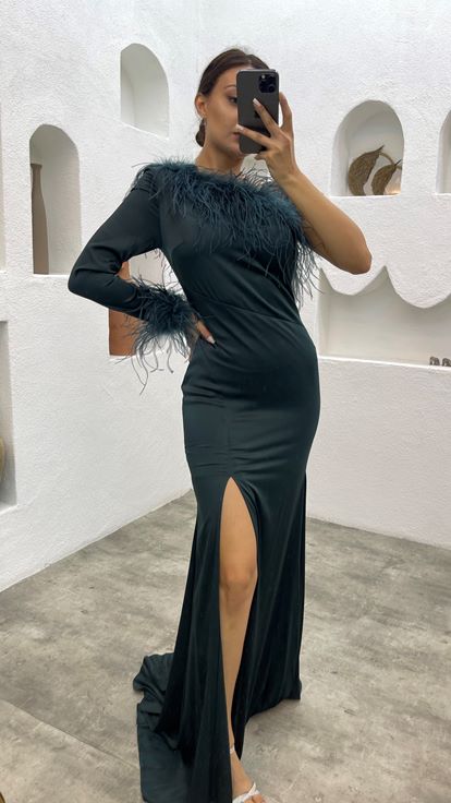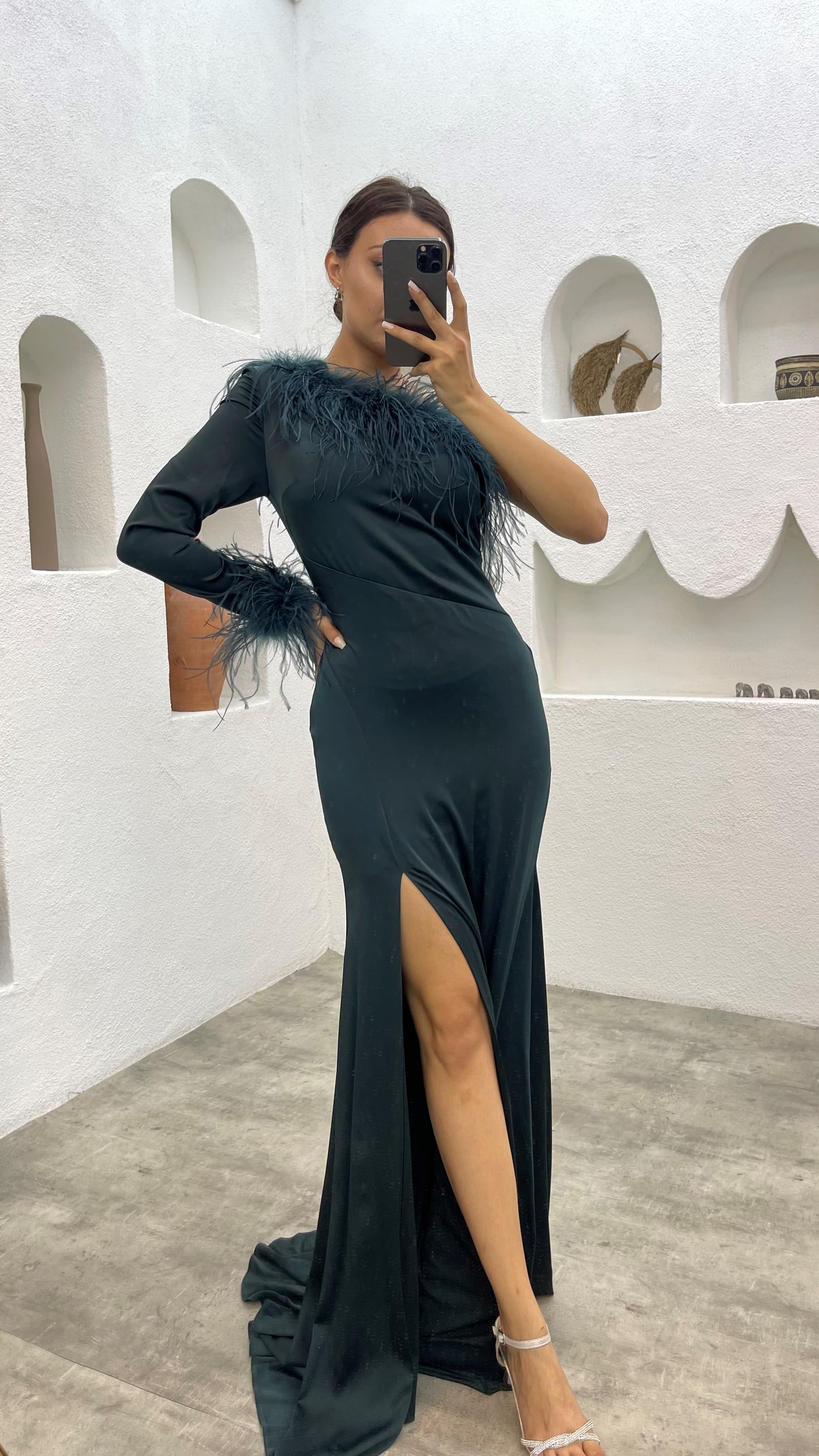 Emerald Feather Dettaglio Slit Single Sleeve Abito da sera