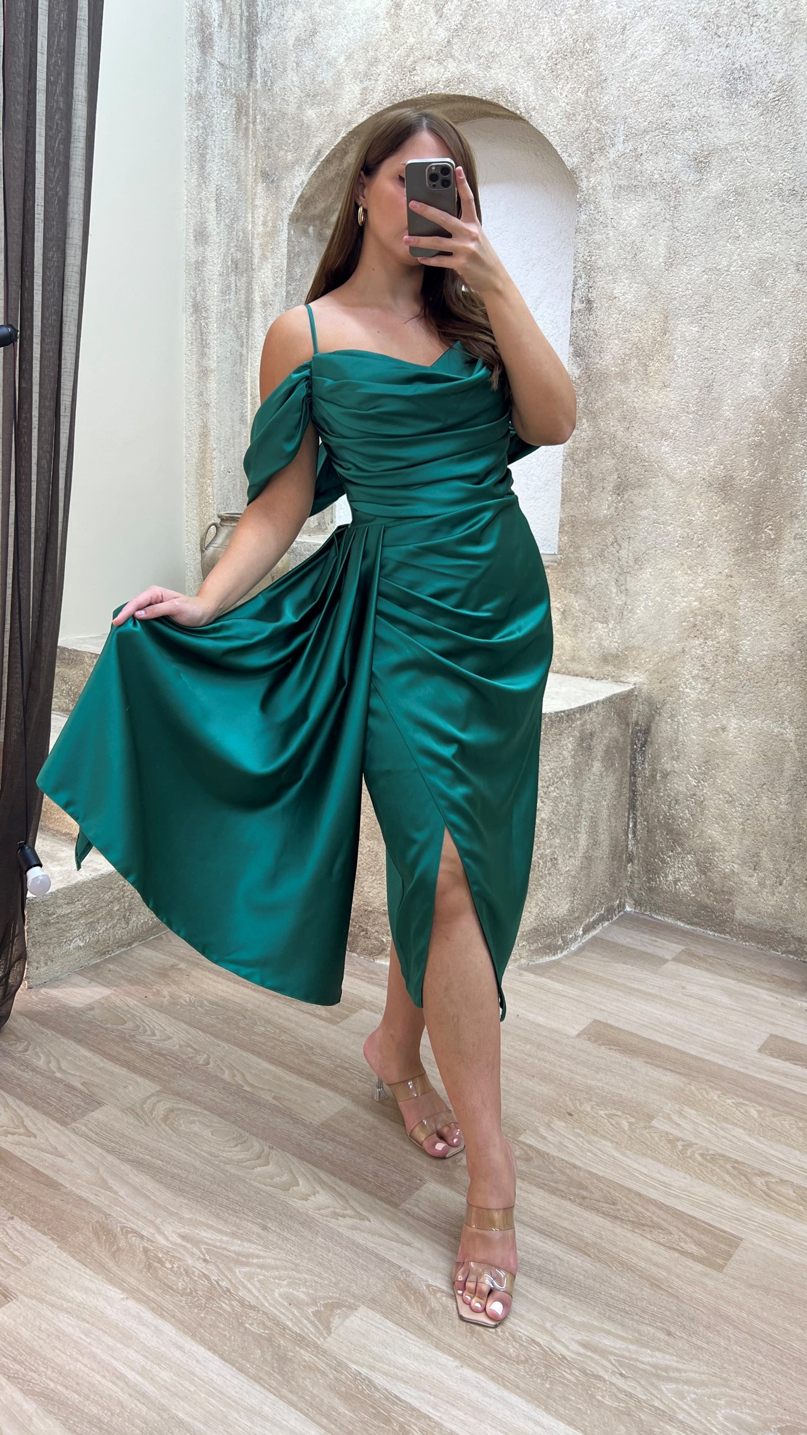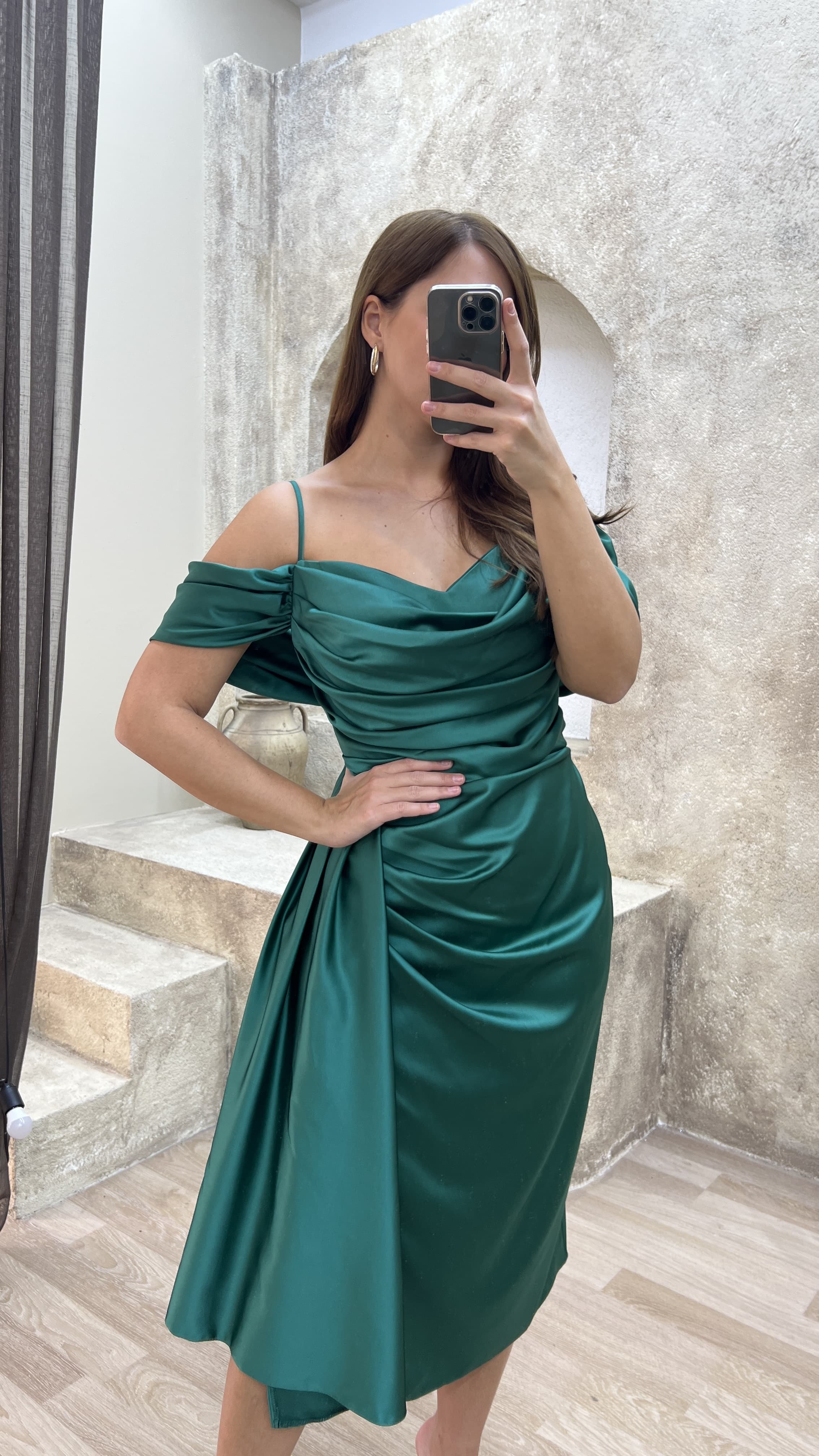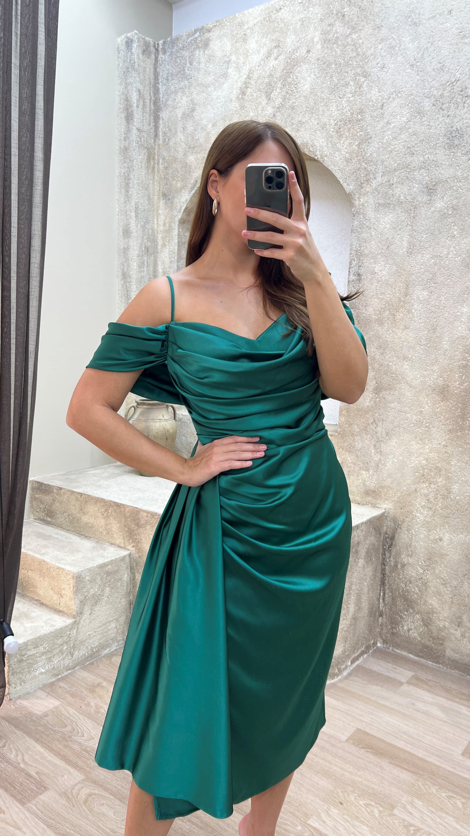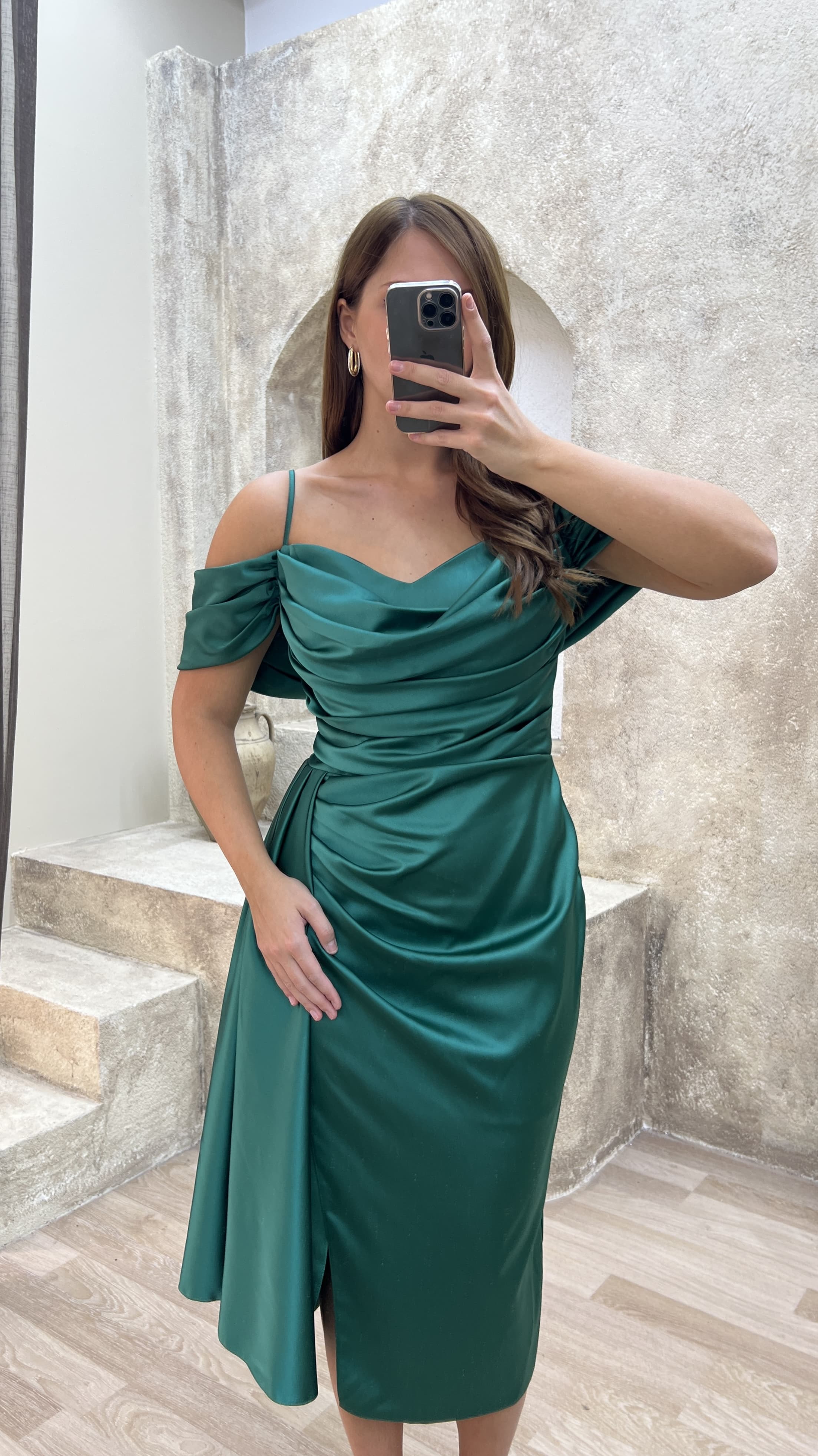 • Zümrüt Yeşili Omuz Detay Büzgülü Tasarım Midi Boy Büyük Beden Elbise