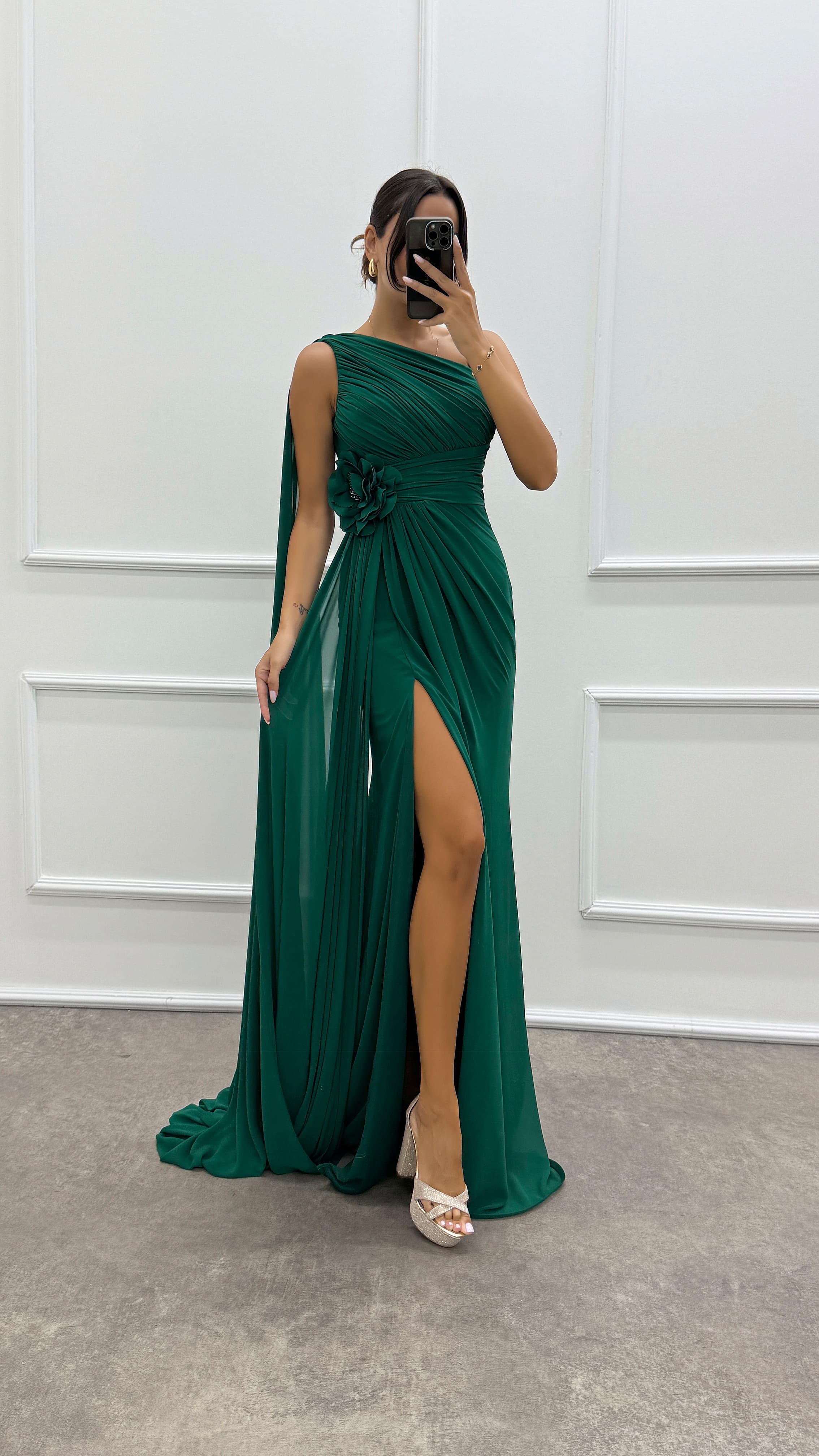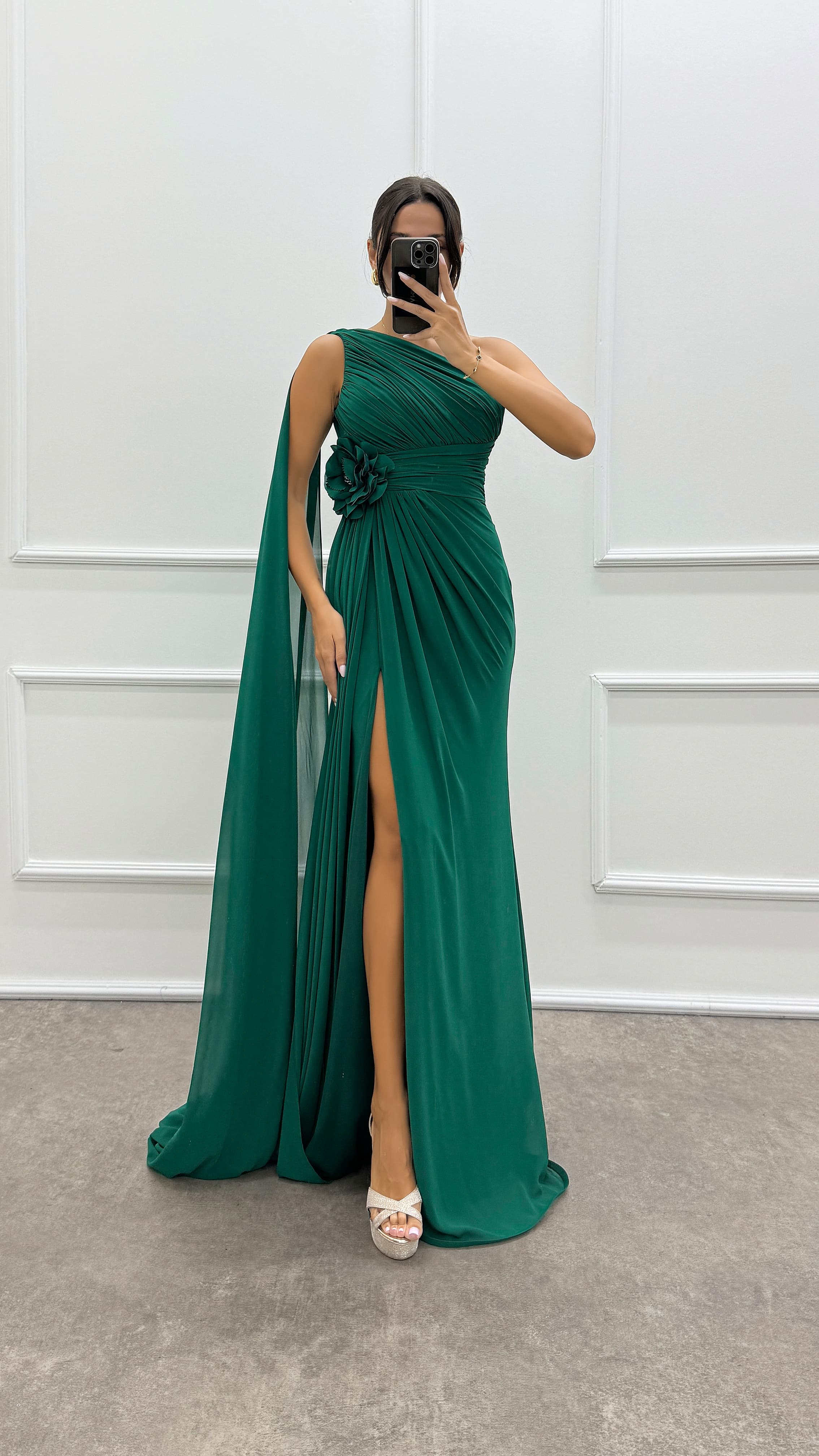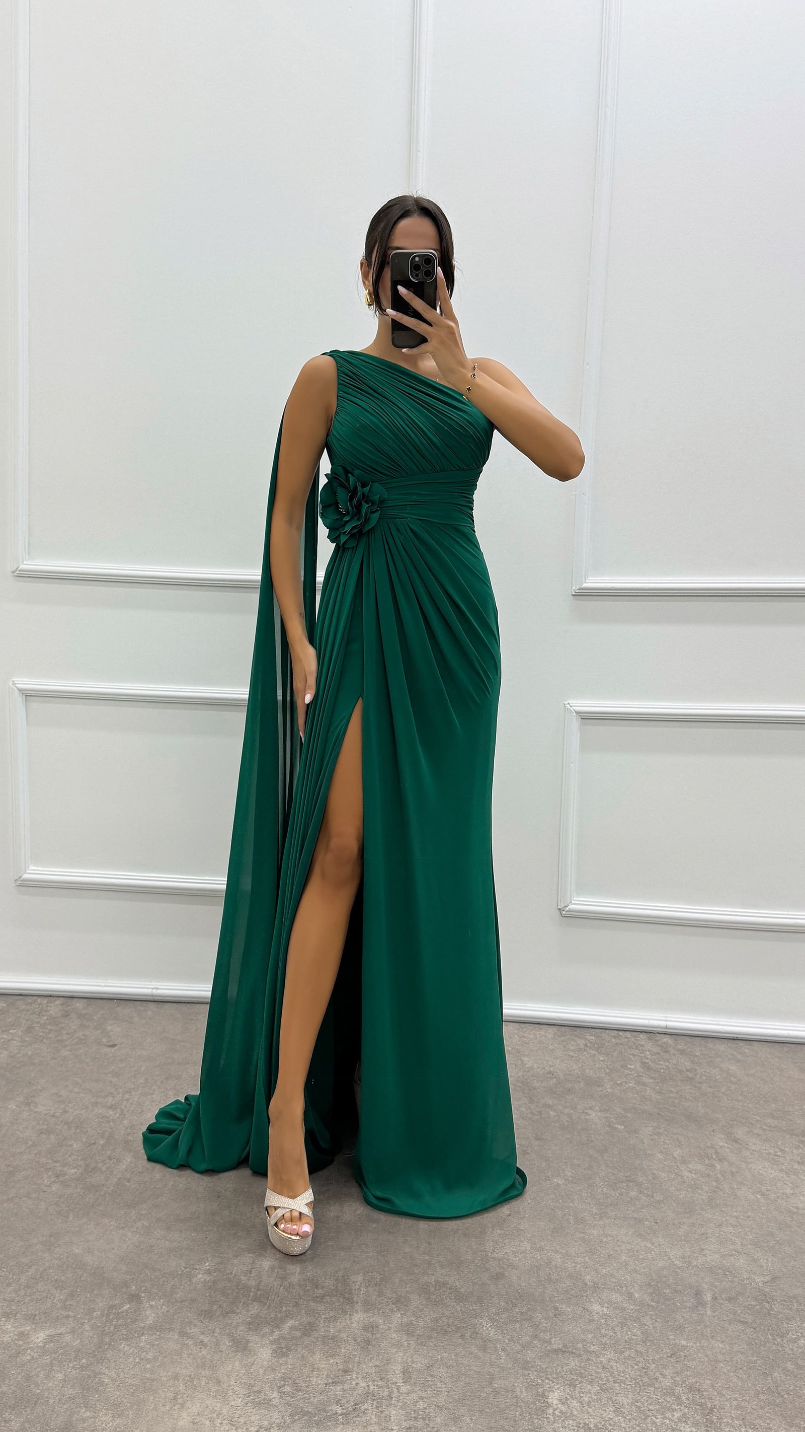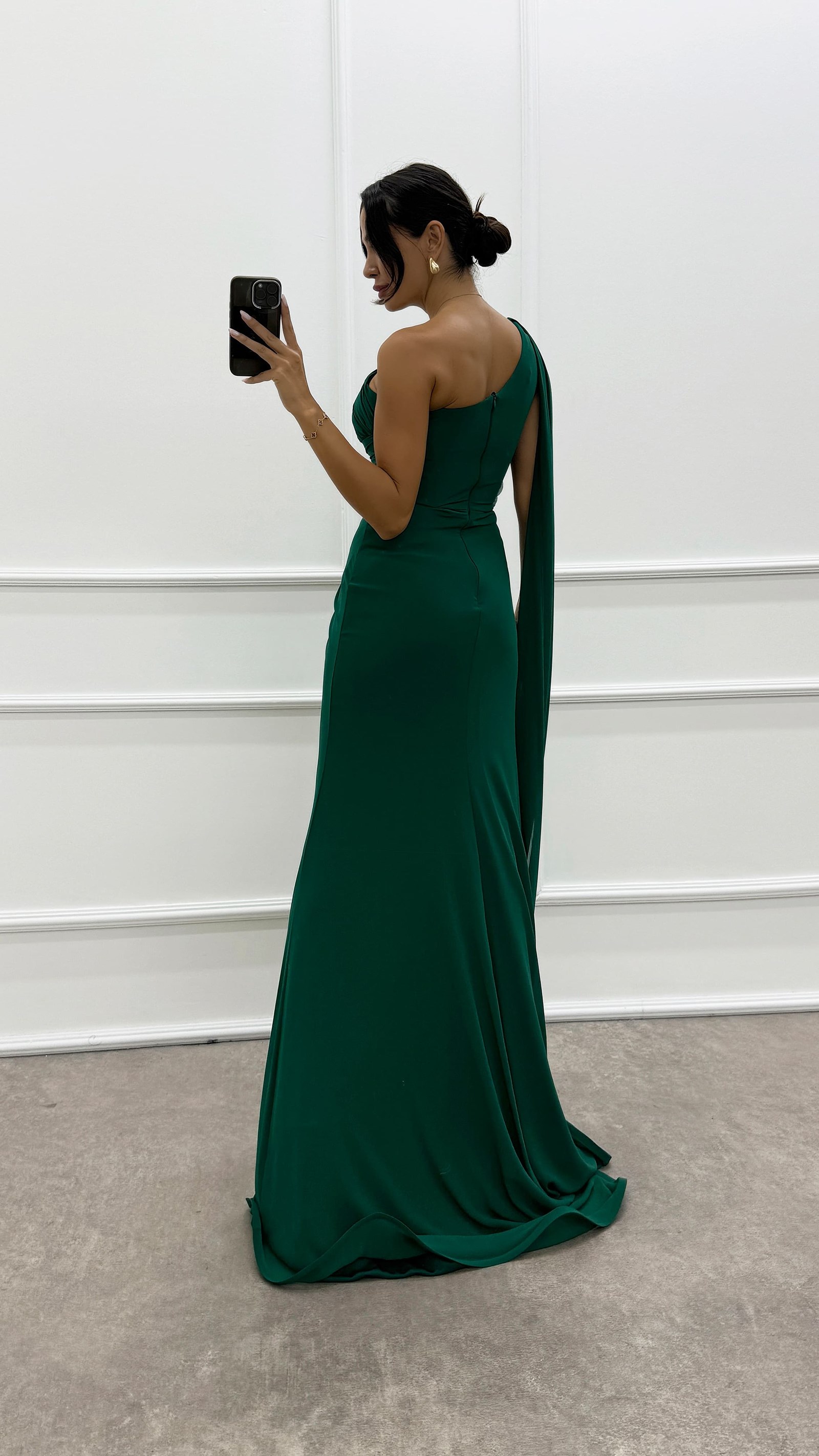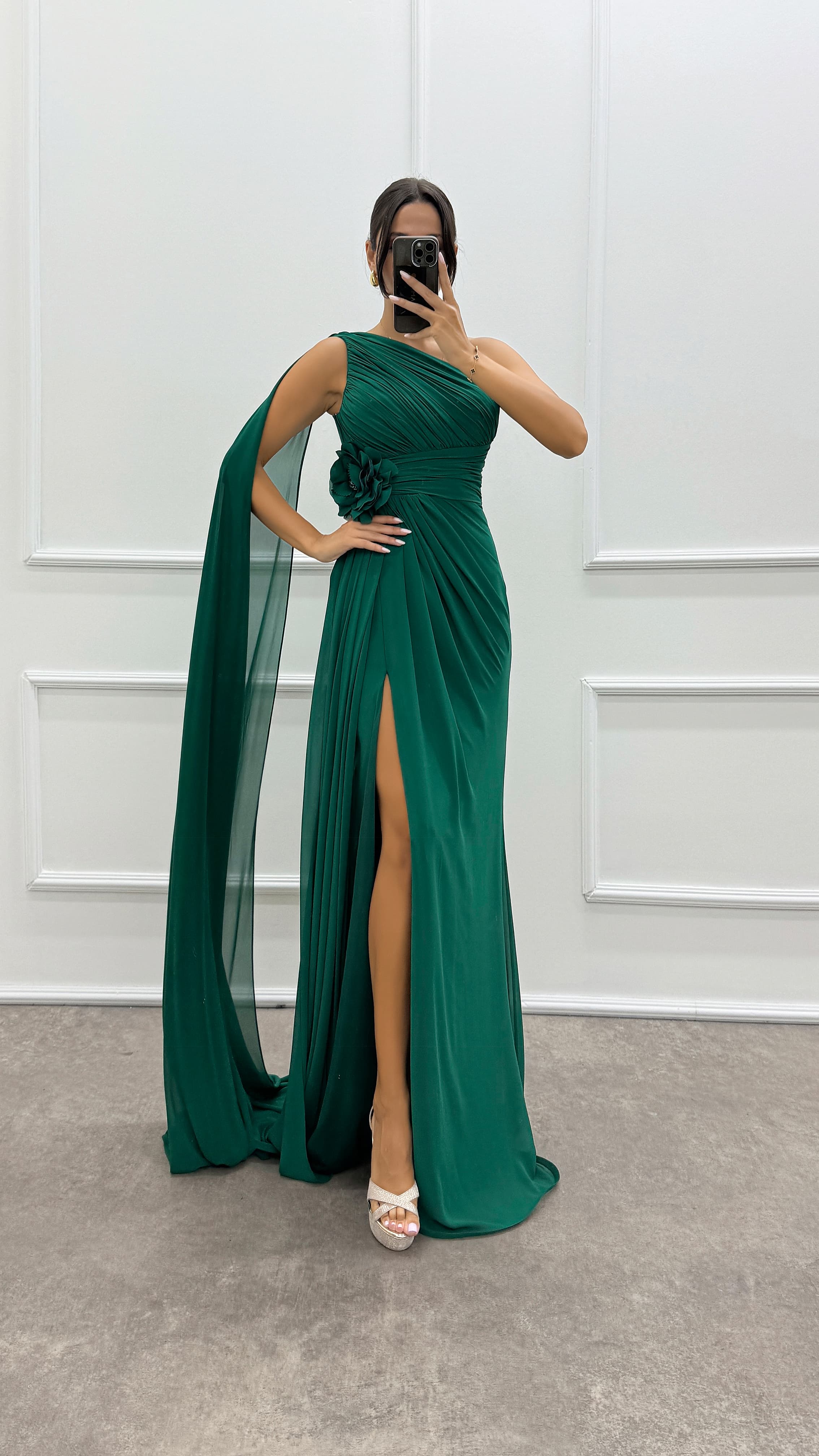 • Zümrüt Yeşili Tek Omuz Kol Detay Abiye Elbise