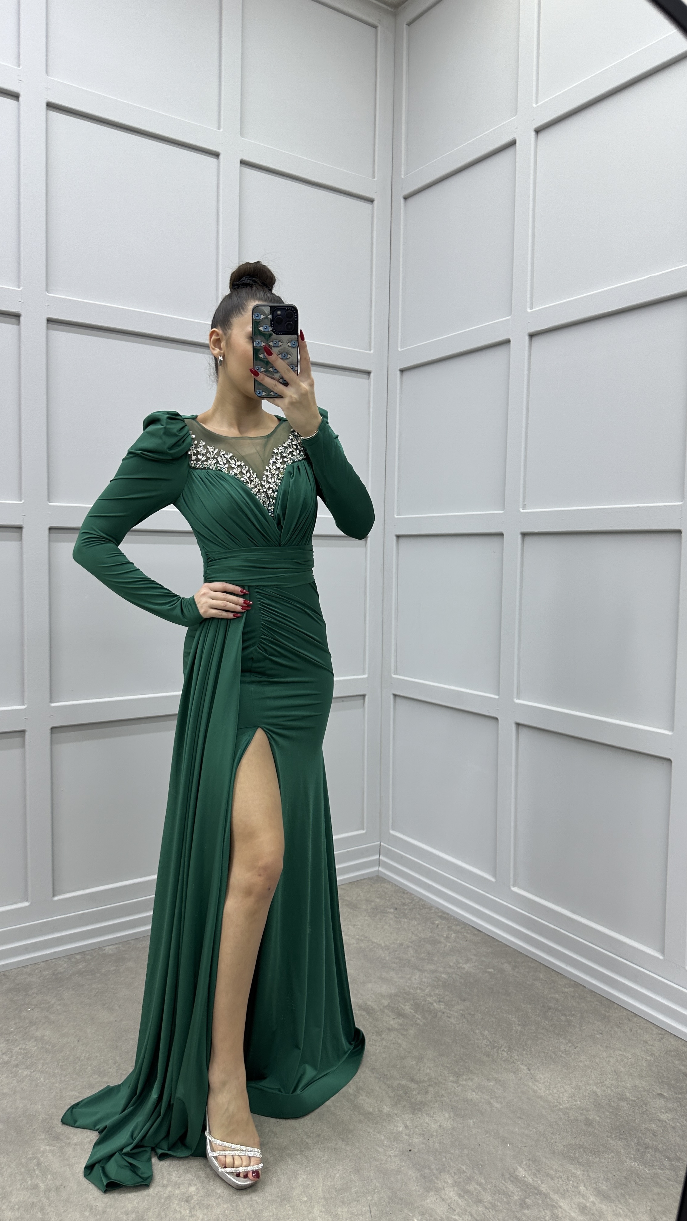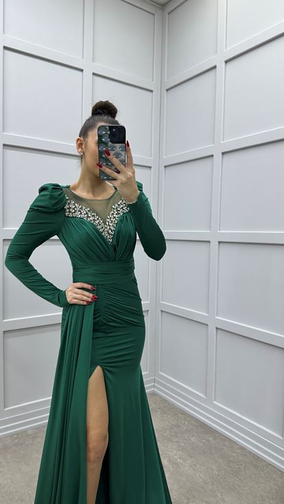 • Zümrüt Yeşili V Yaka Göğsü Taş İşlemeli Tasarım Abiye Elbise