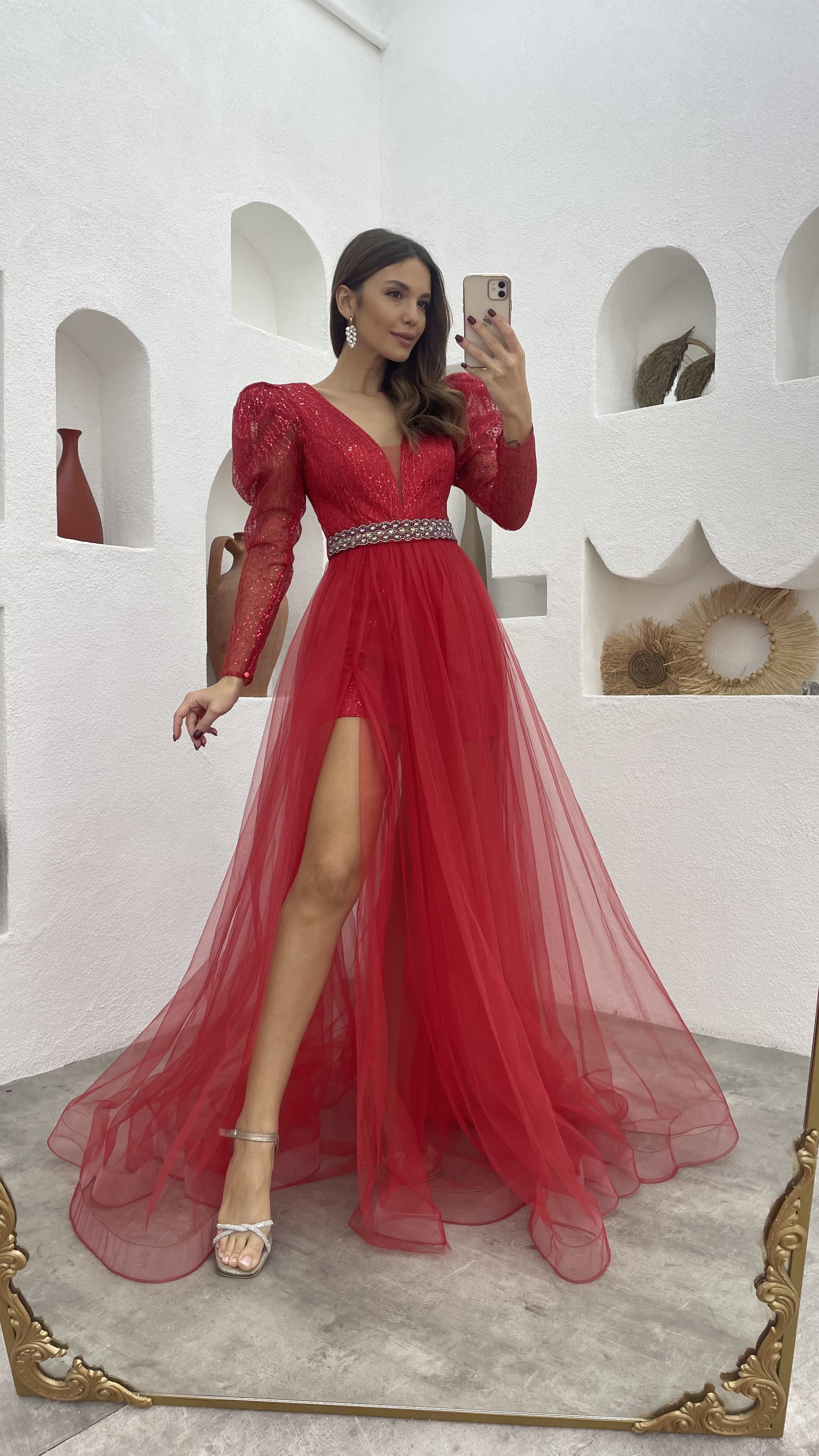 • Kırmızı Simli Kemerli Tül Abiye Elbise
