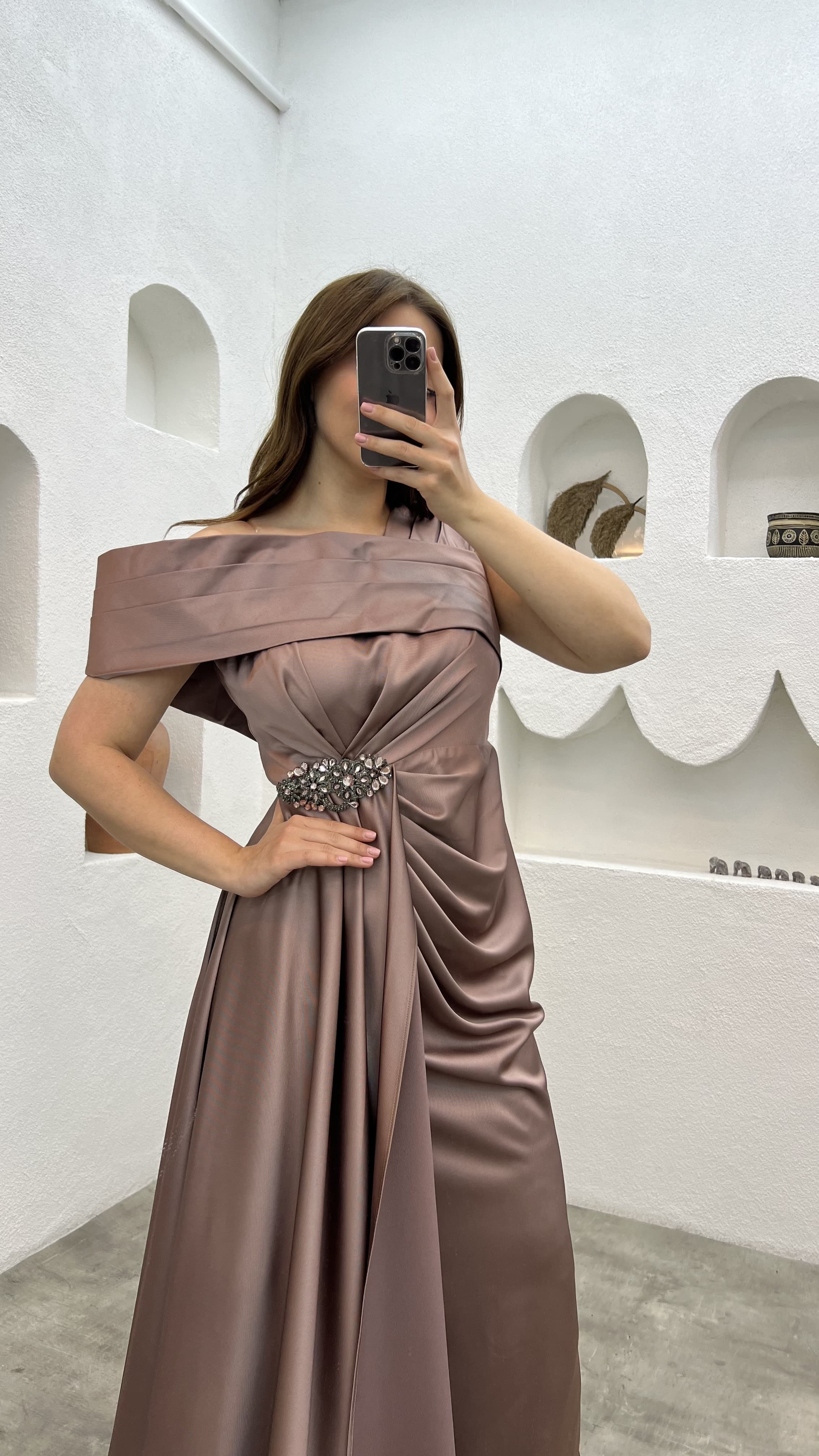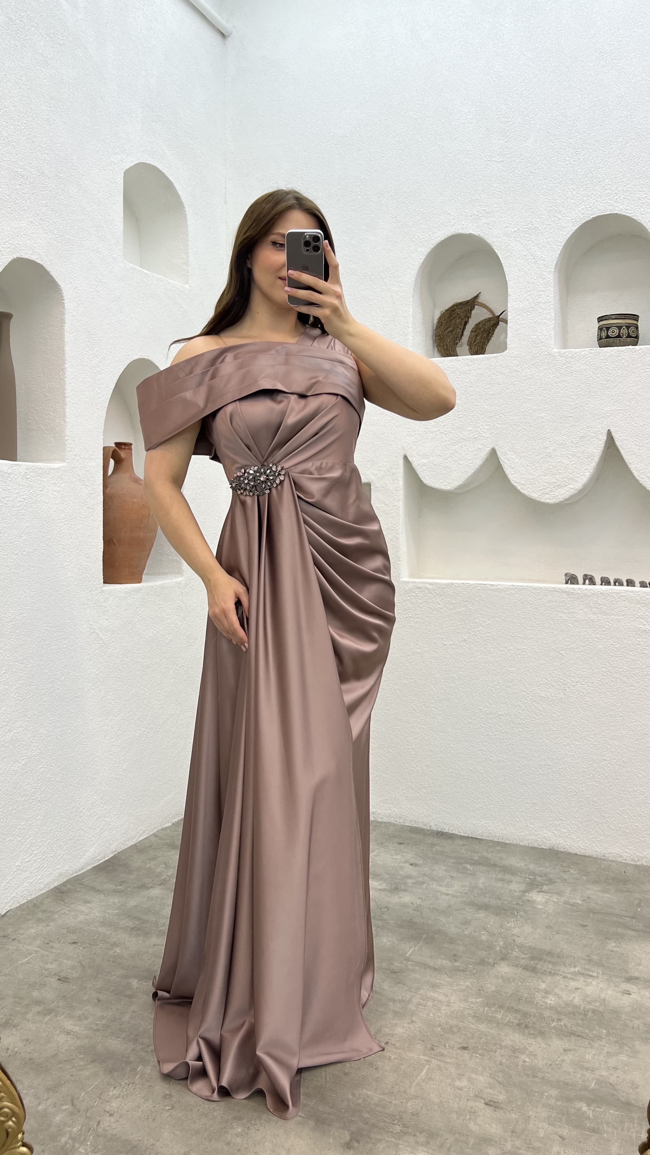 • Gül Kurusu Saten Tek Omuz Büyük Beden Abiye Elbise