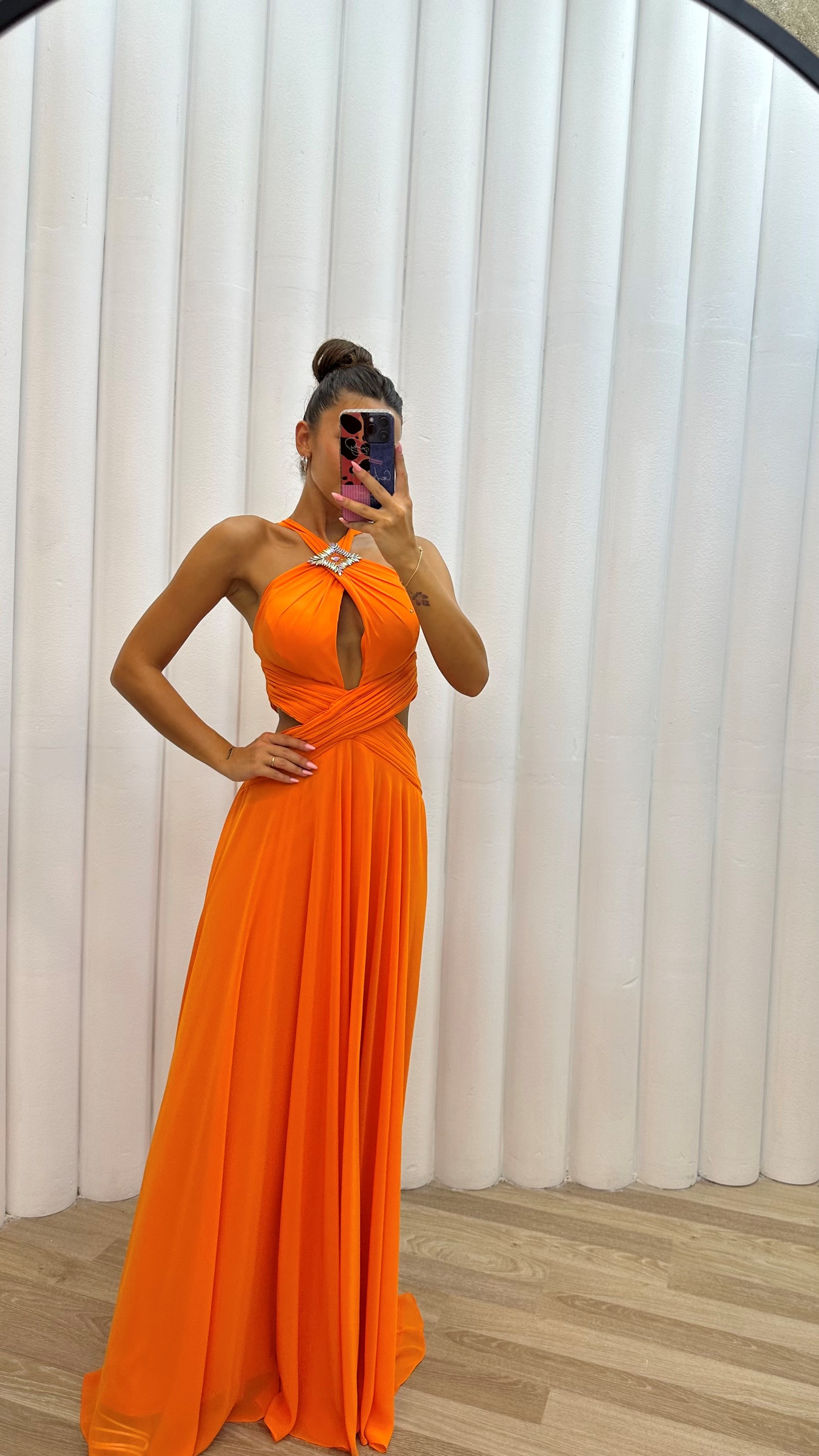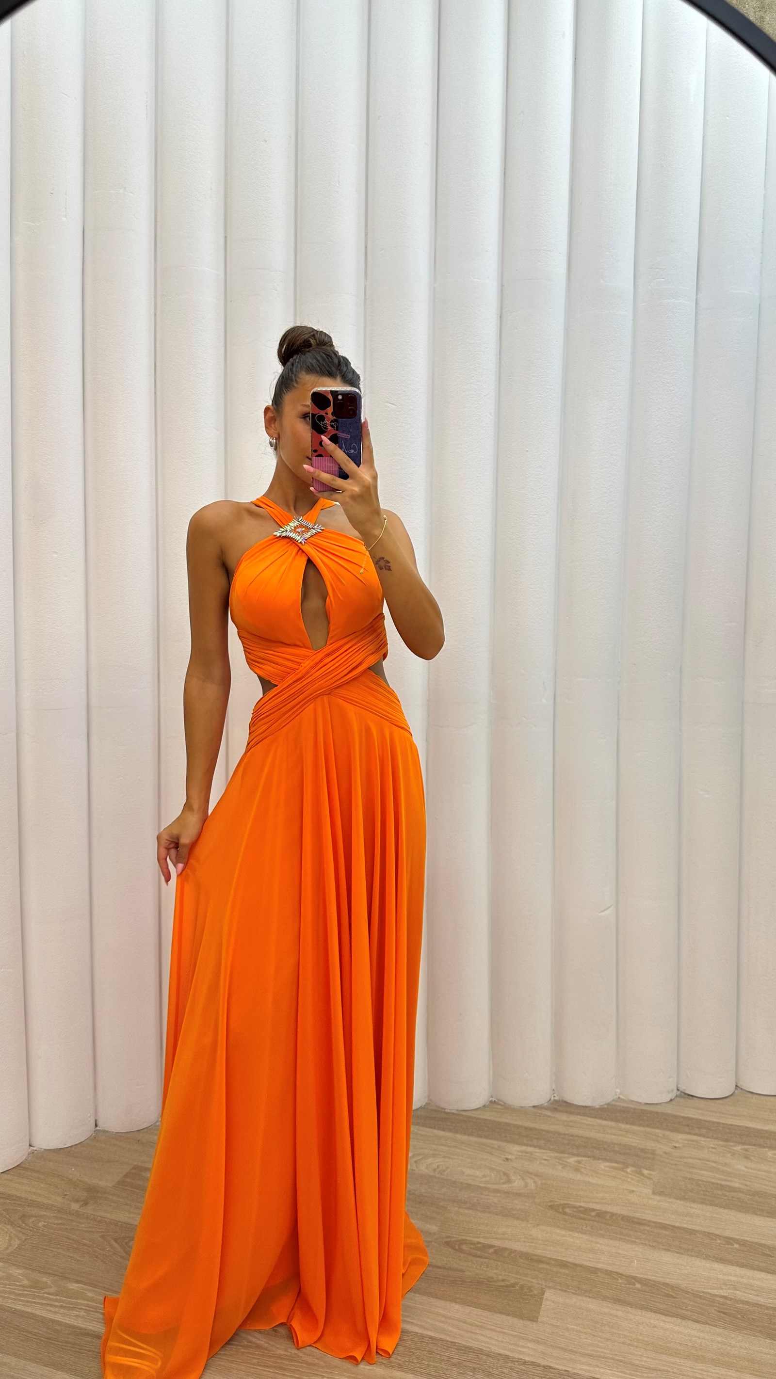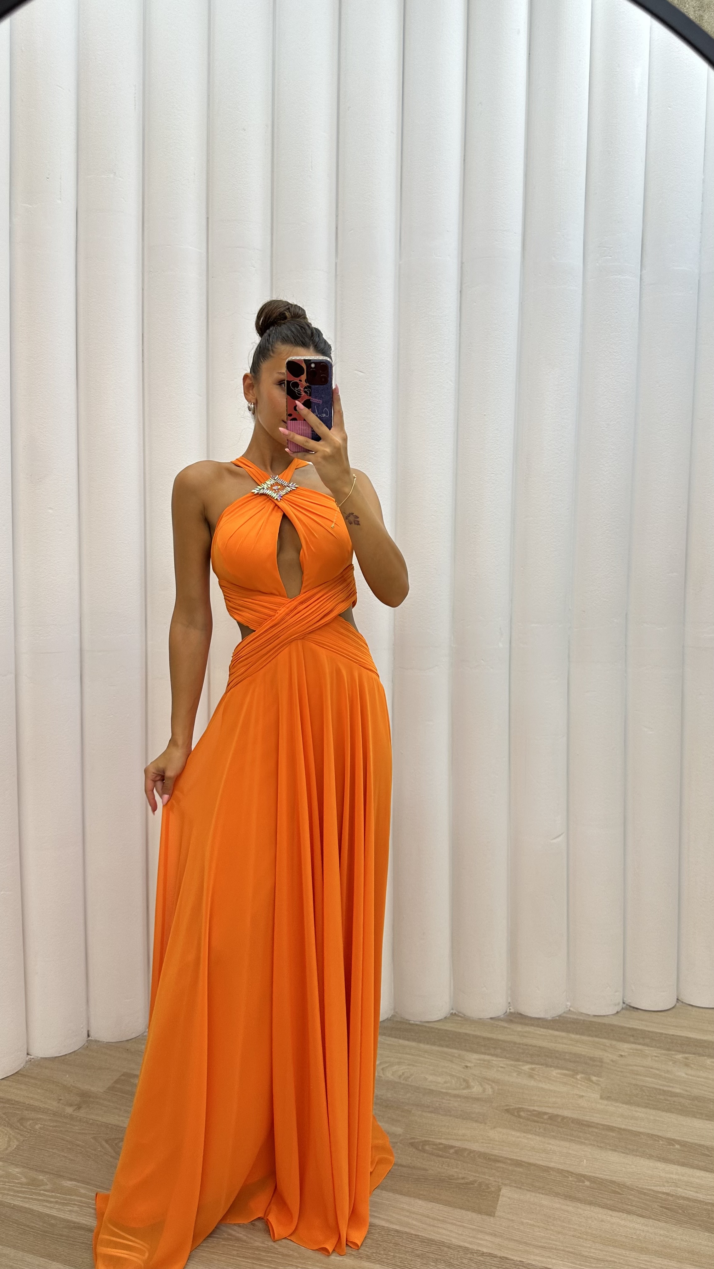 • Turuncu Boyun Ve Bel Detay Broşlu Abiye Elbise