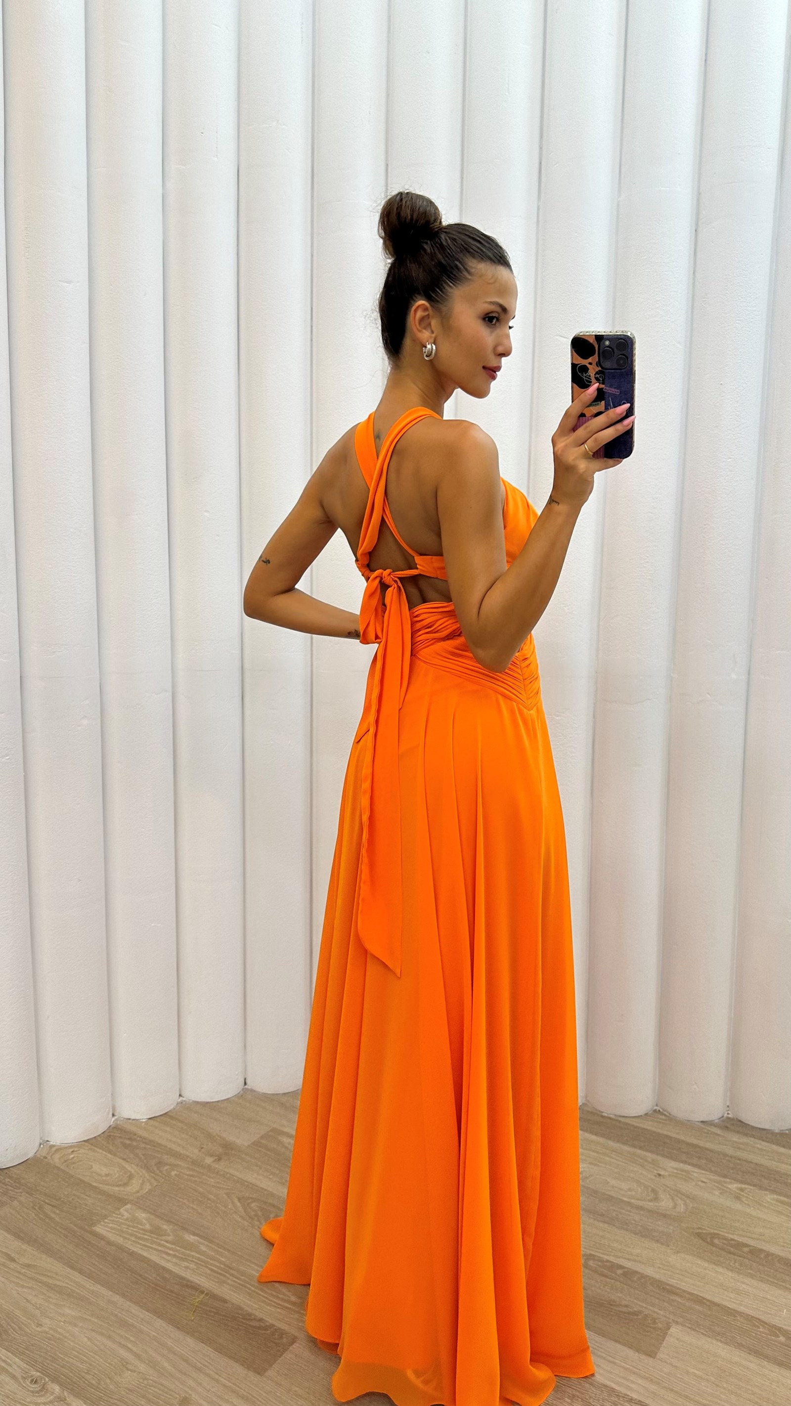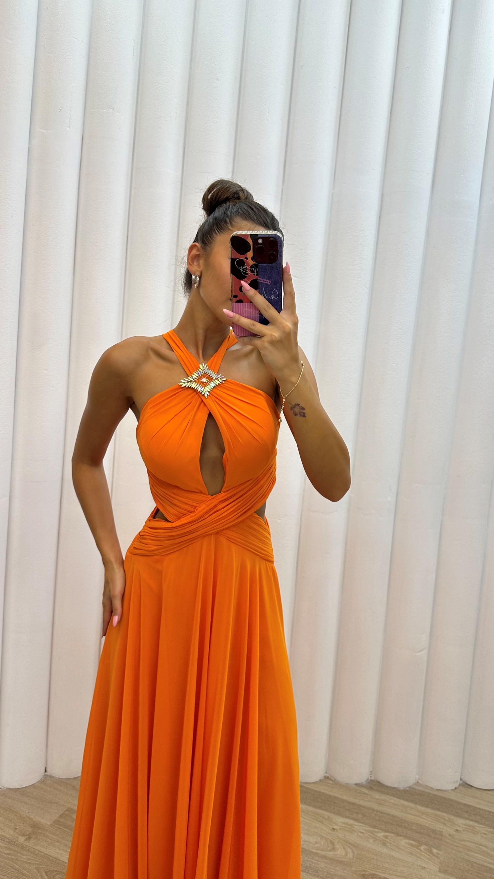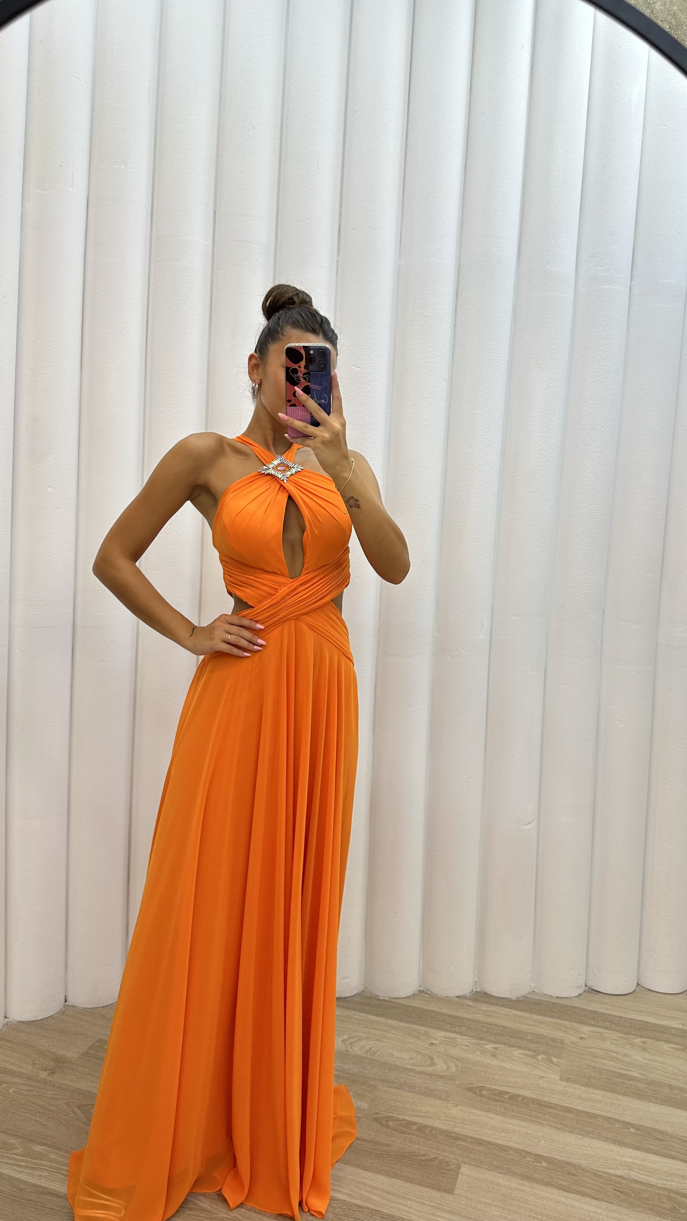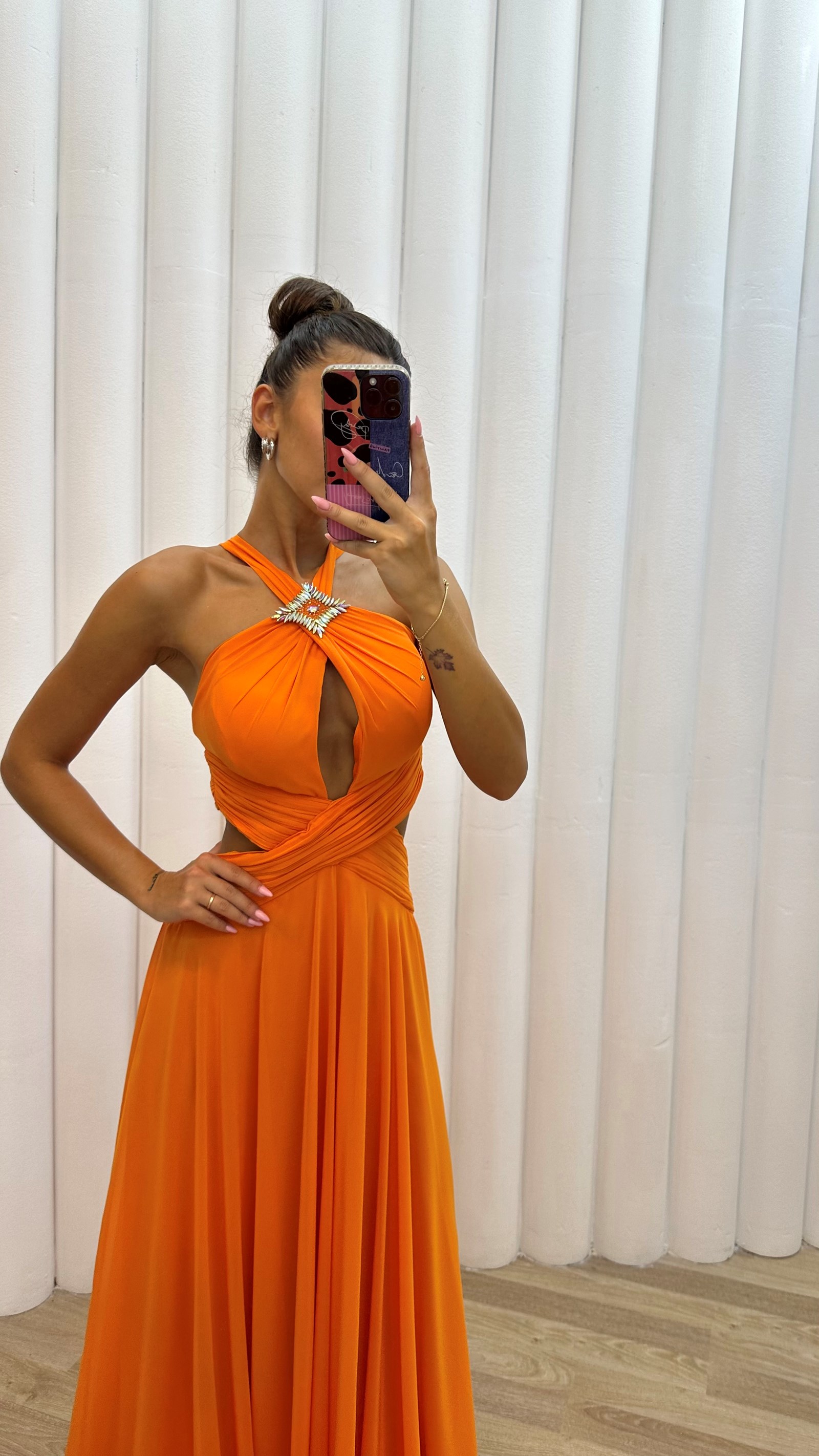 • Turuncu Boyun Ve Bel Detay Broşlu Abiye Elbise