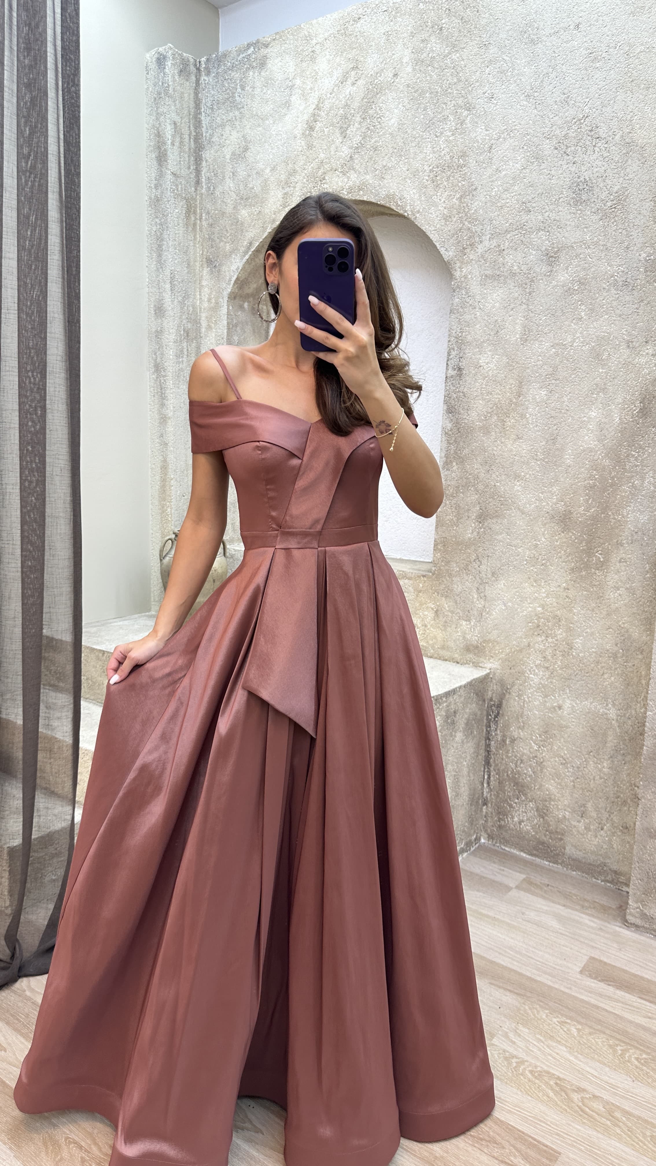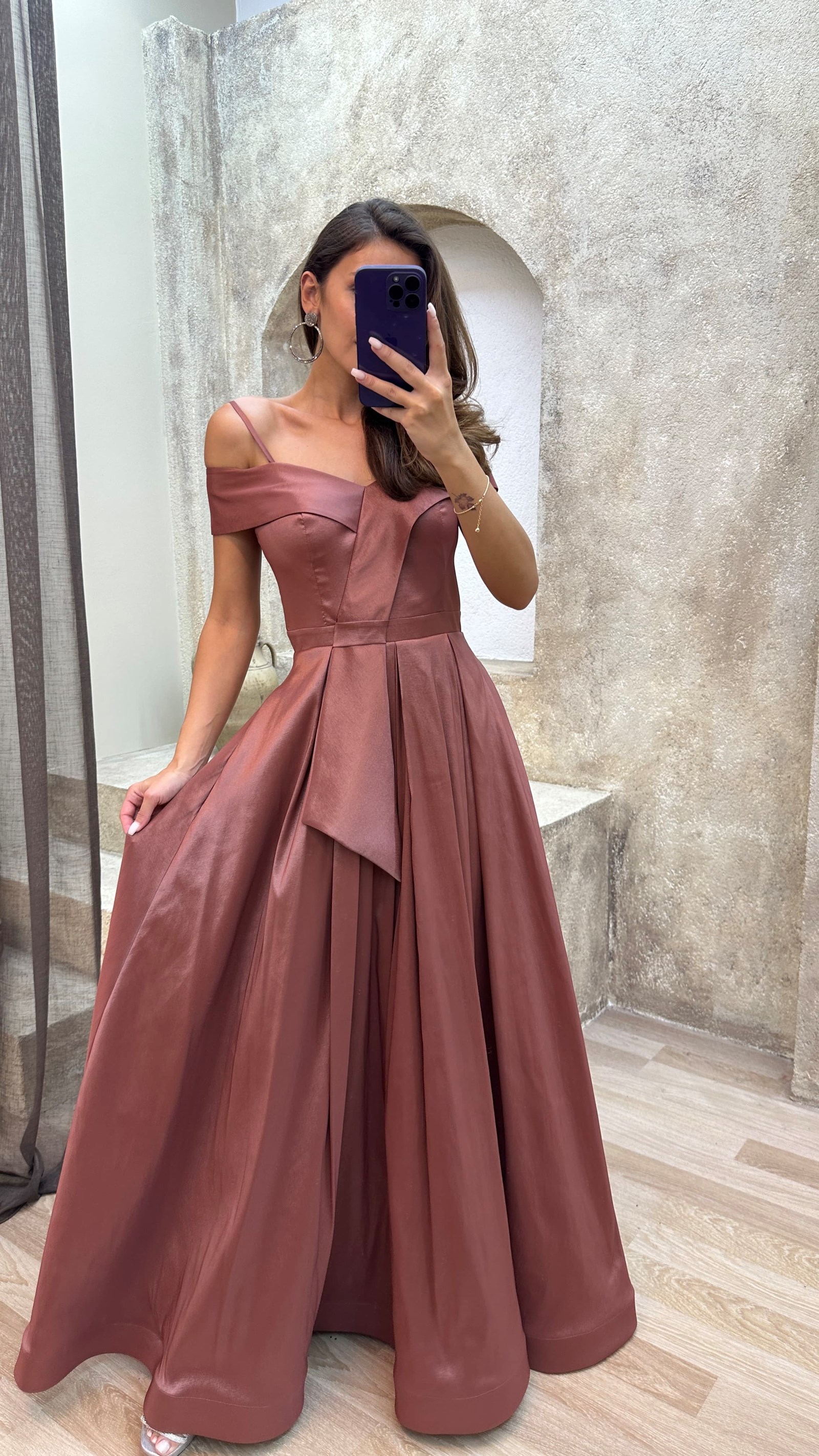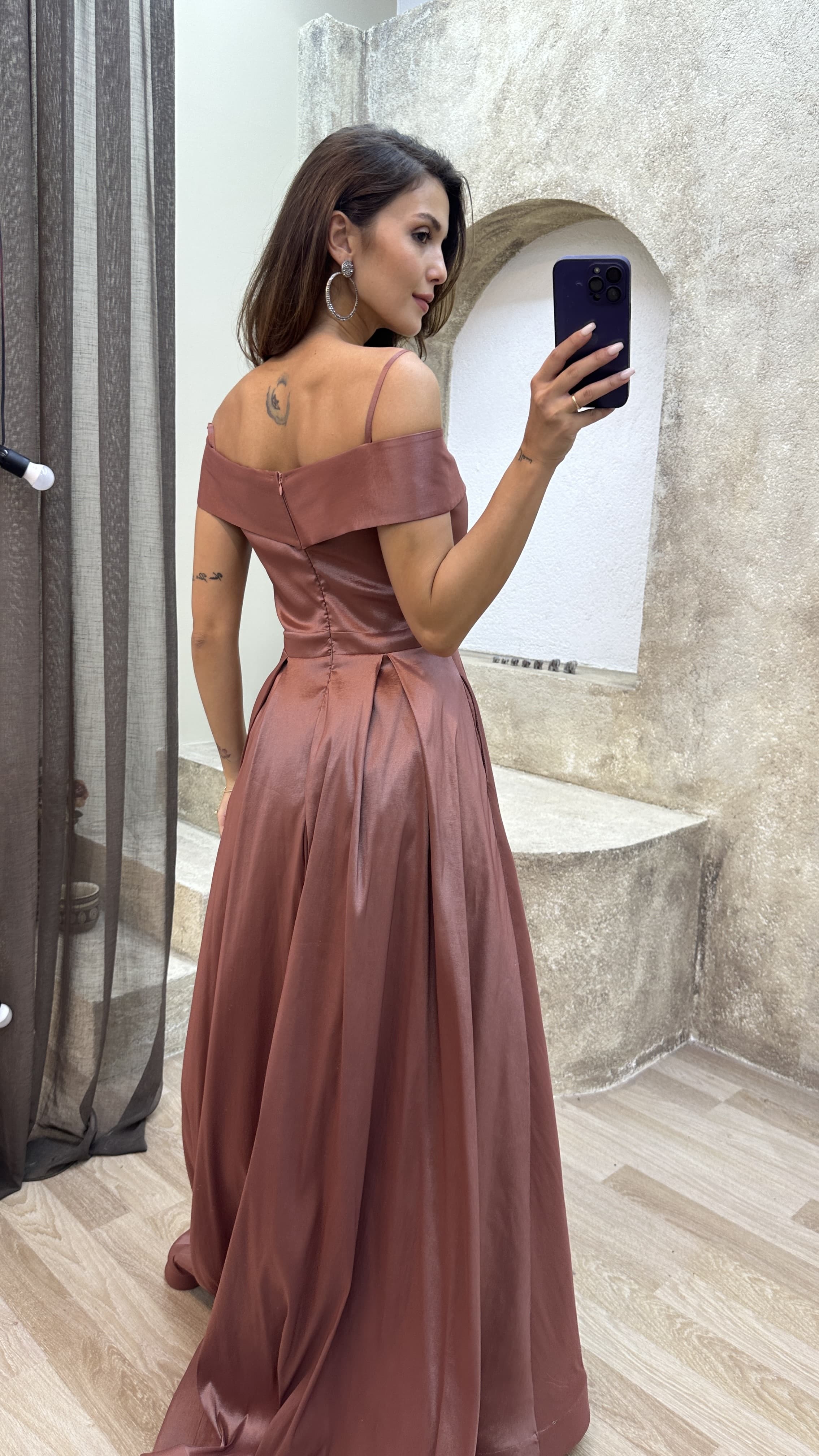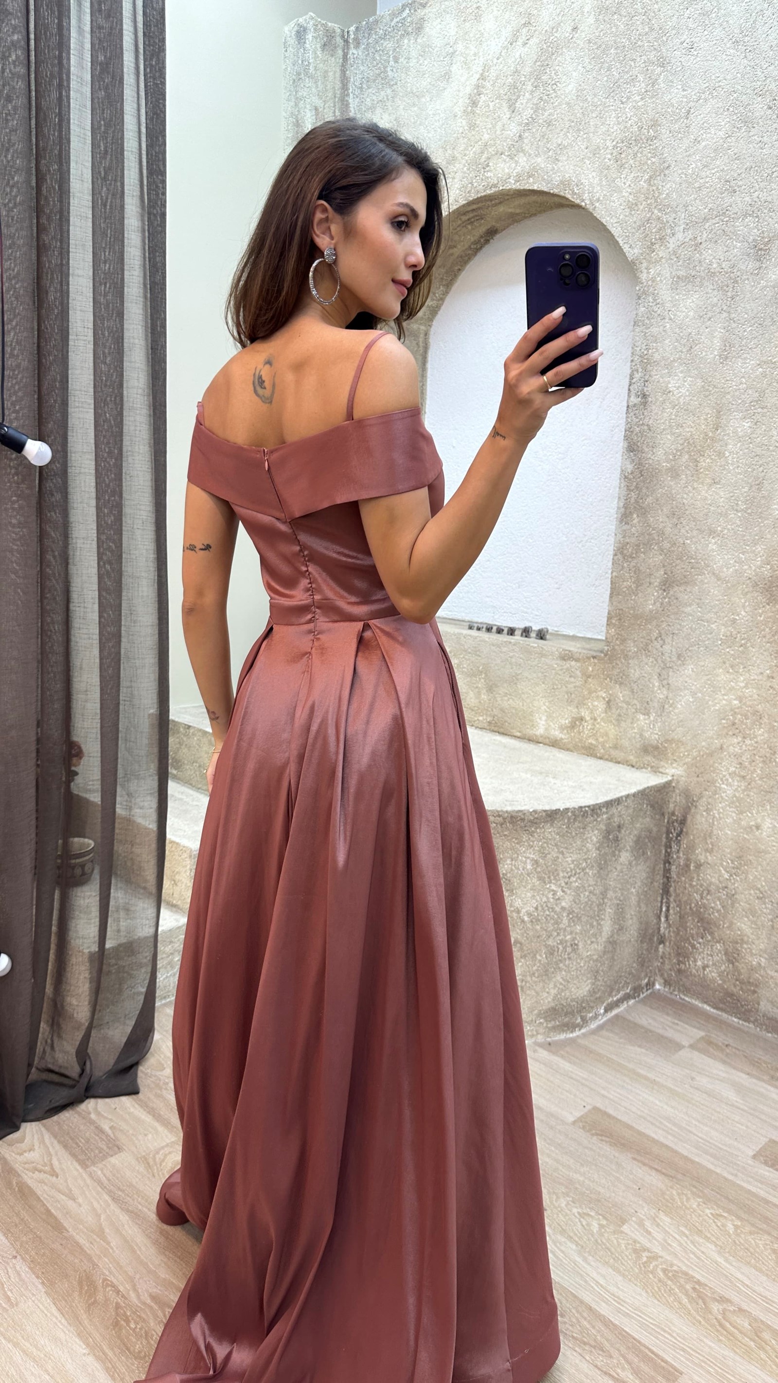 • Gül Kurusu İp Askılı Kayık Yaka Bel Detay Abiye Elbise