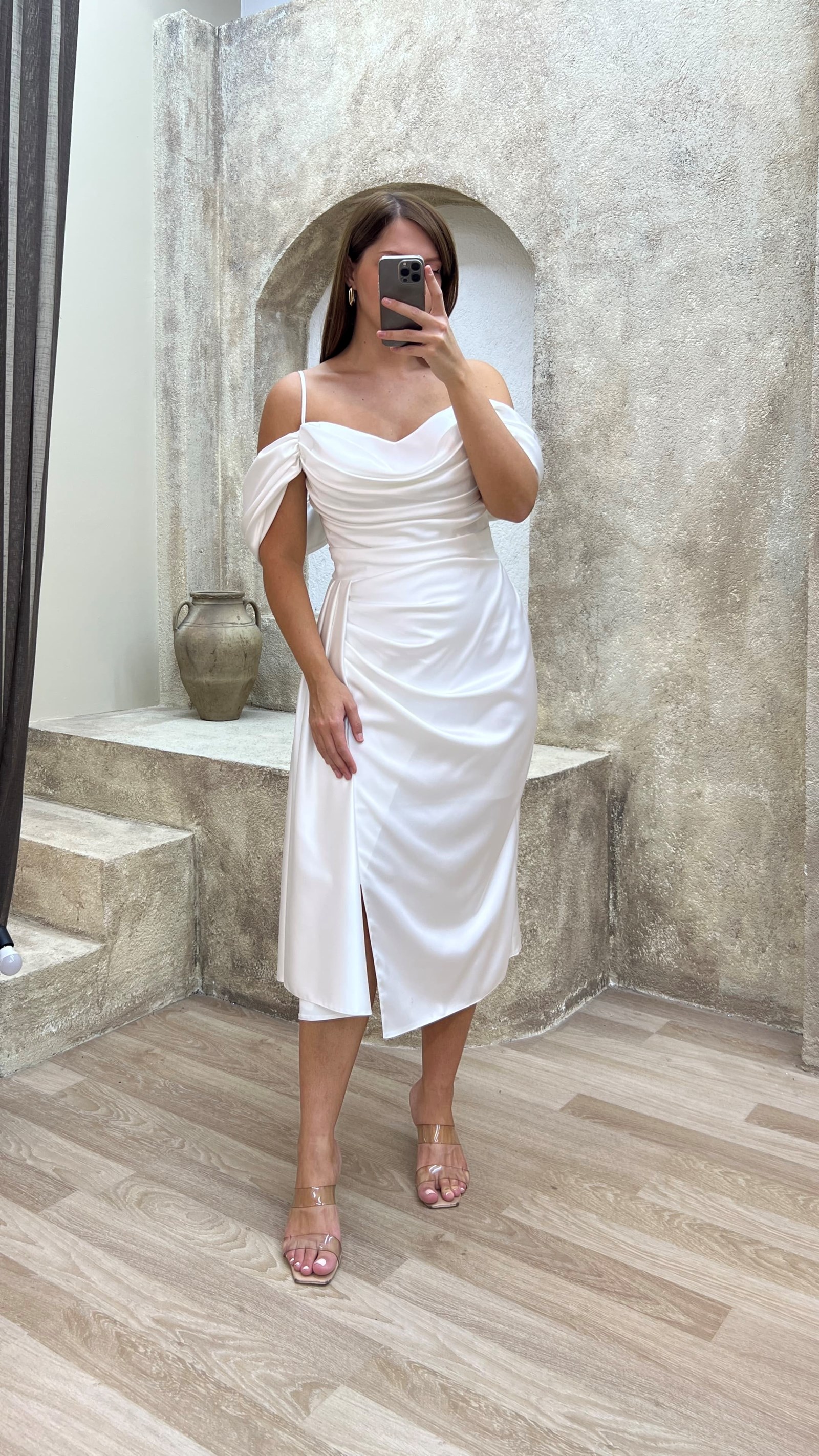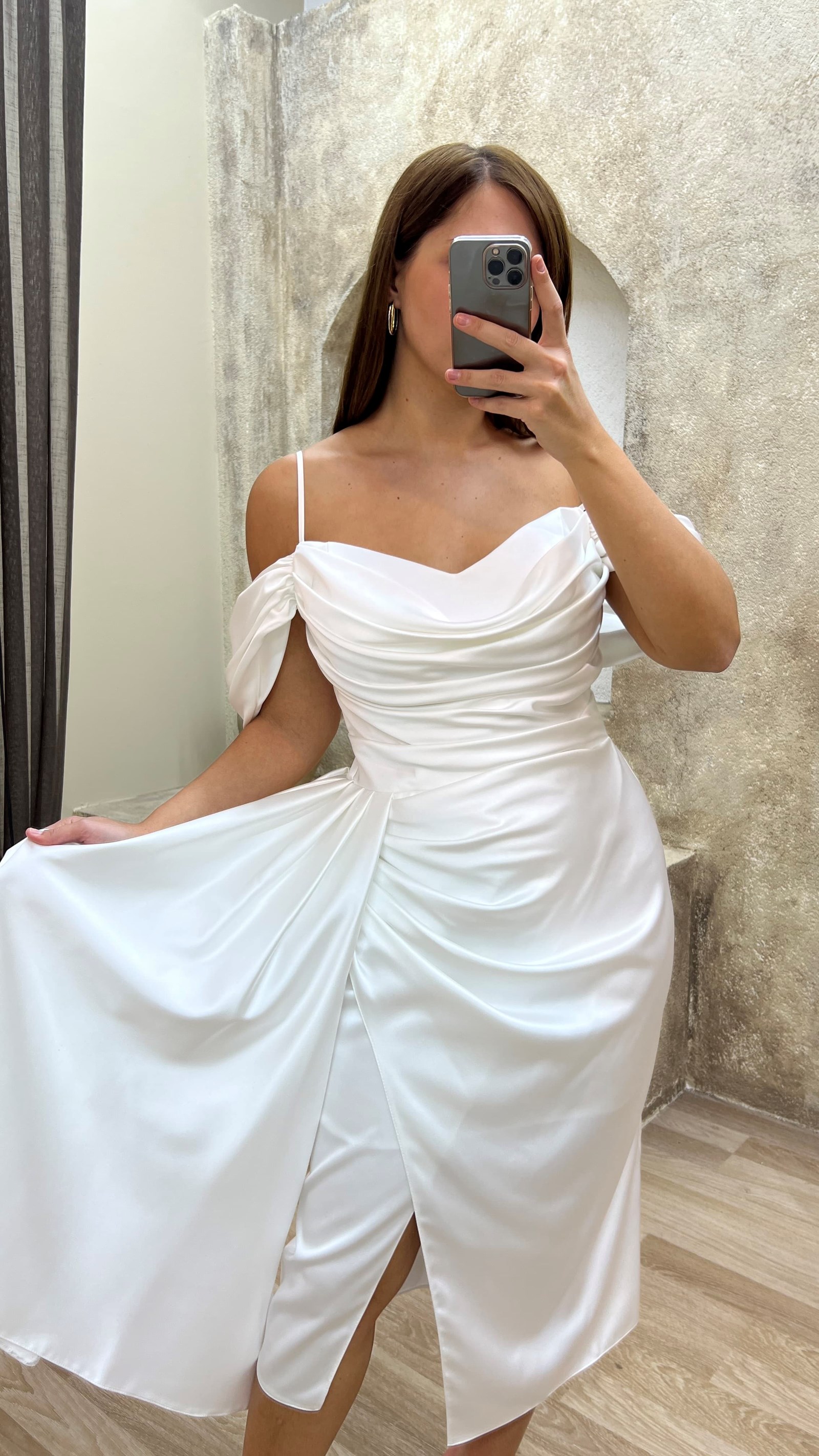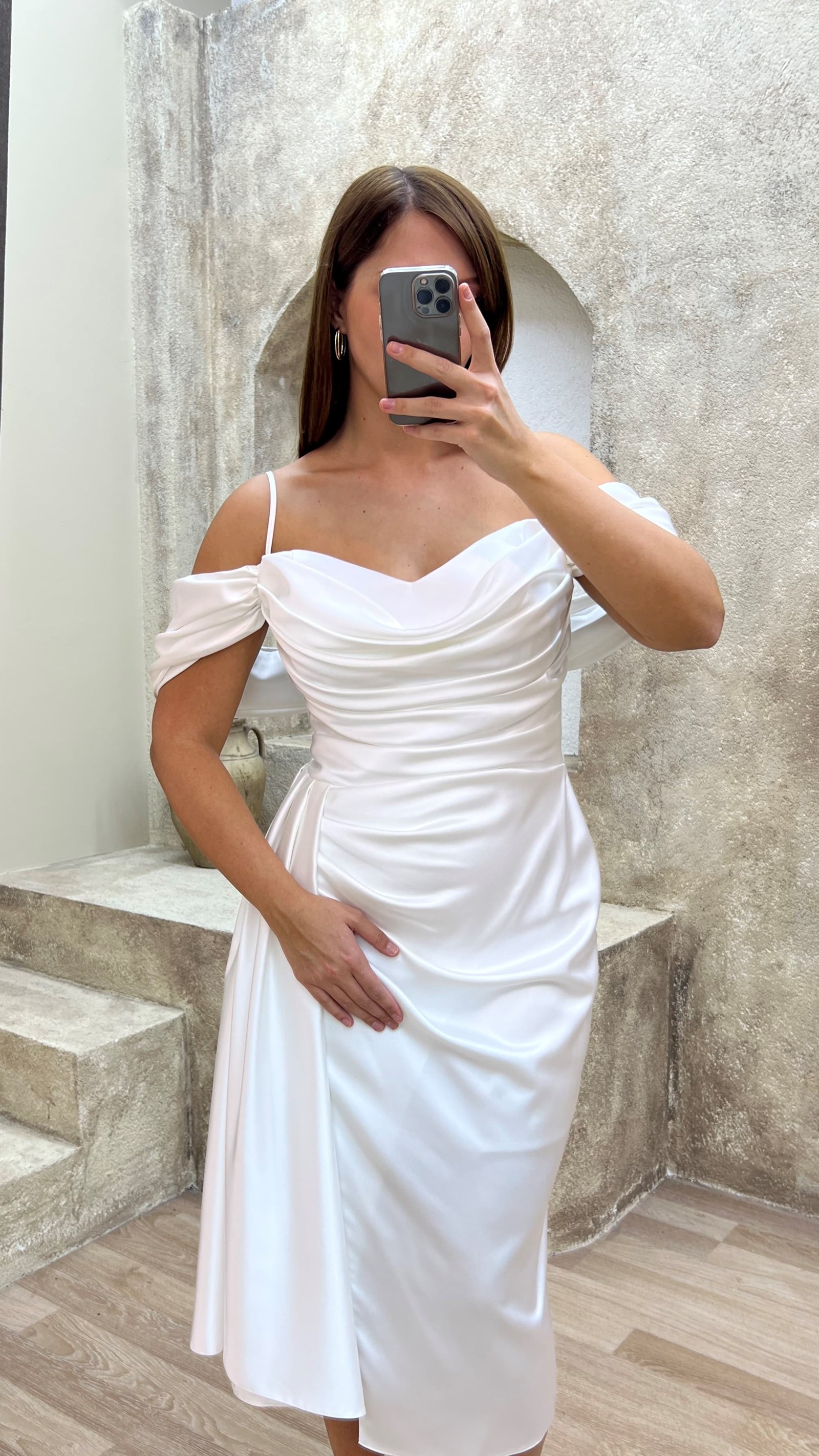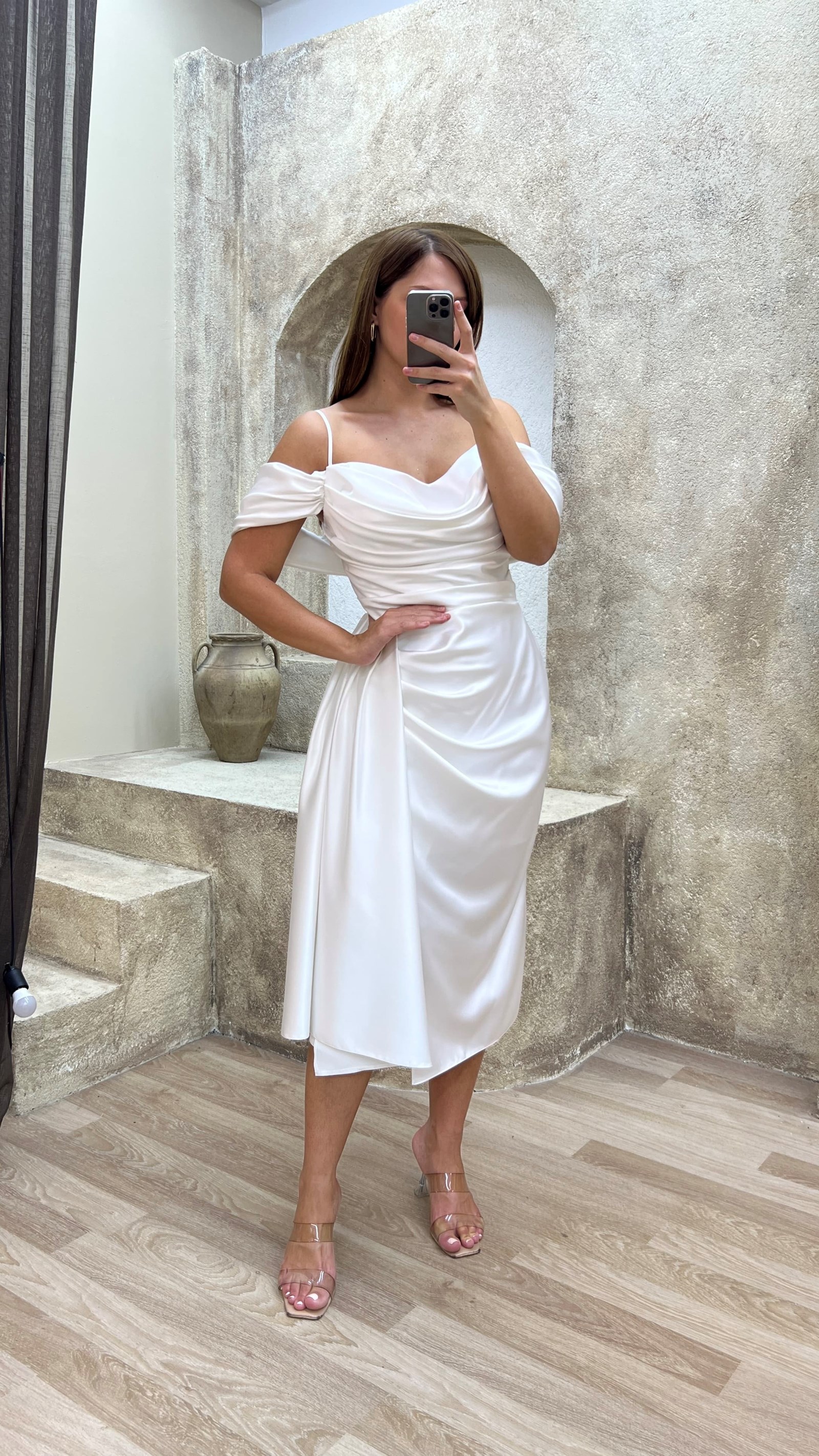 • Beyaz Omuz Detay Büzgülü Tasarım Midi Boy Büyük Beden Elbise