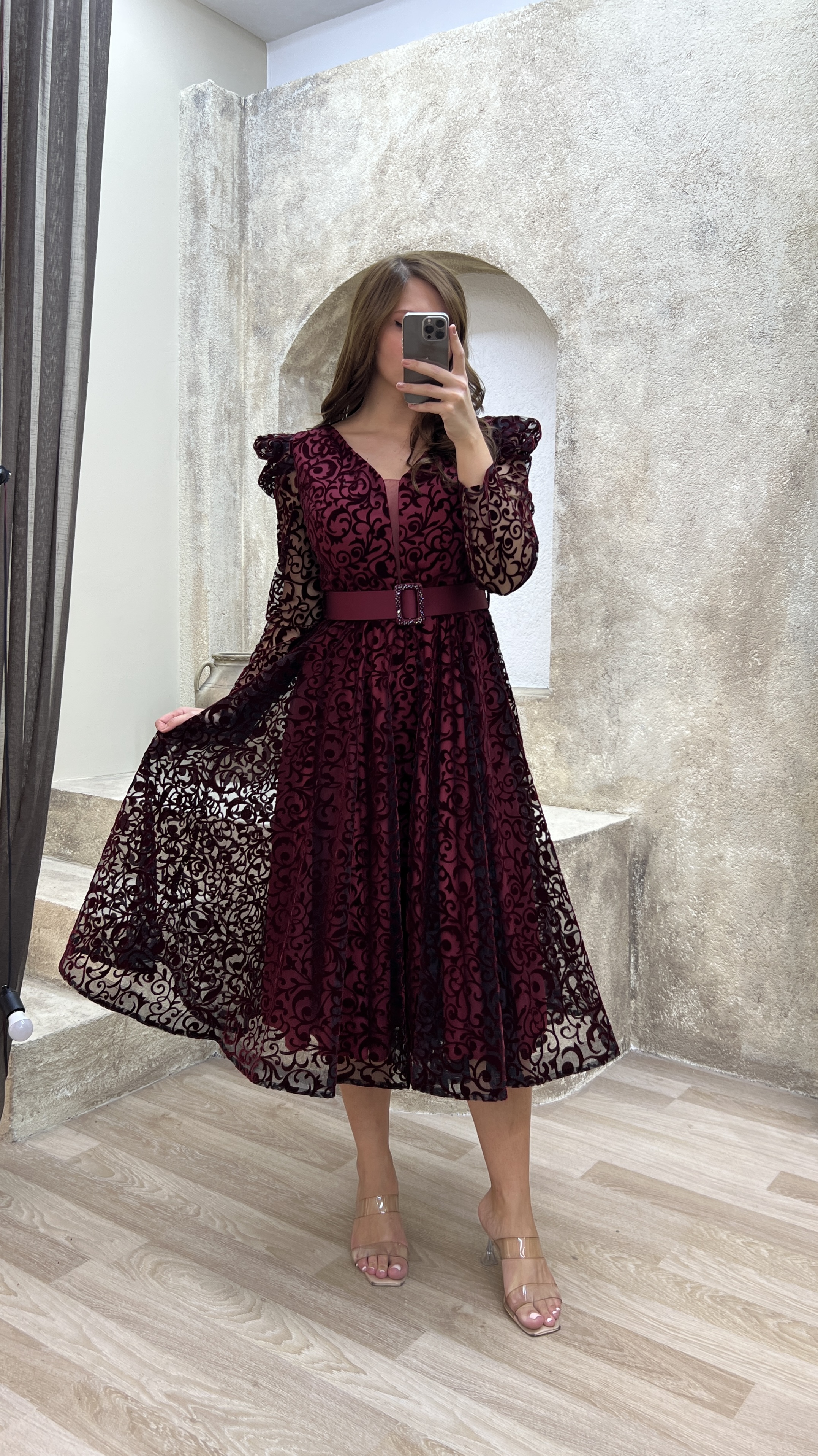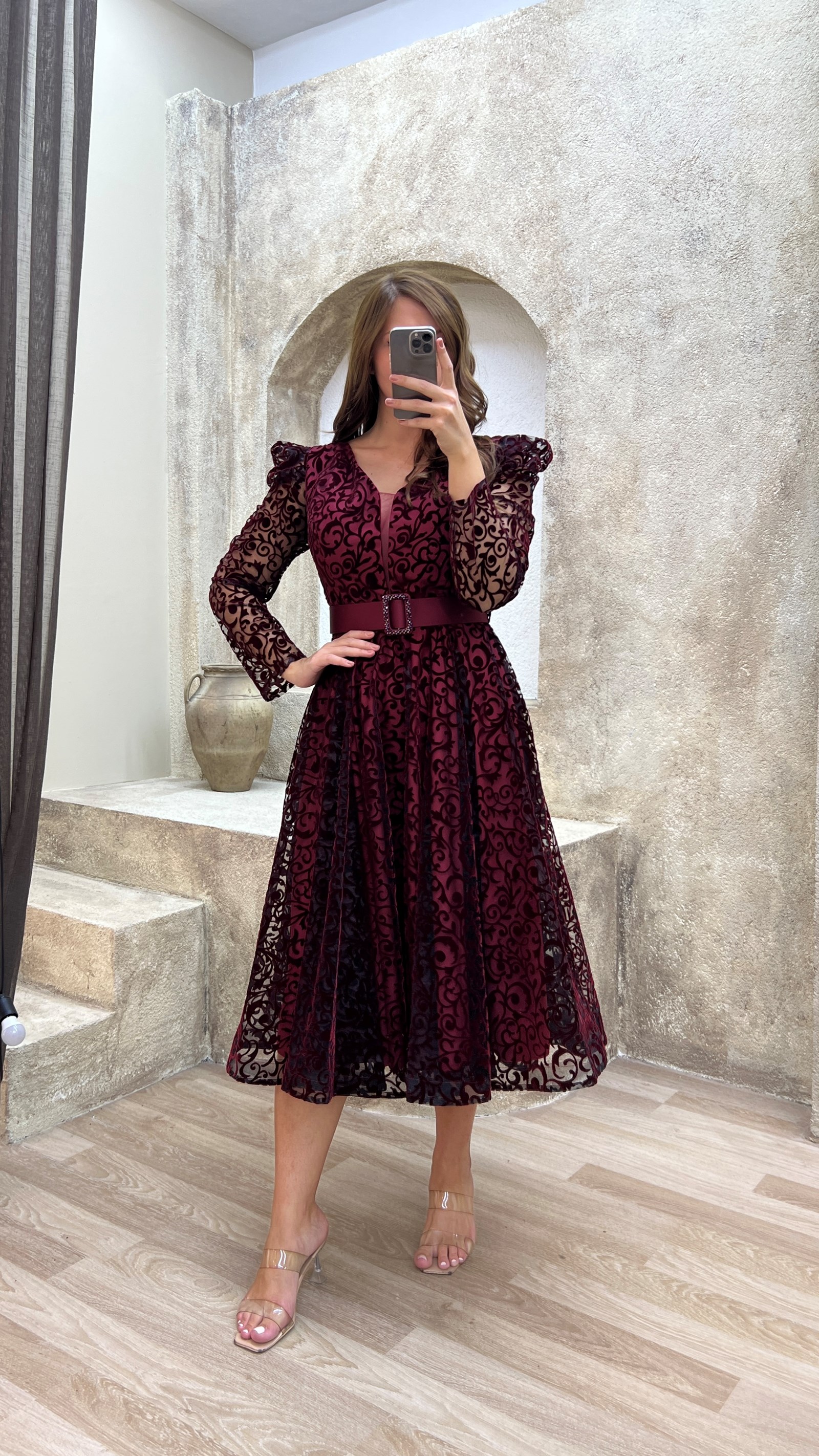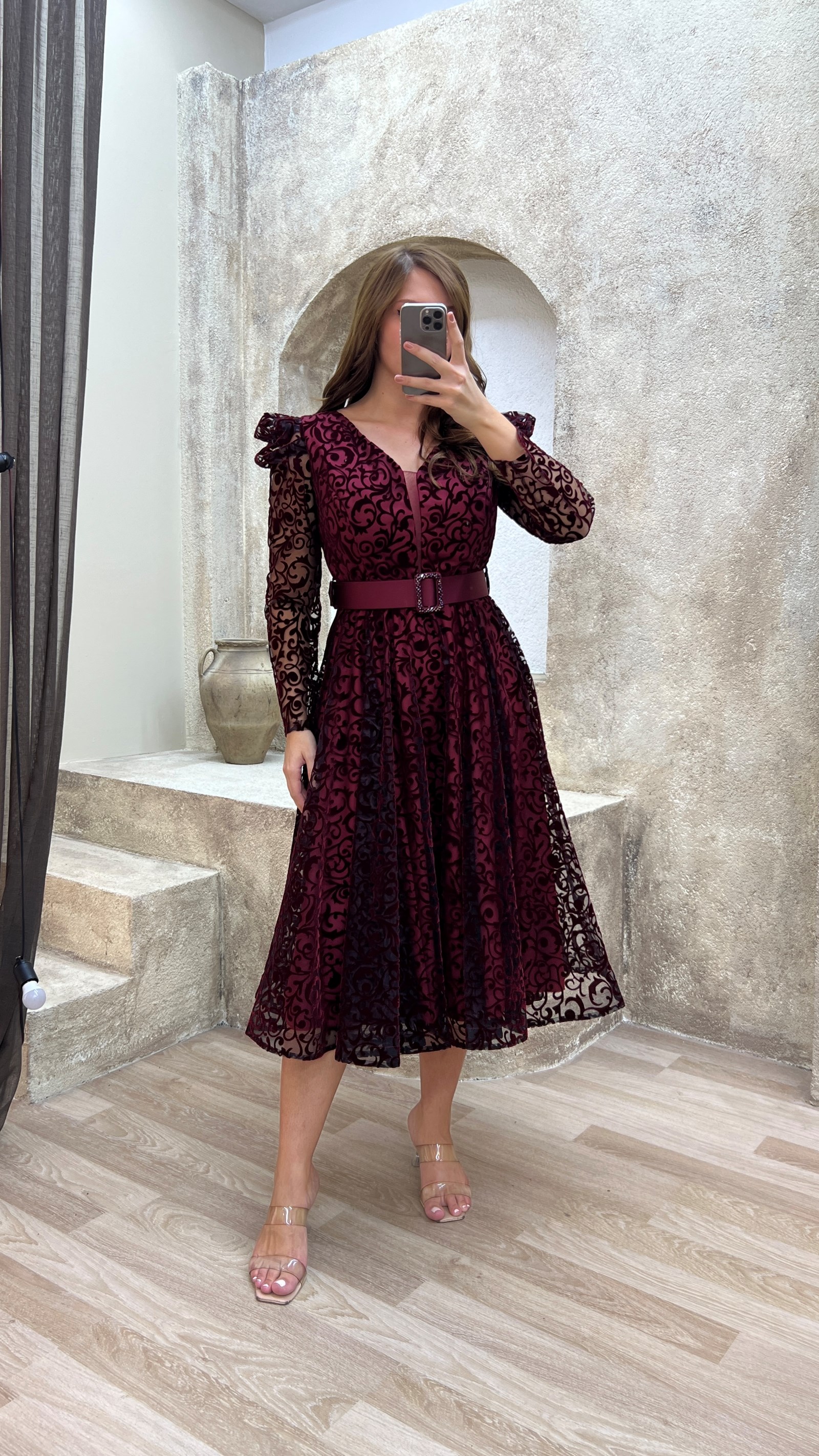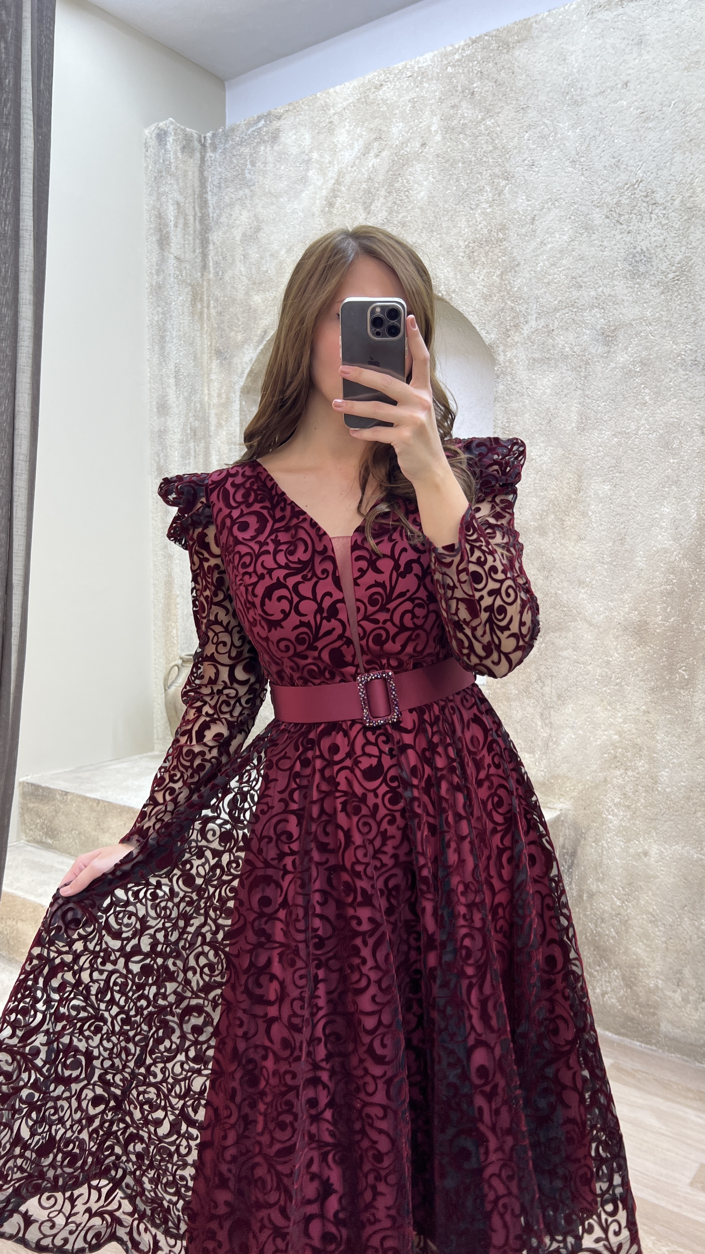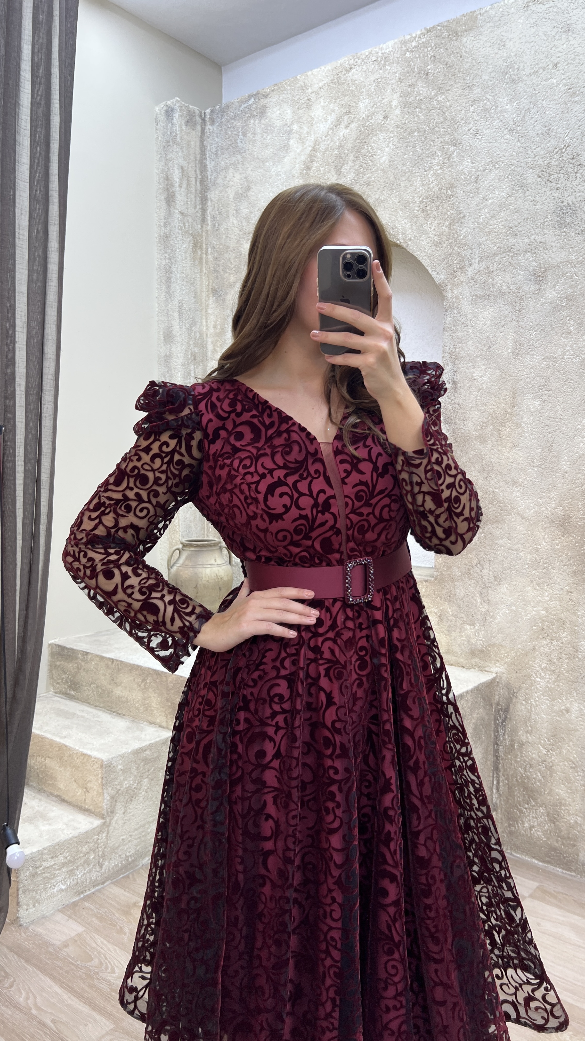 • Bordo V Yaka Flog Baskı Büyük Beden Abiye