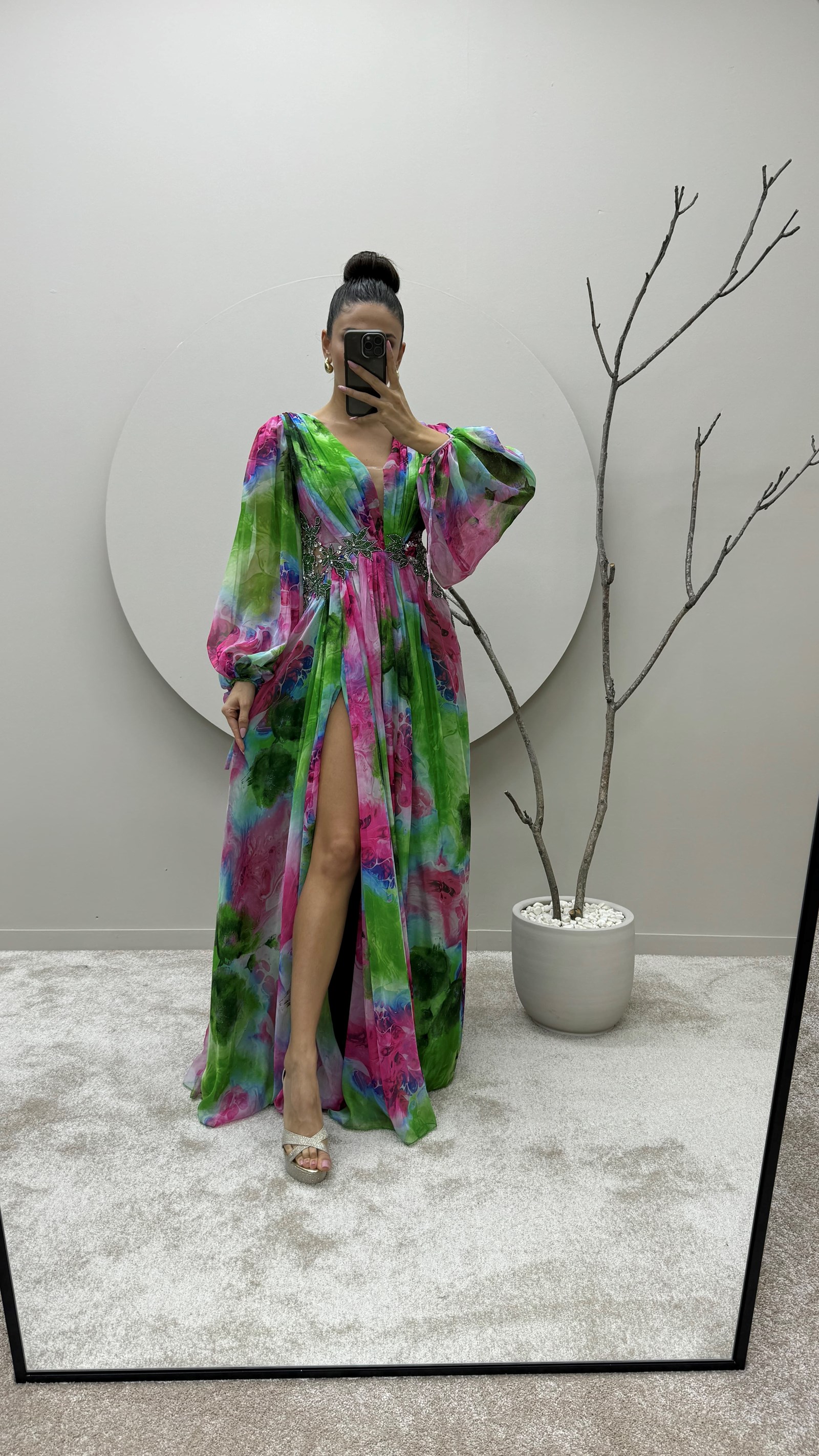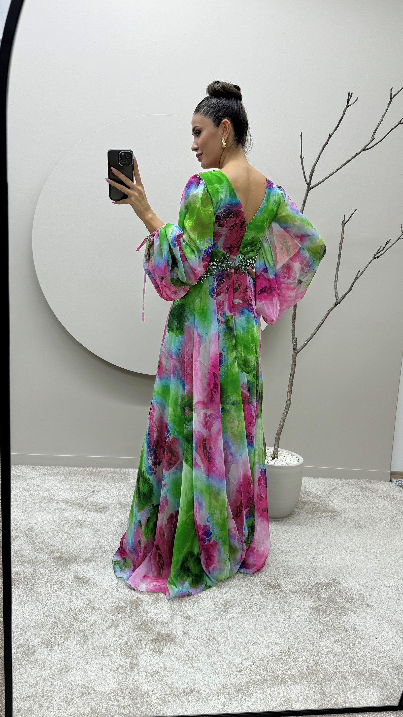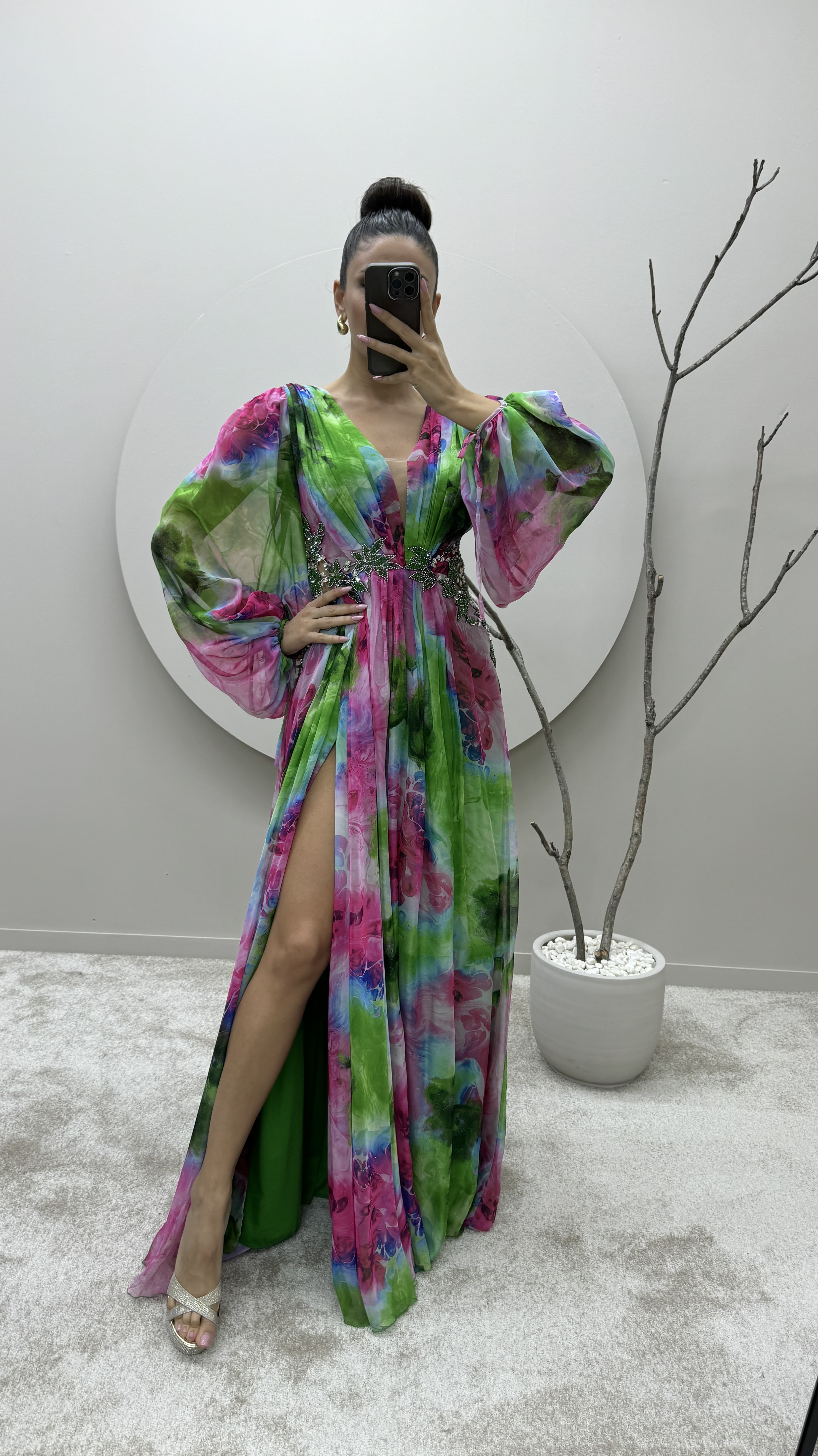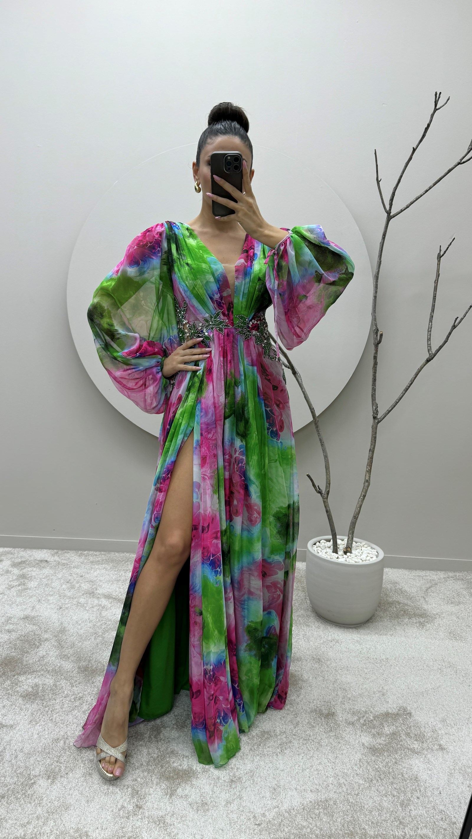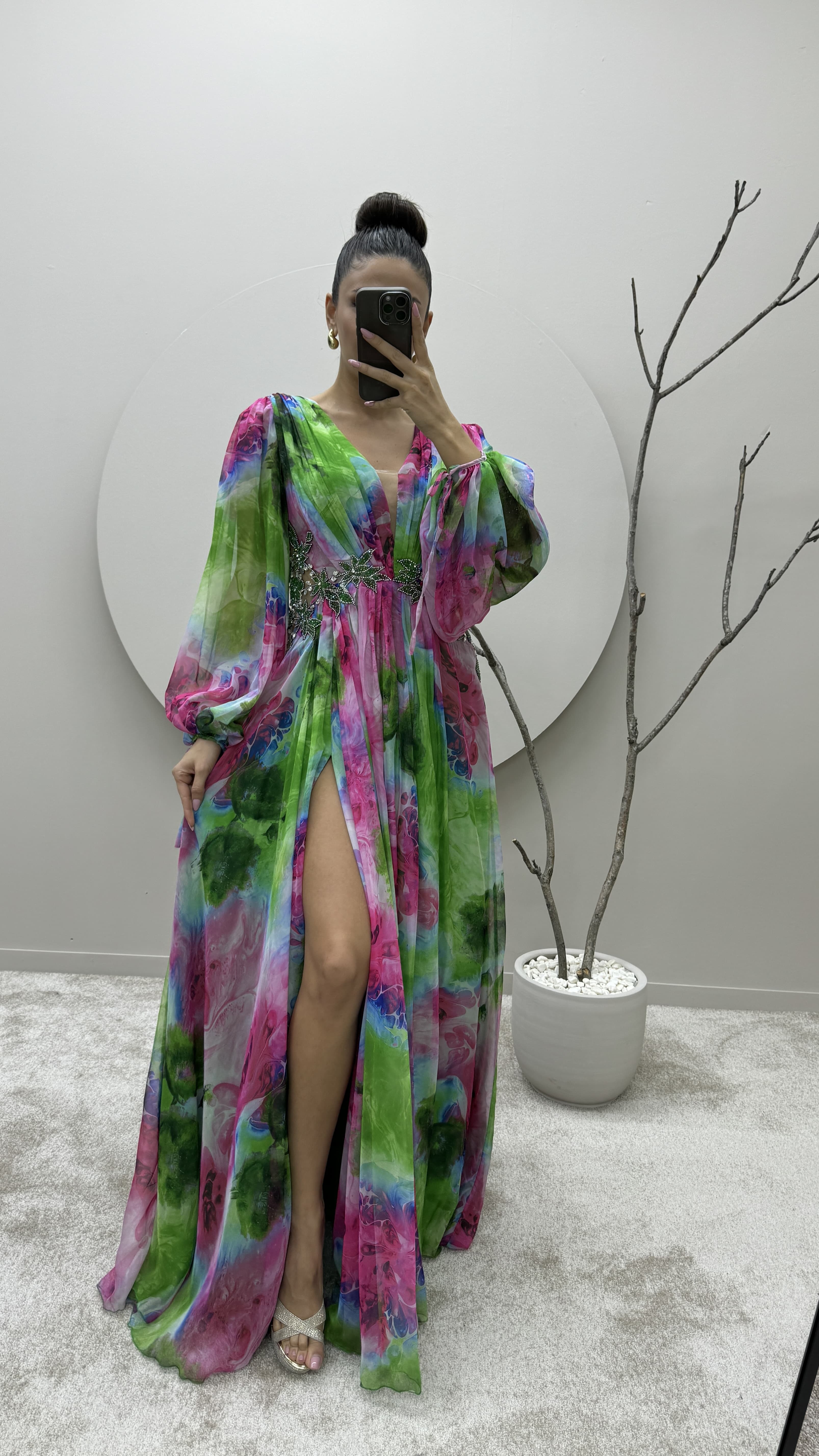 • Yeşil Balon Kol Beli İşlemeli Tasarım Şifon Abiye Elbise