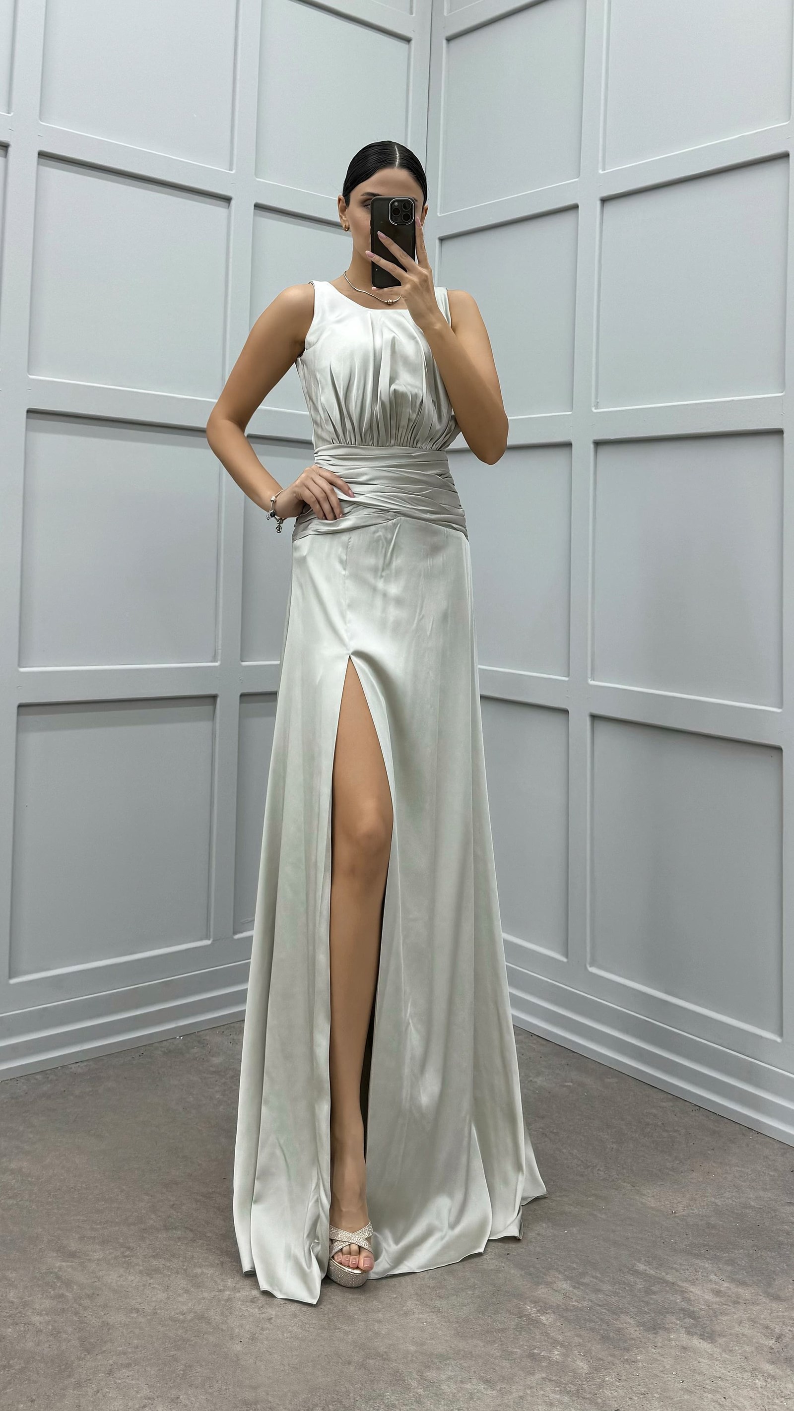 • Gri Bel Detay Saten Abiye