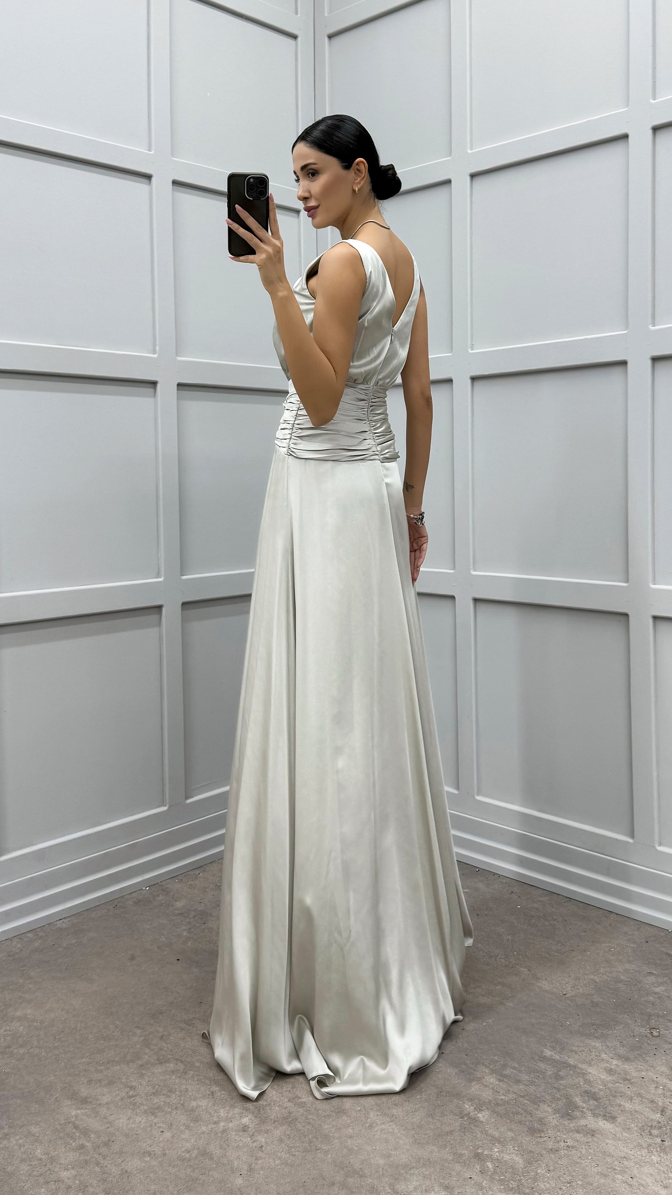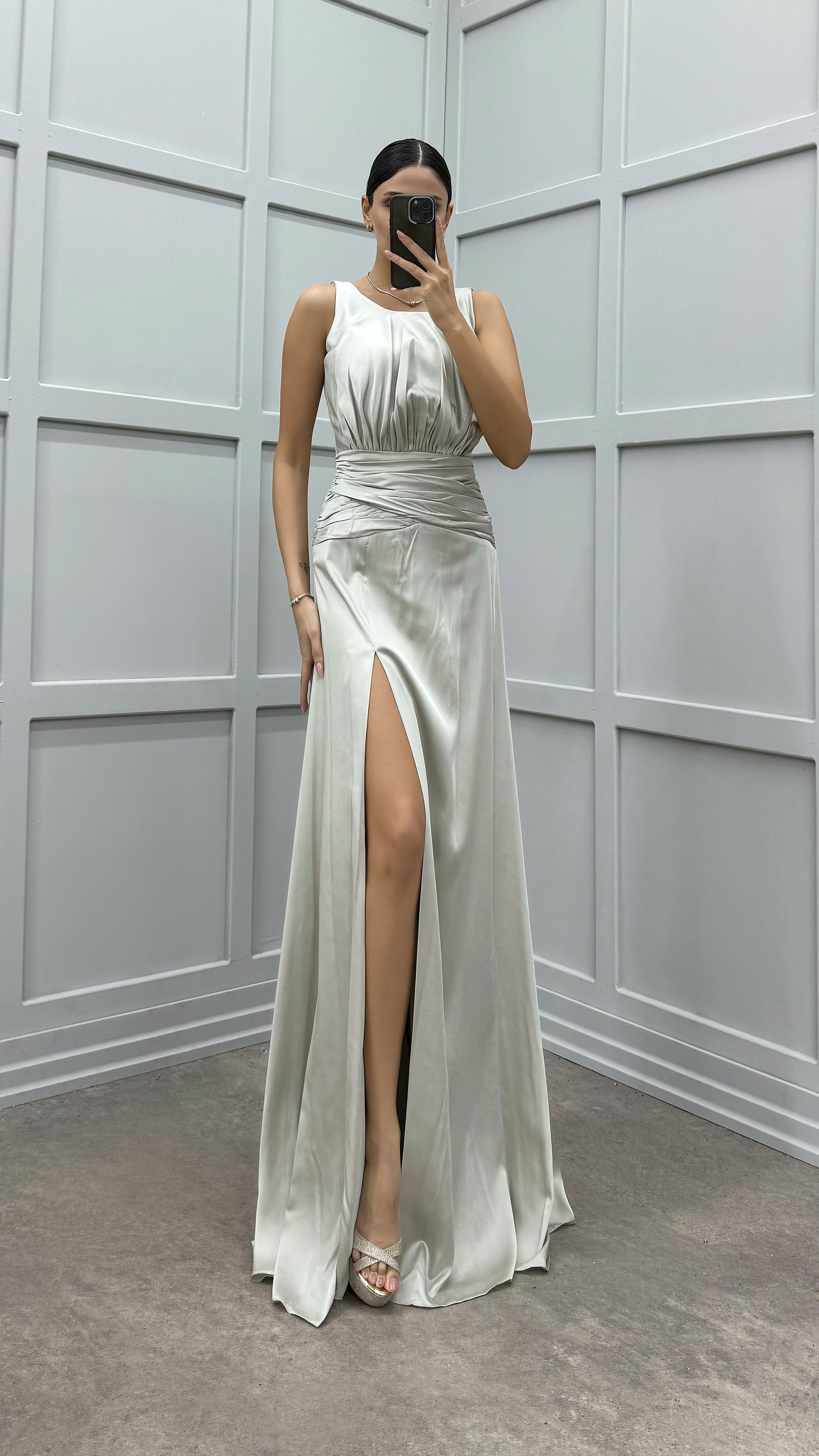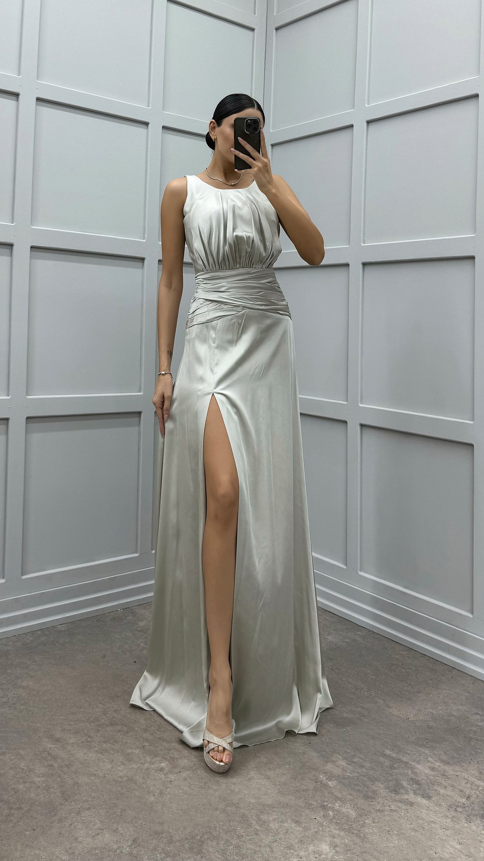 Abito da sera in raso con dettagli in vita grigio