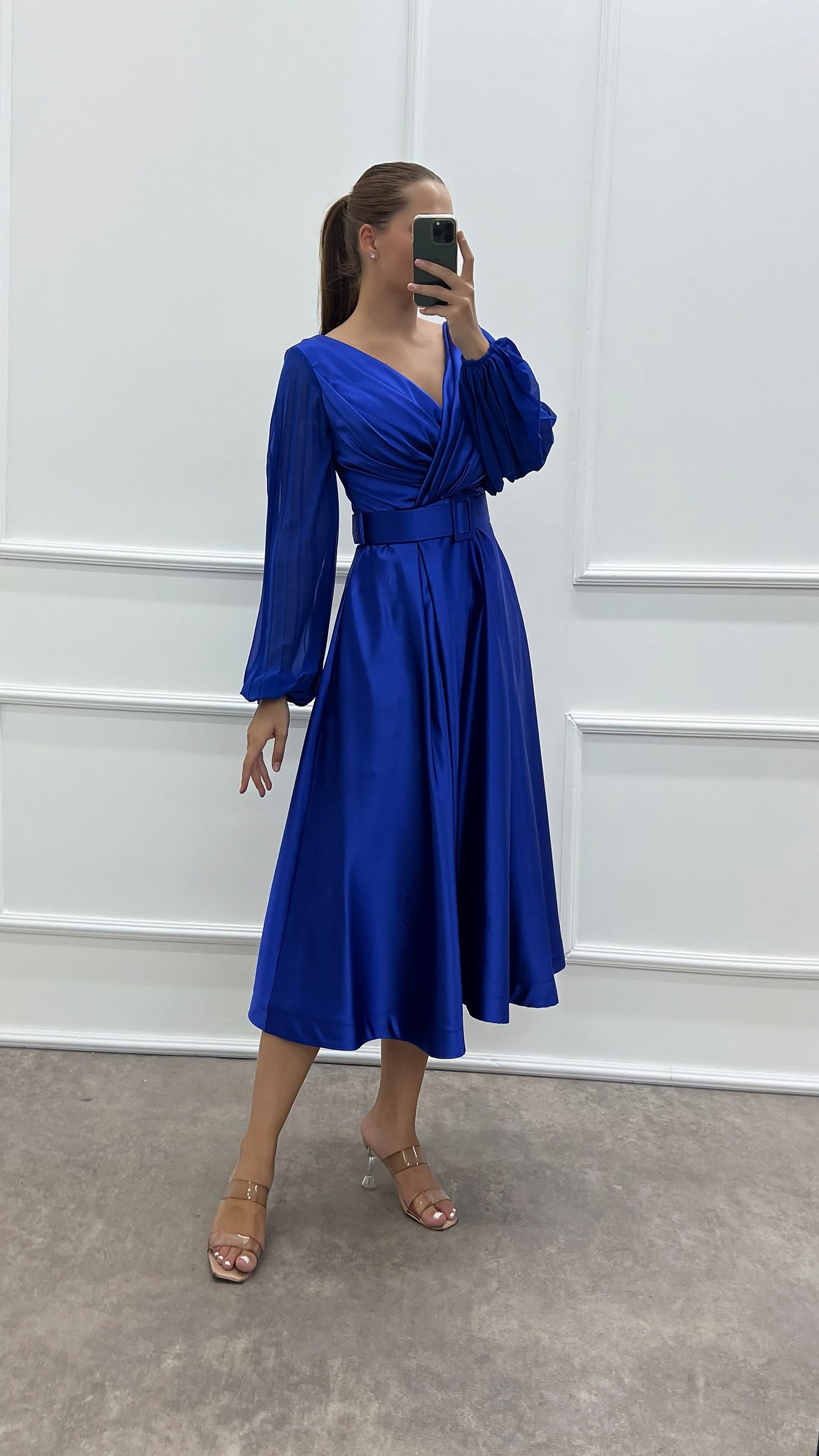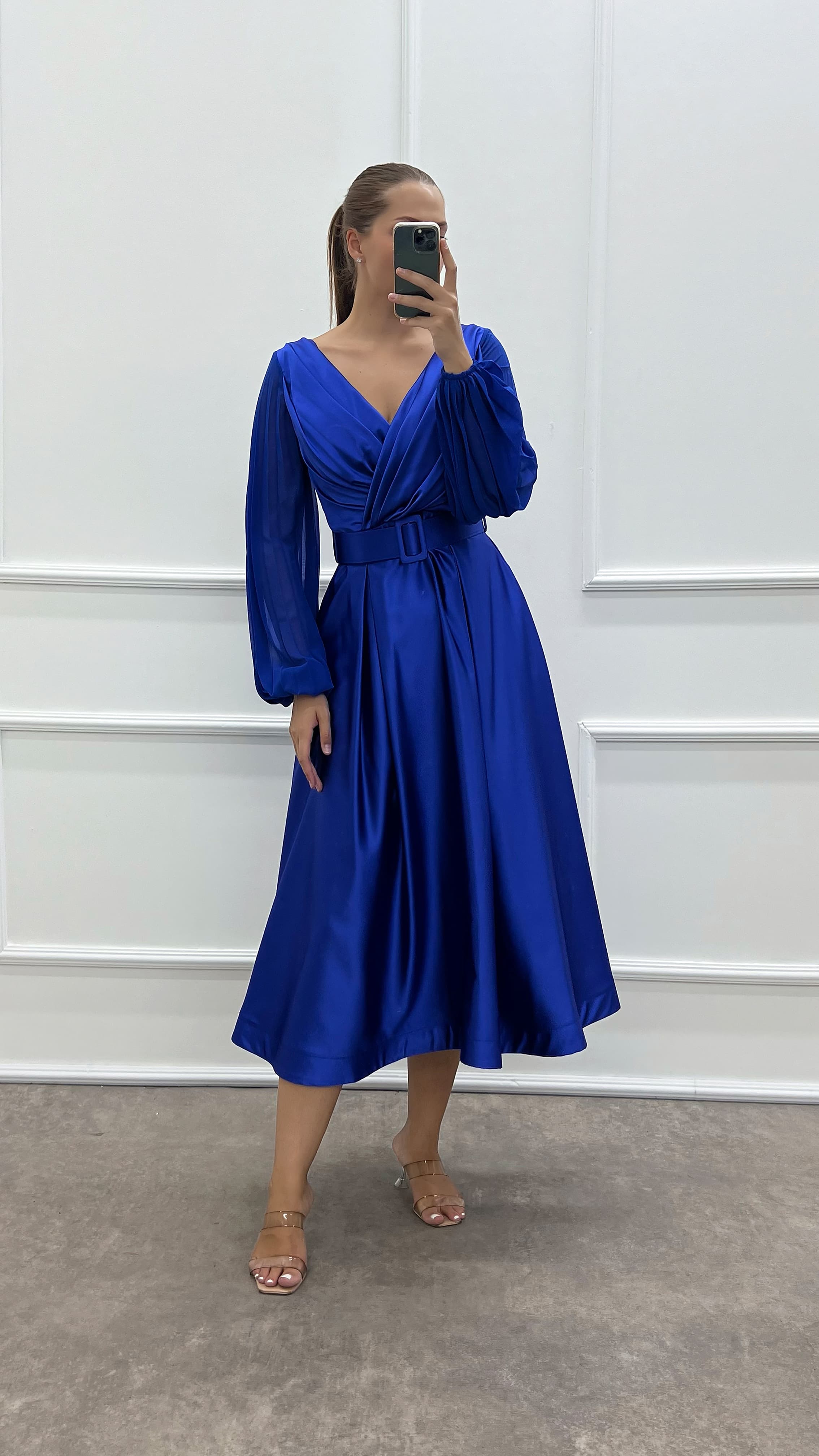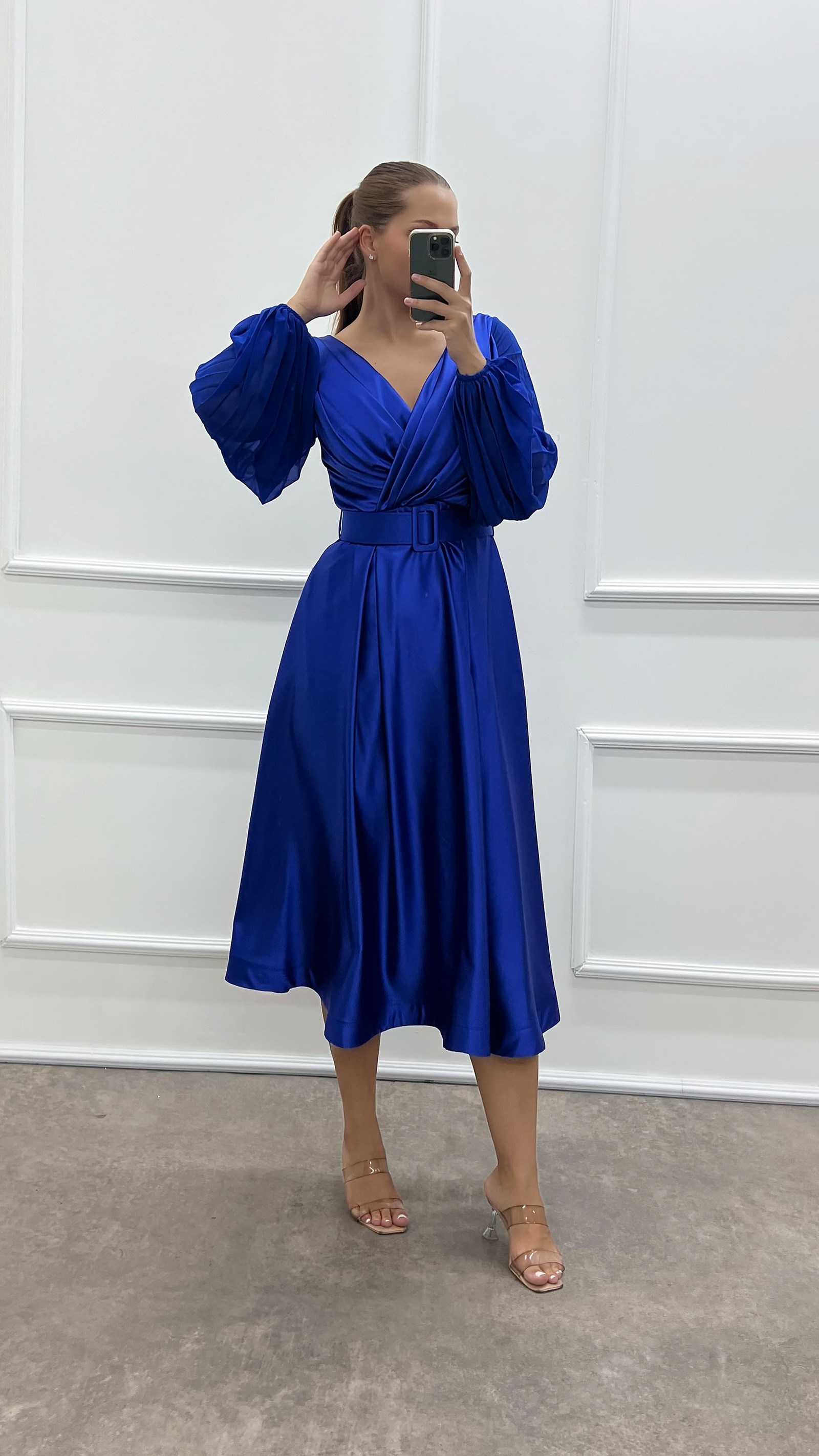 • Saks Göğsü Kruvaze Balon Kol Tasarım Büyük Beden Saten Elbise